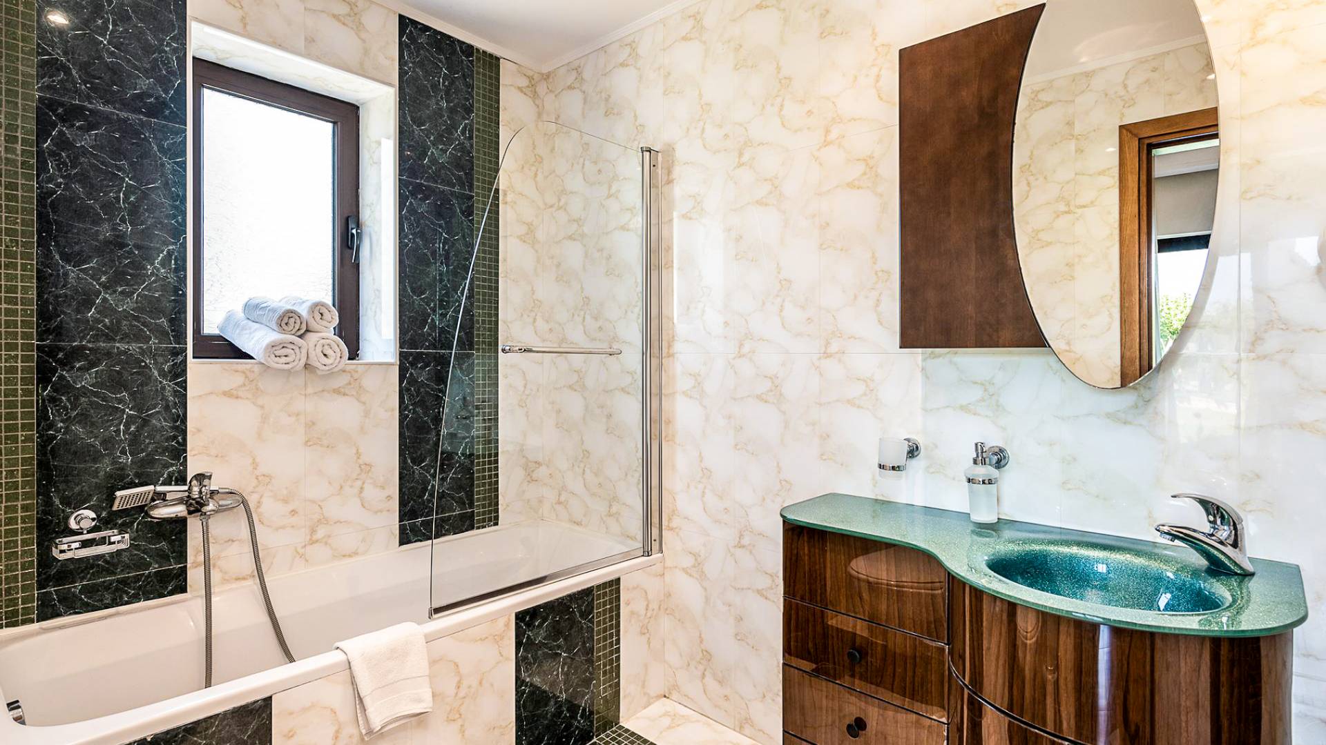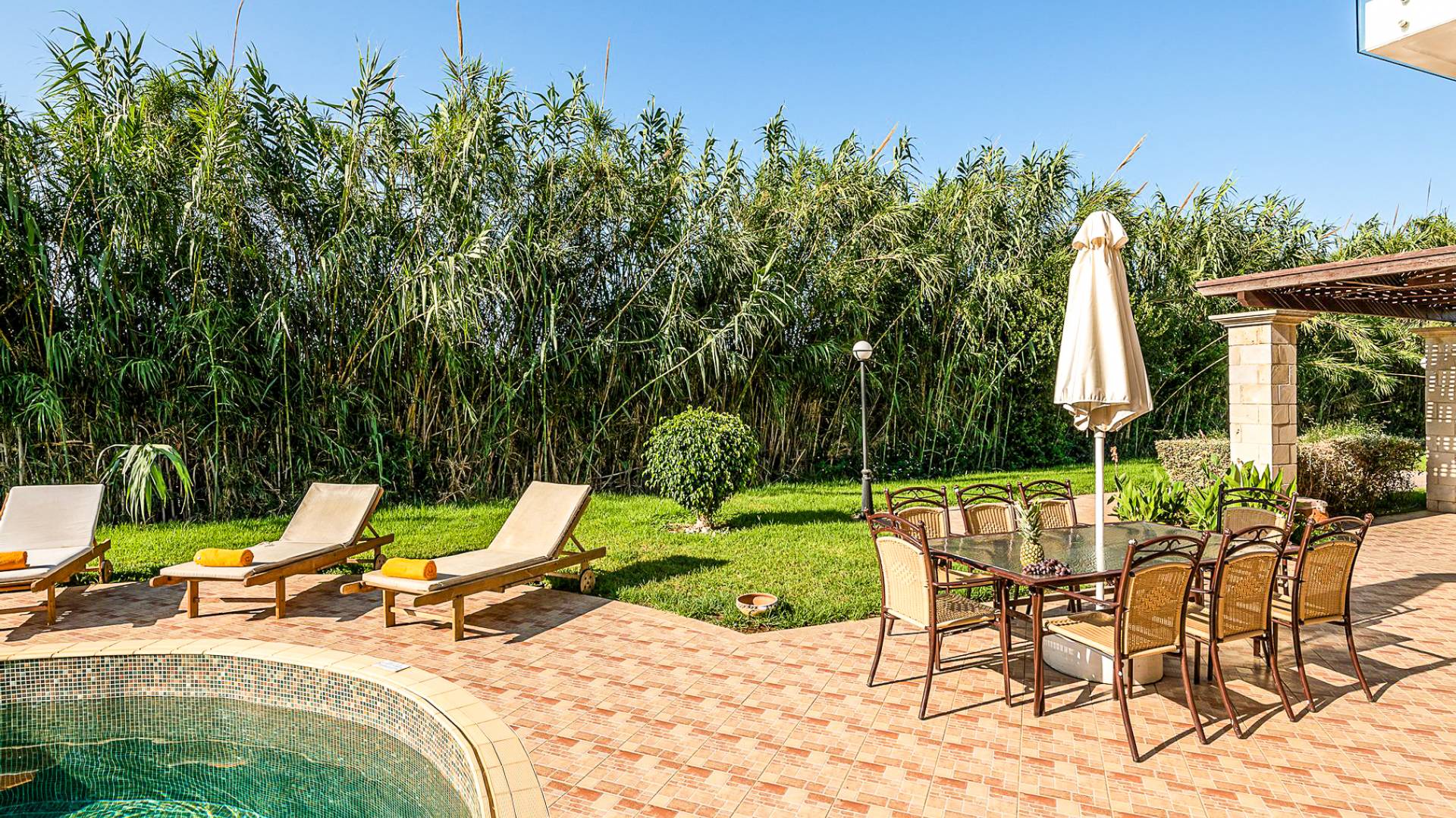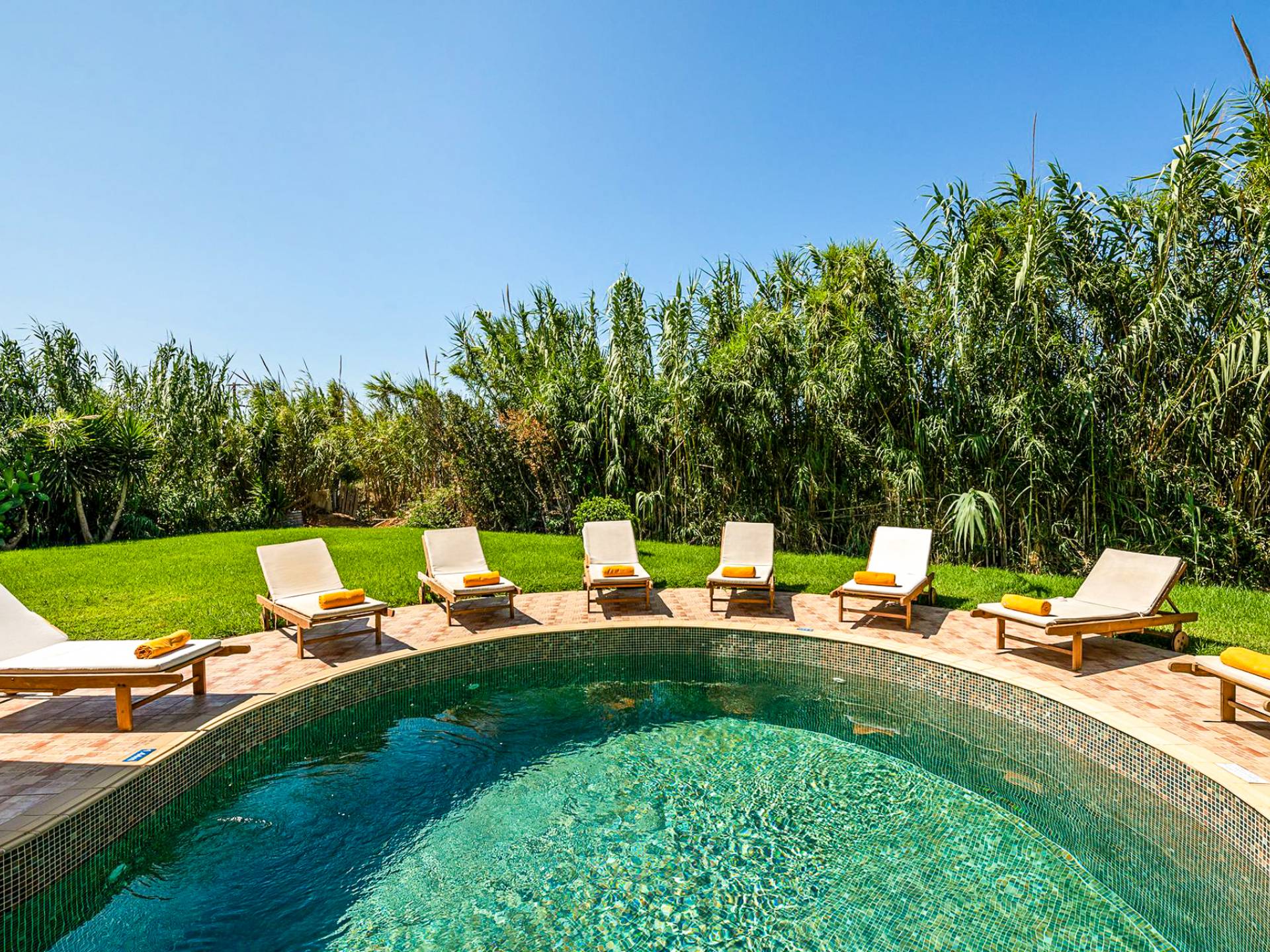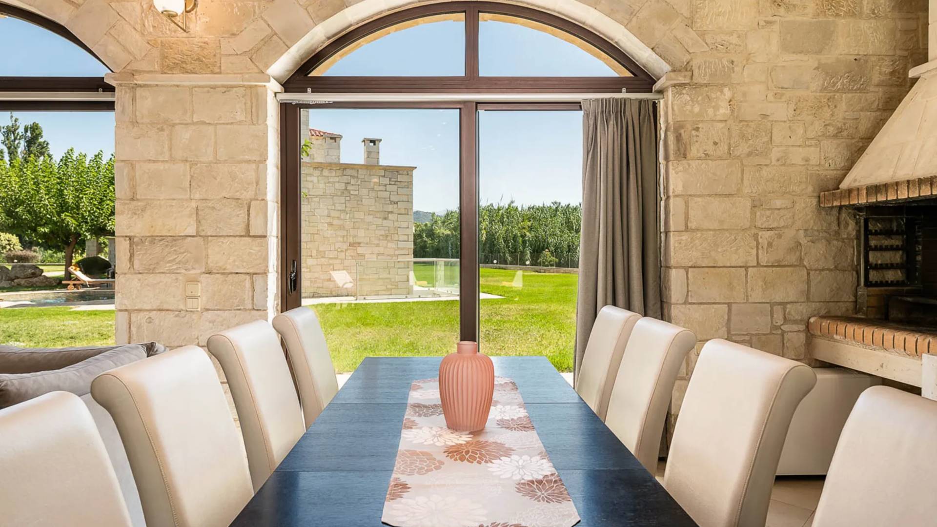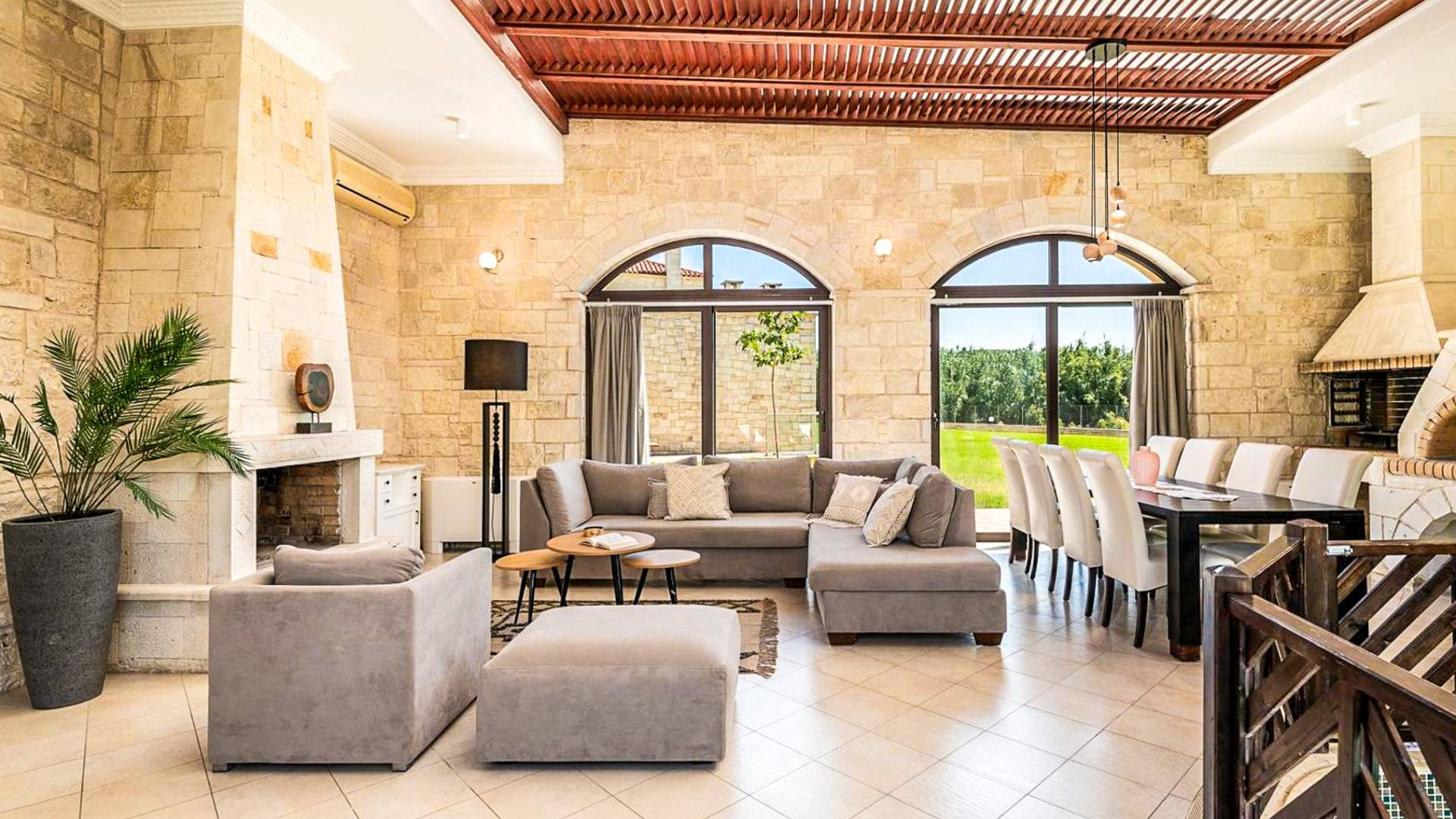 Im Erdgeschoss befindet sich ein stilvoll eingerichteter Wohn- und Essbereich mit Kamin und Grill, kombiniert mit einem privaten Innen-/Außenpool, der eine wahre und bezaubernde Atmosphäre schafft. Im Erdgeschoss befinden sich zwei Doppelzimmer mit eigenem Bad. Außerdem gibt es ein WC und ein Zustellbett für die 9. Person. Im ersten Stock befinden sich zwei Doppelzimmer mit eigenem Bad und großen Balkonen mit Blick auf die Gärten. Alle Zimmer verfügen über einen 32-Zoll-Flachbildfernseher, eine Klimaanlage sowie eine Zentralheizung, wodurch die Villa das ganze Jahr über als Unterkunft geeignet ist, sowie Gartenmöbel, Sonnenliegen und Sonnenschirme.