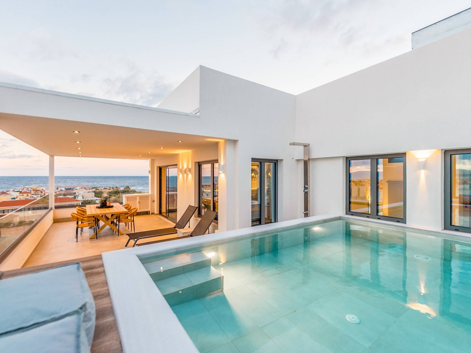 Der erfrischende private Außenpool, der auf Anfrage beheizt werden kann, ist der beste Teil der Residenz, wo Sie unberührte Momente der Entspannung unter der warmen Sonne genießen und sich dabei harmonisch in die Aussicht auf die Stadt einfügen können. Der Wohn- und Essbereich für 6 Gäste ist der perfekte Ort, an dem die Bewohner optimalen Wohnkomfort und eine atemberaubende Aussicht auf das Meer, die Stadt Chania und die Weißen Berge genießen können. Der Zugang erfolgt per Aufzug oder über eine Treppe.