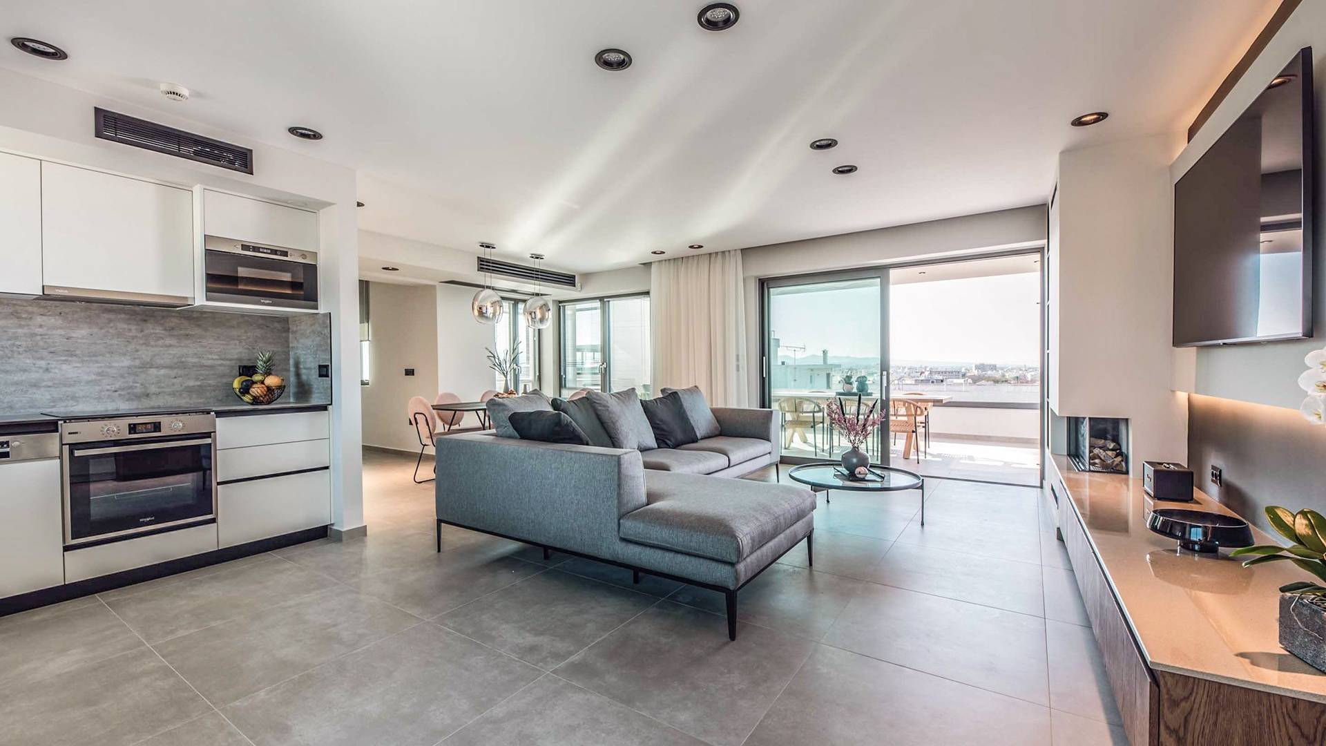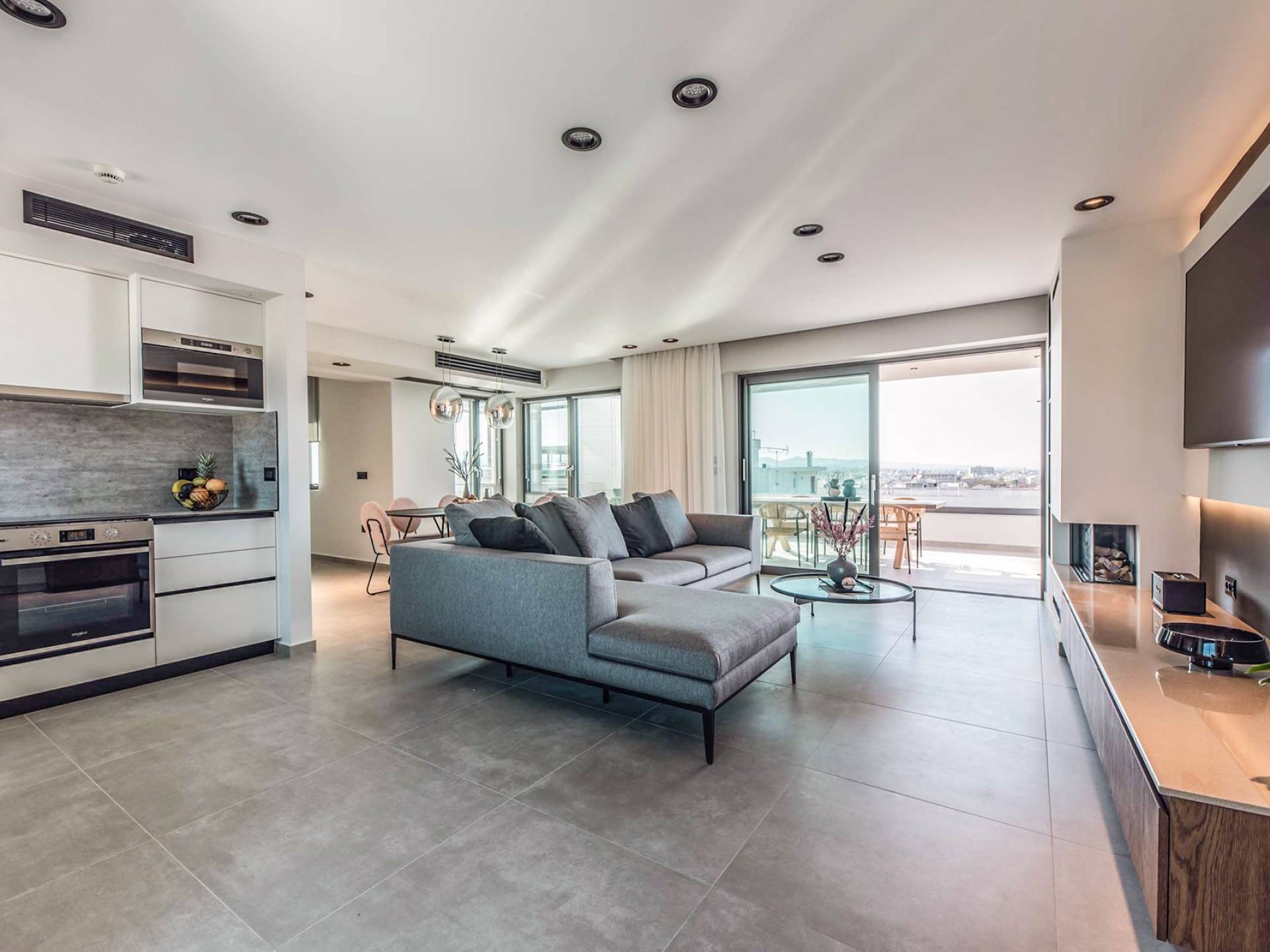 Bequem eingebettet im Zentrum der Stadt Chania erwartet Sie dieses elegante Penthouse auf einer einzigartigen Fläche von 148 m², die Entspannung verspricht und unübertroffene Ausblicke auf die Stadt, die Berge und ein unvergleichliches Design bietet. Das über zwei Etagen verteilte, im 5. und 6. Stock eines neuen Bürogebäudes gelegene, moderne und minimalistische Dekor begrüßt Sie beim Betreten, als ob Sie durch die Seiten eines Innenmagazins schlendern würden. Es fügt sich harmonisch in die natürliche Landschaft, die erdigen Farben, die Holzoberflächen und die hervorragende Bauqualität ein.