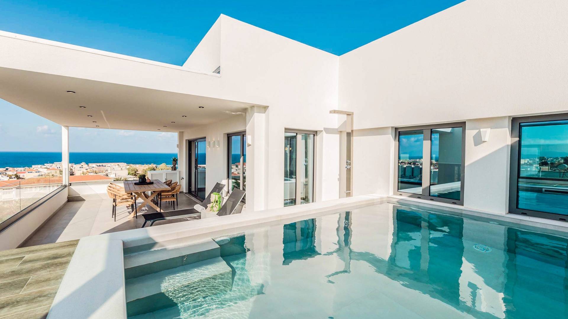 Farbe blau, Sonne und Luxus, nichts kann diese Kombination übertreffen. Was gibt es sonst noch für Ihren Urlaub zu fragen? Gönnen Sie sich einen beheizten privaten Pool in der Gemütlichkeit Ihrer eigenen Villa, entweder drinnen oder draußen. Das…