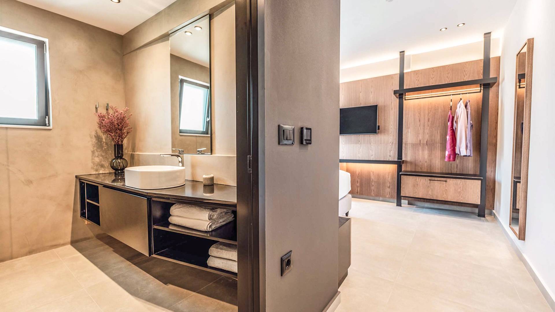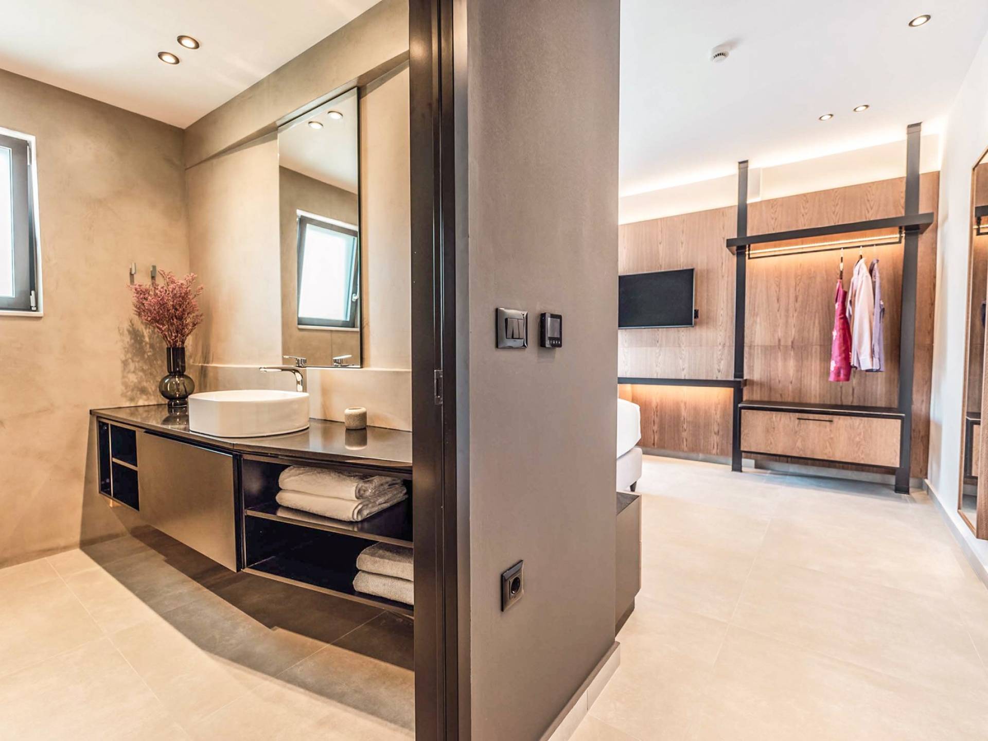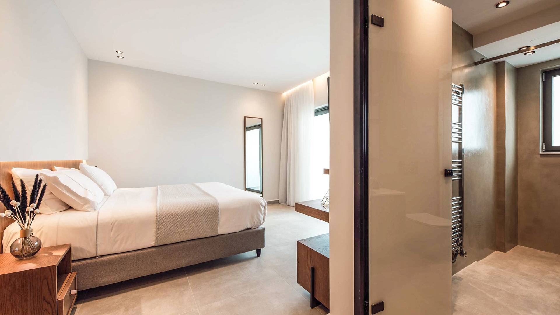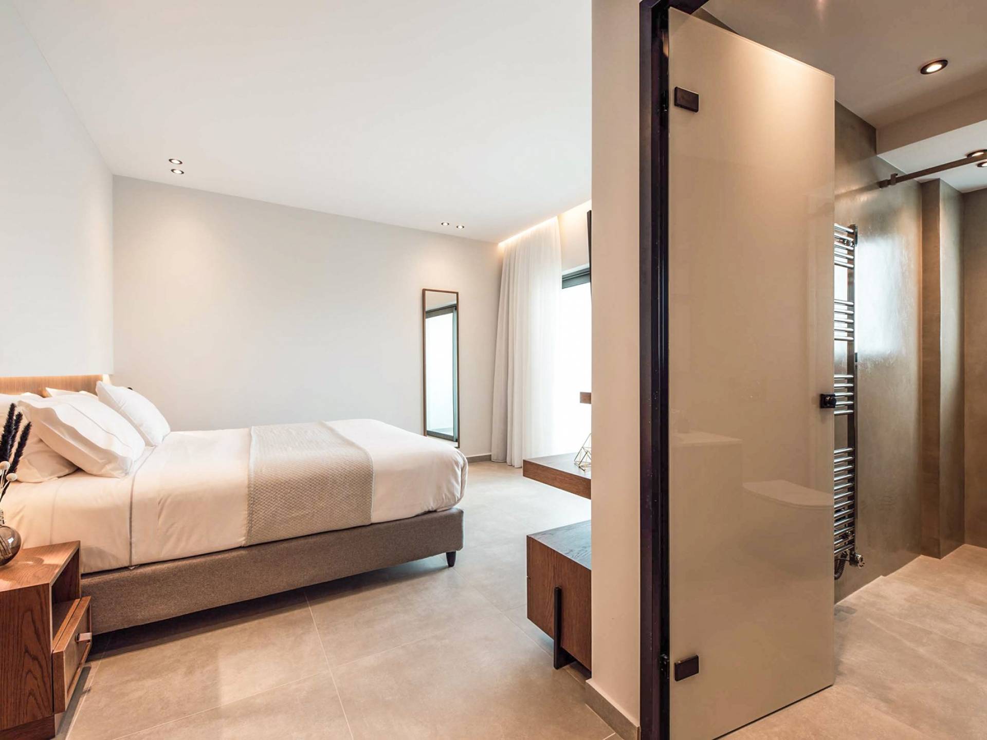 Die großen Fenster erzeugen die Illusion von Transparenz und lassen den Raum von einer Flut kretischen Sonnenscheins erhellen. Wenn Sie mit dem Aufzug die untere Etage erreichen, finden Sie drei modern gestaltete Schlafzimmer mit Kingsize-Betten und eigenem Bad, die völlige Autonomie und Privatsphäre bieten. Neben den Schlafzimmern finden Sie zu Ihrer Bequemlichkeit eine Kaffeebar mit zwei Kaffeemaschinen, einem kleinen Kühlschrank und ausreichend Geschirr für Ihre Bedürfnisse.