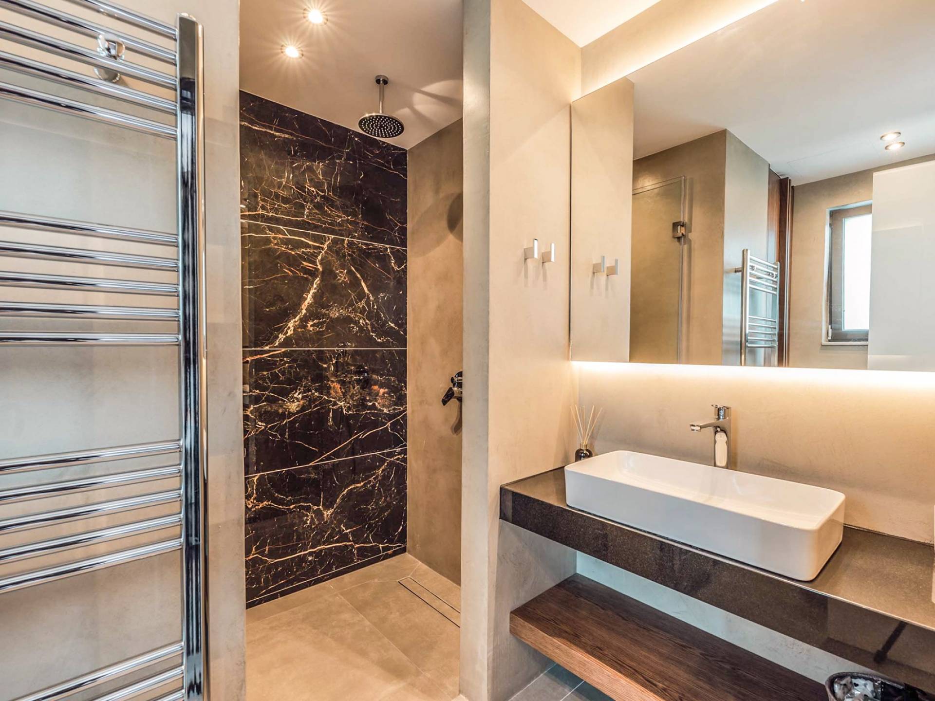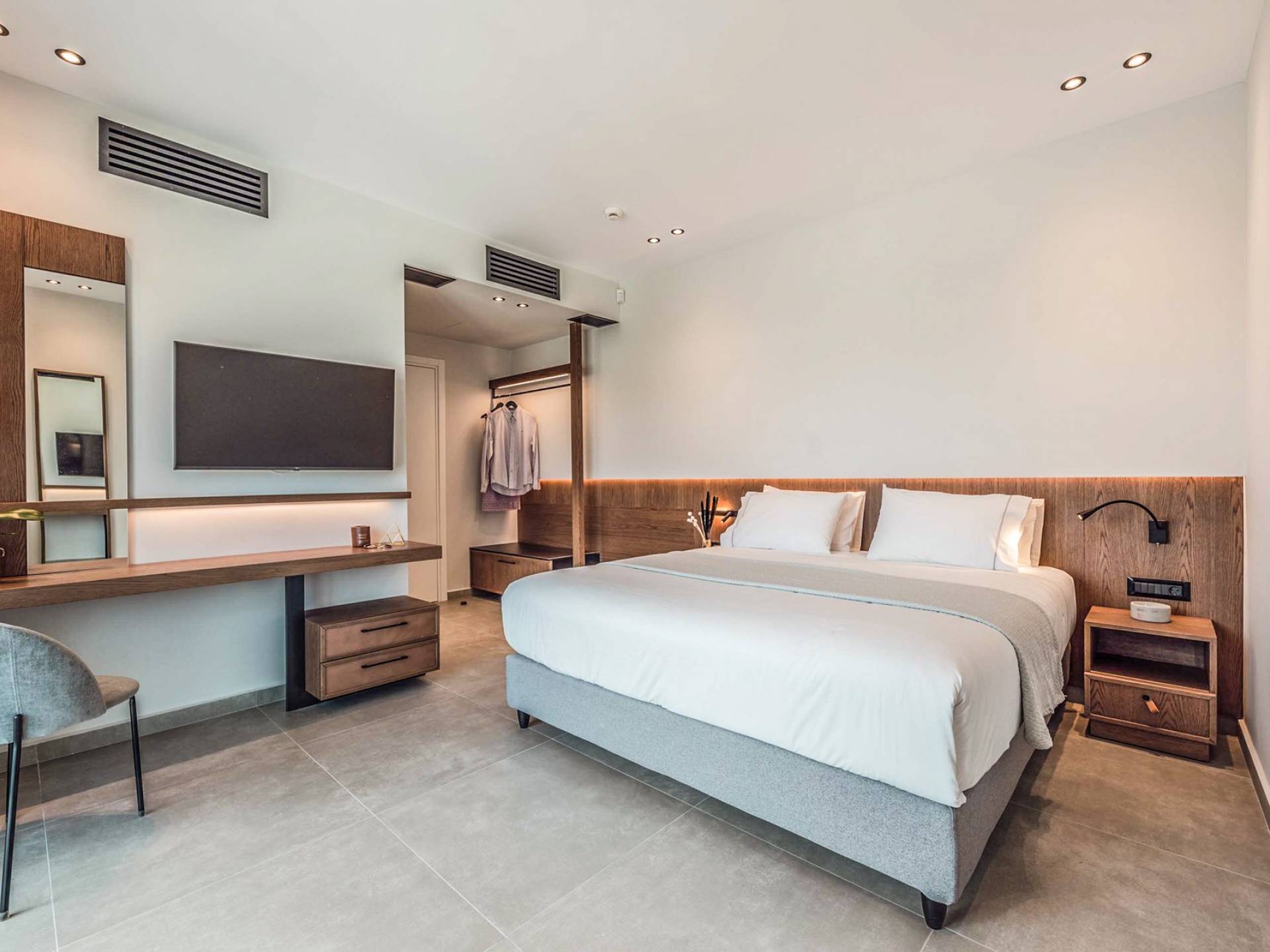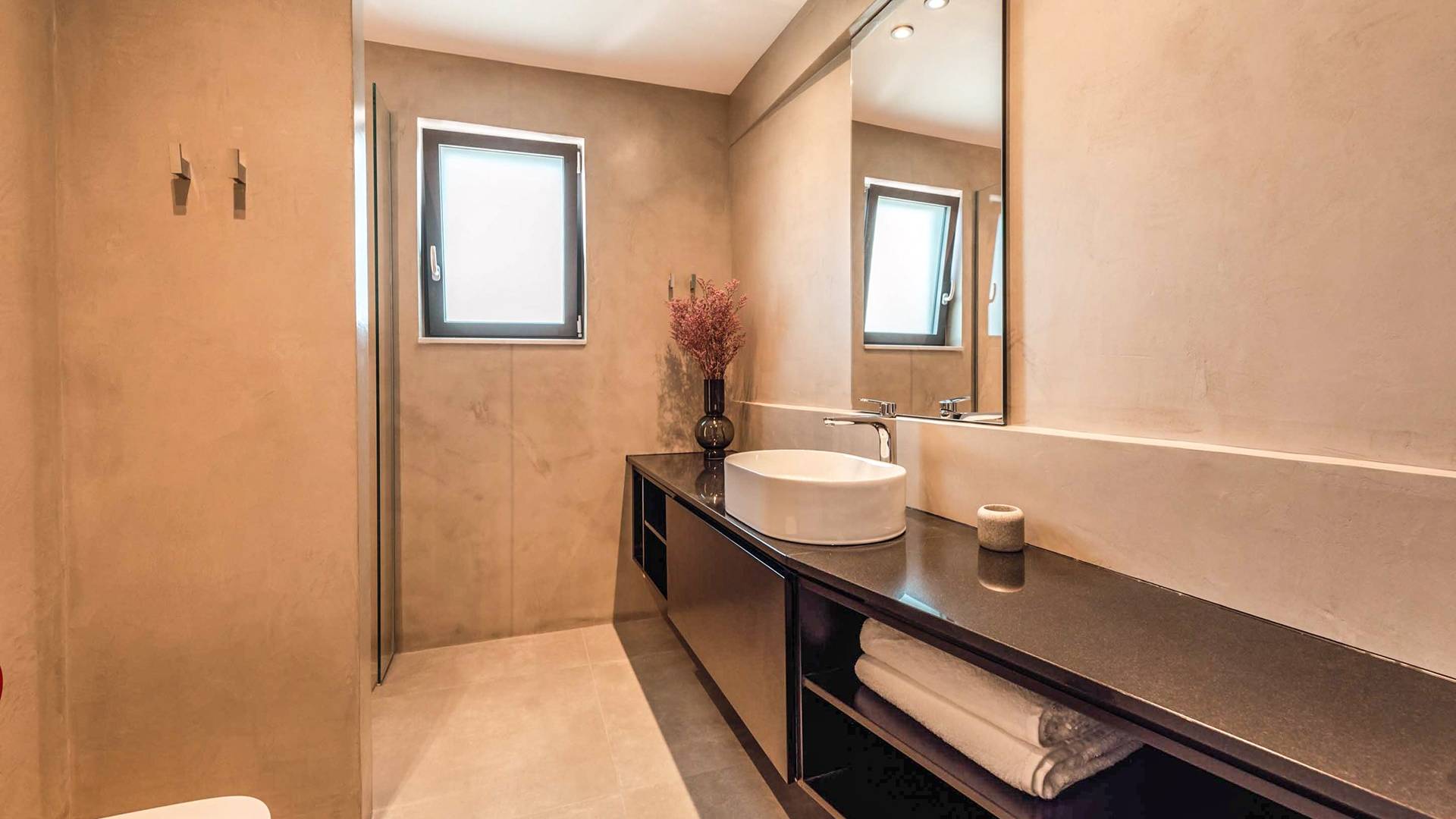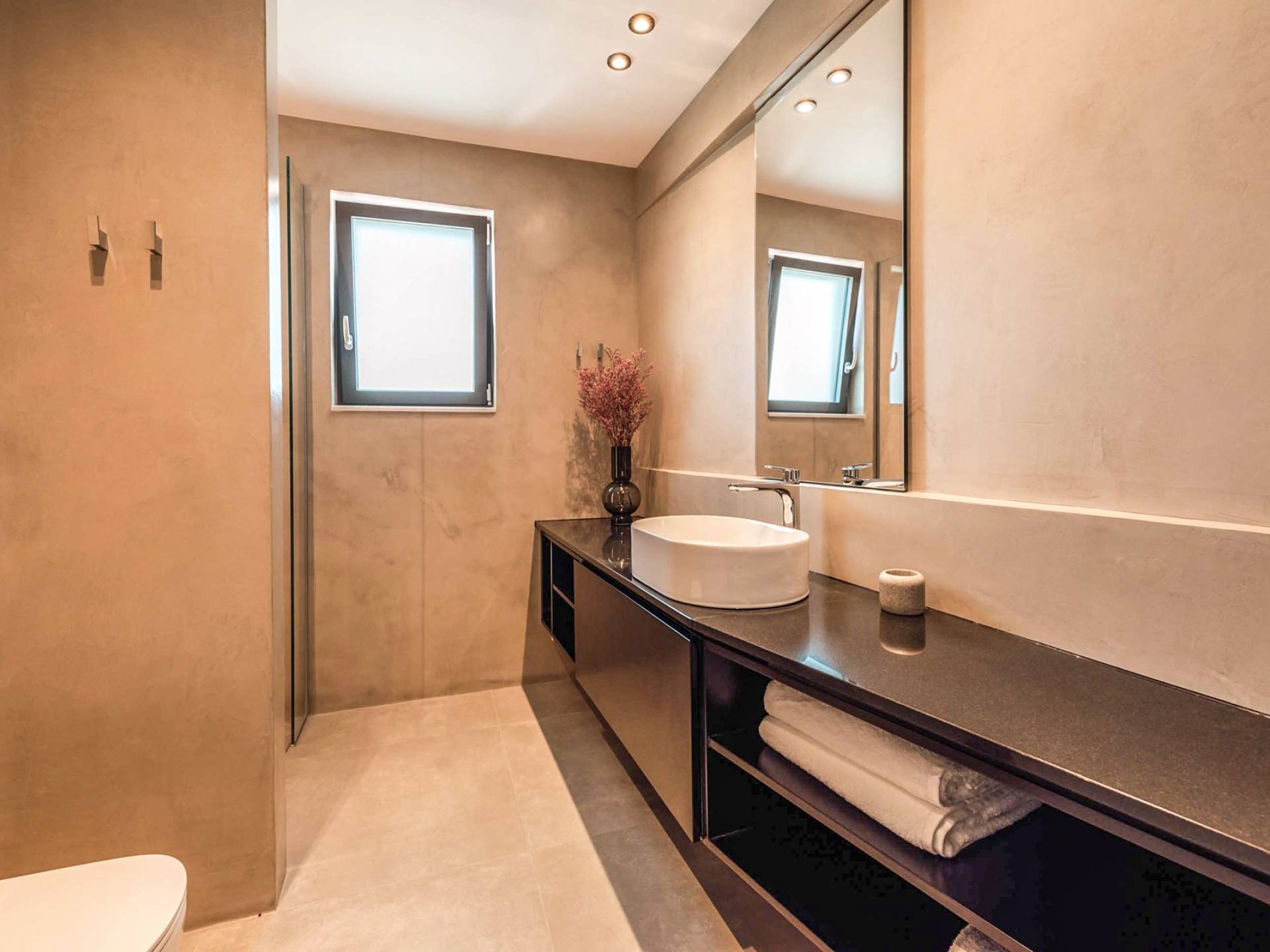 Die großen Fenster erzeugen die Illusion von Transparenz und lassen den Raum von einer Flut kretischen Sonnenscheins erhellen. Wenn Sie mit dem Aufzug die untere Etage erreichen, finden Sie drei modern gestaltete Schlafzimmer mit Kingsize-Betten und eigenem Bad, die völlige Autonomie und Privatsphäre bieten. Neben den Schlafzimmern finden Sie zu Ihrer Bequemlichkeit eine Kaffeebar mit zwei Kaffeemaschinen, einem kleinen Kühlschrank und ausreichend Geschirr für Ihre Bedürfnisse.