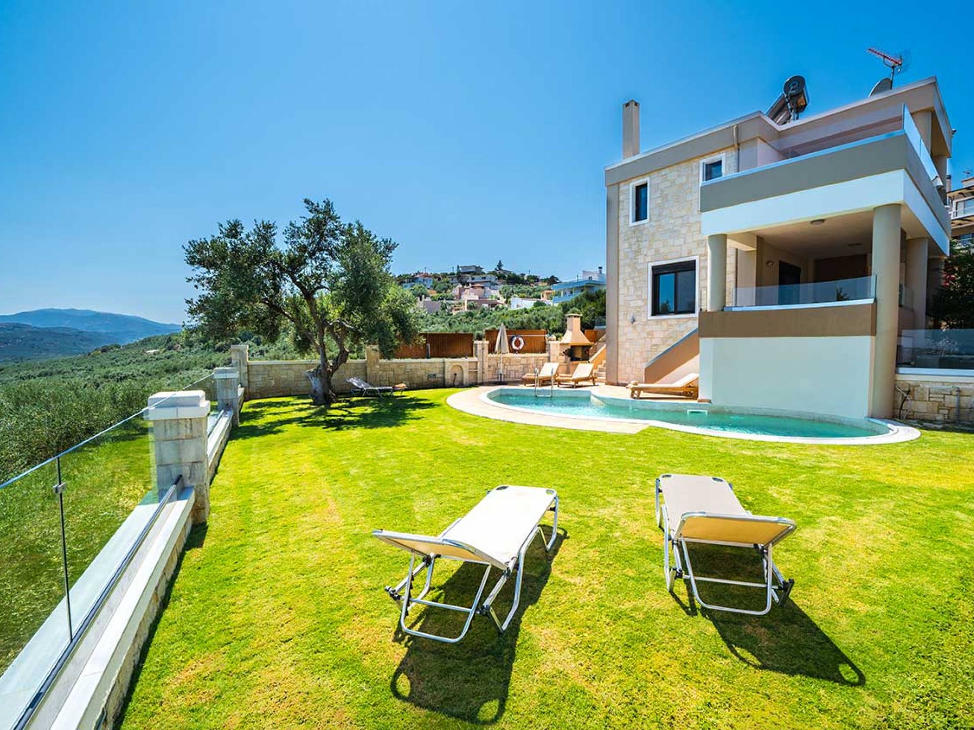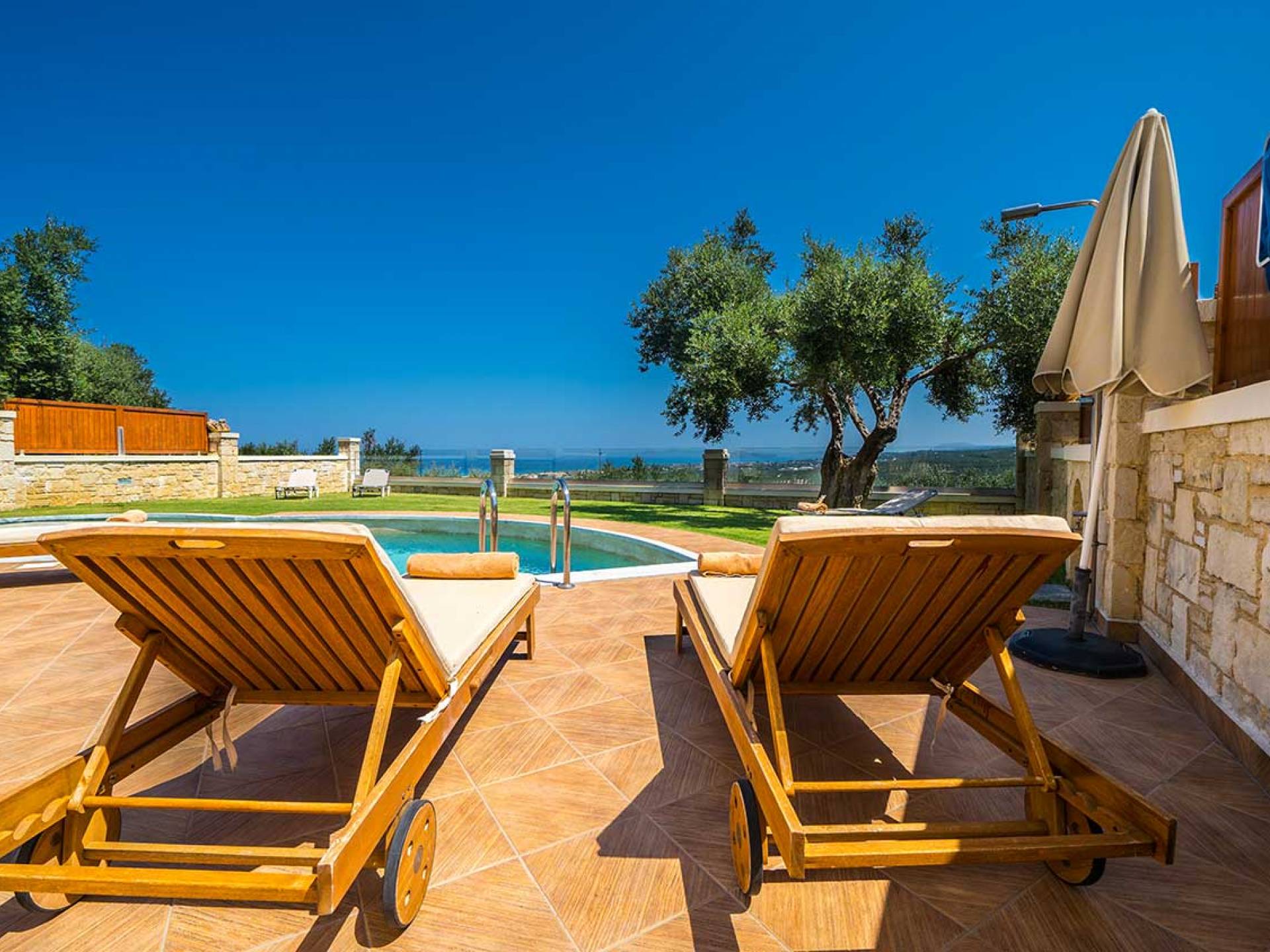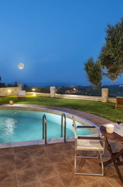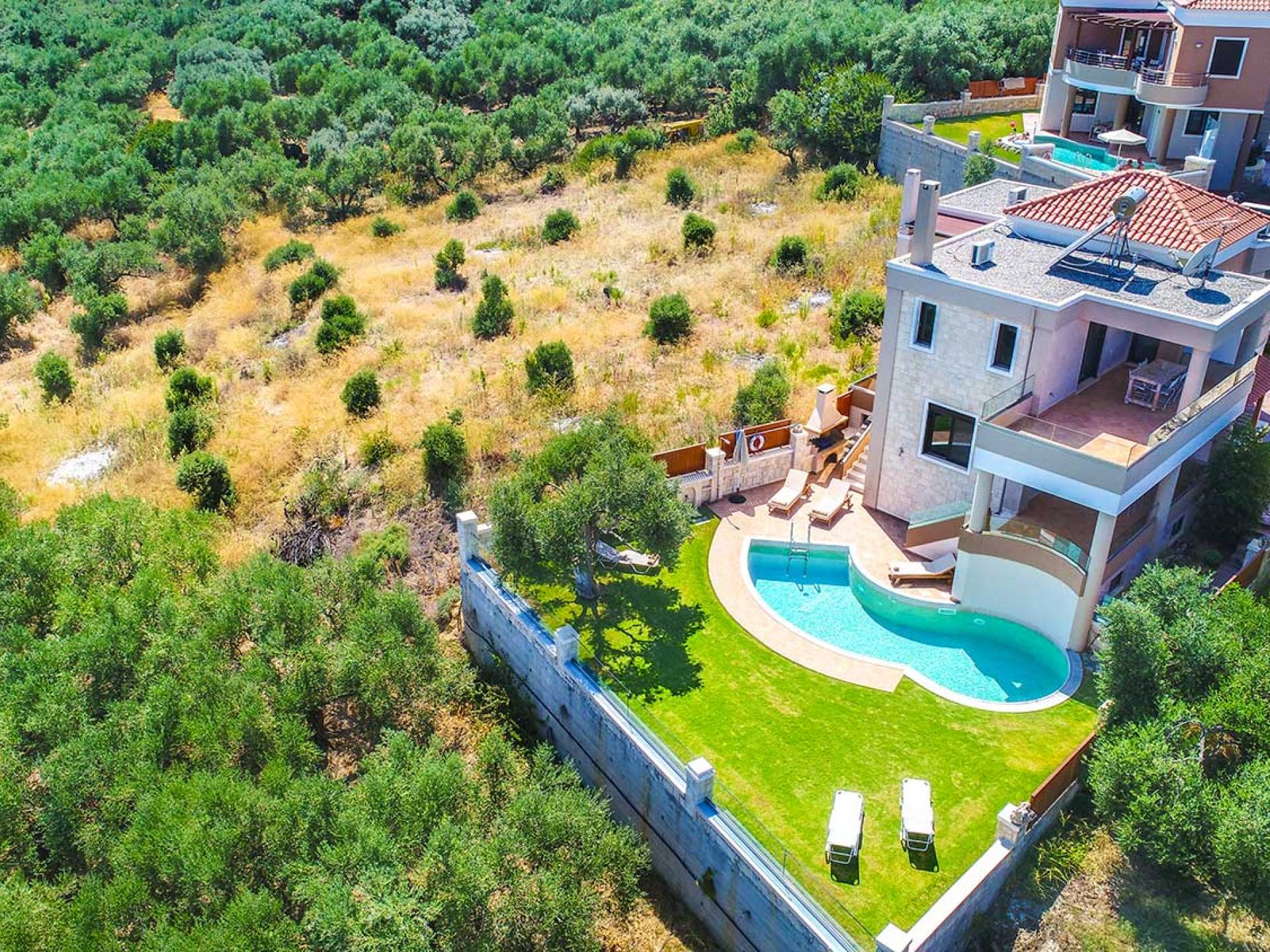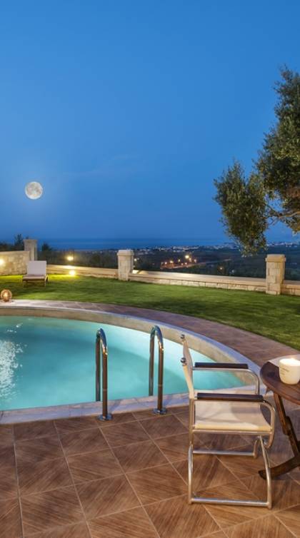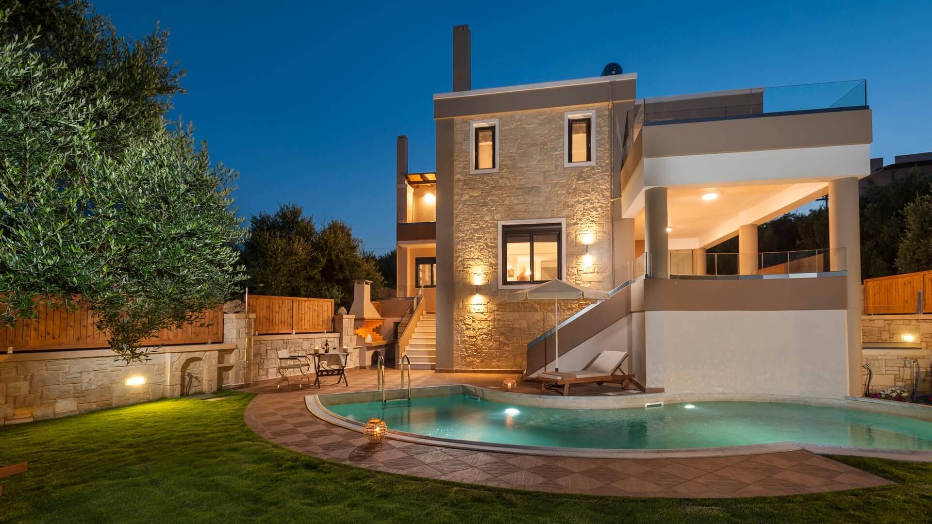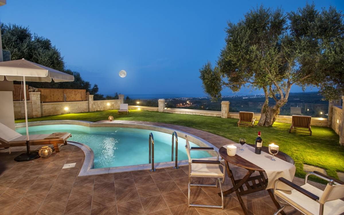 Es gibt einen großen privaten Swimmingpool mit optionaler Heizung, einen großen privaten Garten mit Grillplatz und einen Parkplatz. Der gesamte Poolbereich ist mit Sonnenliegen, Stühlen und Tischen zum Essen und Sonnenschirmen ausgestattet. Am Abend können Sie entweder den herrlichen romantischen Sonnenuntergang genießen, der mit den schönsten Farben den klaren blauen Mittelmeerhimmel malt oder Sie fahren in ca. 3-4 Minuten Entfernung zu den nächsten Restaurants und probieren die kretische Küche. Entspannen Sie sich und genießen Sie die private und exklusive Atmosphäre eines Deluxe-Hauses mit 5-Sterne-Ausstattung.