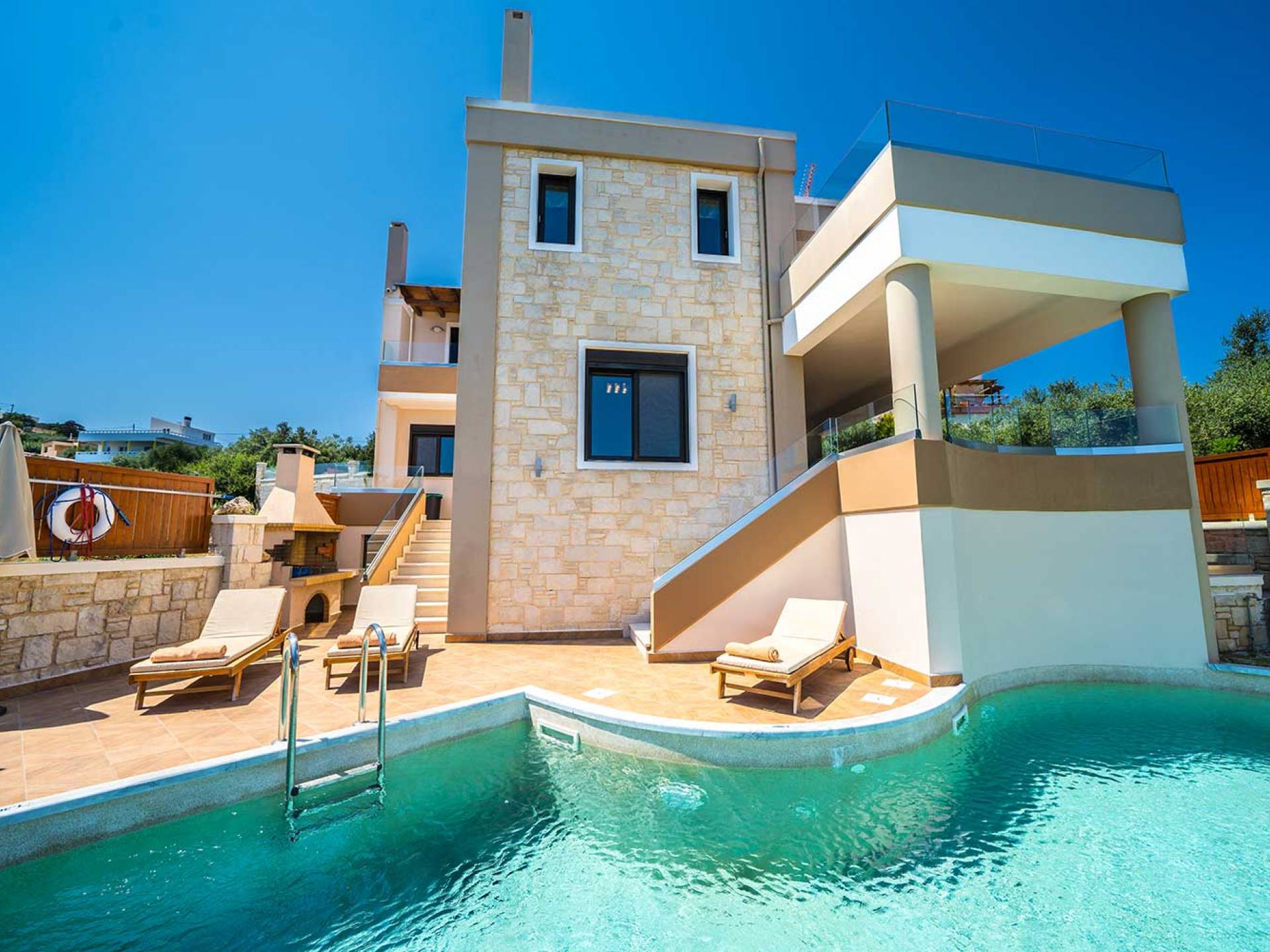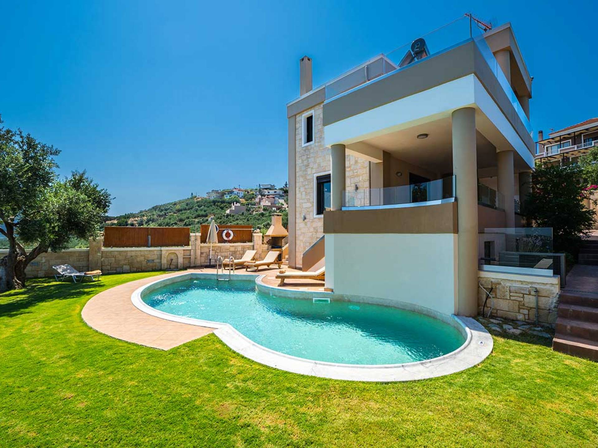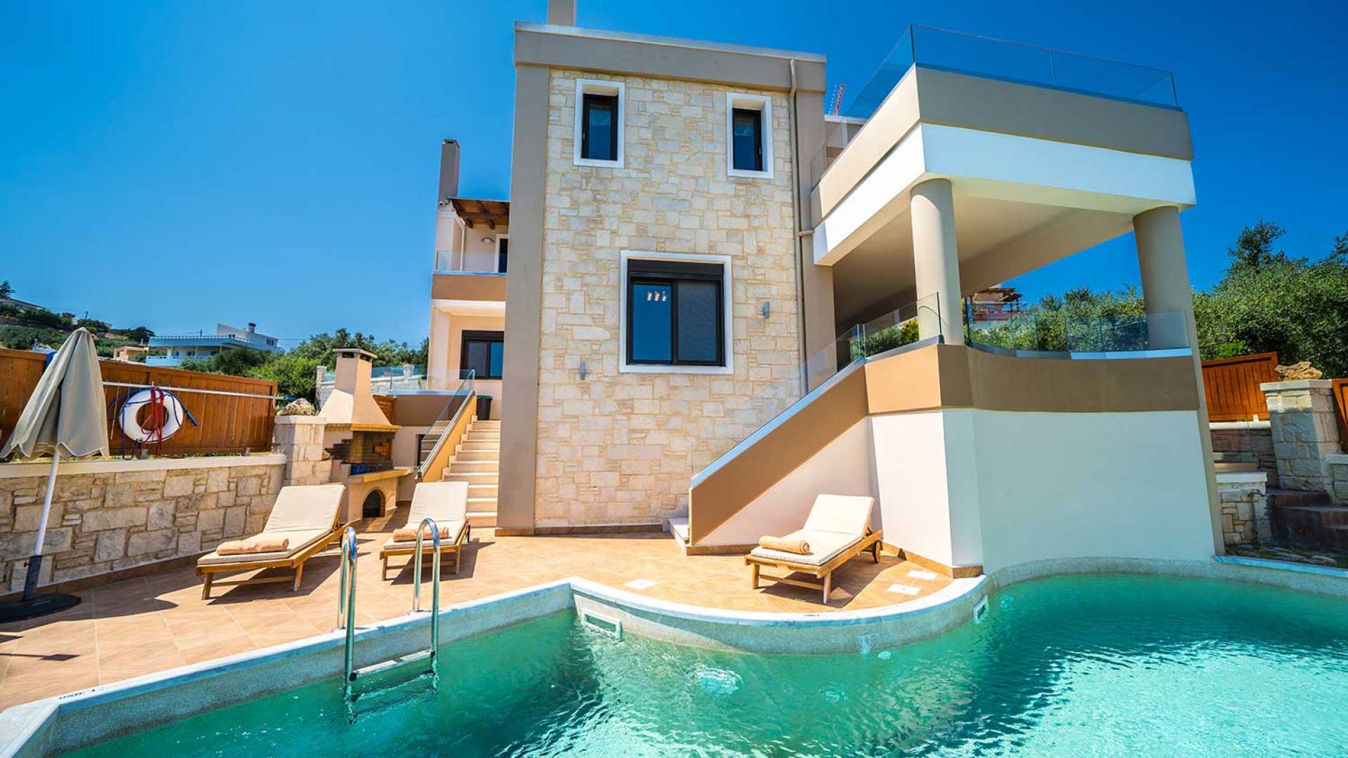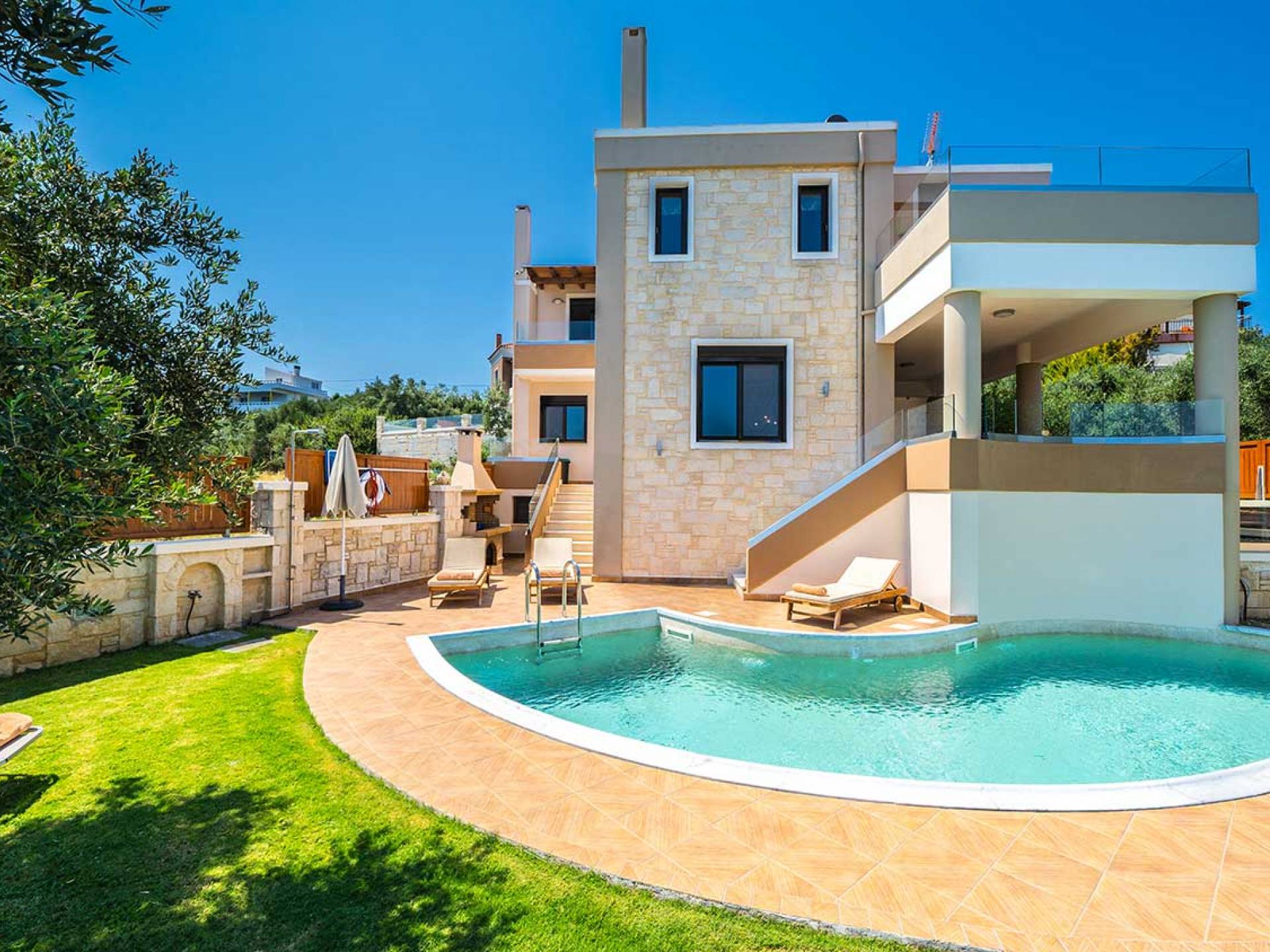 Es gibt einen großen privaten Swimmingpool mit optionaler Heizung, einen großen privaten Garten mit Grillplatz und einen Parkplatz. Der gesamte Poolbereich ist mit Sonnenliegen, Stühlen und Tischen zum Essen und Sonnenschirmen ausgestattet. Am Abend können Sie entweder den herrlichen romantischen Sonnenuntergang genießen, der mit den schönsten Farben den klaren blauen Mittelmeerhimmel malt oder Sie fahren in ca. 3-4 Minuten Entfernung zu den nächsten Restaurants und probieren die kretische Küche. Entspannen Sie sich und genießen Sie die private und exklusive Atmosphäre eines Deluxe-Hauses mit 5-Sterne-Ausstattung.