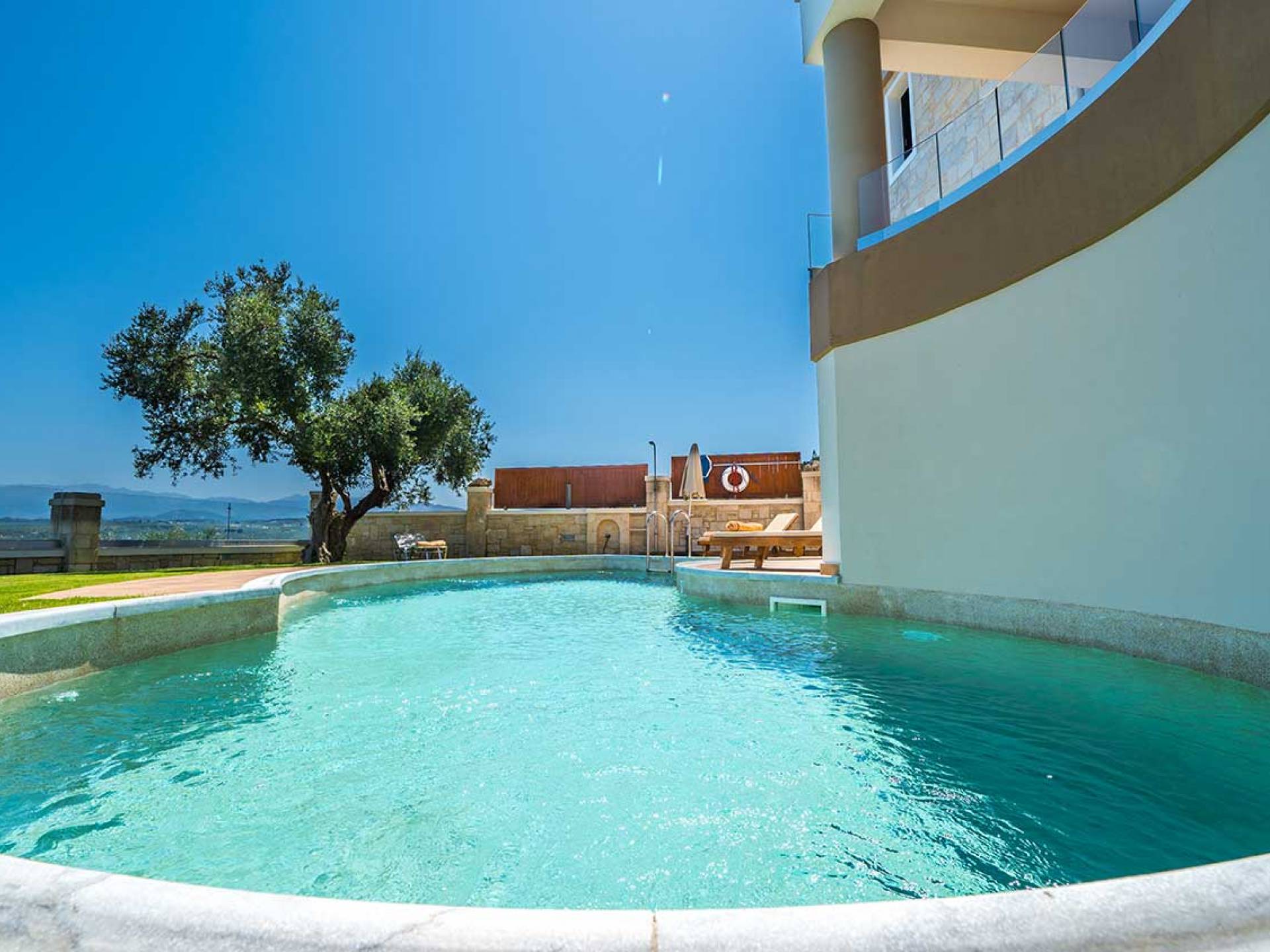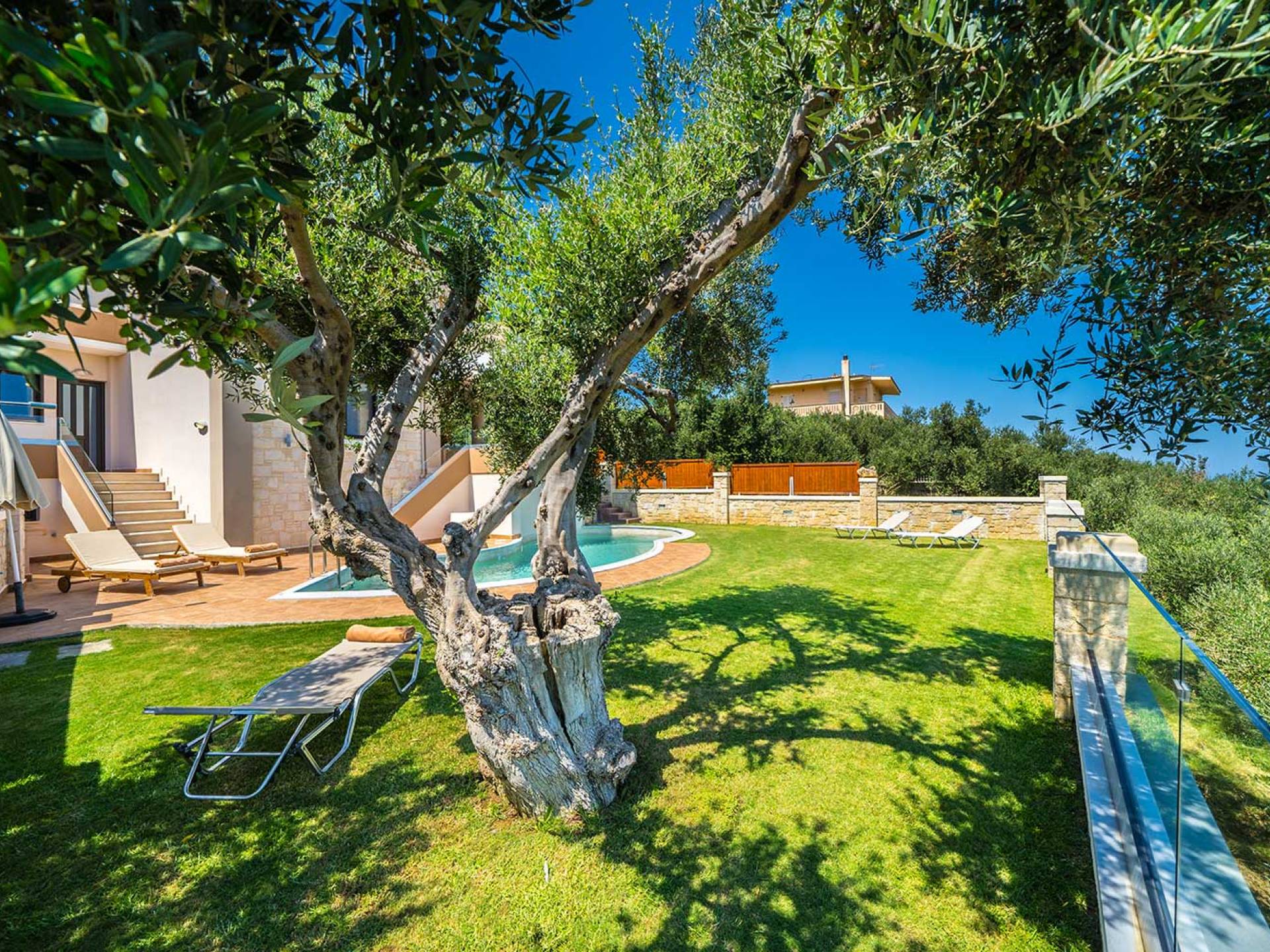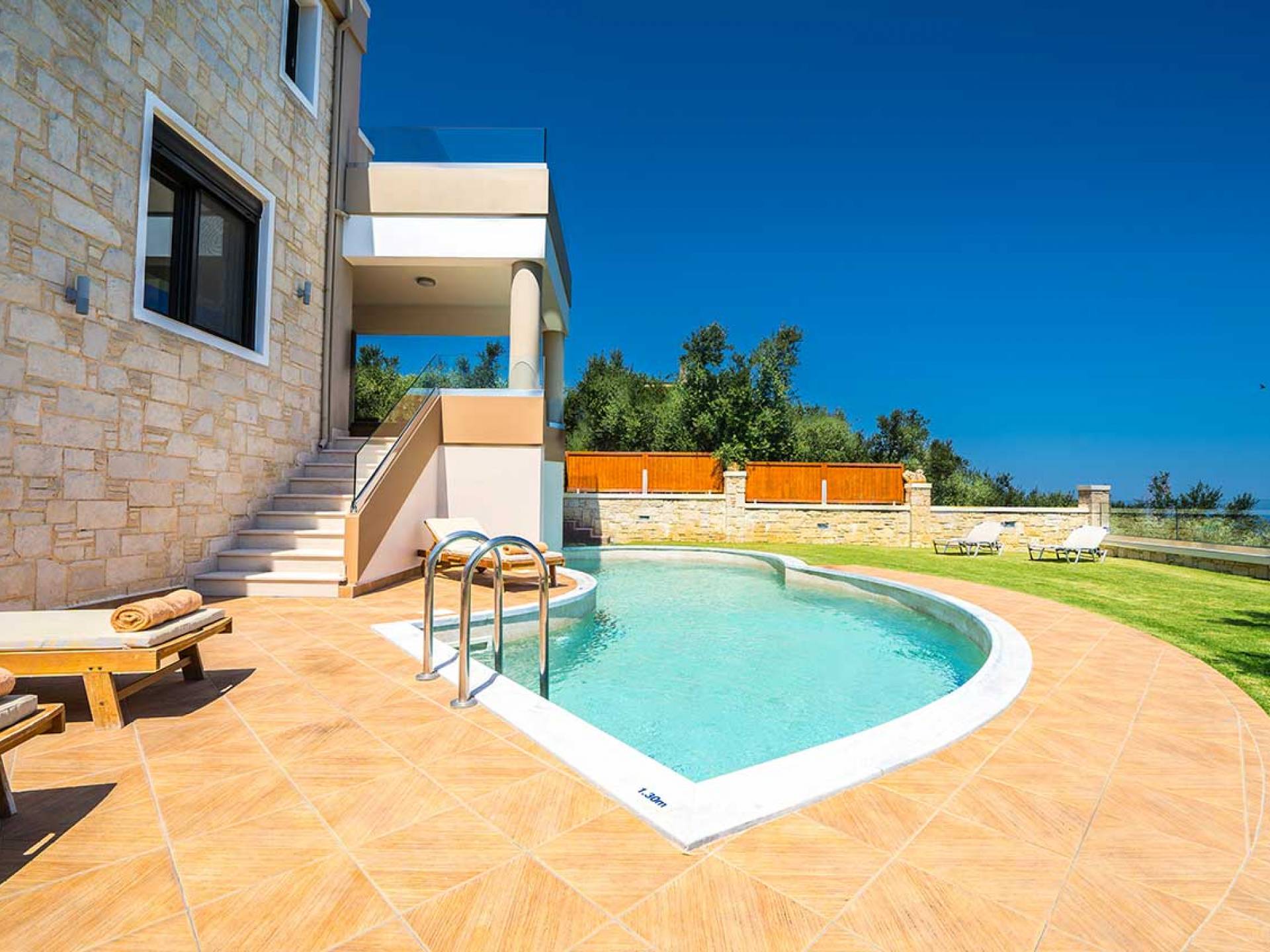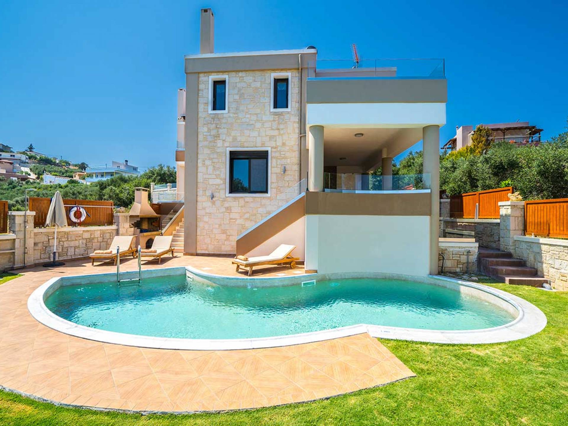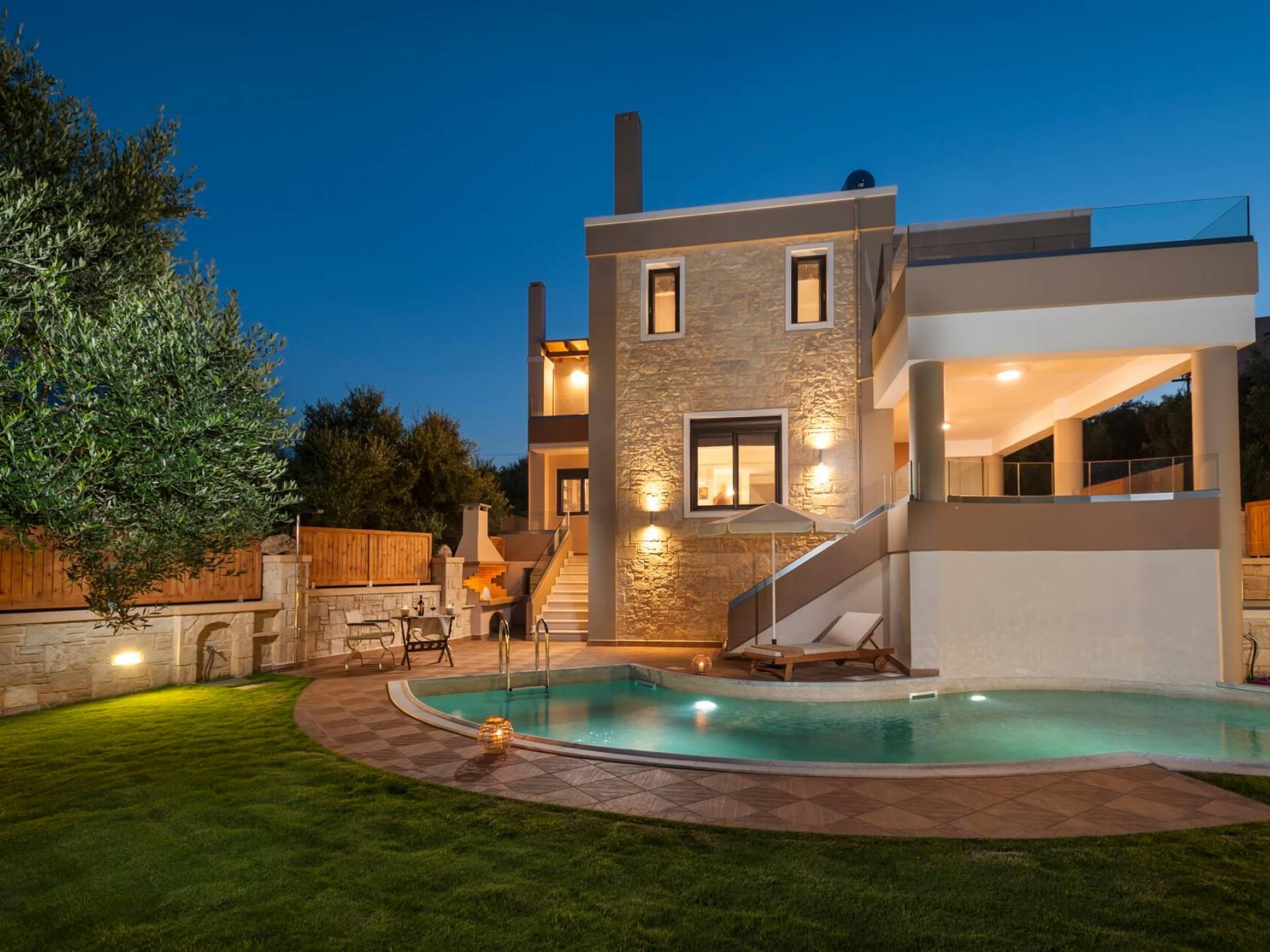 Es gibt einen großen privaten Swimmingpool mit optionaler Heizung, einen großen privaten Garten mit Grillplatz und einen Parkplatz. Der gesamte Poolbereich ist mit Sonnenliegen, Stühlen und Tischen zum Essen und Sonnenschirmen ausgestattet. Am Abend können Sie entweder den herrlichen romantischen Sonnenuntergang genießen, der mit den schönsten Farben den klaren blauen Mittelmeerhimmel malt oder Sie fahren in ca. 3-4 Minuten Entfernung zu den nächsten Restaurants und probieren die kretische Küche. Entspannen Sie sich und genießen Sie die private und exklusive Atmosphäre eines Deluxe-Hauses mit 5-Sterne-Ausstattung.