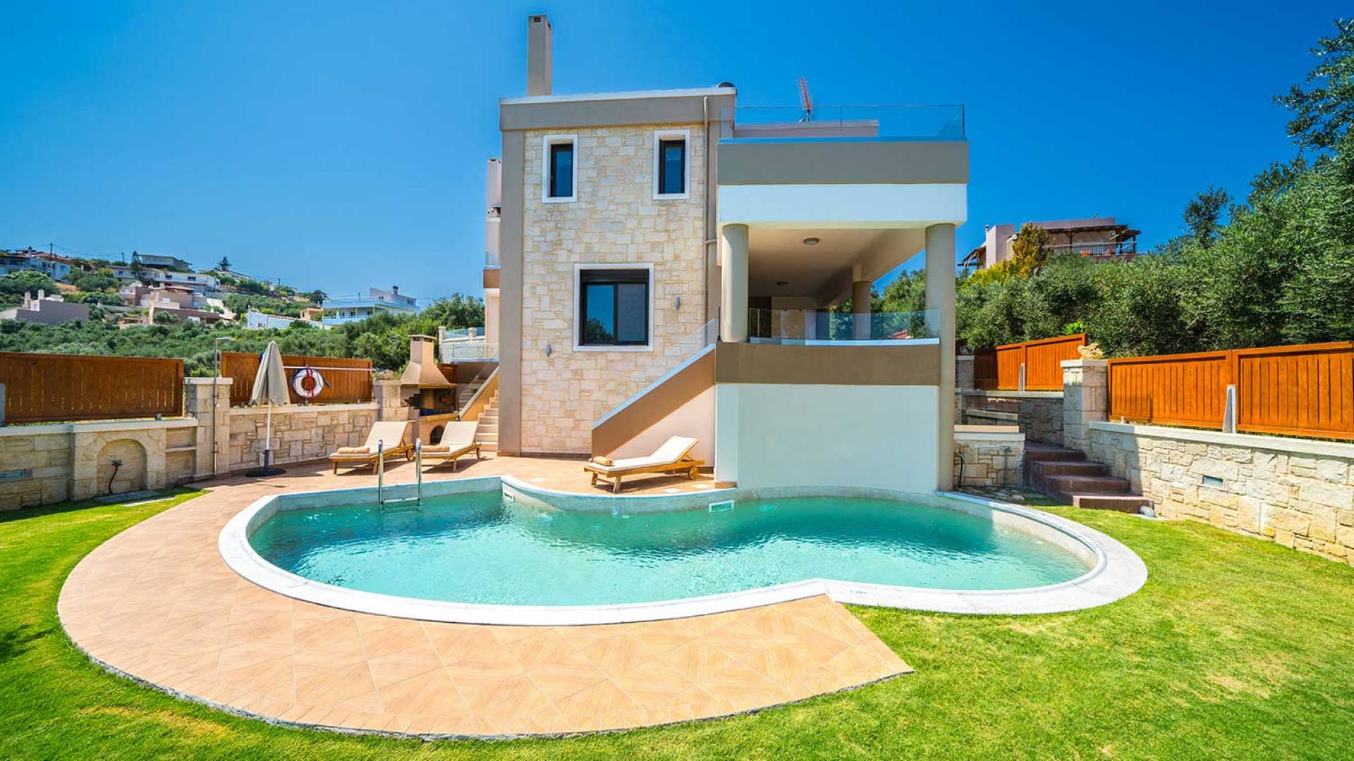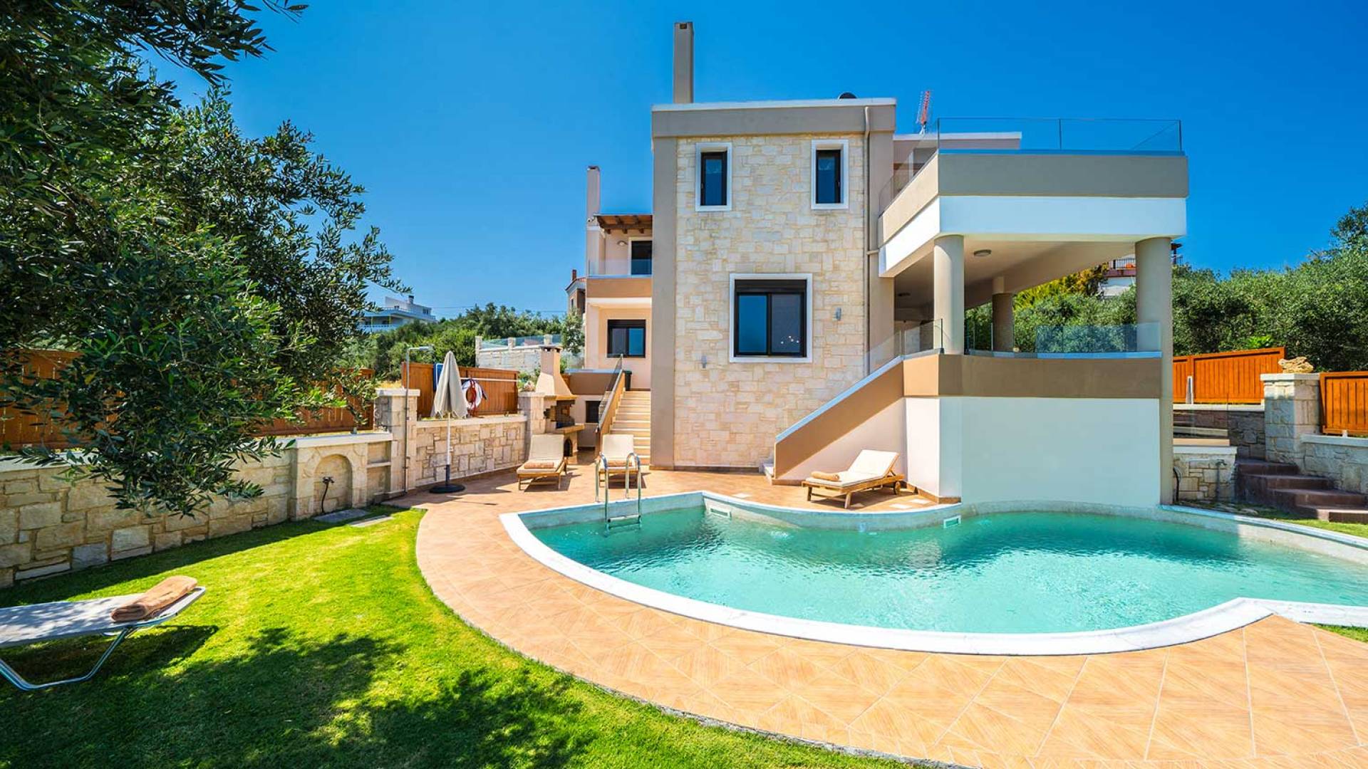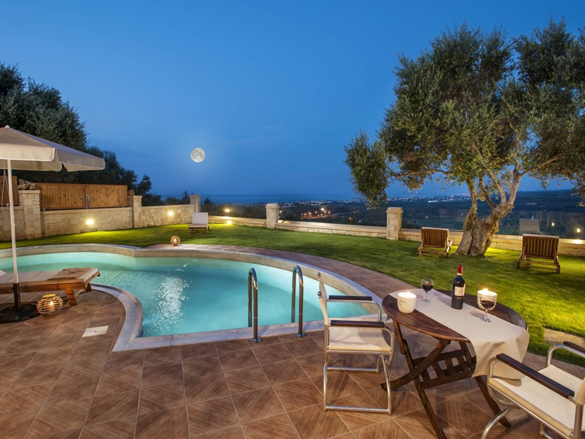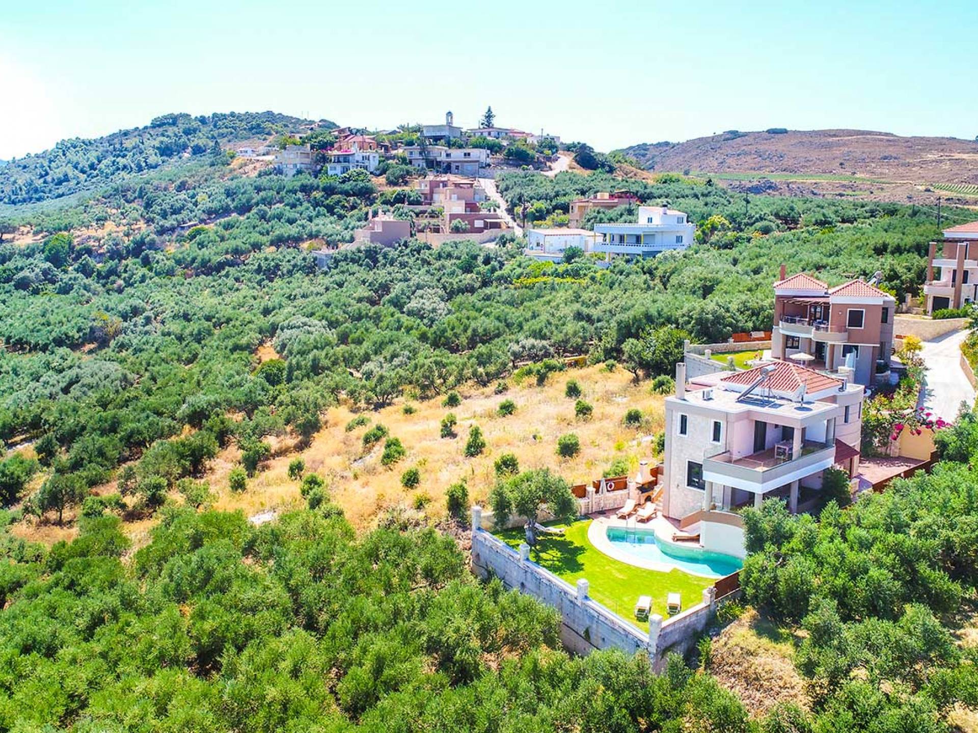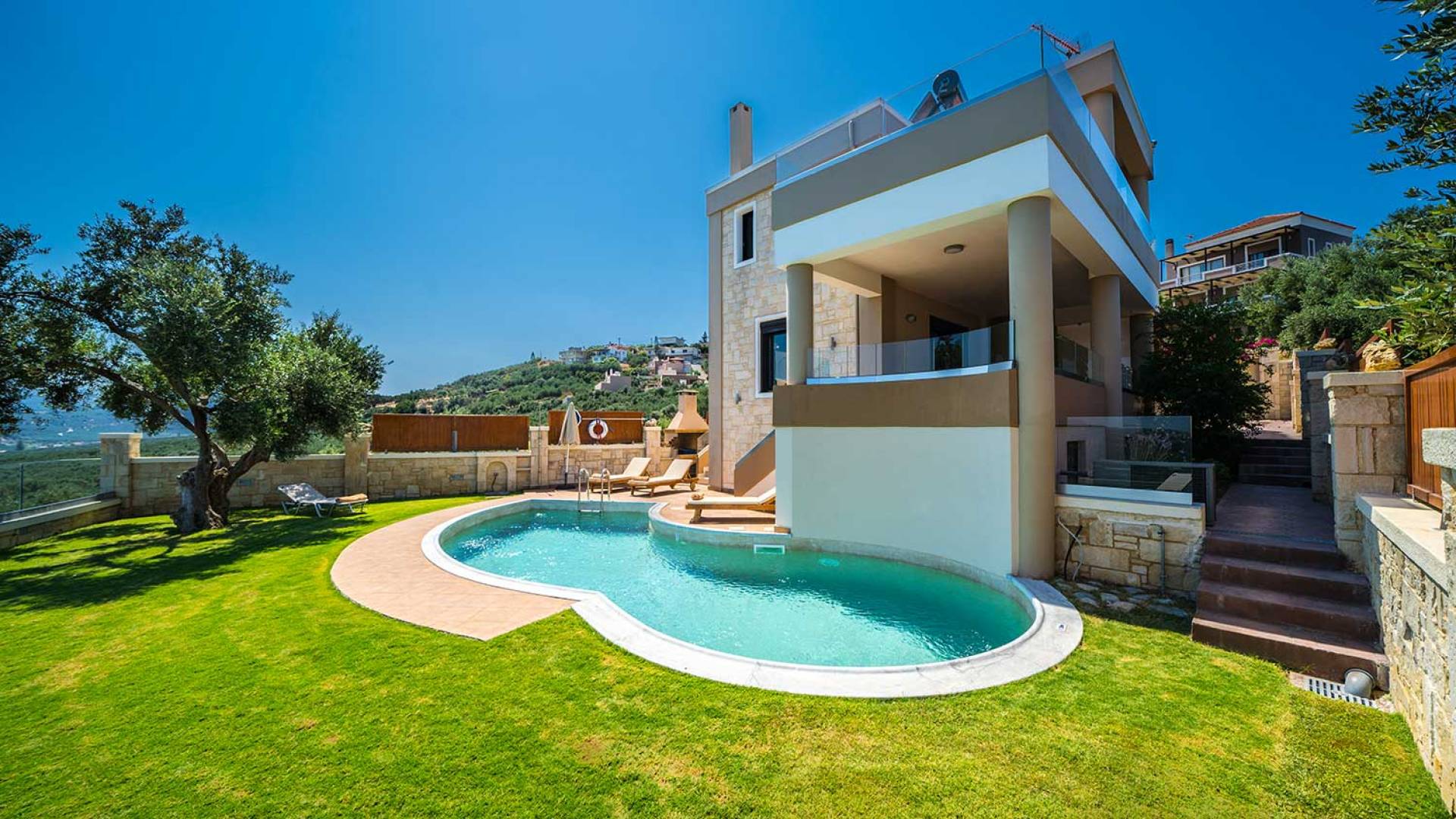 Es gibt einen großen privaten Swimmingpool mit optionaler Heizung, einen großen privaten Garten mit Grillplatz und einen Parkplatz. Der gesamte Poolbereich ist mit Sonnenliegen, Stühlen und Tischen zum Essen und Sonnenschirmen ausgestattet. Am Abend können Sie entweder den herrlichen romantischen Sonnenuntergang genießen, der mit den schönsten Farben den klaren blauen Mittelmeerhimmel malt oder Sie fahren in ca. 3-4 Minuten Entfernung zu den nächsten Restaurants und probieren die kretische Küche. Entspannen Sie sich und genießen Sie die private und exklusive Atmosphäre eines Deluxe-Hauses mit 5-Sterne-Ausstattung.