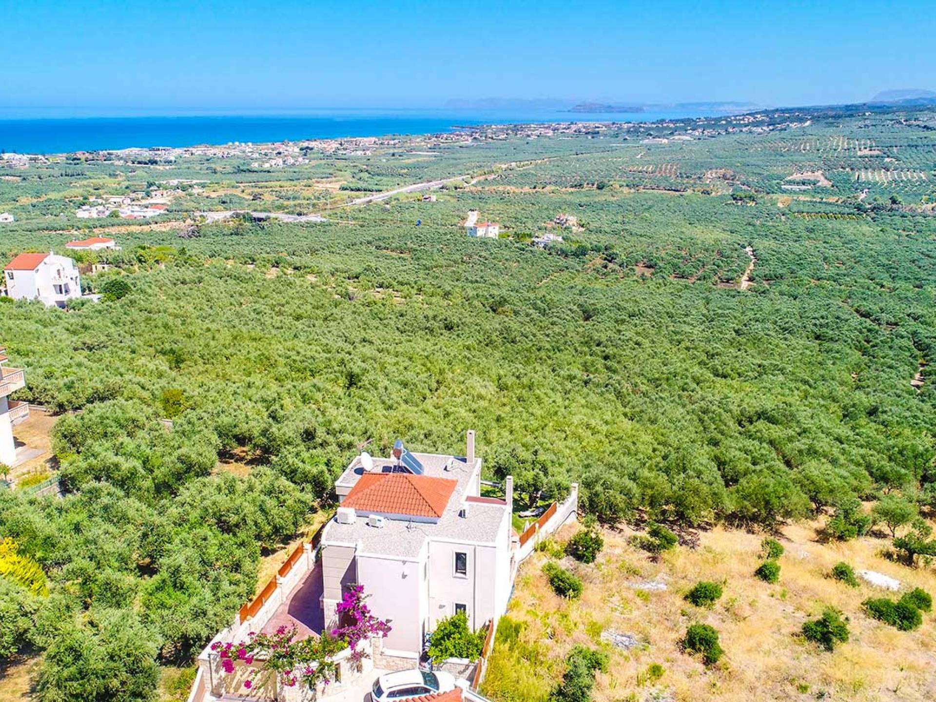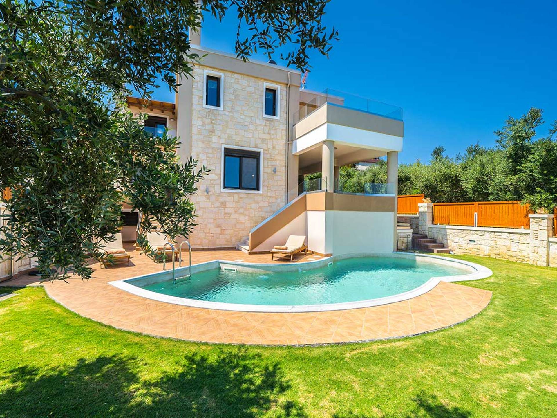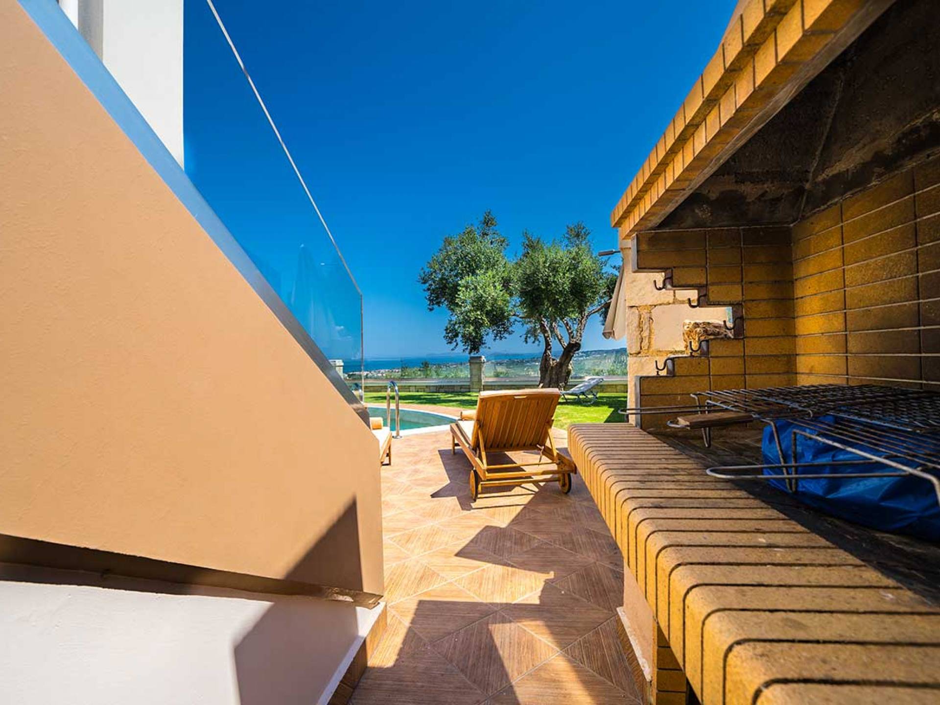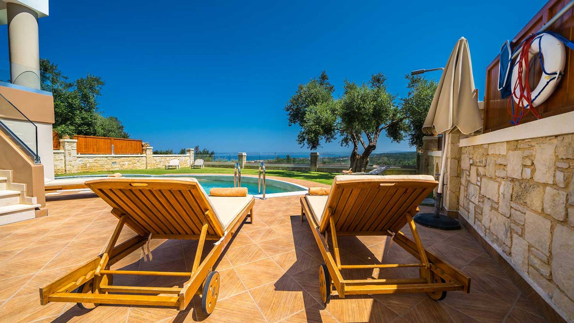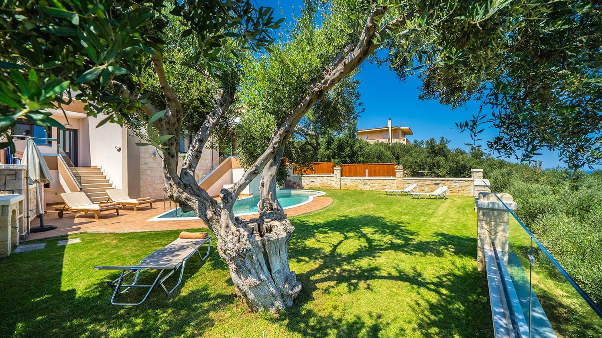 Es gibt einen großen privaten Swimmingpool mit optionaler Heizung, einen großen privaten Garten mit Grillplatz und einen Parkplatz. Der gesamte Poolbereich ist mit Sonnenliegen, Stühlen und Tischen zum Essen und Sonnenschirmen ausgestattet. Am Abend können Sie entweder den herrlichen romantischen Sonnenuntergang genießen, der mit den schönsten Farben den klaren blauen Mittelmeerhimmel malt oder Sie fahren in ca. 3-4 Minuten Entfernung zu den nächsten Restaurants und probieren die kretische Küche. Entspannen Sie sich und genießen Sie die private und exklusive Atmosphäre eines Deluxe-Hauses mit 5-Sterne-Ausstattung.