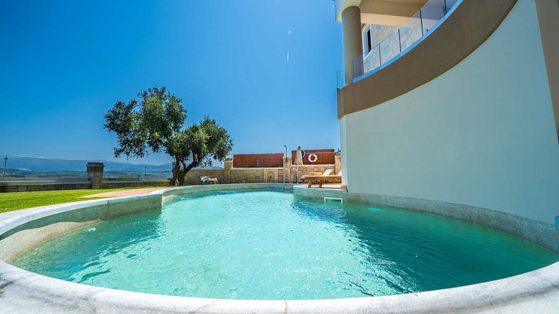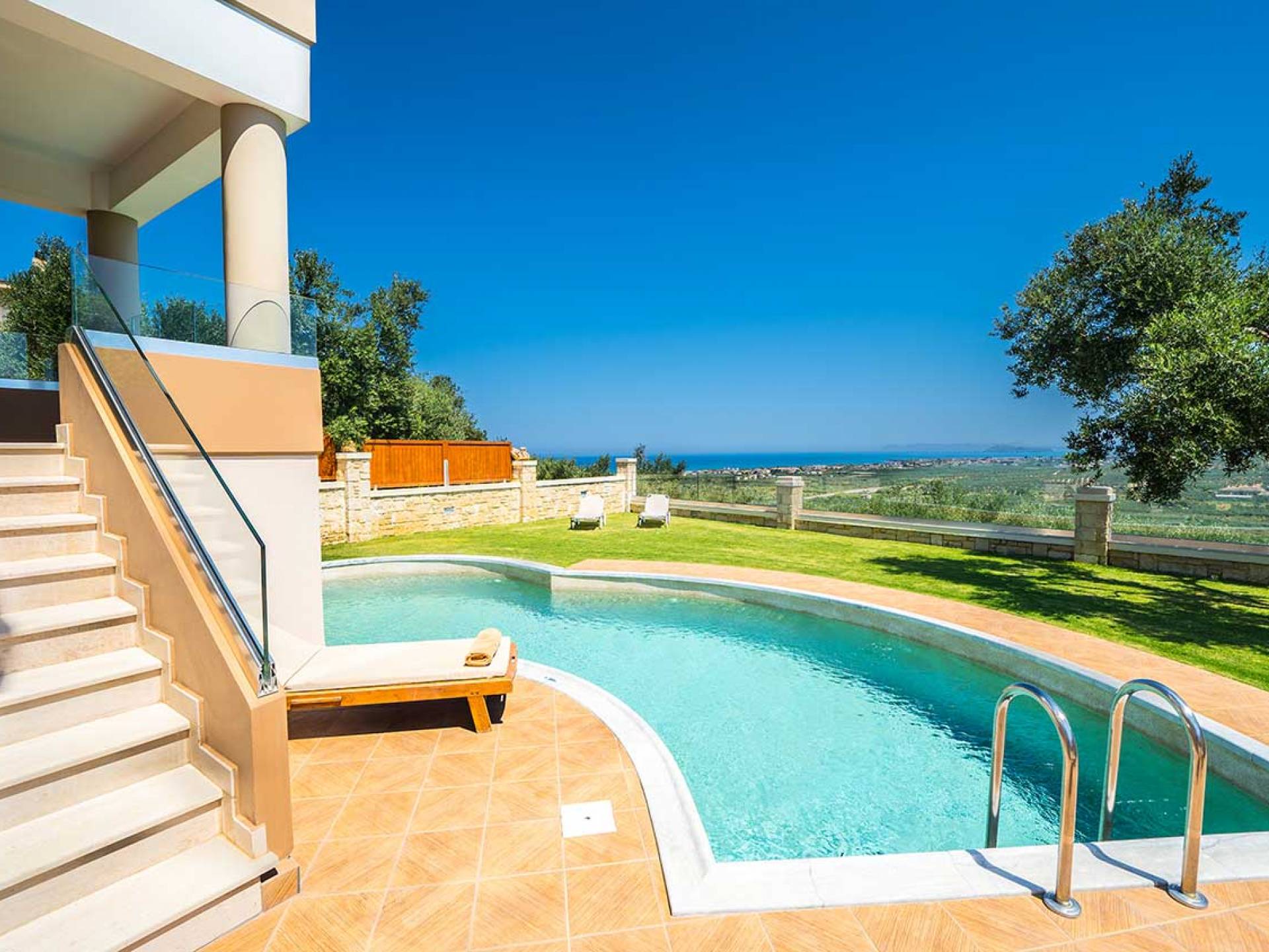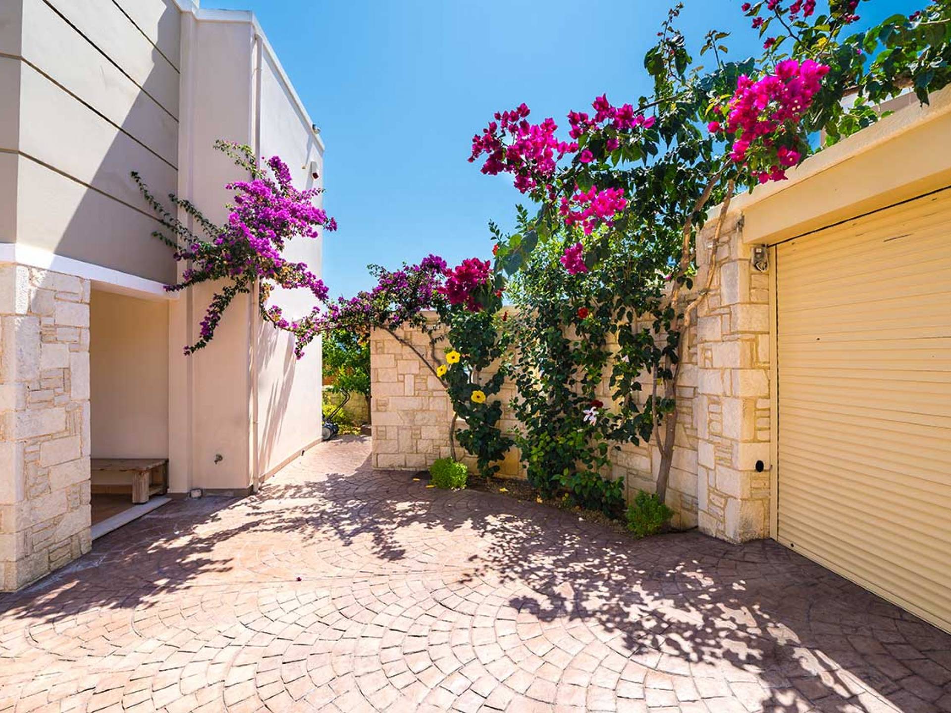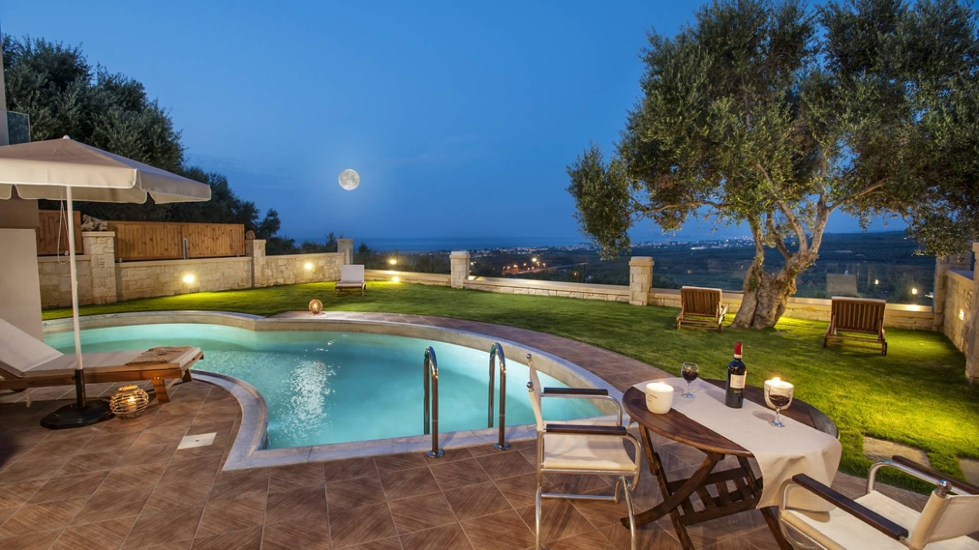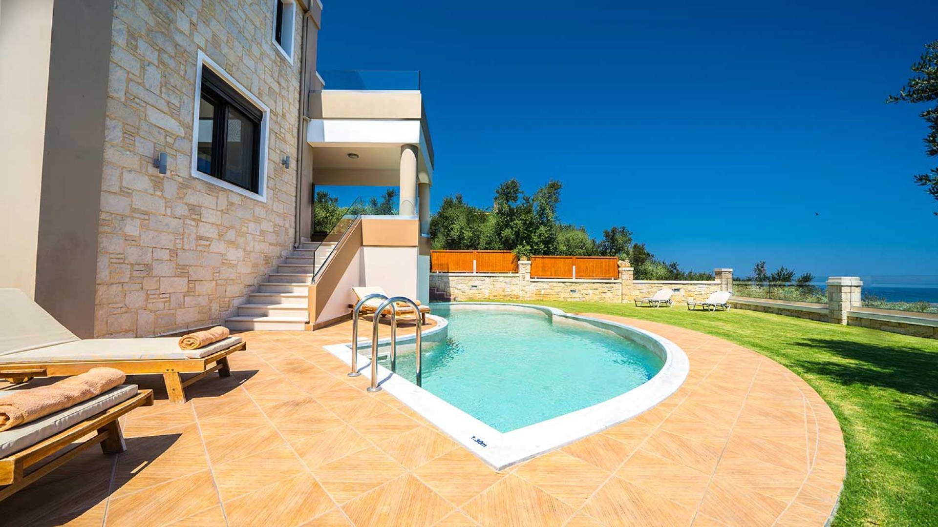 Es gibt einen großen privaten Swimmingpool mit optionaler Heizung, einen großen privaten Garten mit Grillplatz und einen Parkplatz. Der gesamte Poolbereich ist mit Sonnenliegen, Stühlen und Tischen zum Essen und Sonnenschirmen ausgestattet. Am Abend können Sie entweder den herrlichen romantischen Sonnenuntergang genießen, der mit den schönsten Farben den klaren blauen Mittelmeerhimmel malt oder Sie fahren in ca. 3-4 Minuten Entfernung zu den nächsten Restaurants und probieren die kretische Küche. Entspannen Sie sich und genießen Sie die private und exklusive Atmosphäre eines Deluxe-Hauses mit 5-Sterne-Ausstattung.