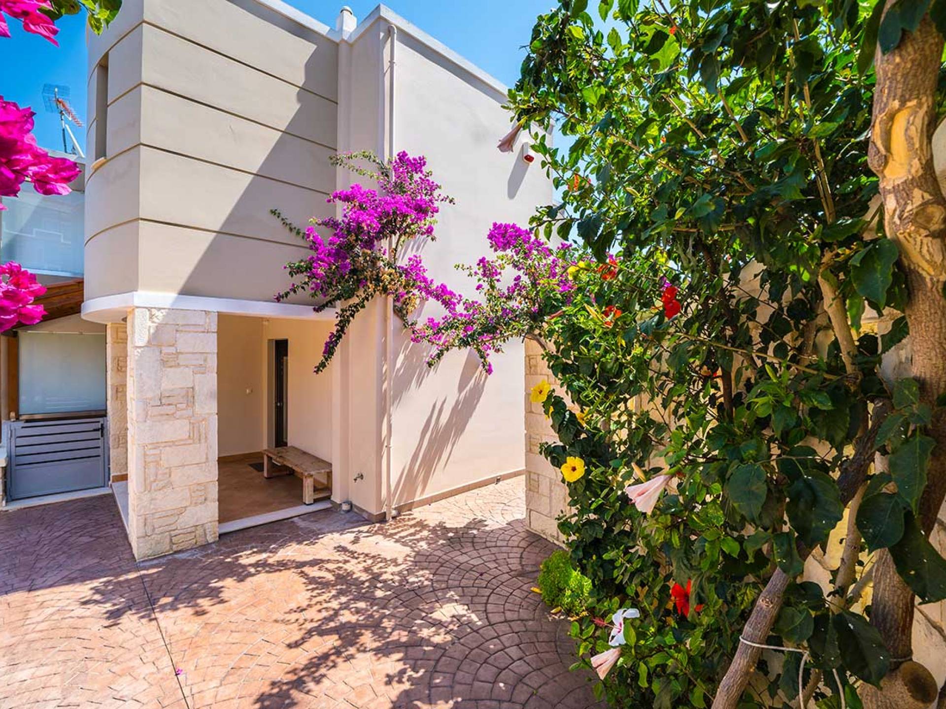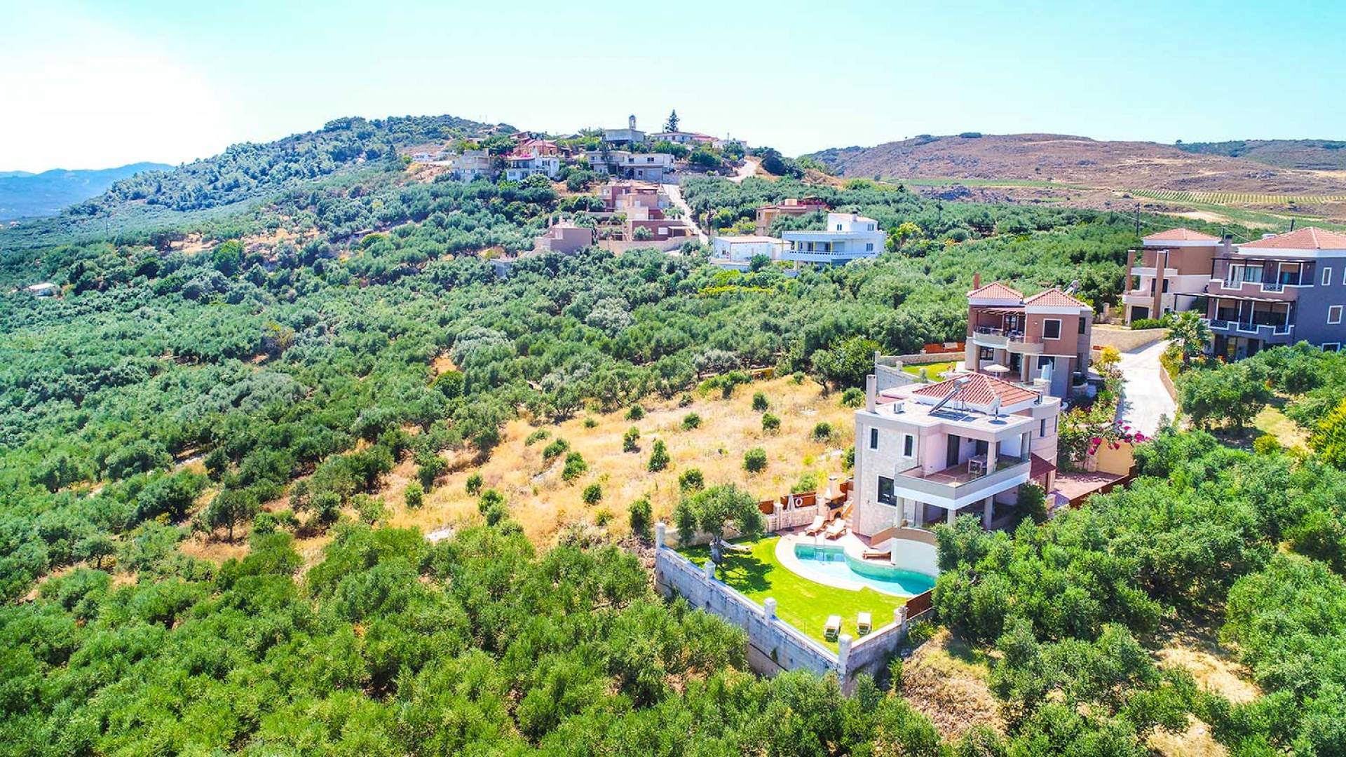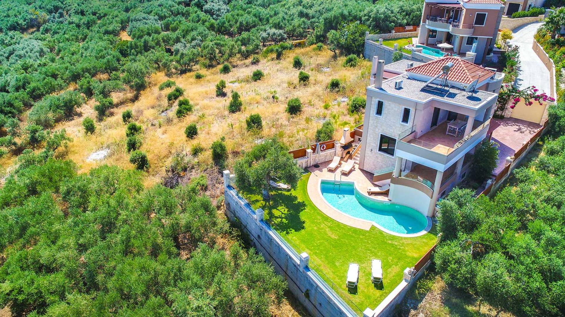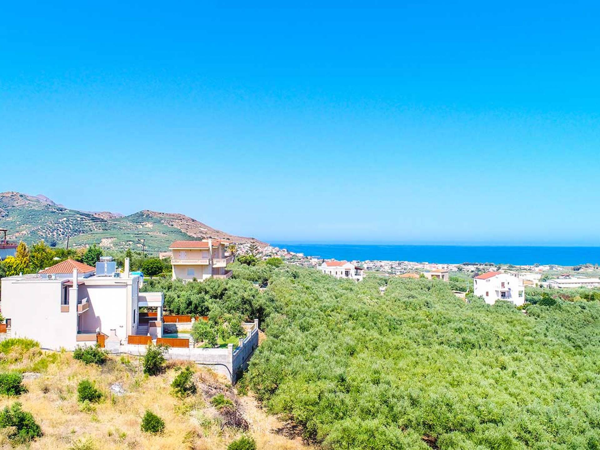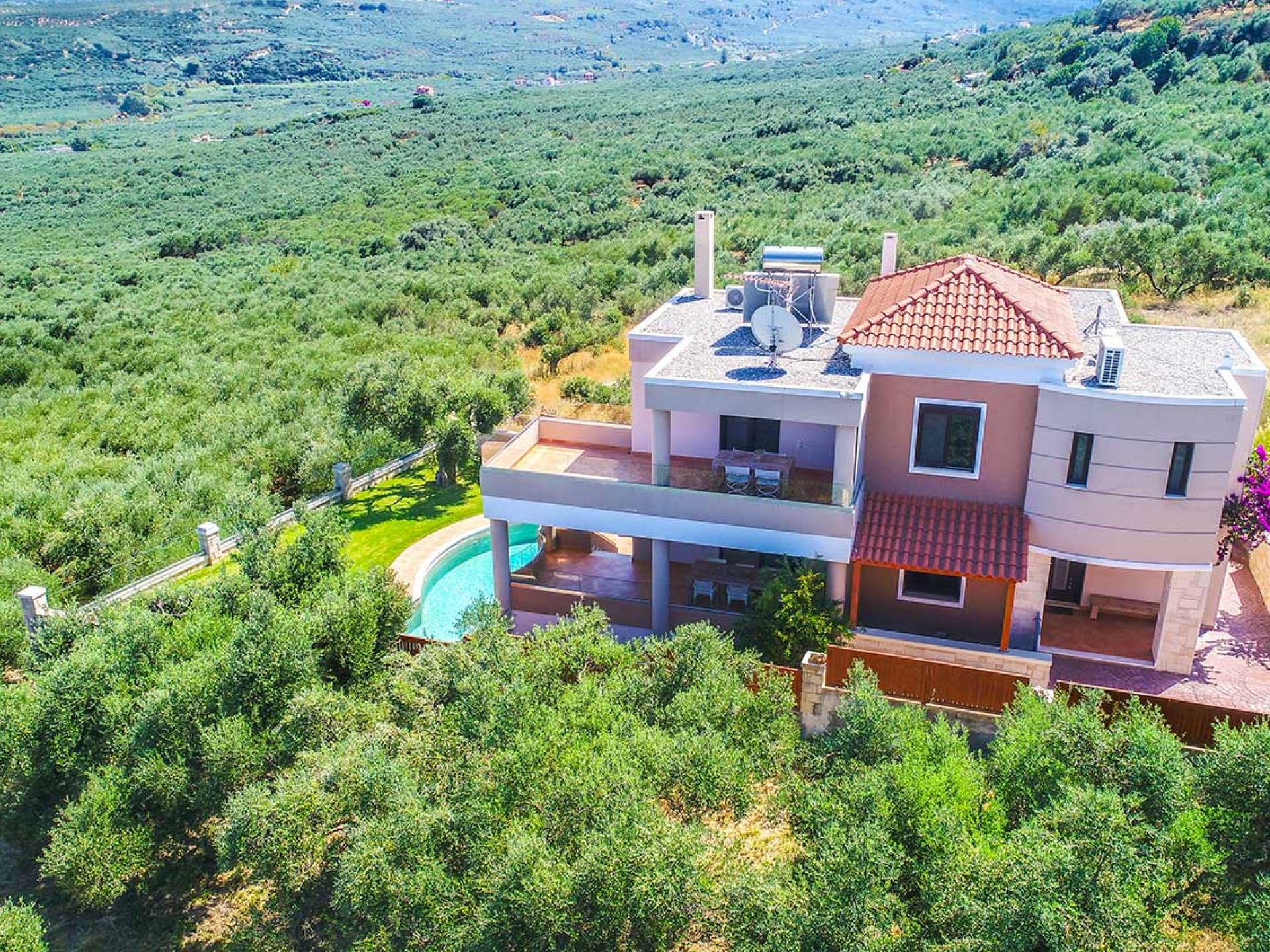 Es gibt einen großen privaten Swimmingpool mit optionaler Heizung, einen großen privaten Garten mit Grillplatz und einen Parkplatz. Der gesamte Poolbereich ist mit Sonnenliegen, Stühlen und Tischen zum Essen und Sonnenschirmen ausgestattet. Am Abend können Sie entweder den herrlichen romantischen Sonnenuntergang genießen, der mit den schönsten Farben den klaren blauen Mittelmeerhimmel malt oder Sie fahren in ca. 3-4 Minuten Entfernung zu den nächsten Restaurants und probieren die kretische Küche. Entspannen Sie sich und genießen Sie die private und exklusive Atmosphäre eines Deluxe-Hauses mit 5-Sterne-Ausstattung.
