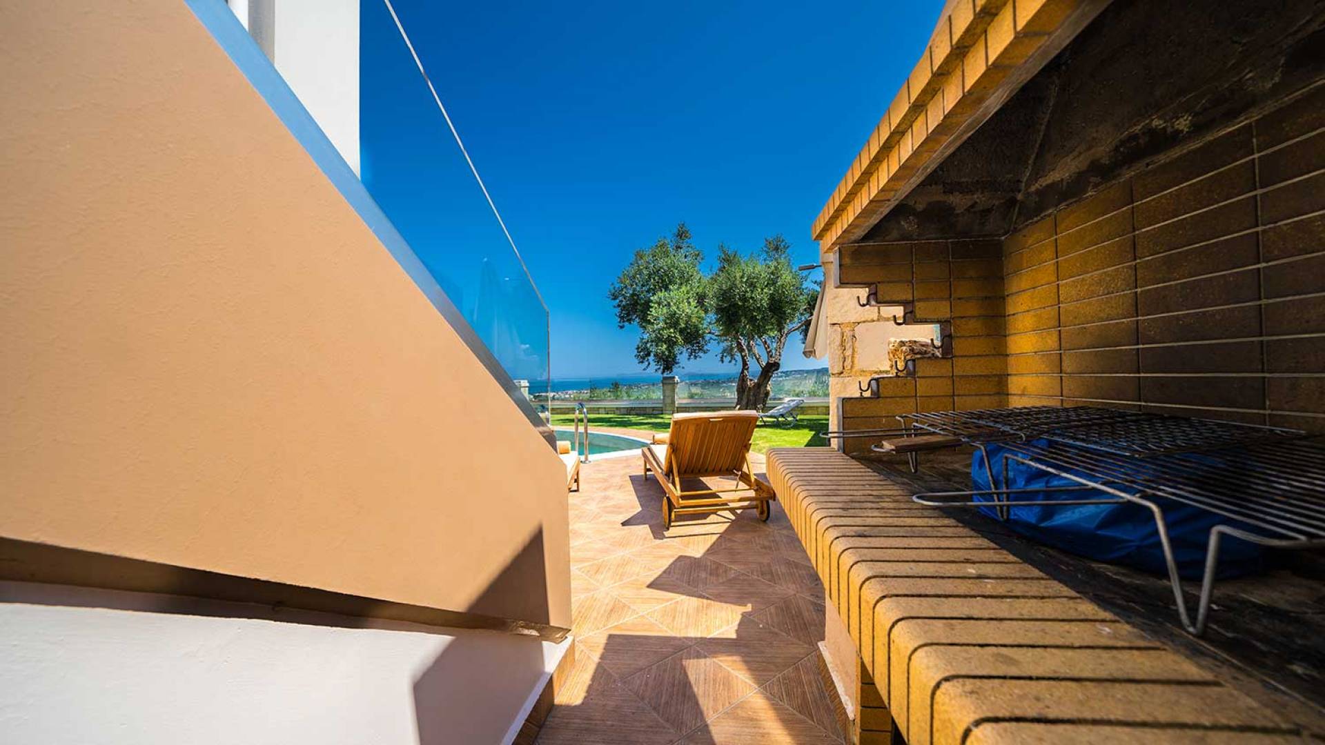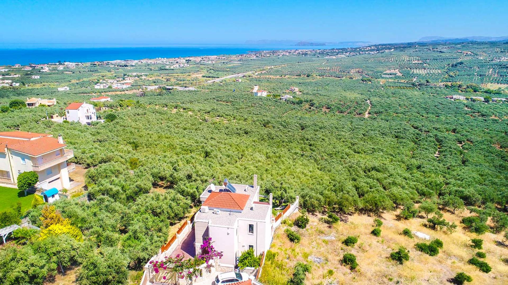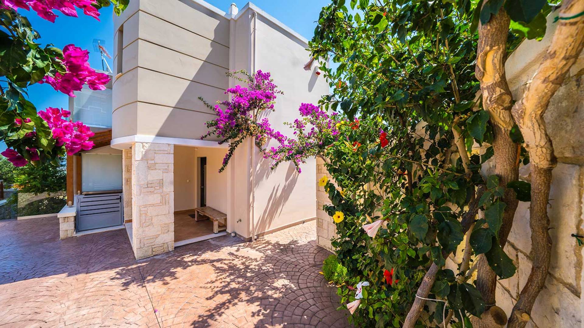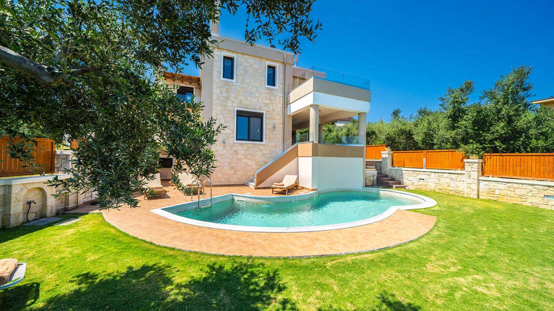 Es gibt einen großen privaten Swimmingpool mit optionaler Heizung, einen großen privaten Garten mit Grillplatz und einen Parkplatz. Der gesamte Poolbereich ist mit Sonnenliegen, Stühlen und Tischen zum Essen und Sonnenschirmen ausgestattet. Am Abend können Sie entweder den herrlichen romantischen Sonnenuntergang genießen, der mit den schönsten Farben den klaren blauen Mittelmeerhimmel malt oder Sie fahren in ca. 3-4 Minuten Entfernung zu den nächsten Restaurants und probieren die kretische Küche. Entspannen Sie sich und genießen Sie die private und exklusive Atmosphäre eines Deluxe-Hauses mit 5-Sterne-Ausstattung.