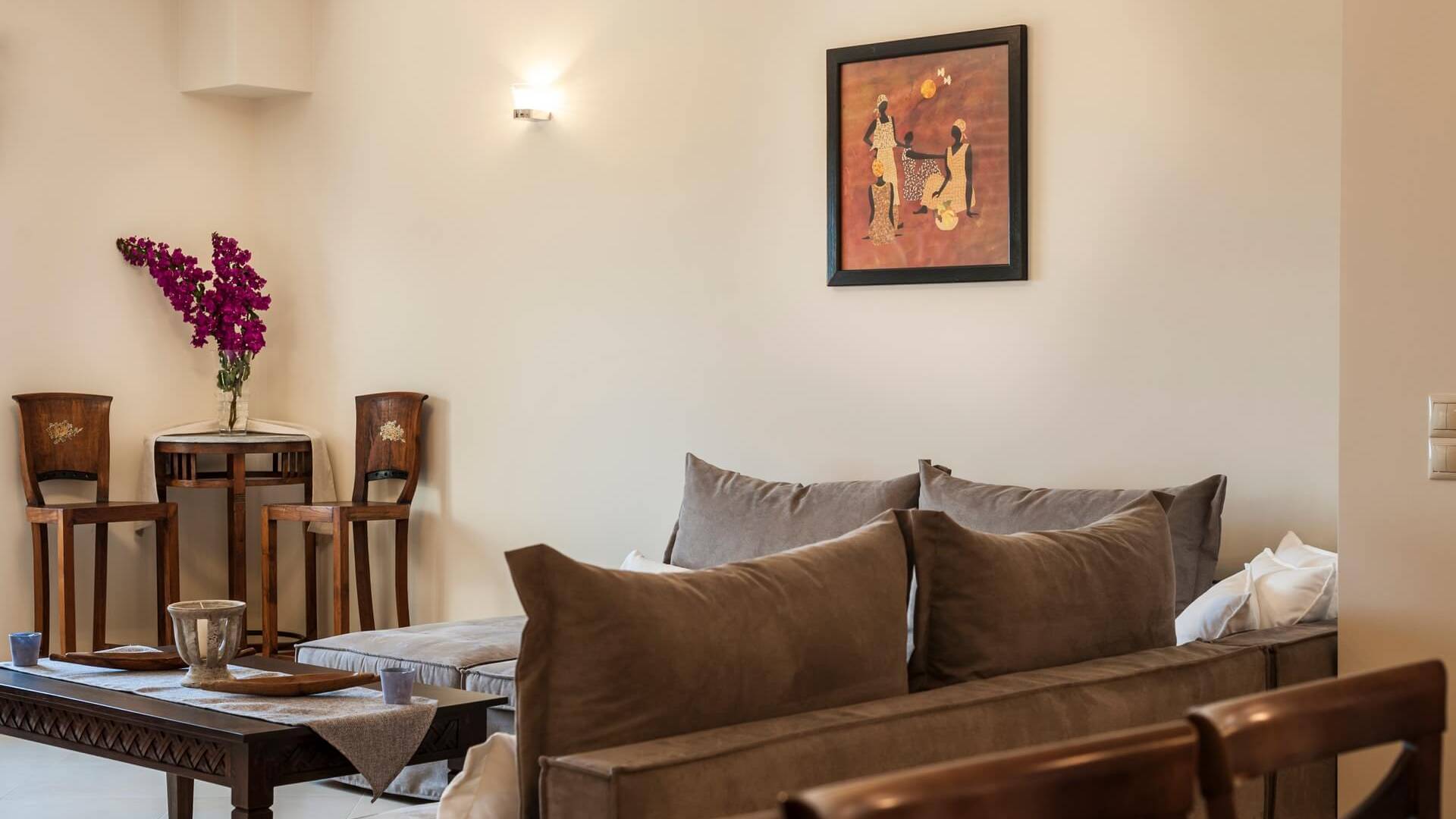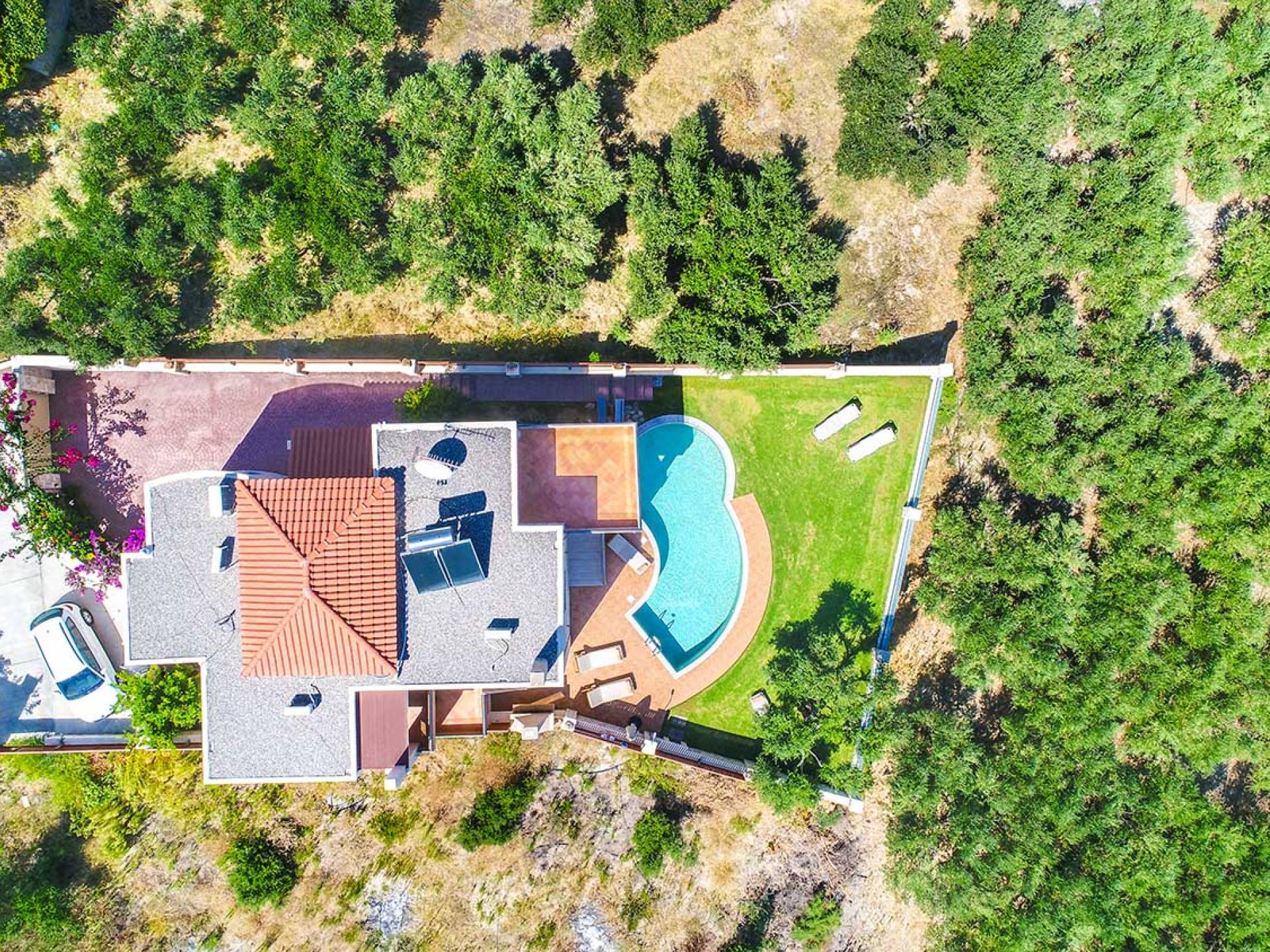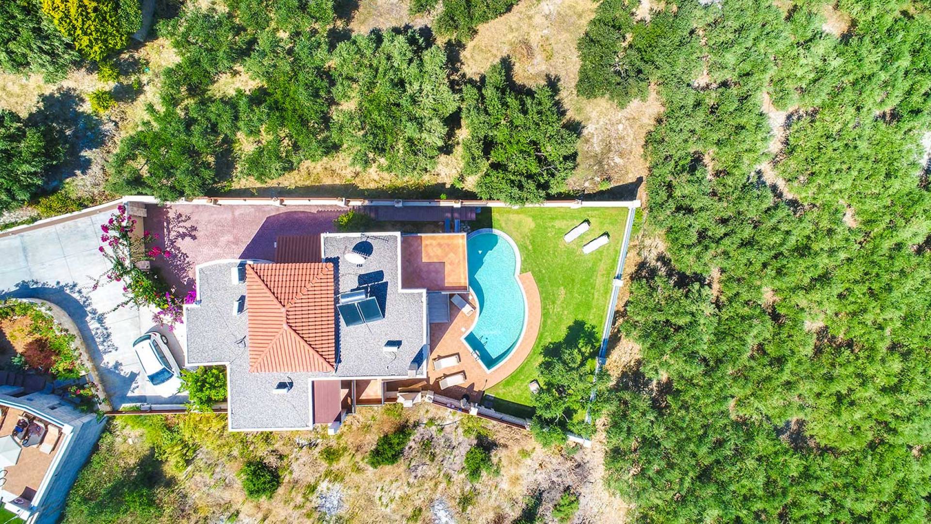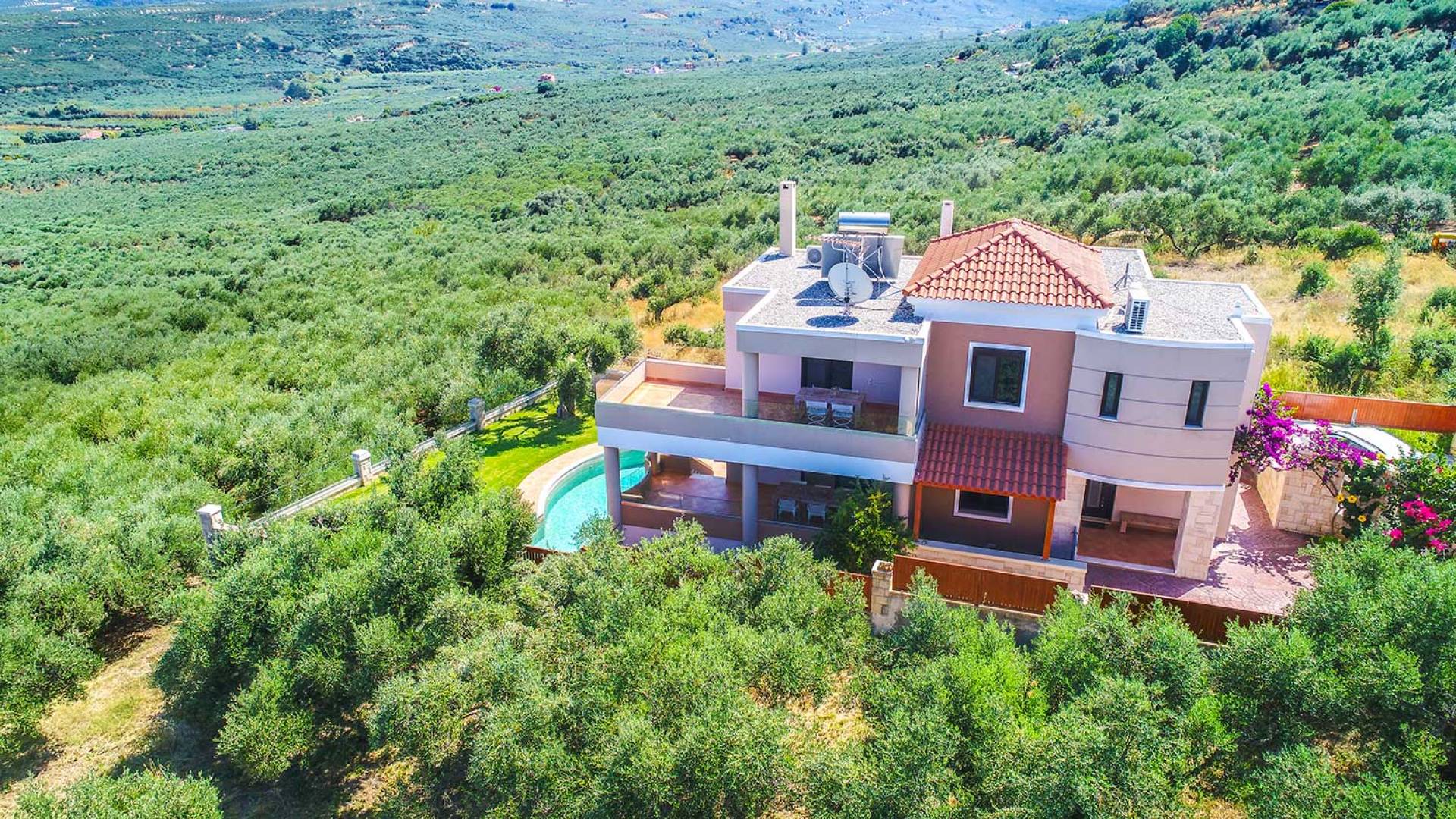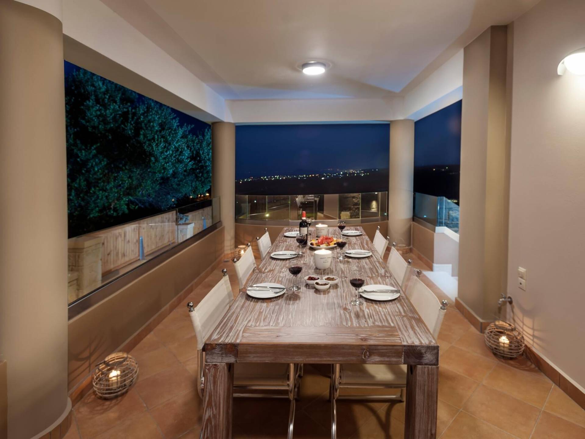Es gibt einen großen privaten Swimmingpool mit optionaler Heizung, einen großen privaten Garten mit Grillplatz und einen Parkplatz. Der gesamte Poolbereich ist mit Sonnenliegen, Stühlen und Tischen zum Essen und Sonnenschirmen ausgestattet. Am Abend können Sie entweder den herrlichen romantischen Sonnenuntergang genießen, der mit den schönsten Farben den klaren blauen Mittelmeerhimmel malt oder Sie fahren in ca. 3-4 Minuten Entfernung zu den nächsten Restaurants und probieren die kretische Küche. Entspannen Sie sich und genießen Sie die private und exklusive Atmosphäre eines Deluxe-Hauses mit 5-Sterne-Ausstattung.