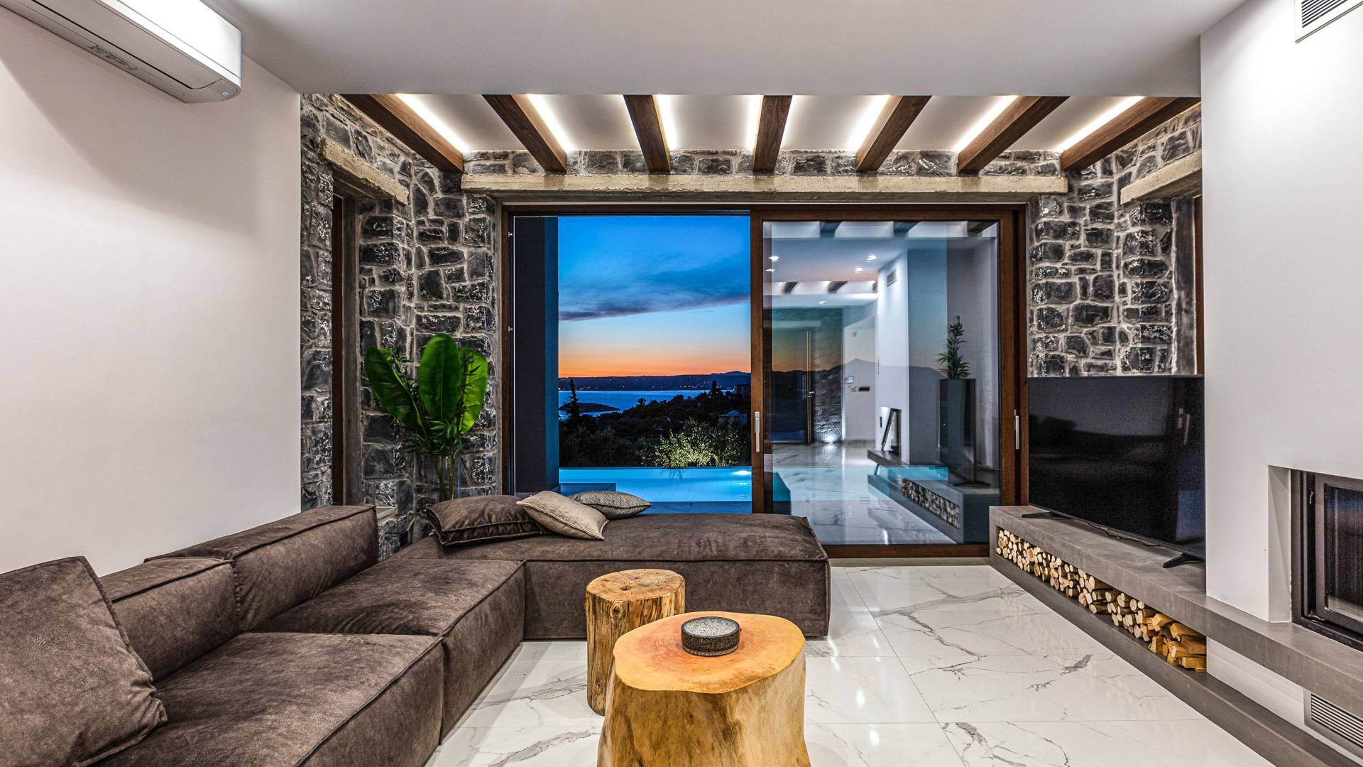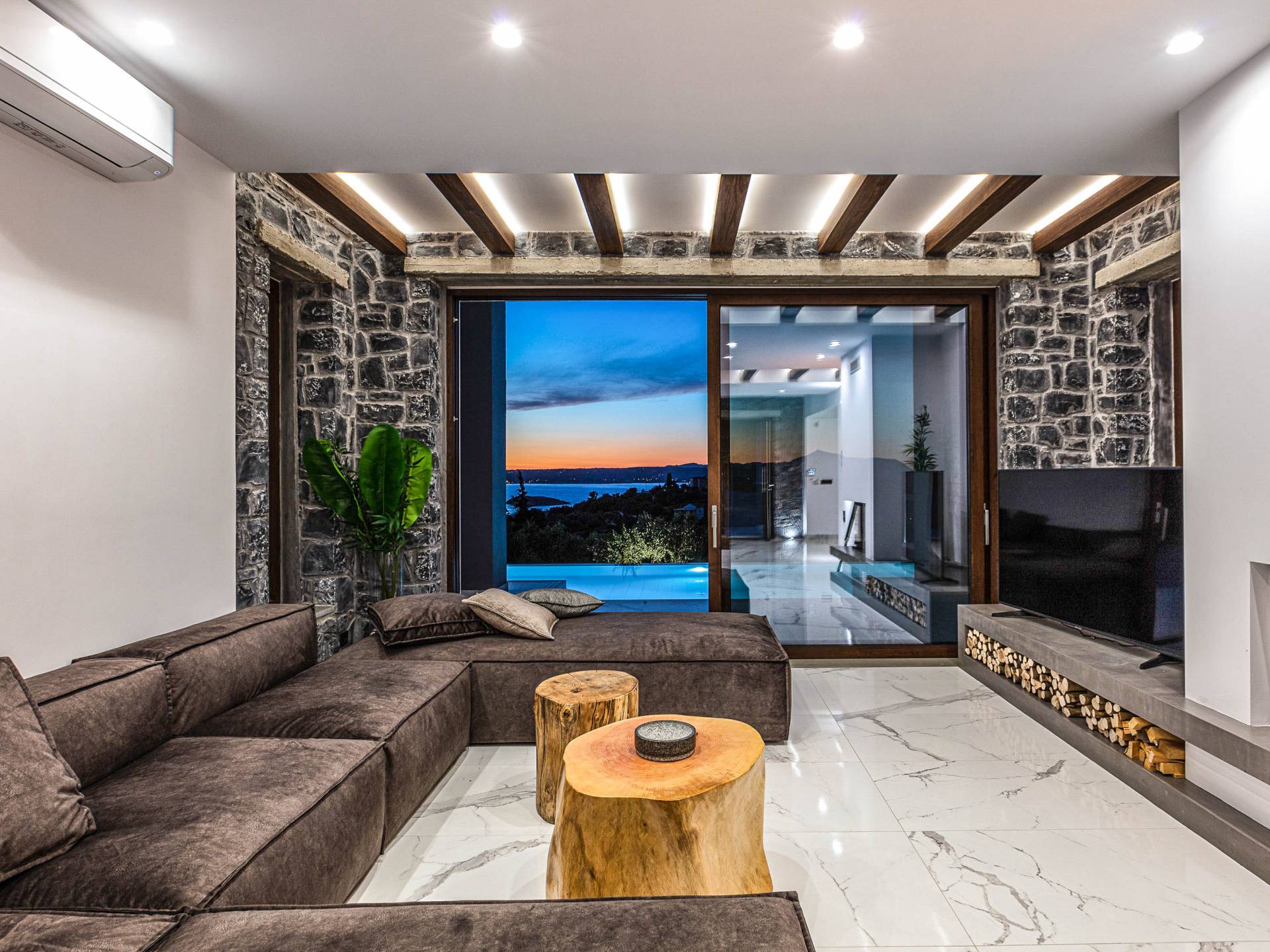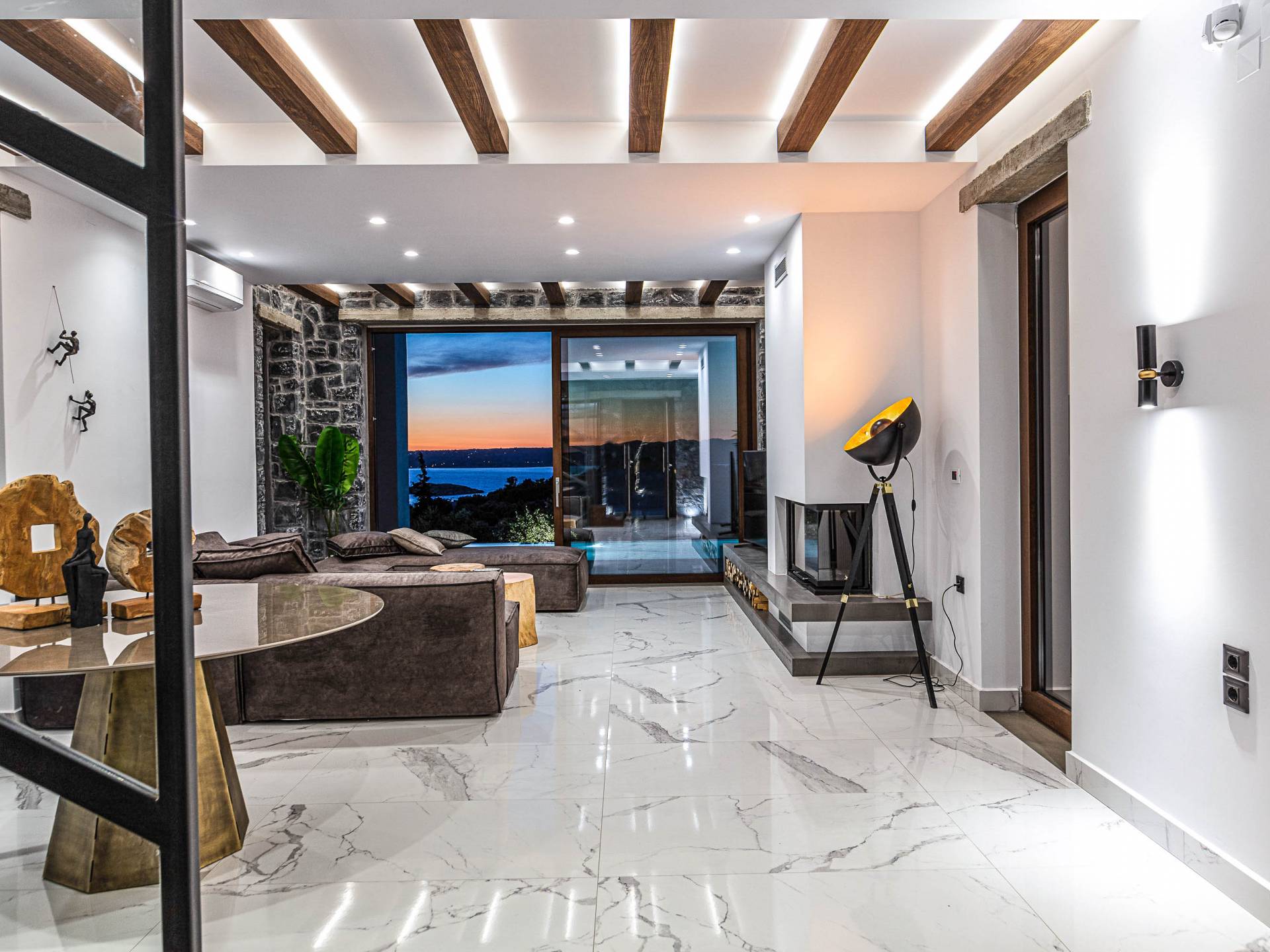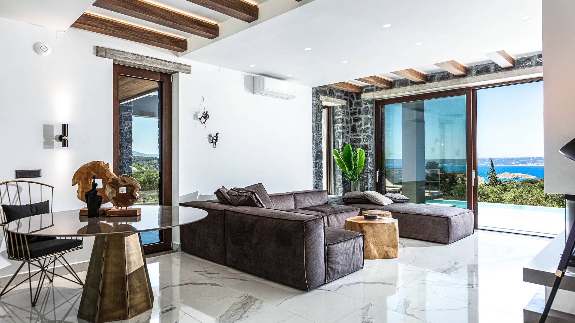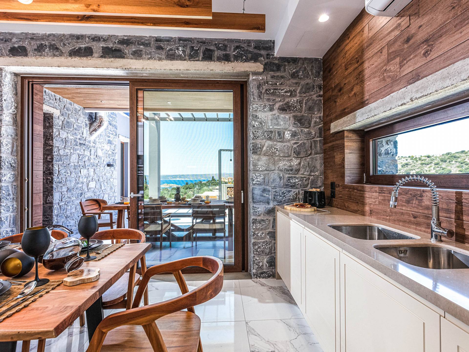 Betreten Sie das Herz der Villa im Erdgeschoss, wo Sie der offene Wohnbereich und die Küche willkommen heißen. Das Wohnzimmer verfügt über ein bequemes Ecksofa, einen gemütlichen Kamin, einen 65-Zoll-HDTV mit Netflix und einen Bluetooth-Lautsprecher. Große Glastüren führen direkt auf die sonnenverwöhnte Terrasse, wo Sie einen atemberaubenden Meerblick erwarten. Die moderne Küche ist komplett mit allem Nötigen ausgestattet und eignet sich perfekt für die Zubereitung von Mahlzeiten für Familie und Freunde. Es verfügt über einen Esstisch, der Platz für bis zu acht Gäste bietet, mit einem zusätzlichen runden Glas-Esstisch im Wohnbereich.
