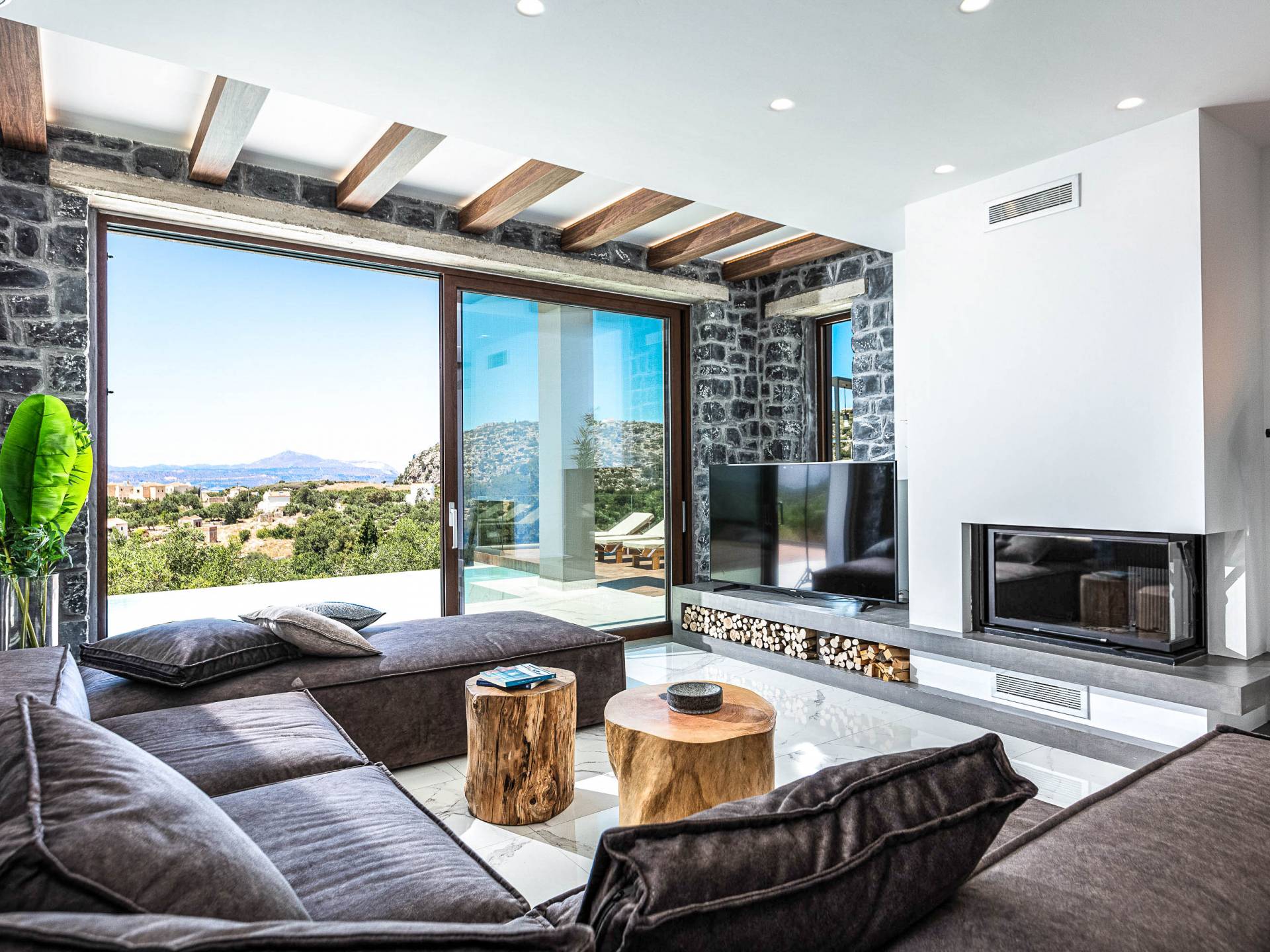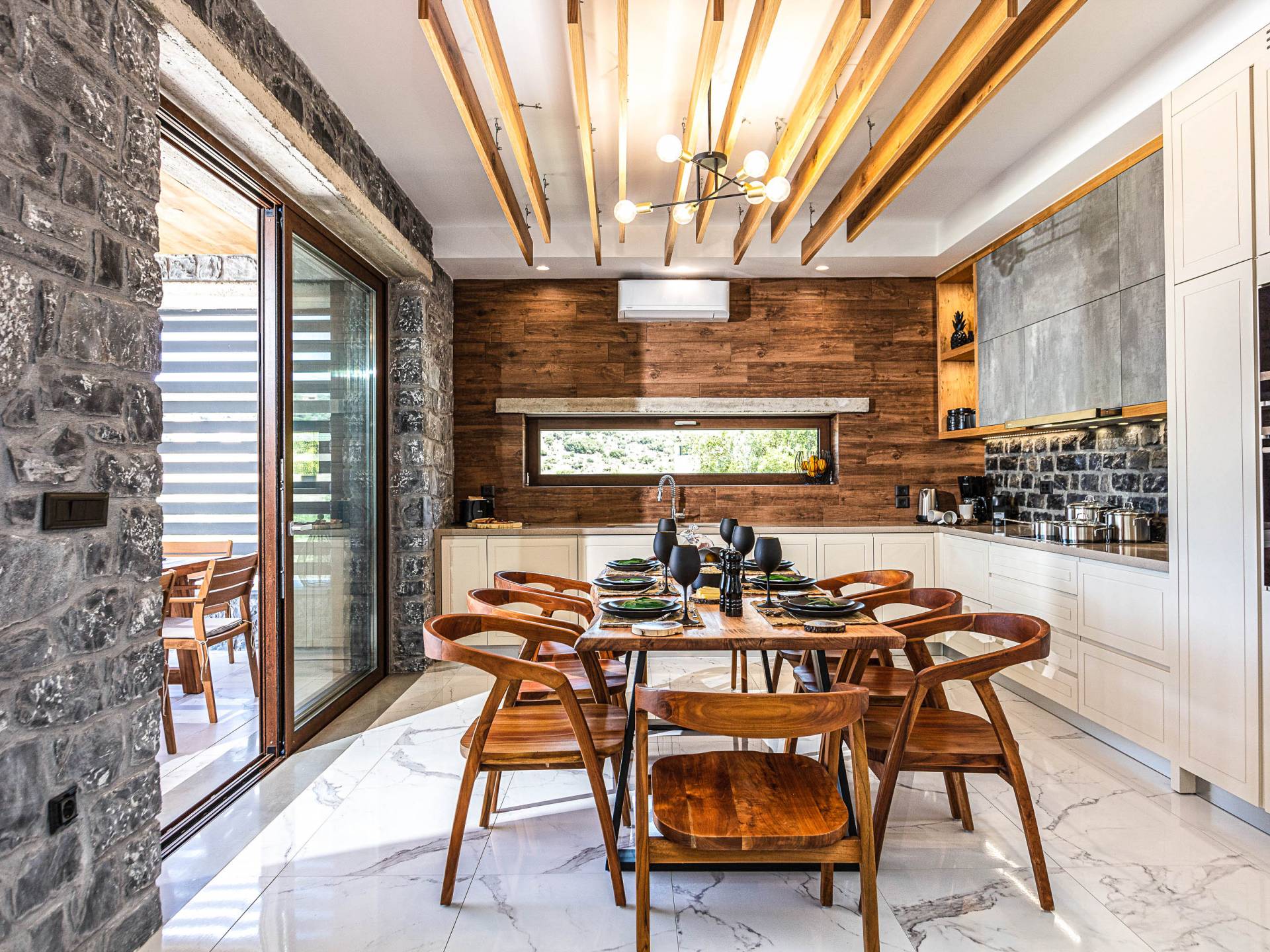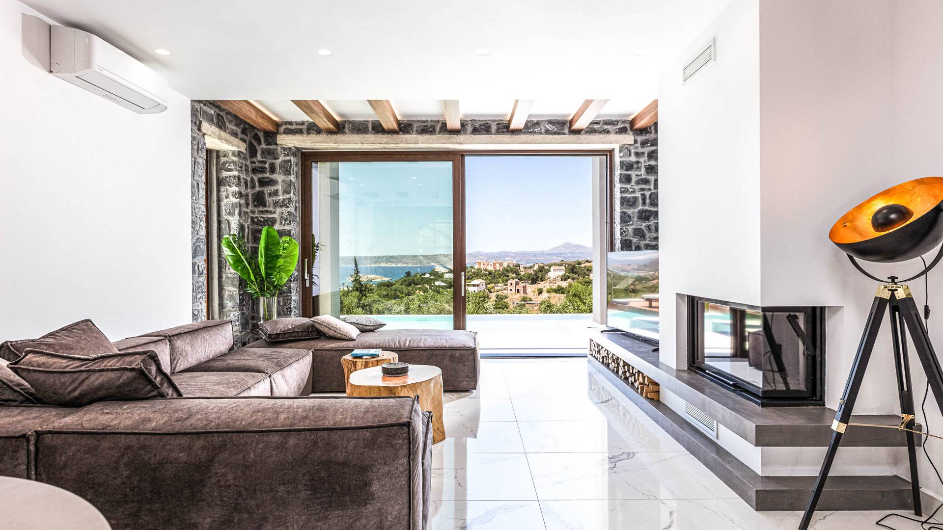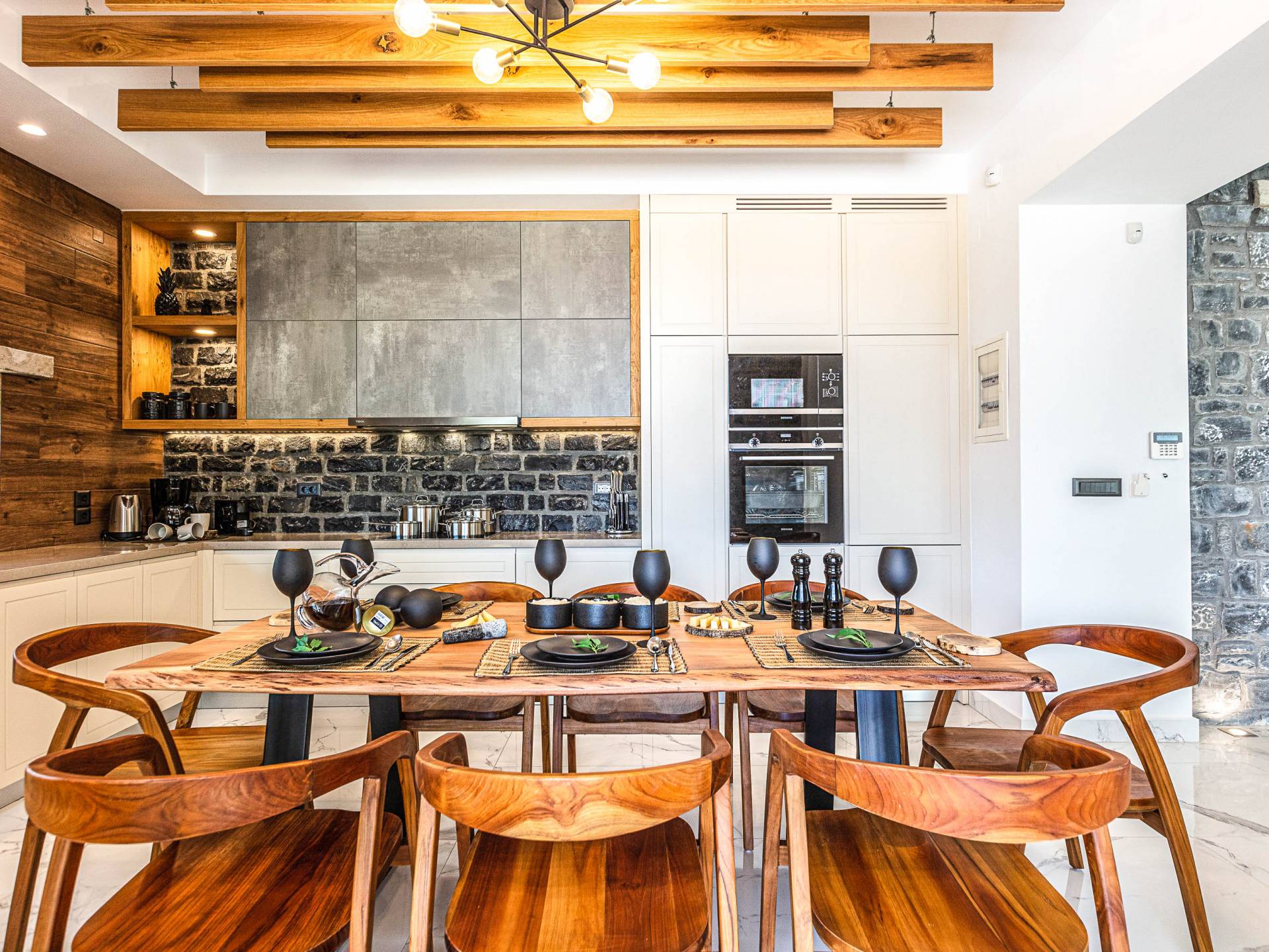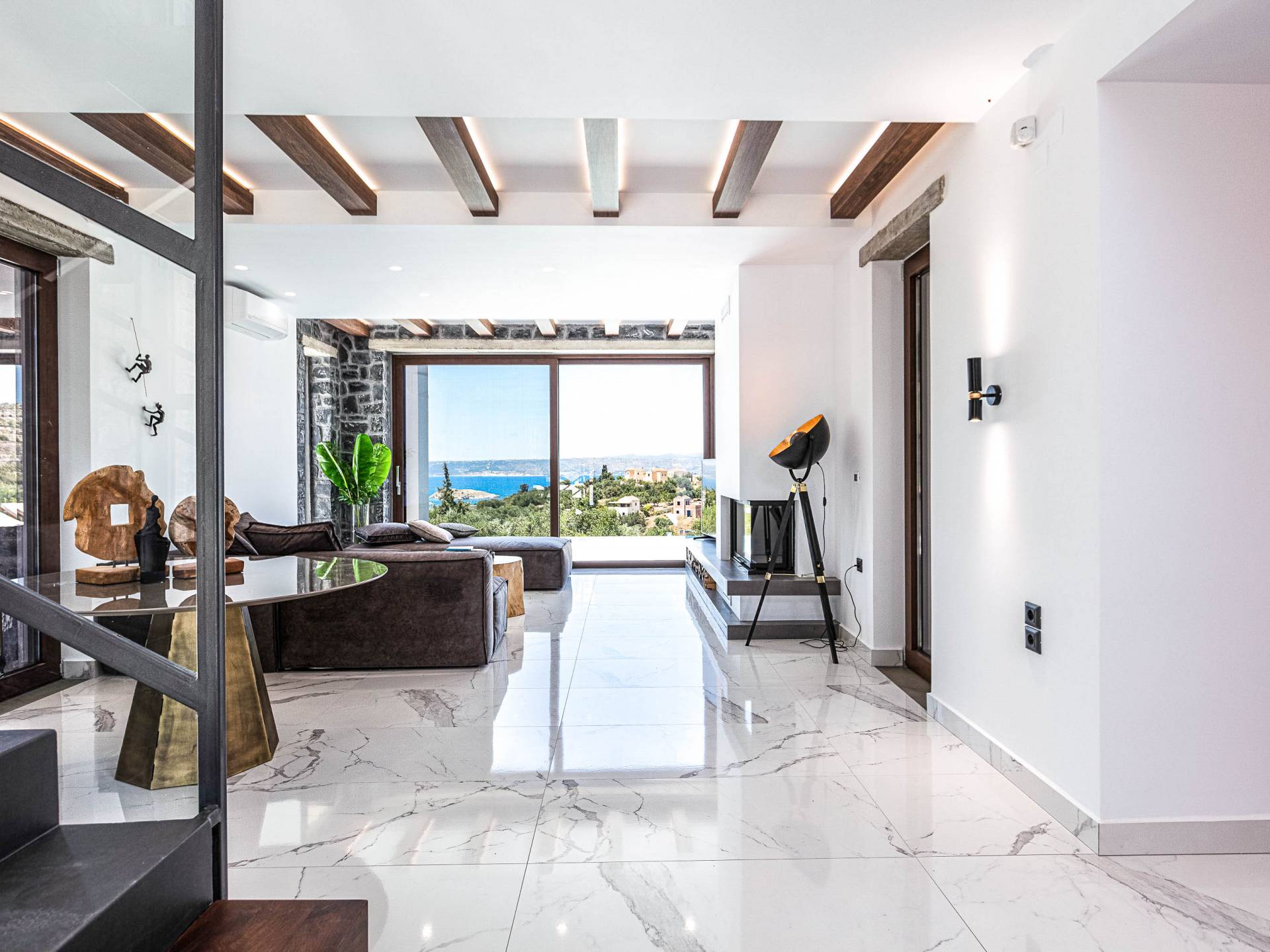 Betreten Sie das Herz der Villa im Erdgeschoss, wo Sie der offene Wohnbereich und die Küche willkommen heißen. Das Wohnzimmer verfügt über ein bequemes Ecksofa, einen gemütlichen Kamin, einen 65-Zoll-HDTV mit Netflix und einen Bluetooth-Lautsprecher. Große Glastüren führen direkt auf die sonnenverwöhnte Terrasse, wo Sie einen atemberaubenden Meerblick erwarten. Die moderne Küche ist komplett mit allem Nötigen ausgestattet und eignet sich perfekt für die Zubereitung von Mahlzeiten für Familie und Freunde. Es verfügt über einen Esstisch, der Platz für bis zu acht Gäste bietet, mit einem zusätzlichen runden Glas-Esstisch im Wohnbereich.