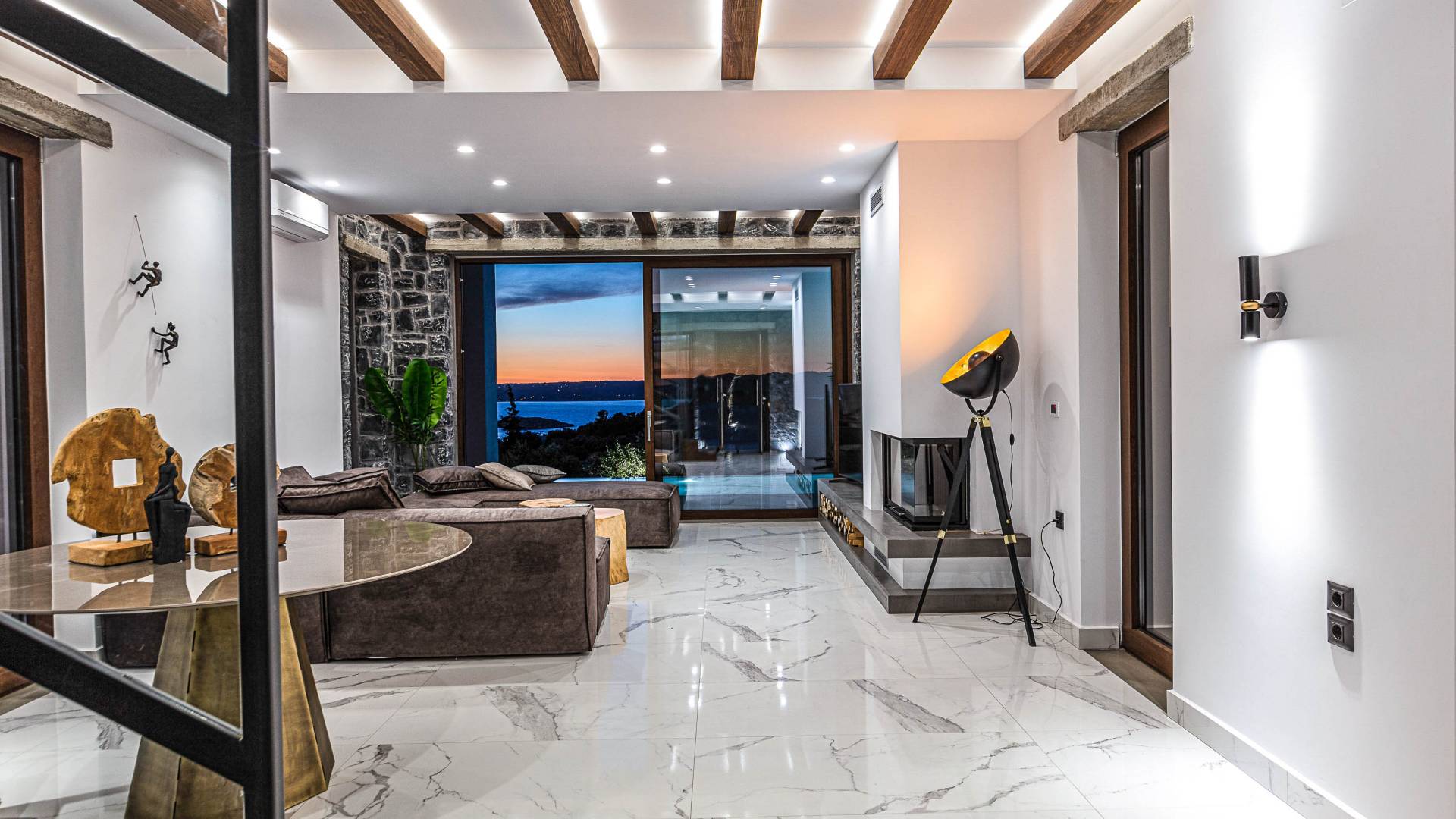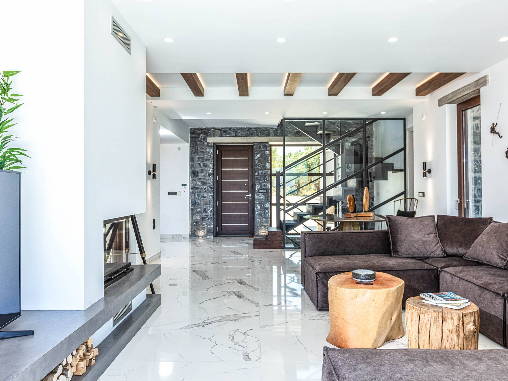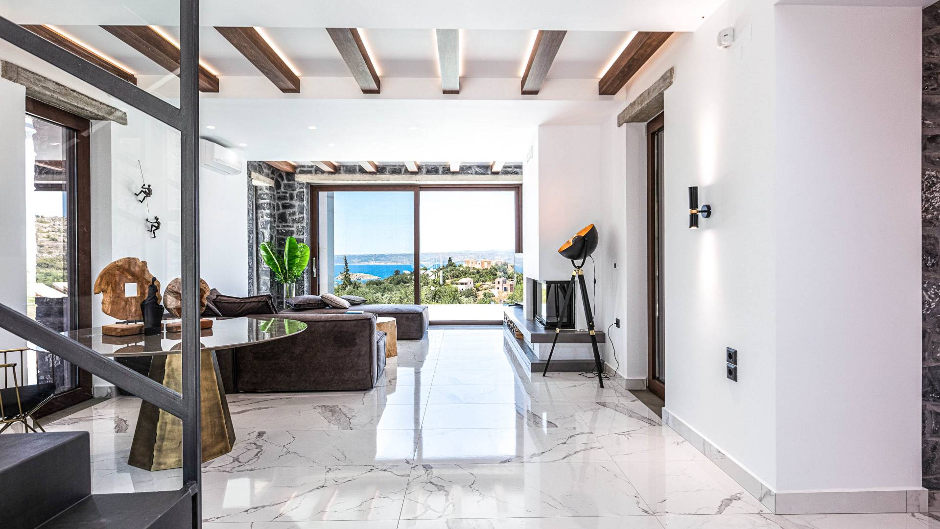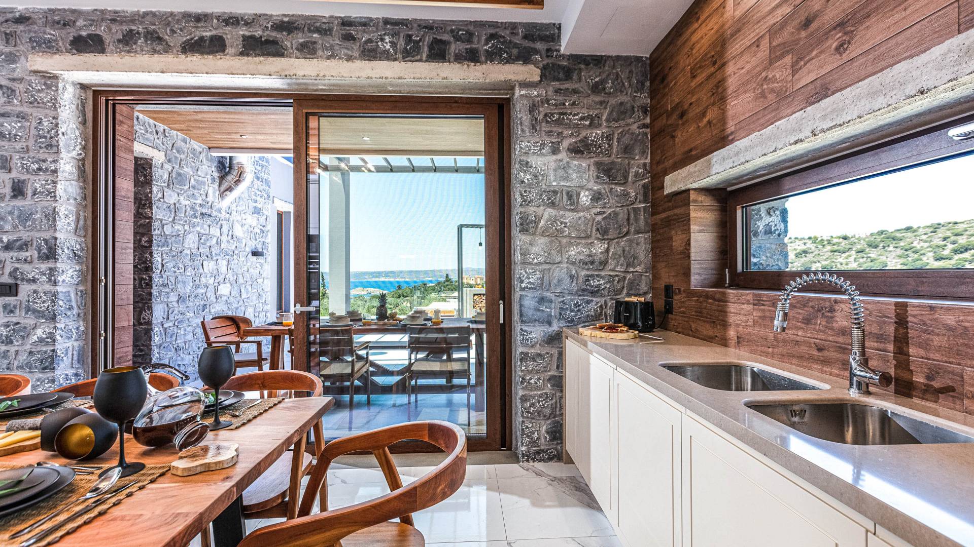 Betreten Sie das Herz der Villa im Erdgeschoss, wo Sie der offene Wohnbereich und die Küche willkommen heißen. Das Wohnzimmer verfügt über ein bequemes Ecksofa, einen gemütlichen Kamin, einen 65-Zoll-HDTV mit Netflix und einen Bluetooth-Lautsprecher. Große Glastüren führen direkt auf die sonnenverwöhnte Terrasse, wo Sie einen atemberaubenden Meerblick erwarten. Die moderne Küche ist komplett mit allem Nötigen ausgestattet und eignet sich perfekt für die Zubereitung von Mahlzeiten für Familie und Freunde. Es verfügt über einen Esstisch, der Platz für bis zu acht Gäste bietet, mit einem zusätzlichen runden Glas-Esstisch im Wohnbereich.