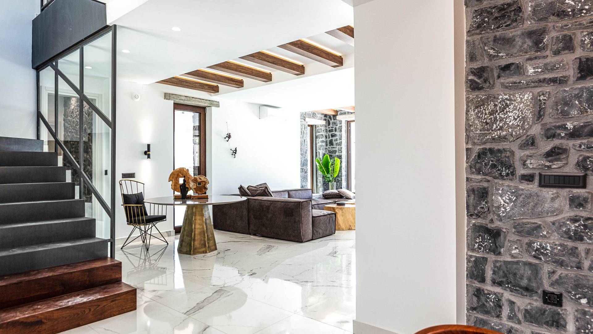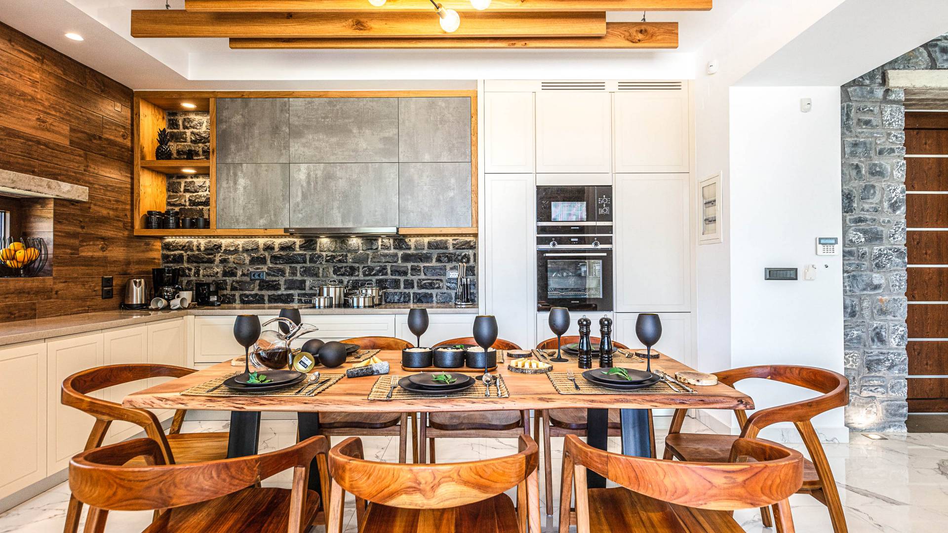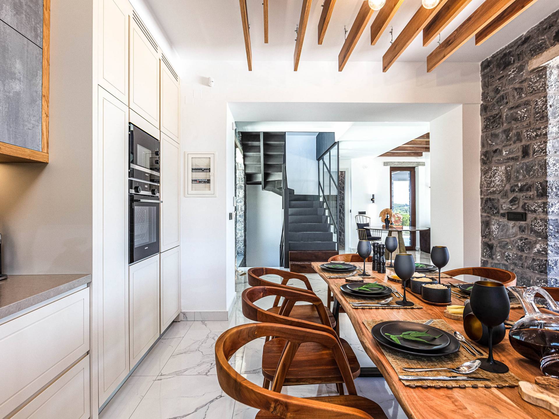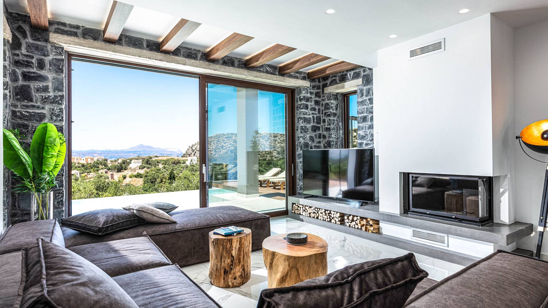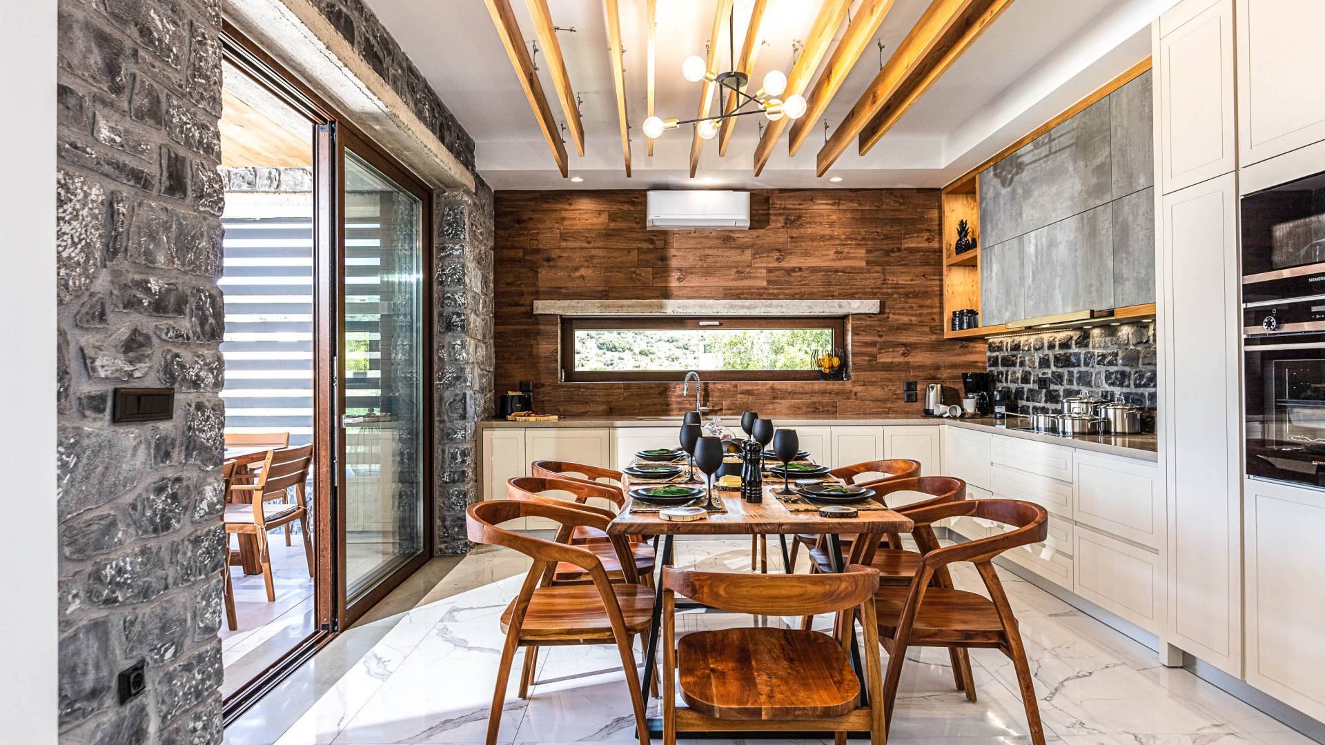 Betreten Sie das Herz der Villa im Erdgeschoss, wo Sie der offene Wohnbereich und die Küche willkommen heißen. Das Wohnzimmer verfügt über ein bequemes Ecksofa, einen gemütlichen Kamin, einen 65-Zoll-HDTV mit Netflix und einen Bluetooth-Lautsprecher. Große Glastüren führen direkt auf die sonnenverwöhnte Terrasse, wo Sie einen atemberaubenden Meerblick erwarten. Die moderne Küche ist komplett mit allem Nötigen ausgestattet und eignet sich perfekt für die Zubereitung von Mahlzeiten für Familie und Freunde. Es verfügt über einen Esstisch, der Platz für bis zu acht Gäste bietet, mit einem zusätzlichen runden Glas-Esstisch im Wohnbereich.