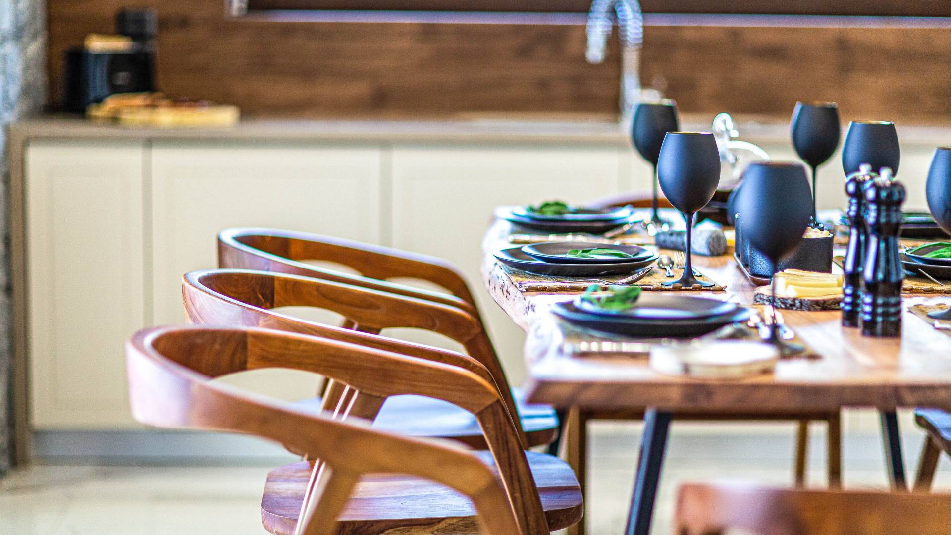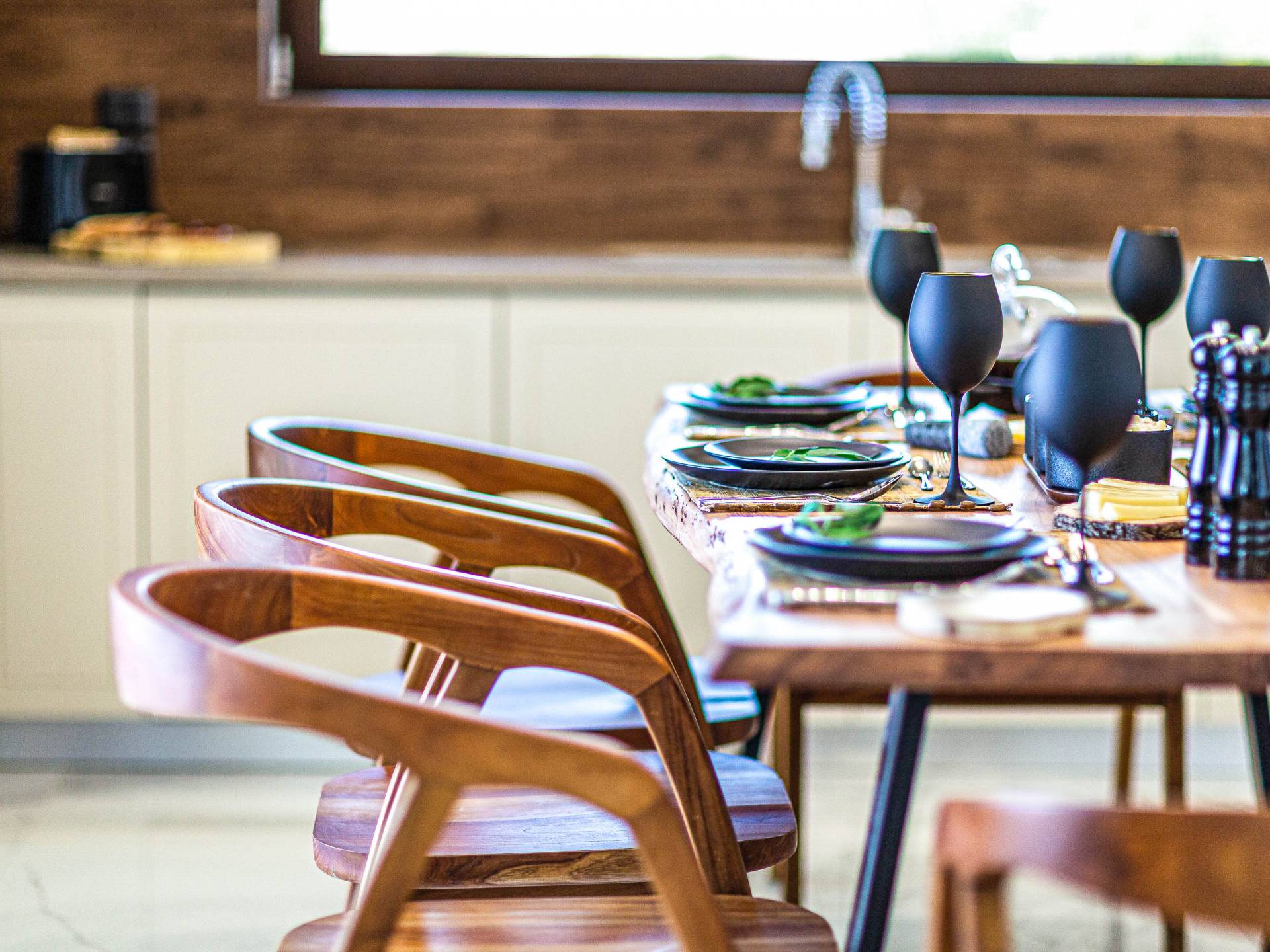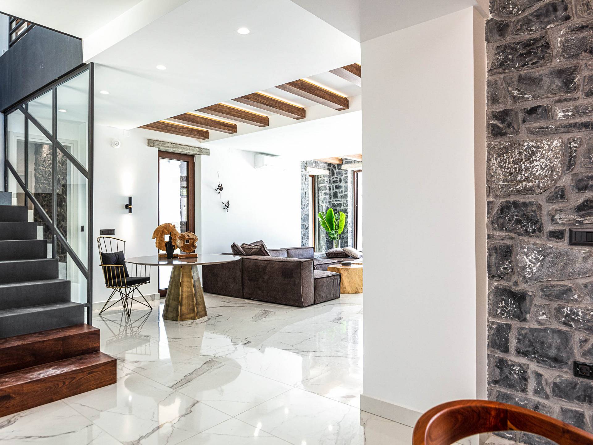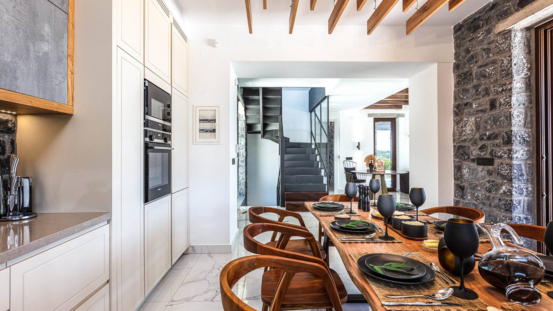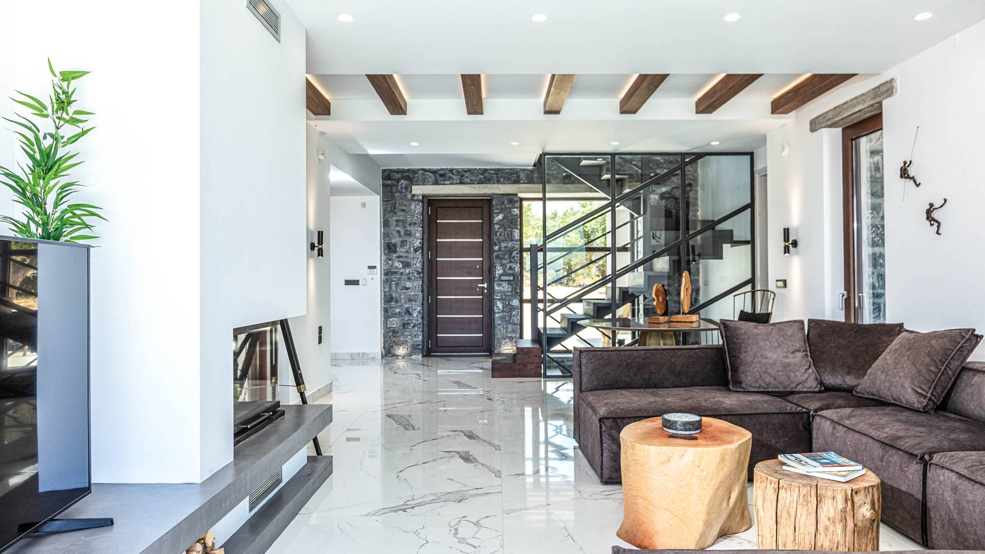 Betreten Sie das Herz der Villa im Erdgeschoss, wo Sie der offene Wohnbereich und die Küche willkommen heißen. Das Wohnzimmer verfügt über ein bequemes Ecksofa, einen gemütlichen Kamin, einen 65-Zoll-HDTV mit Netflix und einen Bluetooth-Lautsprecher. Große Glastüren führen direkt auf die sonnenverwöhnte Terrasse, wo Sie einen atemberaubenden Meerblick erwarten. Die moderne Küche ist komplett mit allem Nötigen ausgestattet und eignet sich perfekt für die Zubereitung von Mahlzeiten für Familie und Freunde. Es verfügt über einen Esstisch, der Platz für bis zu acht Gäste bietet, mit einem zusätzlichen runden Glas-Esstisch im Wohnbereich.