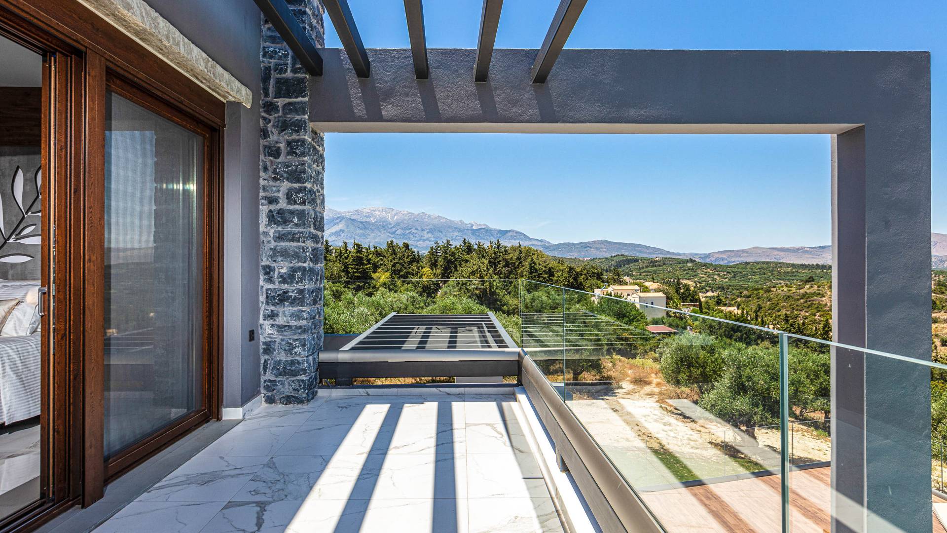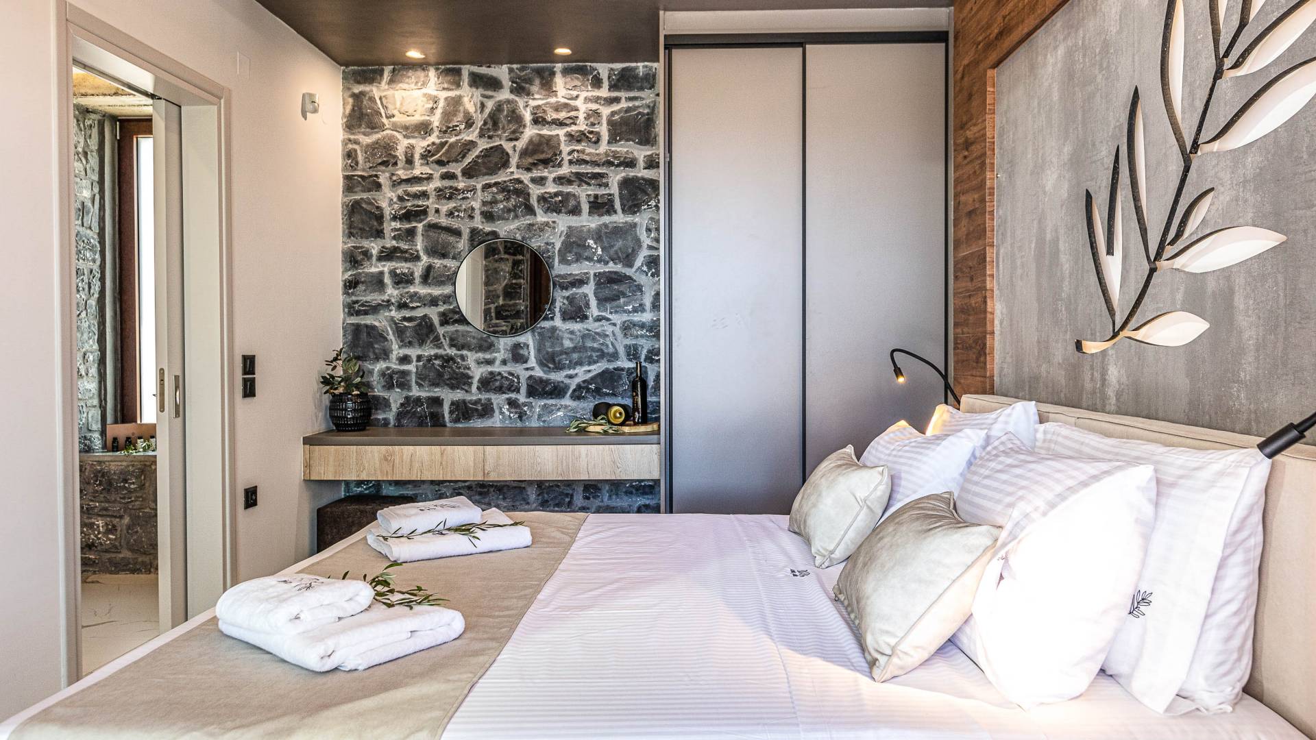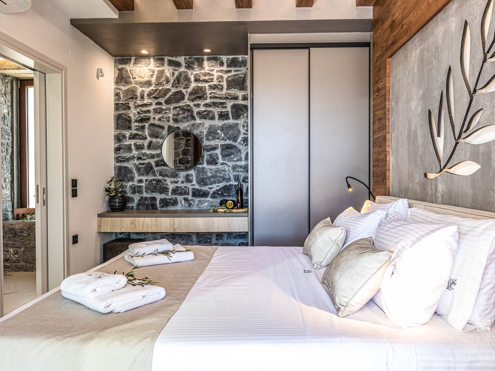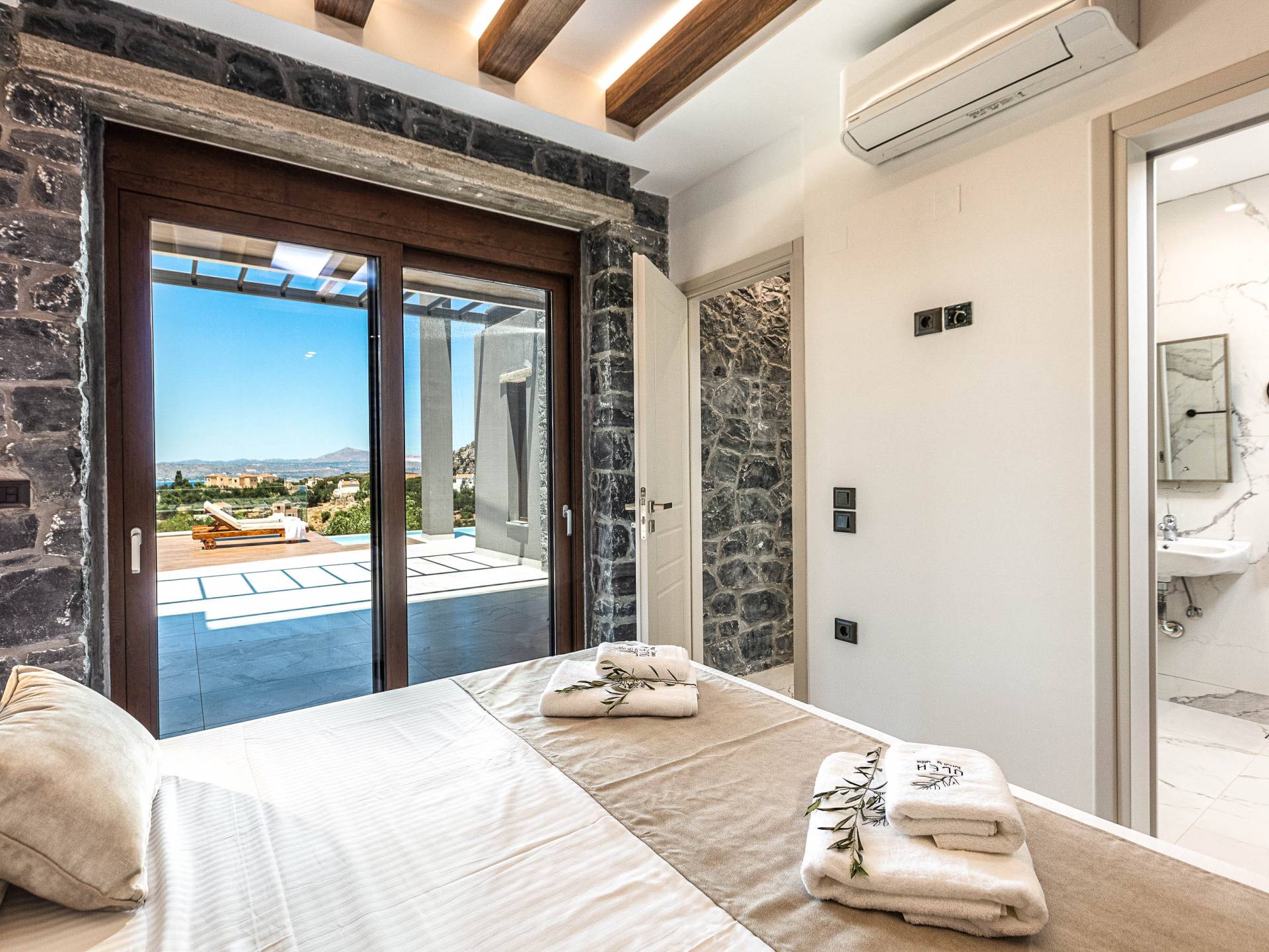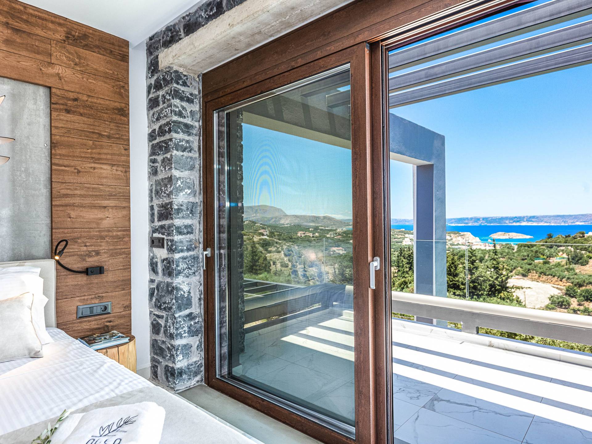 Die erste Etage beherbergt die restlichen drei wunderschön eingerichteten Schlafzimmer, jedes klimatisiert und in warmen Erdtönen mit geschmackvollen Olivenzweig-Kunstwerken dekoriert, die das kretische Erbe der Villa symbolisieren. Zwei Schlafzimmer verfügen über Kingsize-Betten (1,60 m x 2,00 m) und private Balkone mit herrlichem Meerblick, während das dritte Schlafzimmer über zwei Einzelbetten (0,90 m x 2,00 m) verfügt, die bei Bedarf in ein Kingsize-Bett umgewandelt werden können ein eigener Balkon mit Meerblick. Jedes Schlafzimmer verfügt über ein eigenes Bad und bietet so Privatsphäre und Komfort für größere Gruppen. Auf dieser Etage befindet sich auch ein Waschraum mit einer Waschtrockner-Kombination.