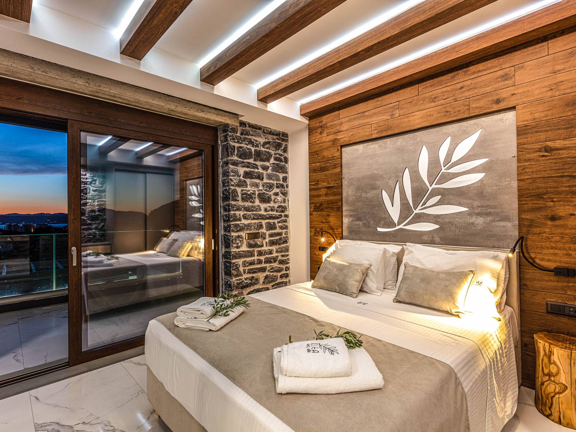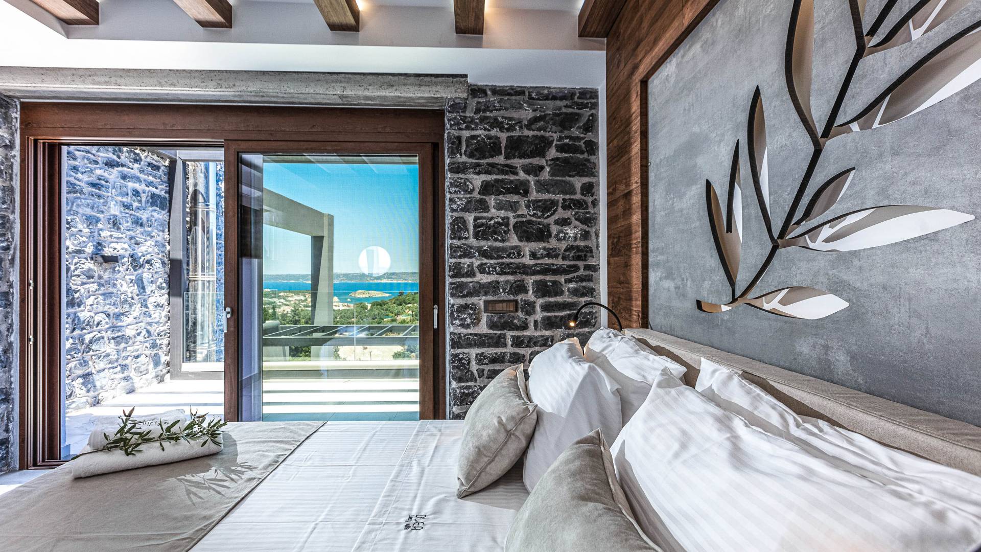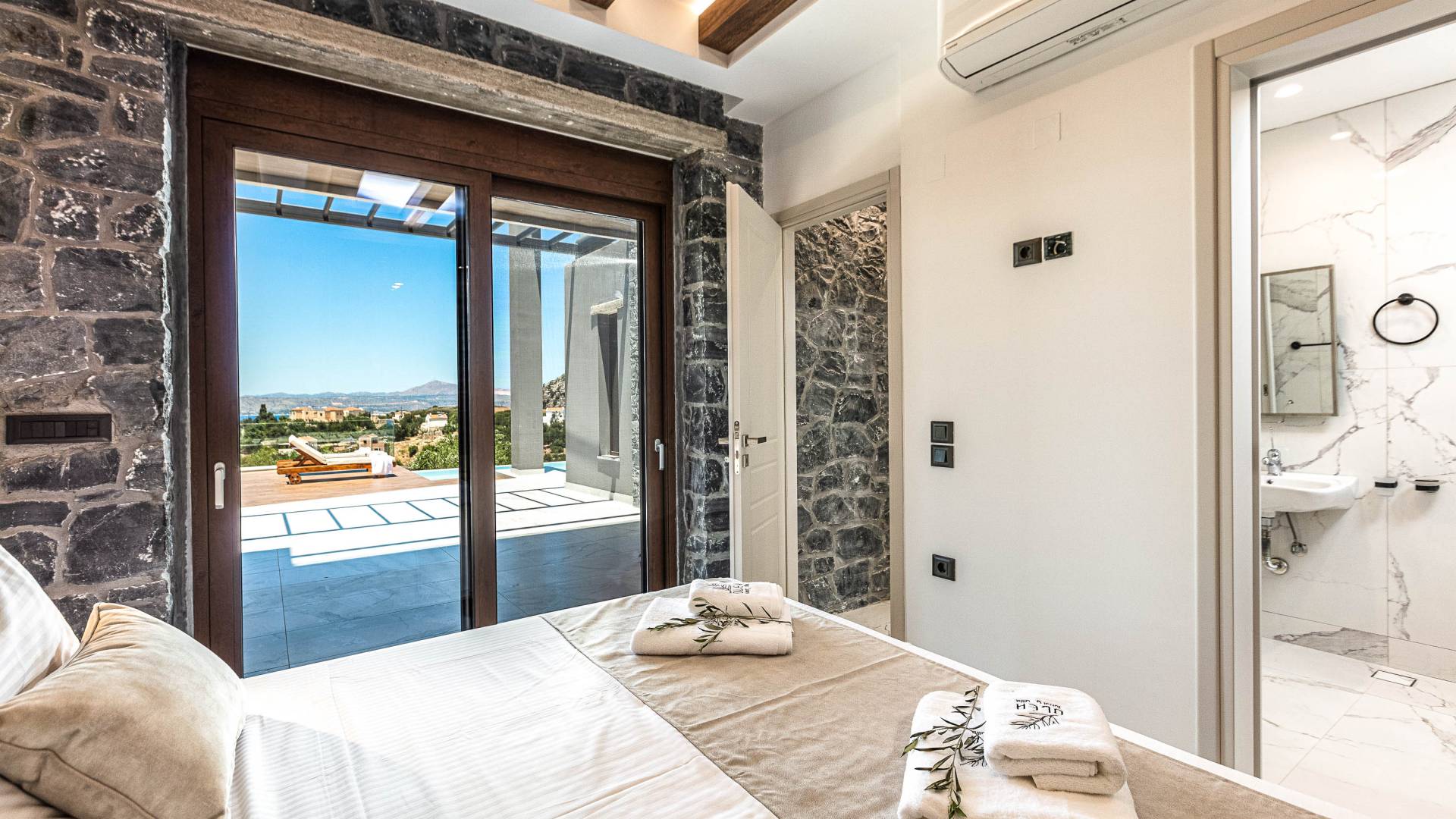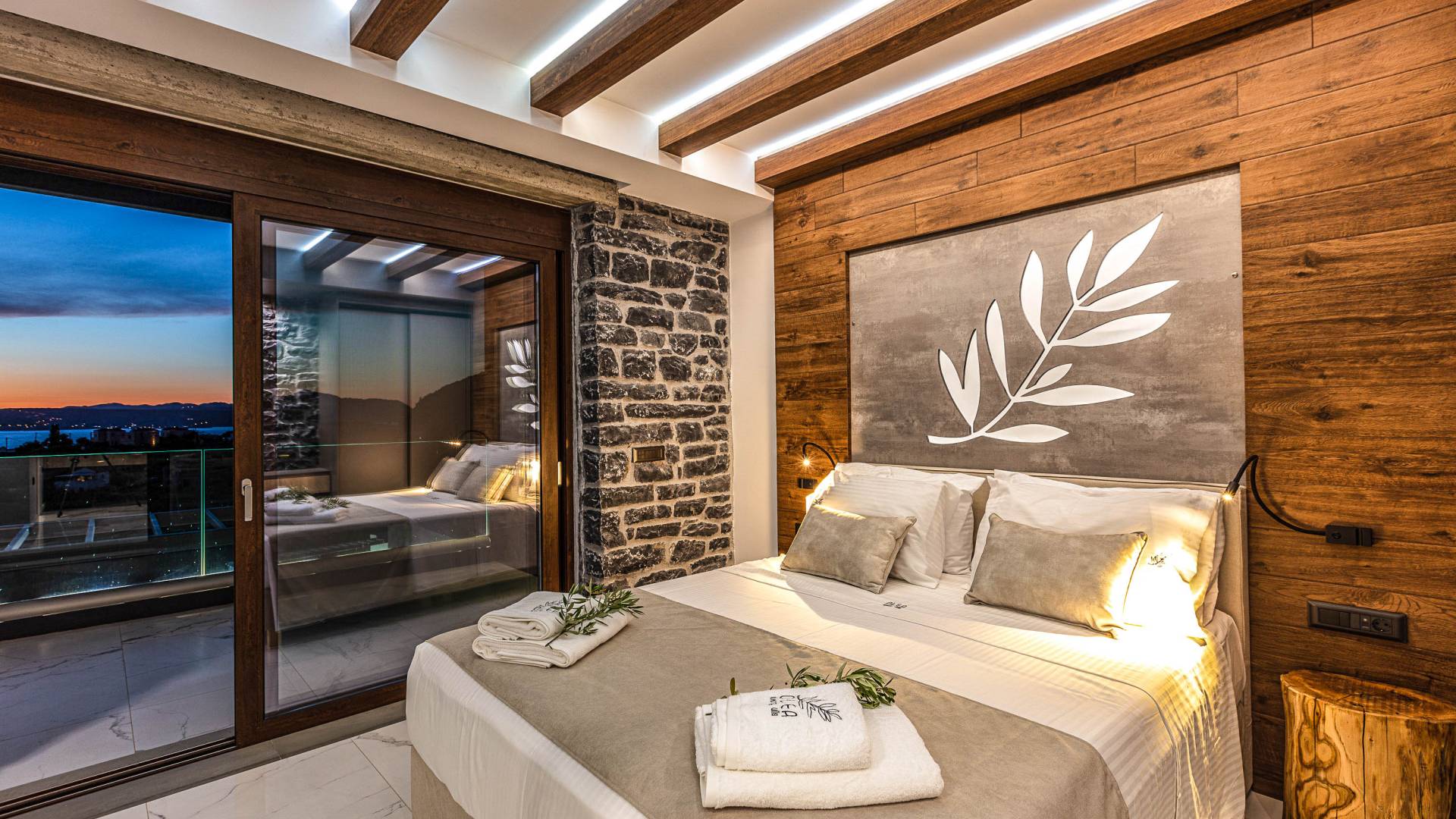 Die erste Etage beherbergt die restlichen drei wunderschön eingerichteten Schlafzimmer, jedes klimatisiert und in warmen Erdtönen mit geschmackvollen Olivenzweig-Kunstwerken dekoriert, die das kretische Erbe der Villa symbolisieren. Zwei Schlafzimmer verfügen über Kingsize-Betten (1,60 m x 2,00 m) und private Balkone mit herrlichem Meerblick, während das dritte Schlafzimmer über zwei Einzelbetten (0,90 m x 2,00 m) verfügt, die bei Bedarf in ein Kingsize-Bett umgewandelt werden können ein eigener Balkon mit Meerblick. Jedes Schlafzimmer verfügt über ein eigenes Bad und bietet so Privatsphäre und Komfort für größere Gruppen. Auf dieser Etage befindet sich auch ein Waschraum mit einer Waschtrockner-Kombination.