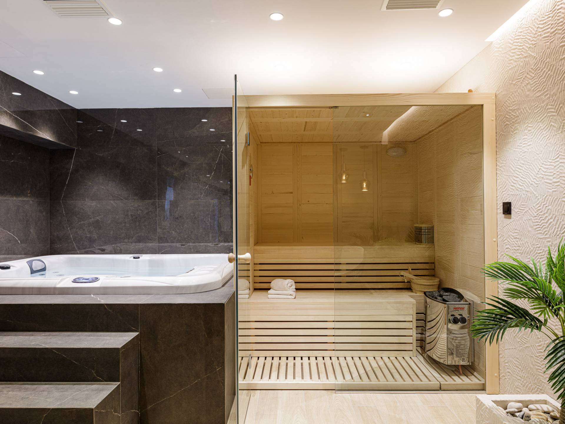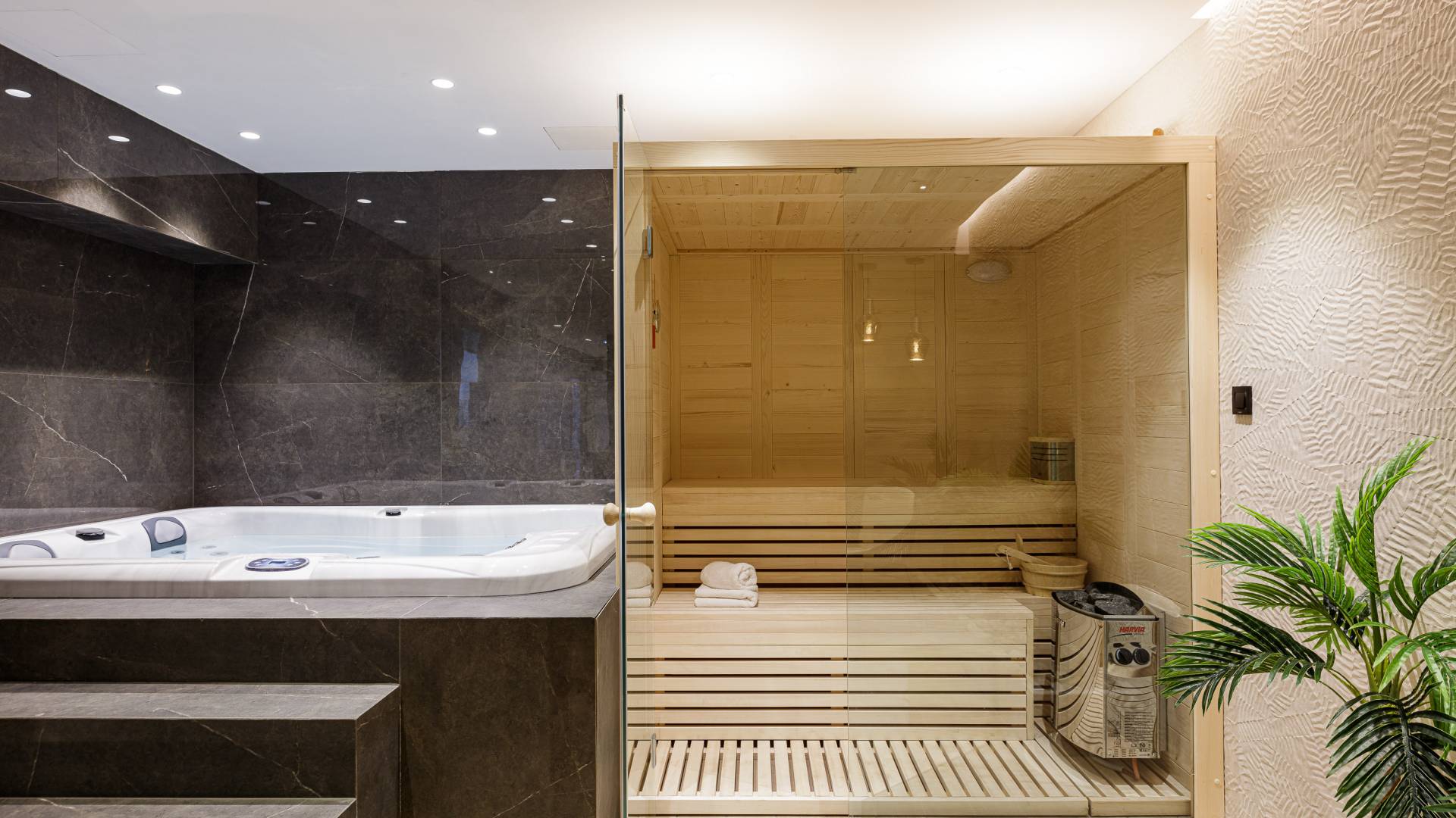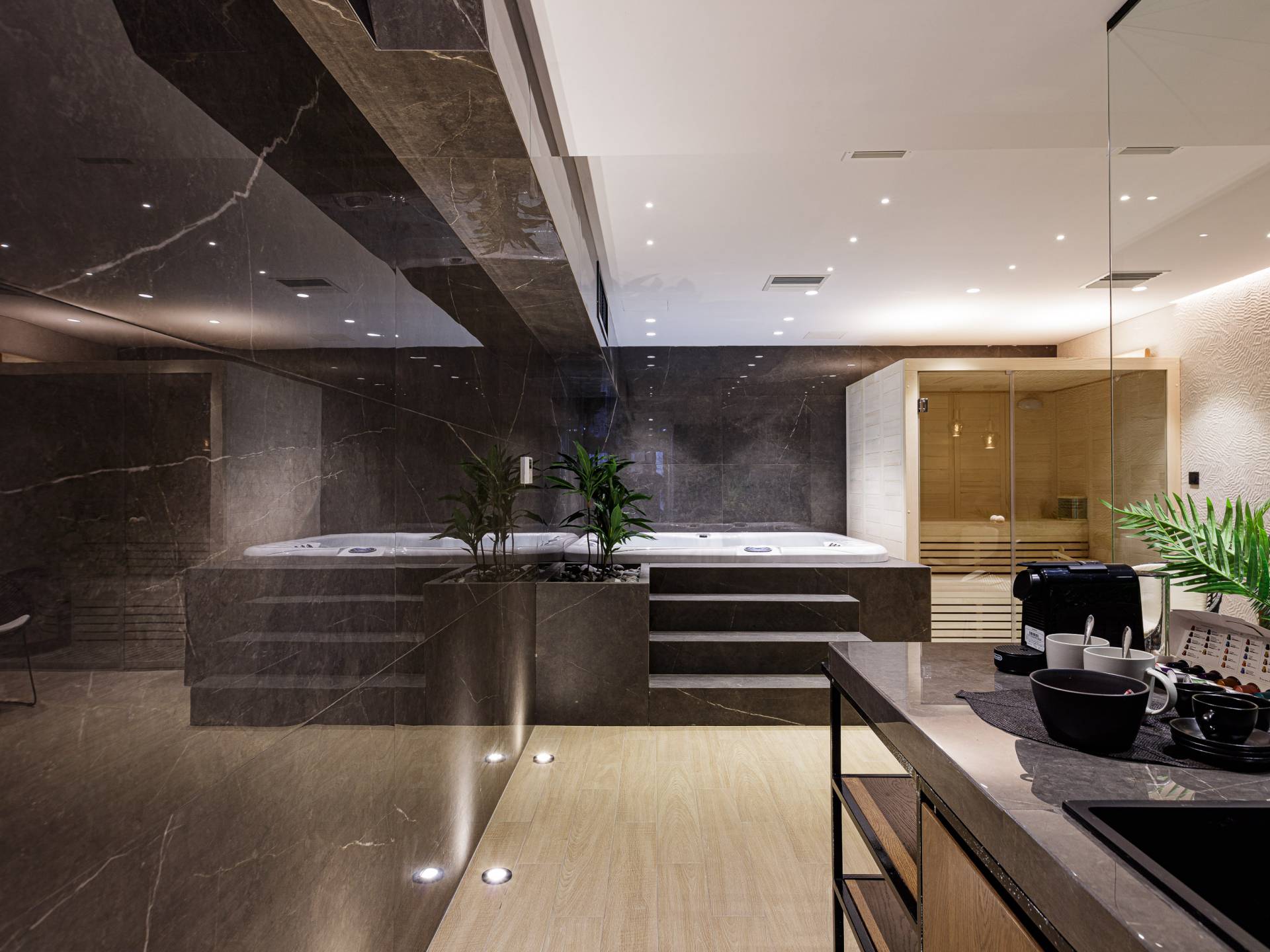 Auf der unteren Ebene finden Sie eines der fünf Schlafzimmer mit einem Kingsize-Bett (1,60 m x 2,00 m) und einem eigenen Badezimmer mit Dusche, Klimaanlage und einem 40-Zoll-HDTV. Der Raum bietet auch einen direkten Zugang ins Freie. Für ultimative Entspannung bietet diese Etage auch einen luxuriösen Spa-Bereich mit Sauna, Whirlpool, Dusche und Sitzgelegenheiten.