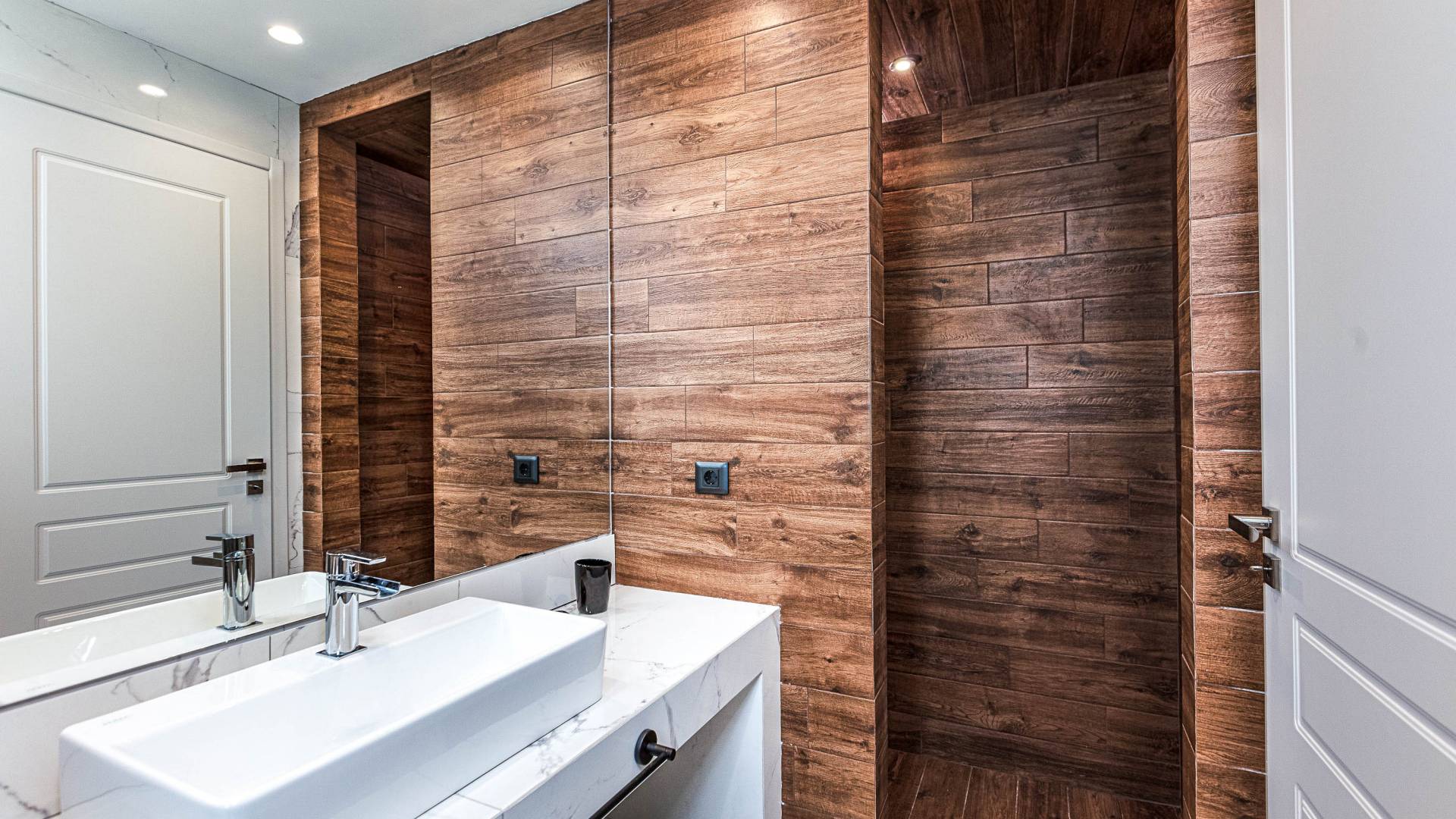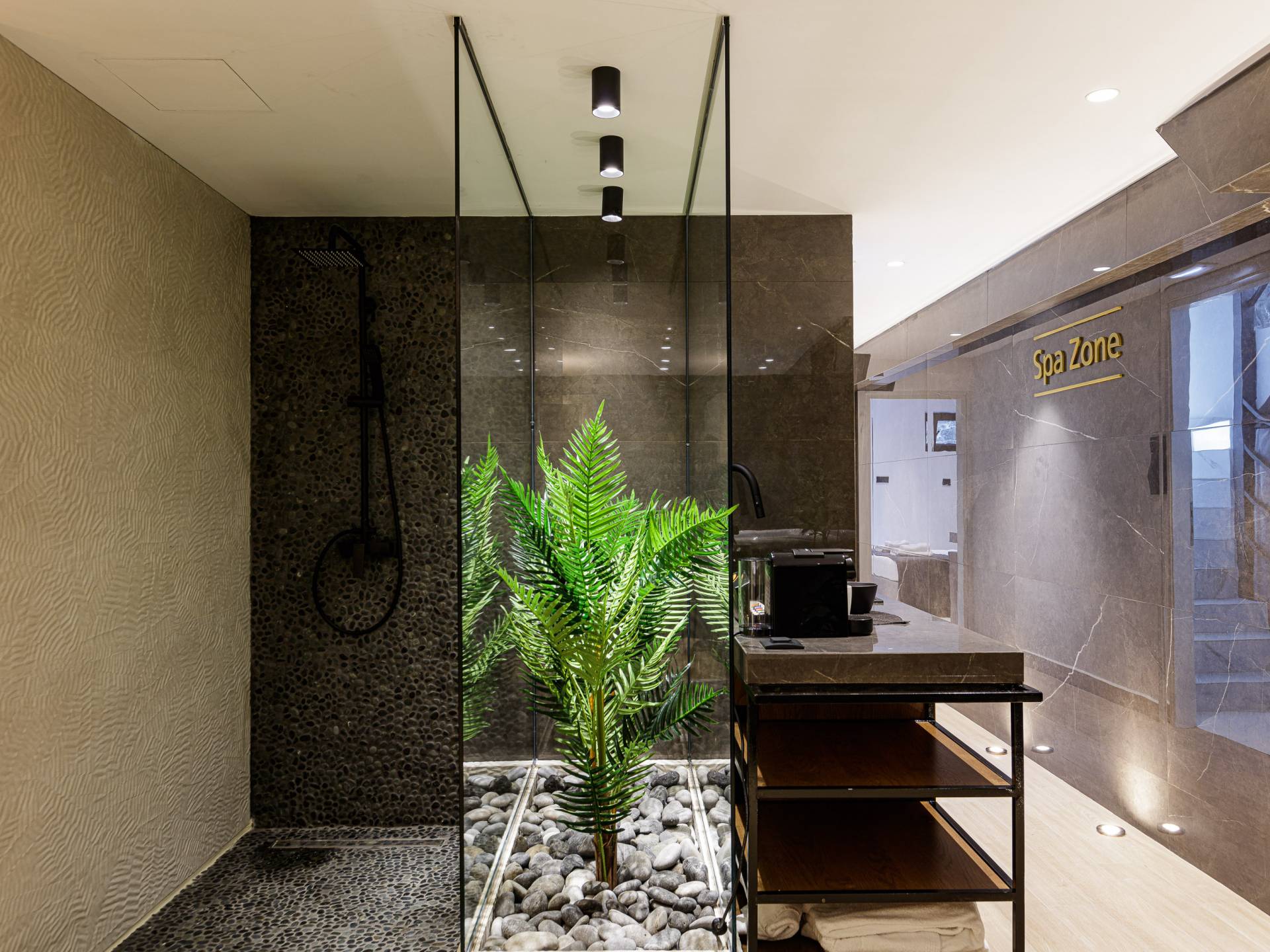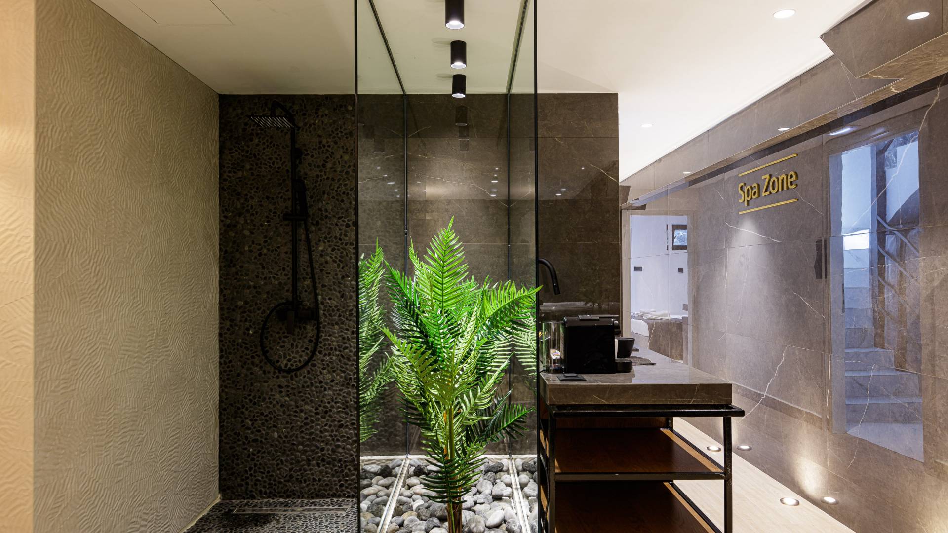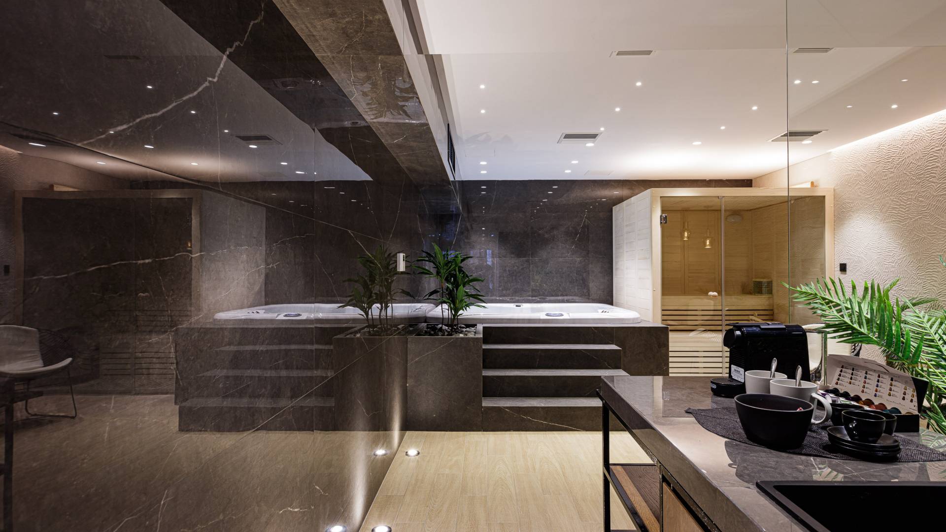 Auf der unteren Ebene finden Sie eines der fünf Schlafzimmer mit einem Kingsize-Bett (1,60 m x 2,00 m) und einem eigenen Badezimmer mit Dusche, Klimaanlage und einem 40-Zoll-HDTV. Der Raum bietet auch einen direkten Zugang ins Freie. Für ultimative Entspannung bietet diese Etage auch einen luxuriösen Spa-Bereich mit Sauna, Whirlpool, Dusche und Sitzgelegenheiten.