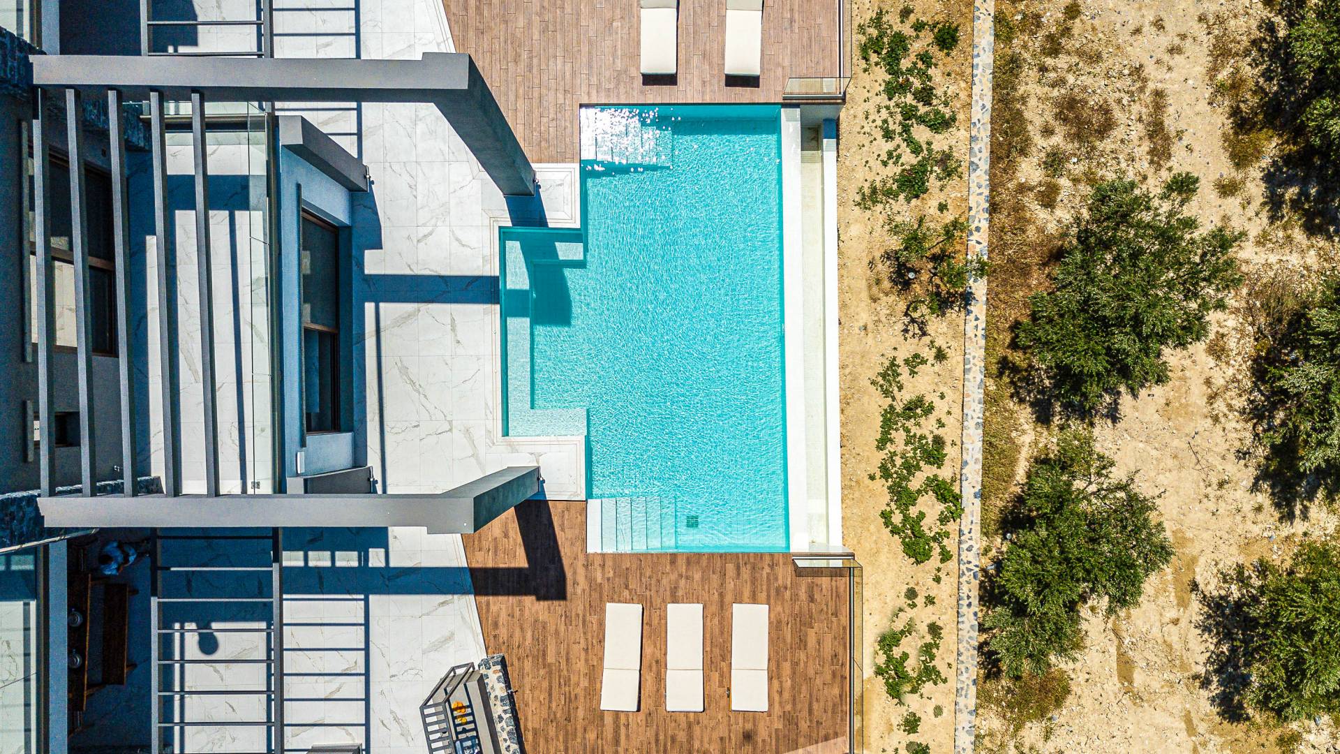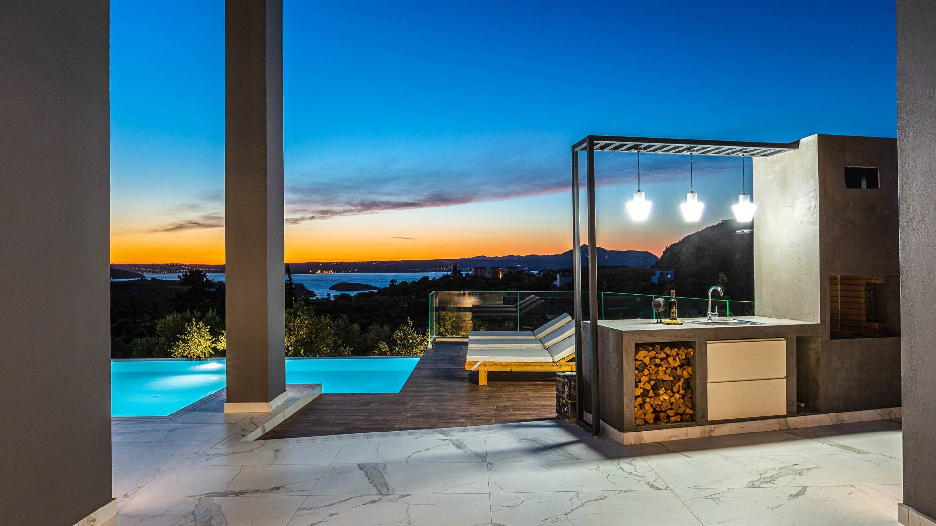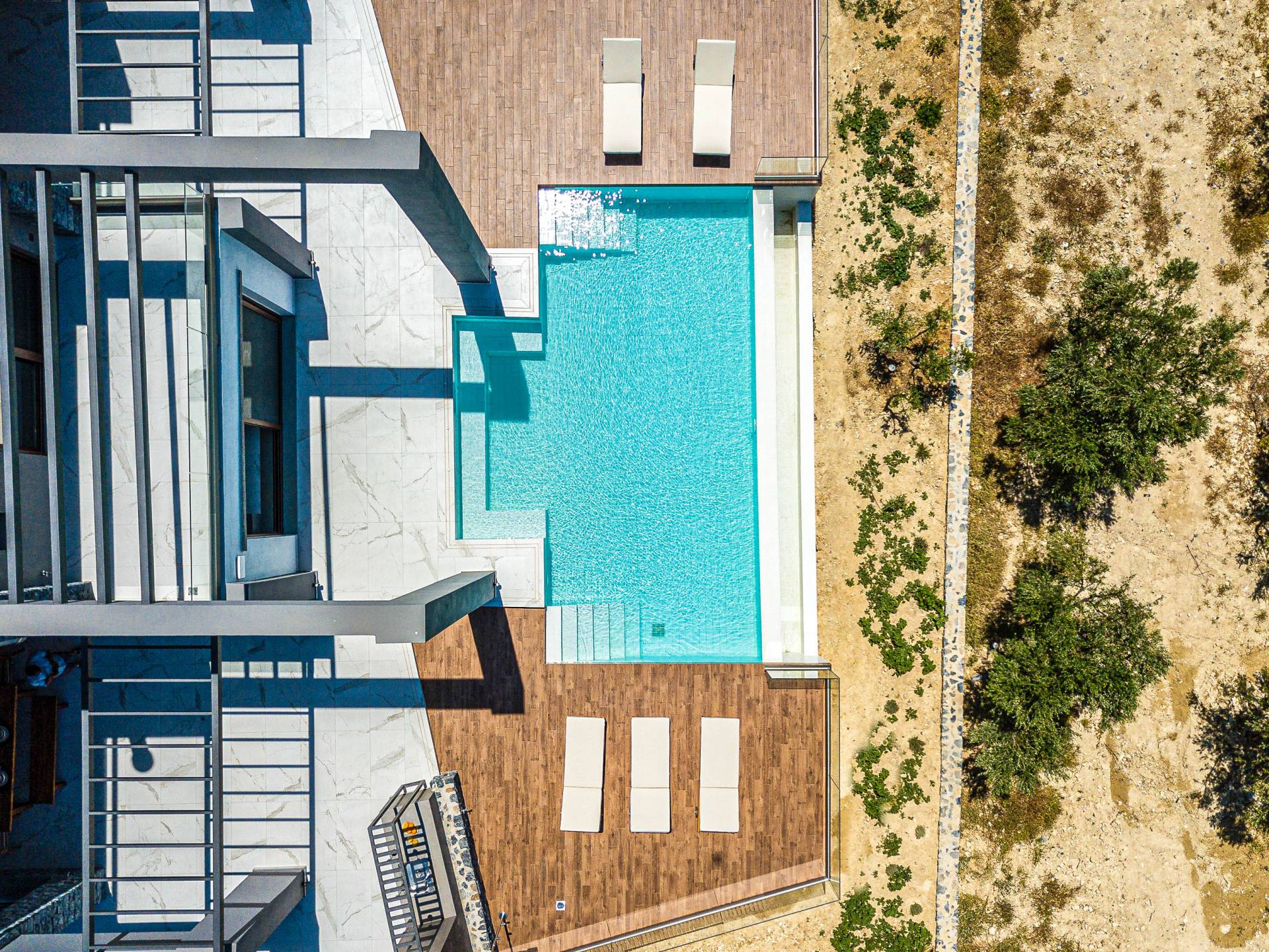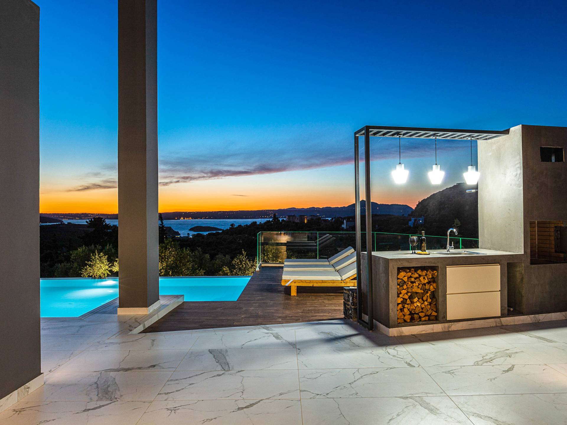 Die Außenbereiche der Villa sind zum Sonnenbaden und Genießen des Panoramablicks auf das Meer und die Landschaft konzipiert. Der weitläufige 50 m² große Infinity-Pool kann auf Anfrage (gegen Gebühr) beheizt werden und es gibt zahlreiche Sonnenliegen, ein Tagesbett und einen schattigen Sitzbereich für ultimative Entspannung. Zu den Outdoor-Annehmlichkeiten gehören: