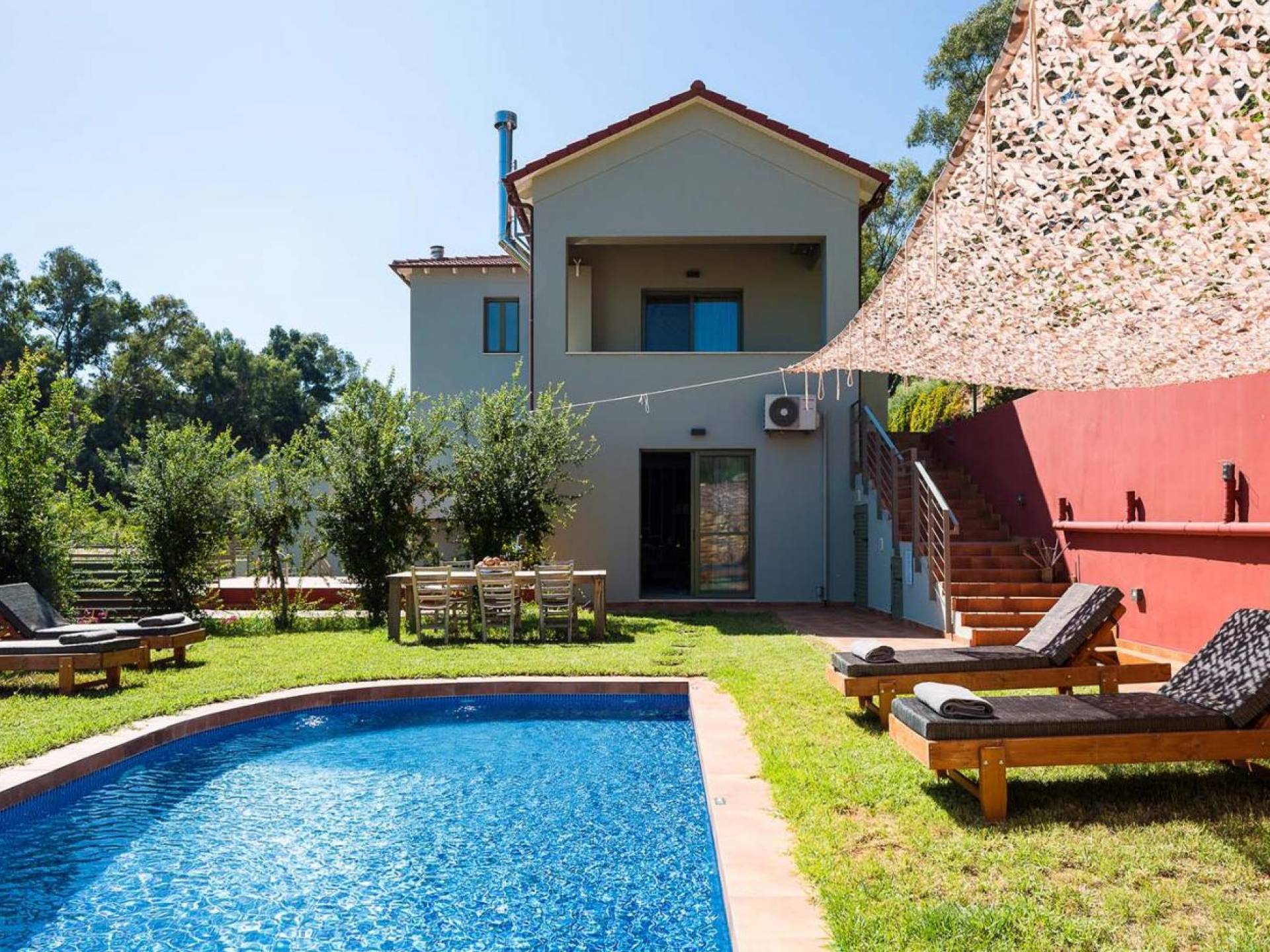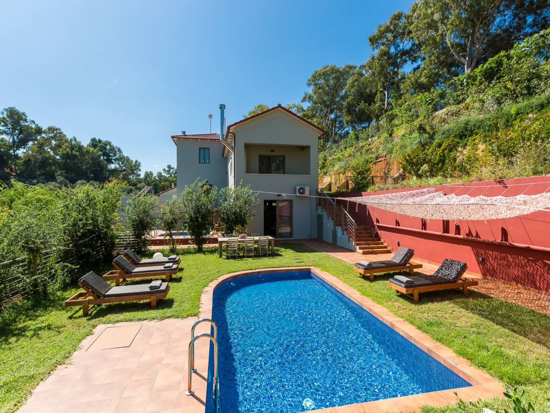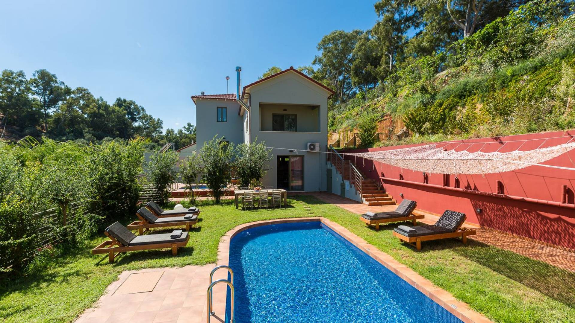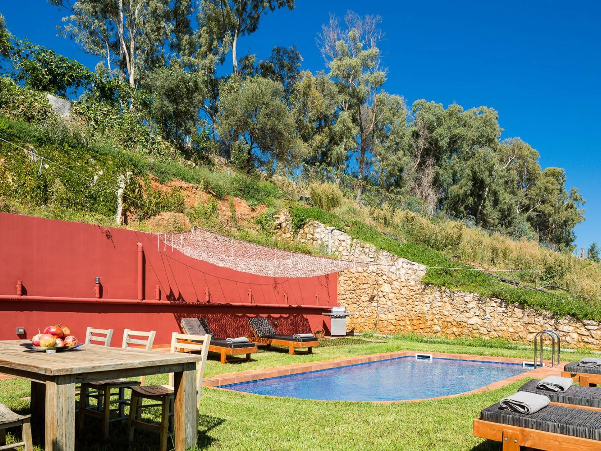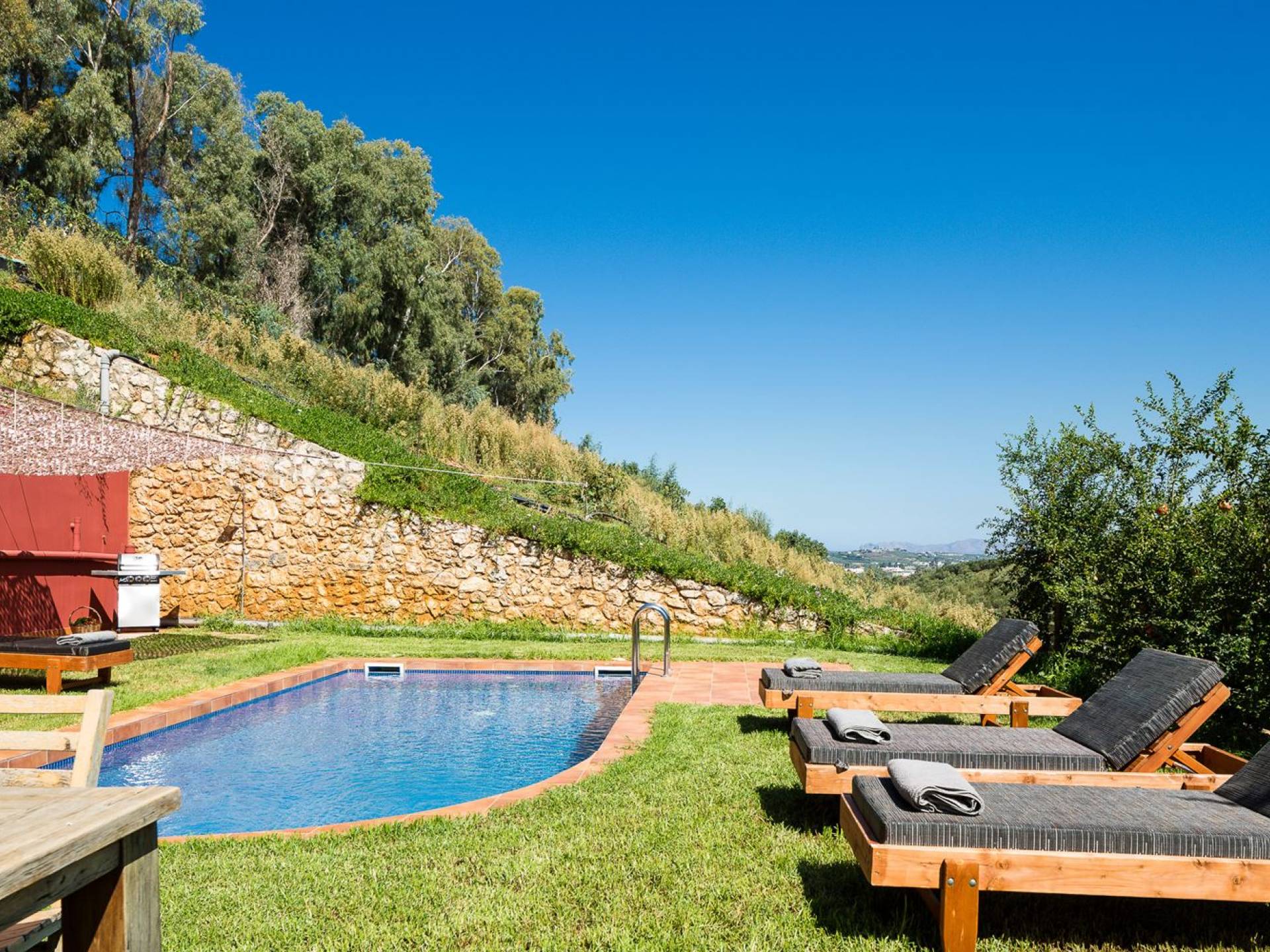 Die faszinierende und vielfältige Natur des Anwesens umfasst 2 Doppelzimmer im Haupthaus sowie 3 Badezimmer, einen privaten Pool, Lounge-Decks, eine voll ausgestattete Küche und einen Grill im Freien. Alles, was Sie brauchen, um Ihrer Fantasie freien Lauf zu lassen, um einen idealen Urlaub zu gestalten. Typisch für die Gegend sind die wunderschönen Terrassengärten, die das Herrenhaus üppig umschließen. Entspannen Sie sich und genießen Sie diese erstklassige Luxusunterkunft!