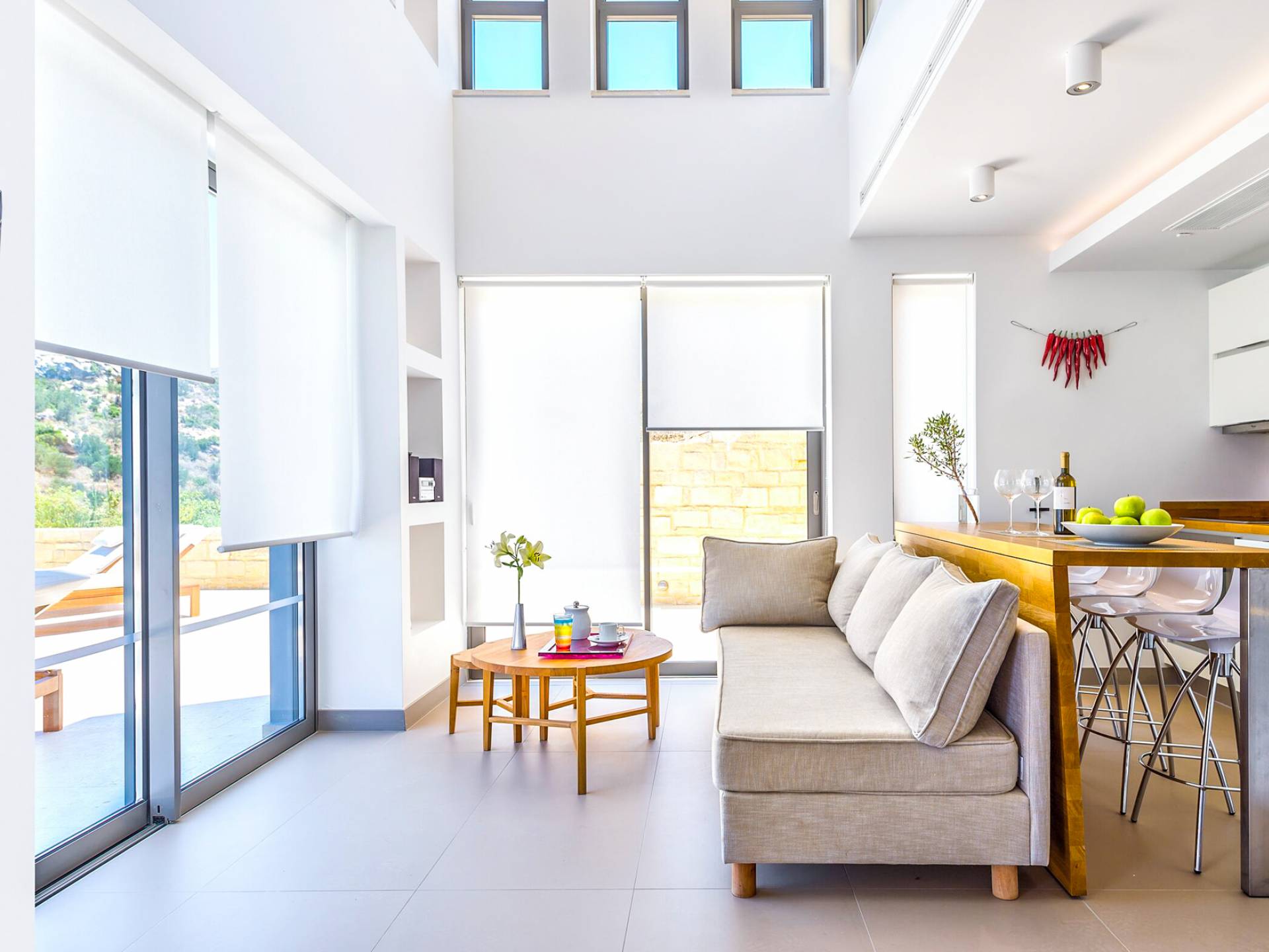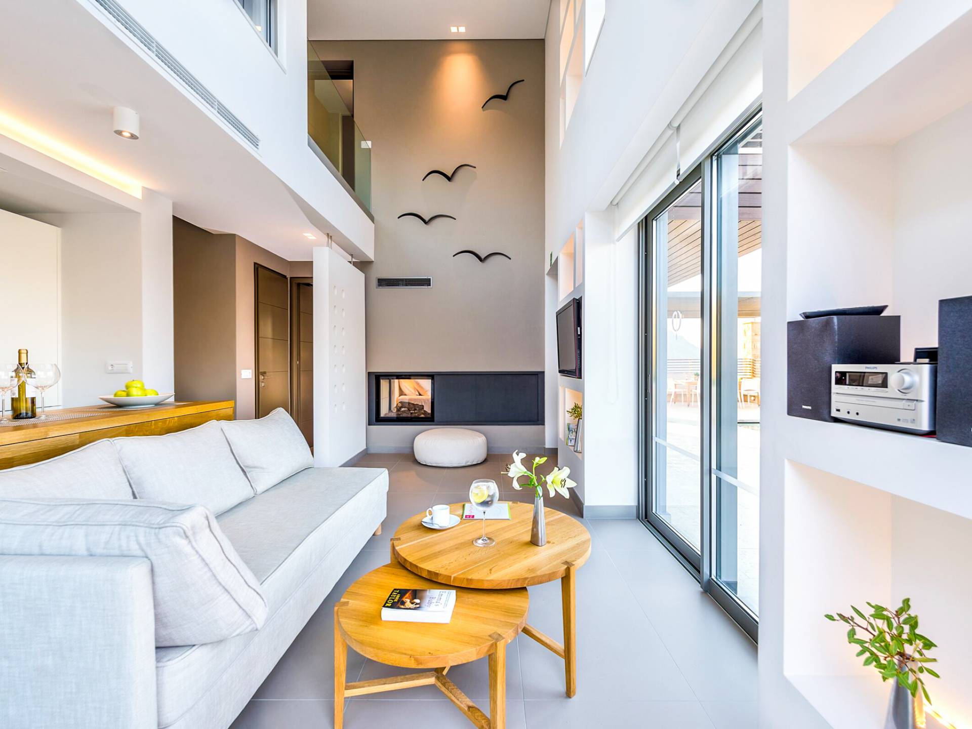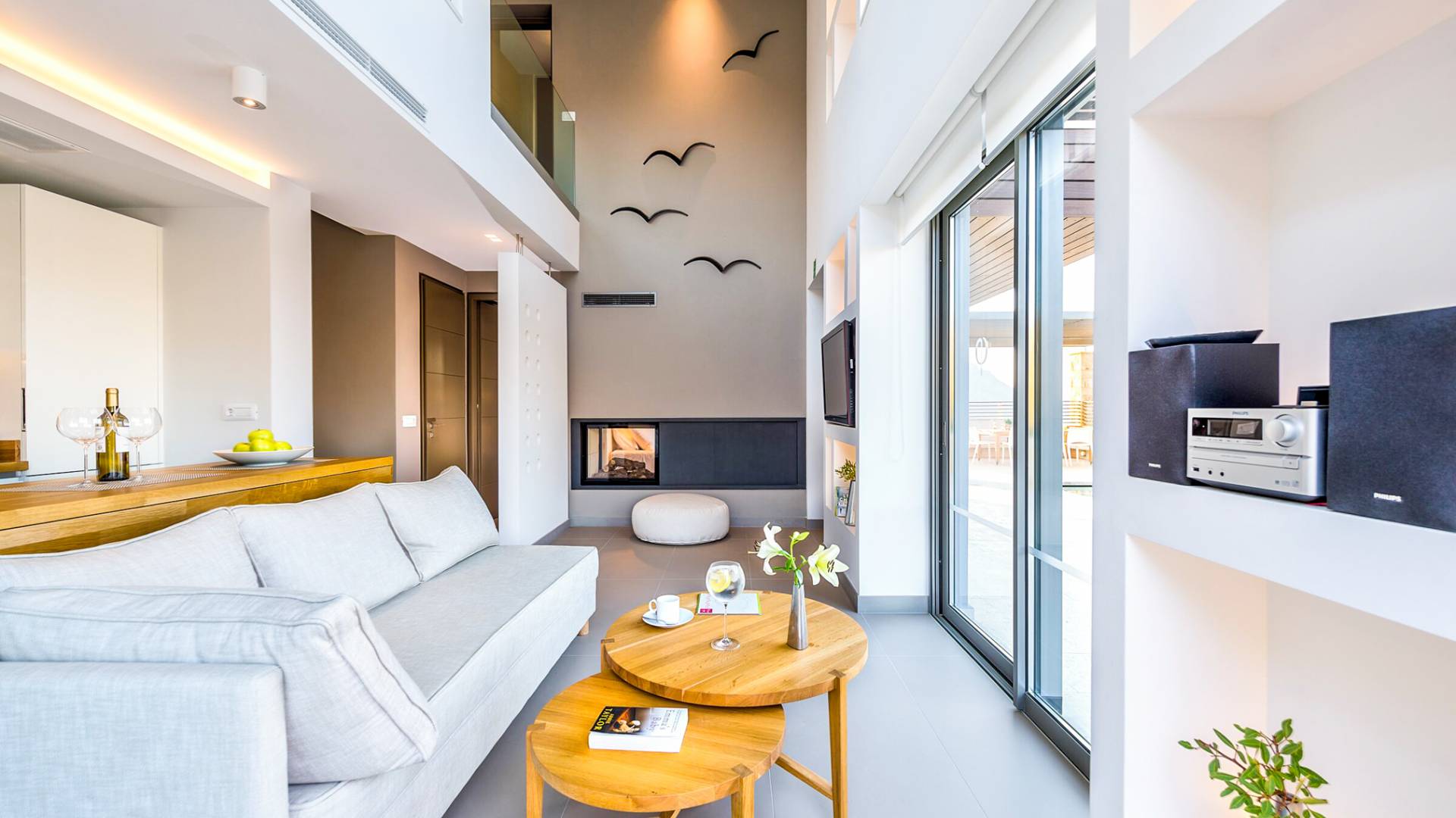 Der Wohnraum ist über zwei Etagen mit durchgehender Verglasung strukturiert, die viel Sonnenlicht ermöglicht und einen Panoramablick von jedem Raum bietet. Das Erdgeschoss verfügt über ein geräumiges Wohnzimmer mit einem modernen, umweltfreundlichen Kamin, während der offene Küchenbereich mit modernsten Geräten und breiten Holzarbeitsflächen sowie einem informellen Essbereich ausgestattet ist.