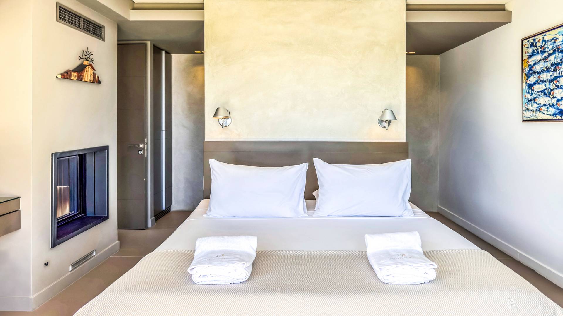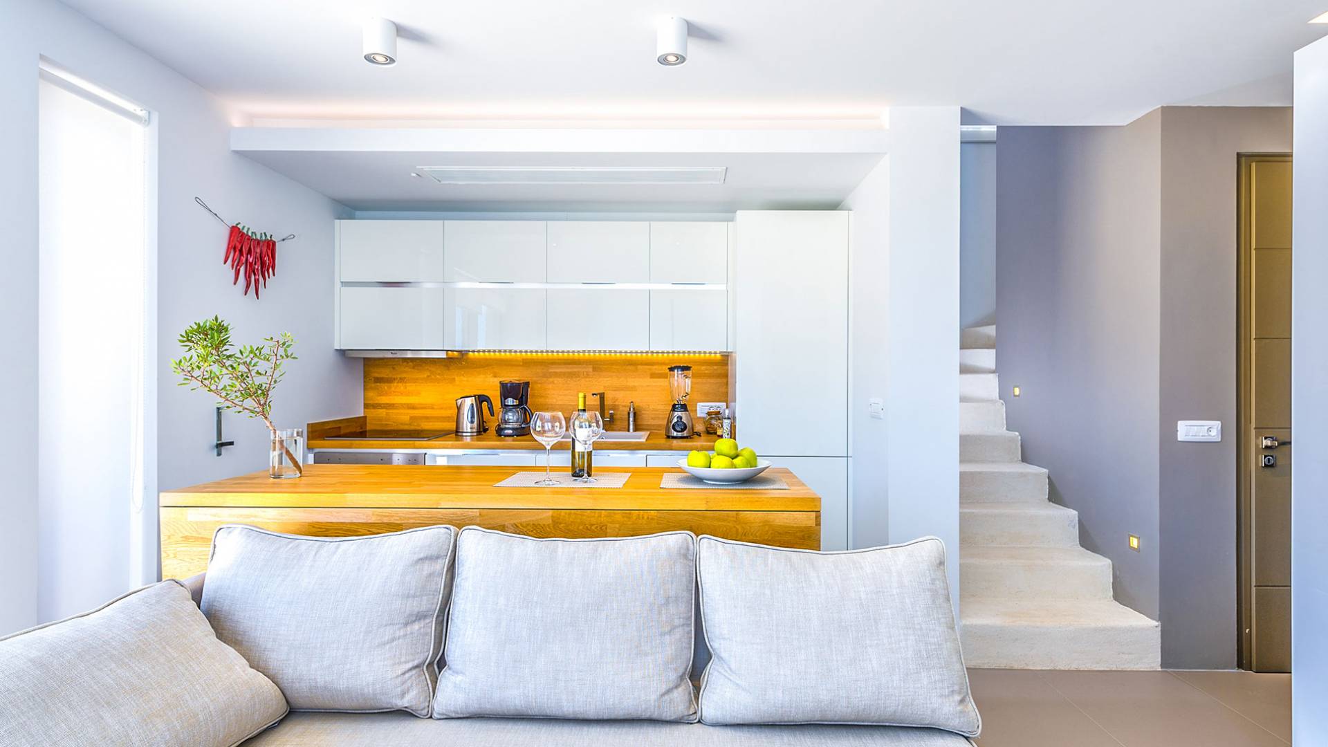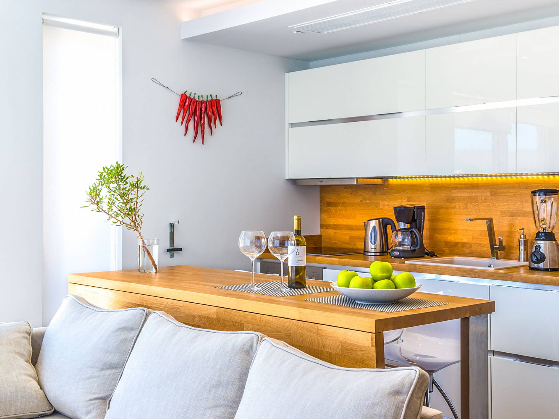 Der Wohnraum ist über zwei Etagen mit durchgehender Verglasung strukturiert, die viel Sonnenlicht ermöglicht und einen Panoramablick von jedem Raum bietet. Das Erdgeschoss verfügt über ein geräumiges Wohnzimmer mit einem modernen, umweltfreundlichen Kamin, während der offene Küchenbereich mit modernsten Geräten und breiten Holzarbeitsflächen sowie einem informellen Essbereich ausgestattet ist.
