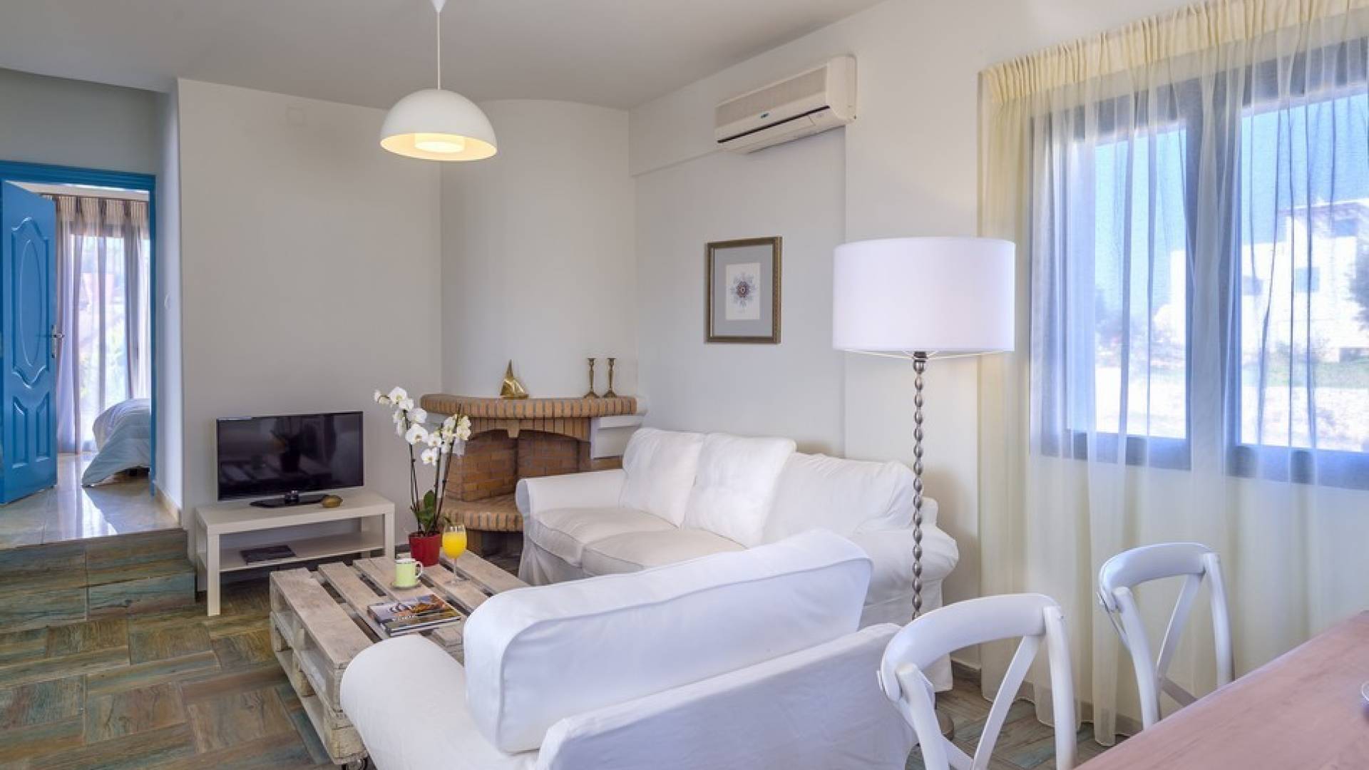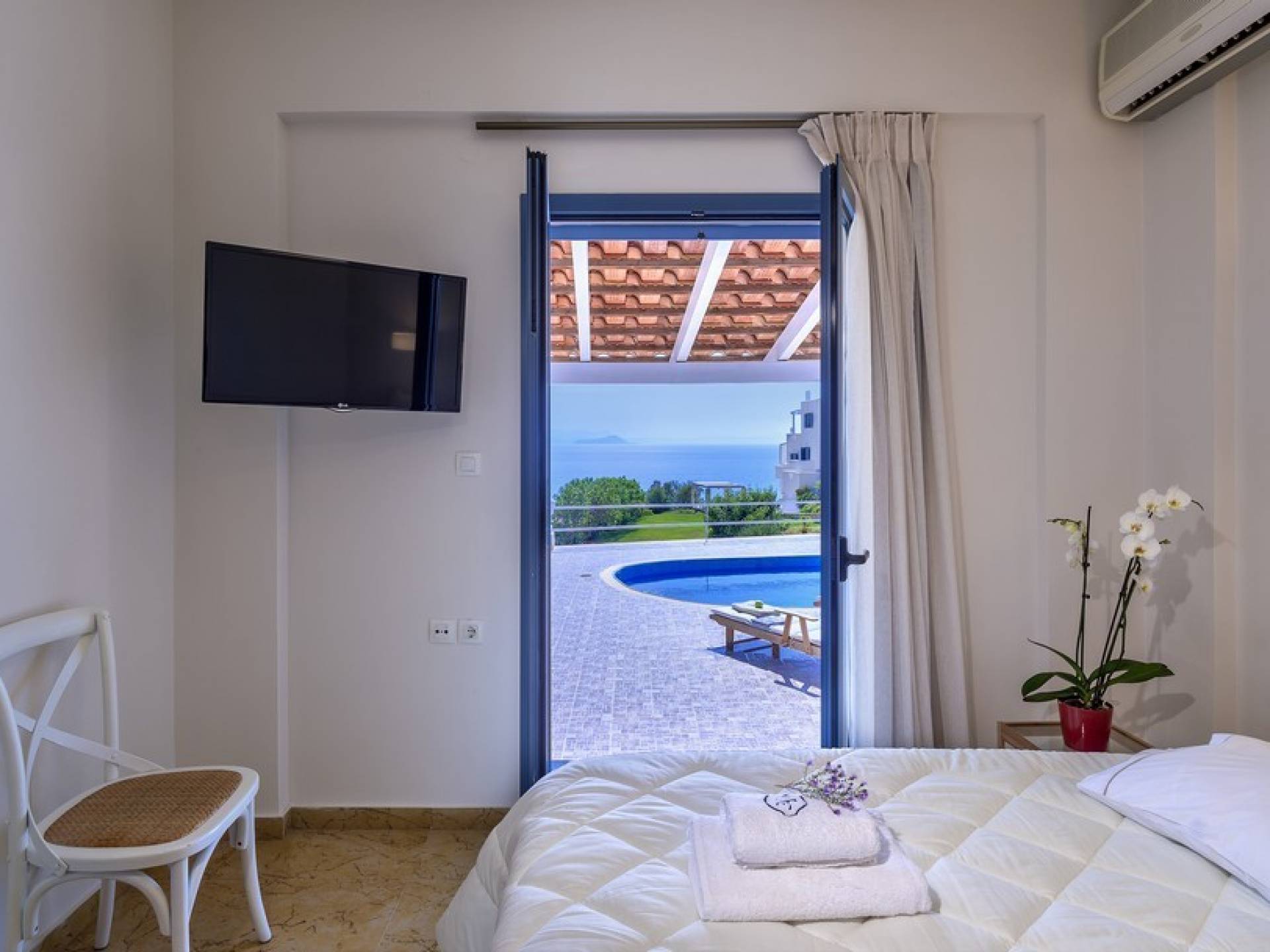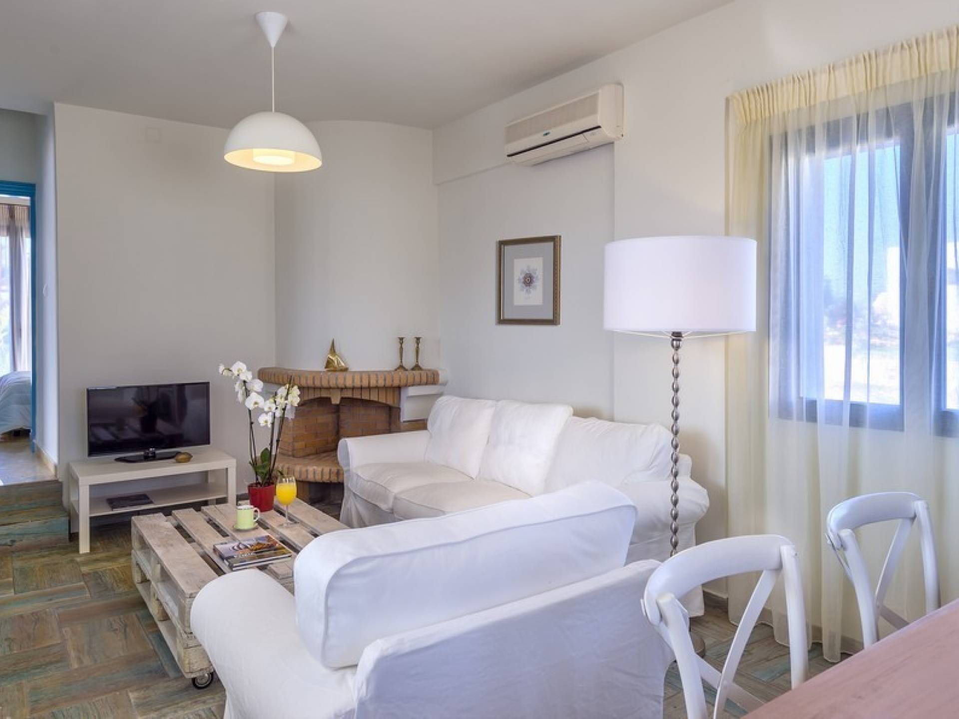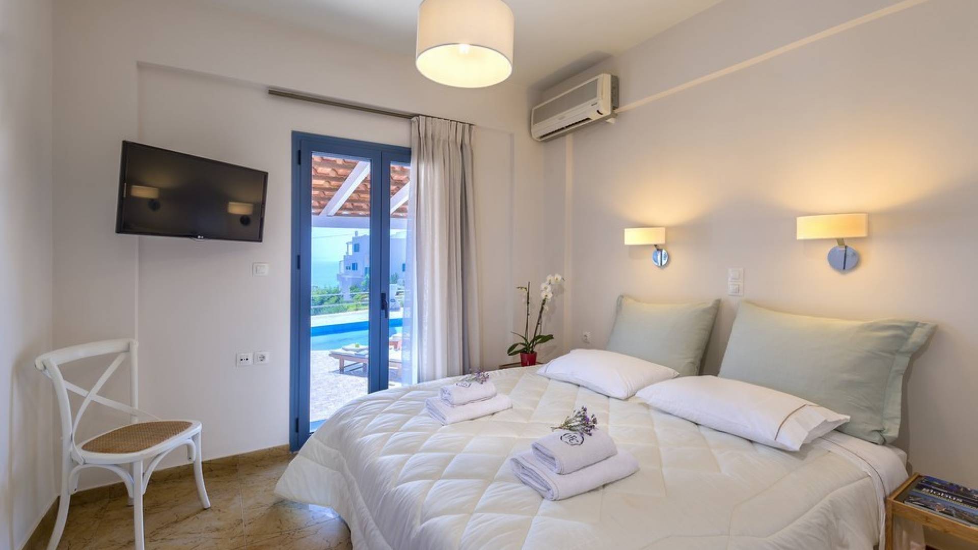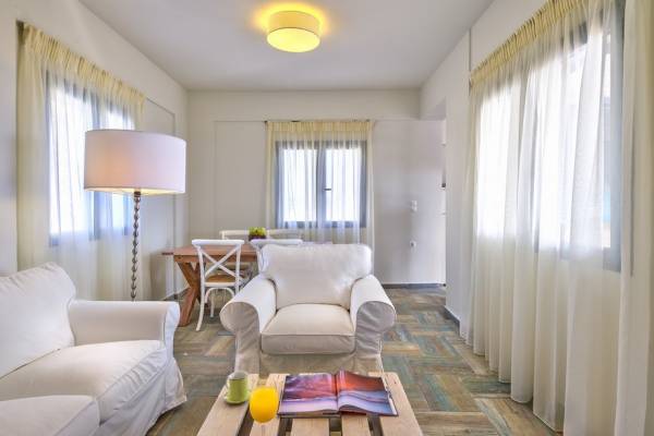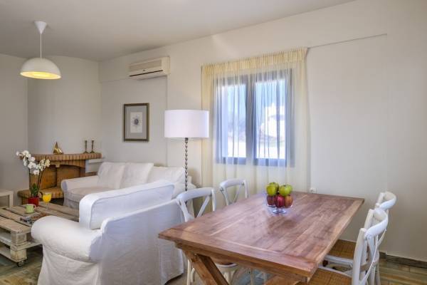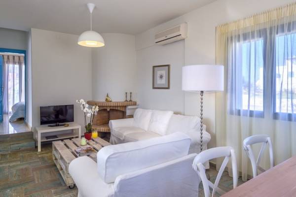 Die hellen und entspannenden Farben der Möbel und Textilien der Villa Irida in Kombination mit den Einrichtungen, die alle Besucher suchen, wie dem Sat-TV in jedem Zimmer und dem kostenlosen Highspeed-WLAN, sind die Schlüsselelemente für einen erholsamen und angenehmen Aufenthalt Urlaub in einer der schönsten Gegenden Kretas. Schlafzimmer: 1 Hauptschlafzimmer (50qm) mit Kingsize-Bett, privates Badezimmer mit Jacuzzi-Wanne, Kochnische, Sofa und Couchtisch und Kleiderschrank. 2 Schlafzimmer mit Doppelbetten (die in Zwillinge umgewandelt werden können) mit eigenem Bad mit Dusche.