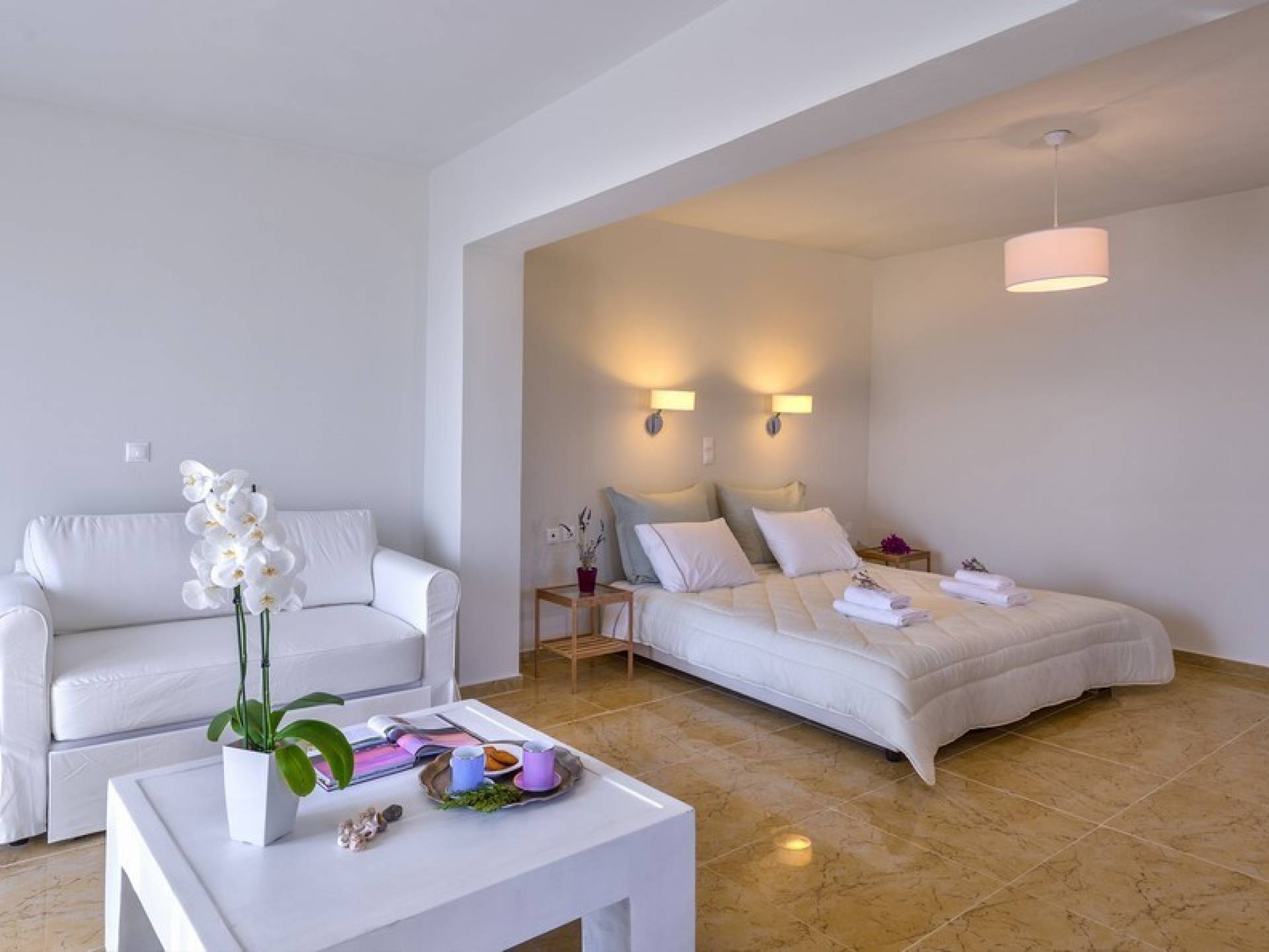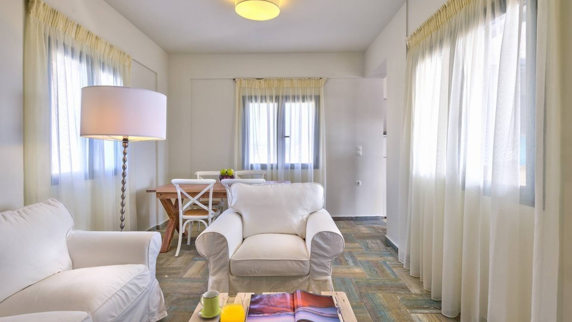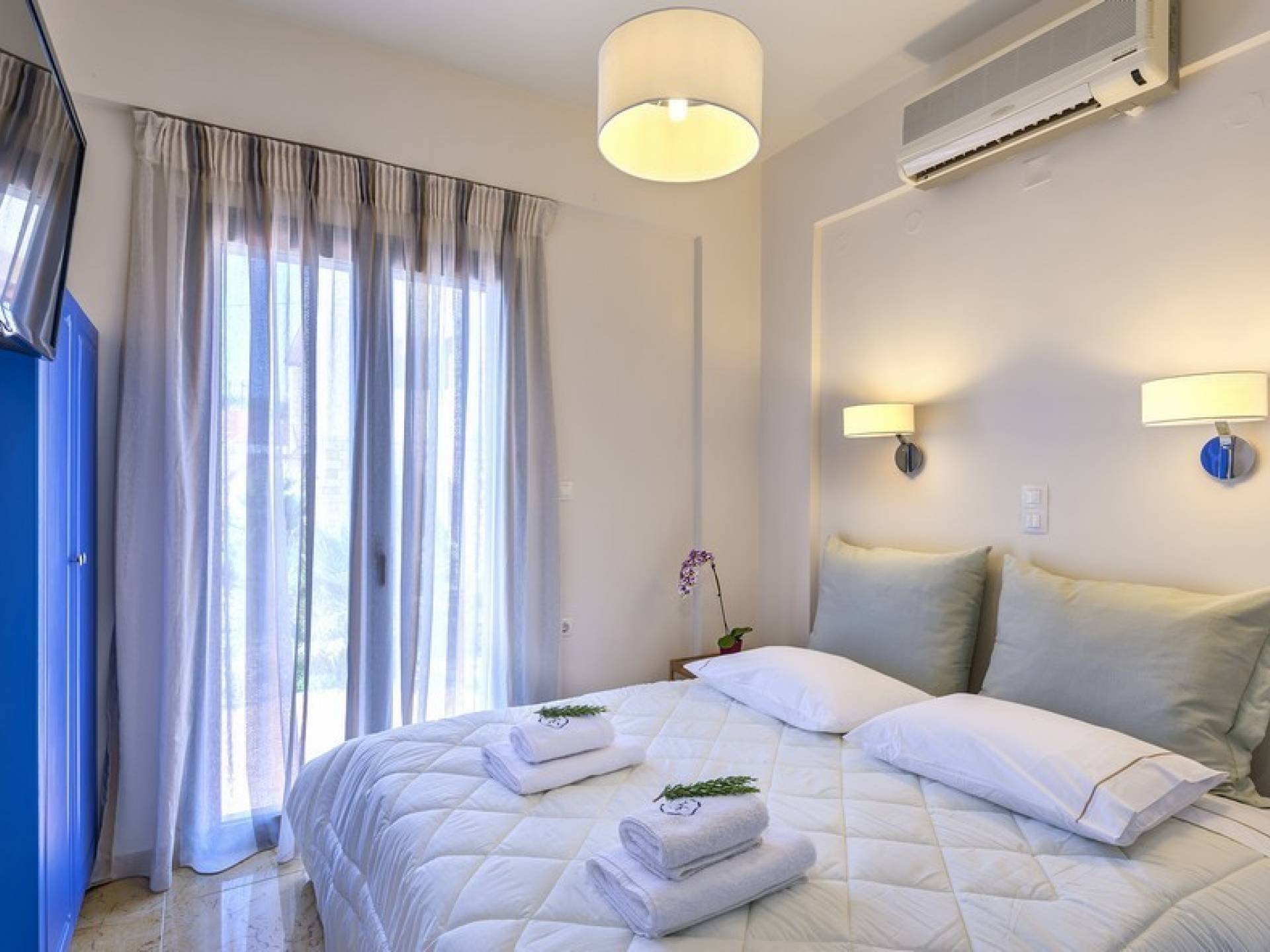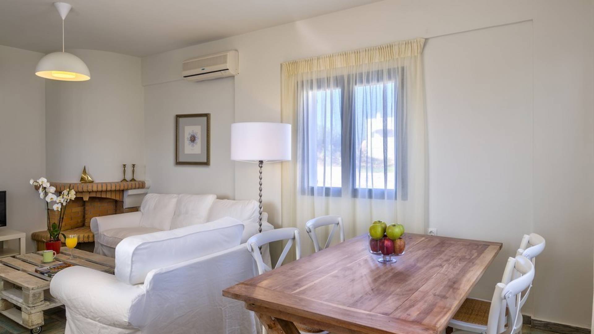 Die hellen und entspannenden Farben der Möbel und Textilien der Villa Irida in Kombination mit den Einrichtungen, die alle Besucher suchen, wie dem Sat-TV in jedem Zimmer und dem kostenlosen Highspeed-WLAN, sind die Schlüsselelemente für einen erholsamen und angenehmen Aufenthalt Urlaub in einer der schönsten Gegenden Kretas. Schlafzimmer: 1 Hauptschlafzimmer (50qm) mit Kingsize-Bett, privates Badezimmer mit Jacuzzi-Wanne, Kochnische, Sofa und Couchtisch und Kleiderschrank. 2 Schlafzimmer mit Doppelbetten (die in Zwillinge umgewandelt werden können) mit eigenem Bad mit Dusche.