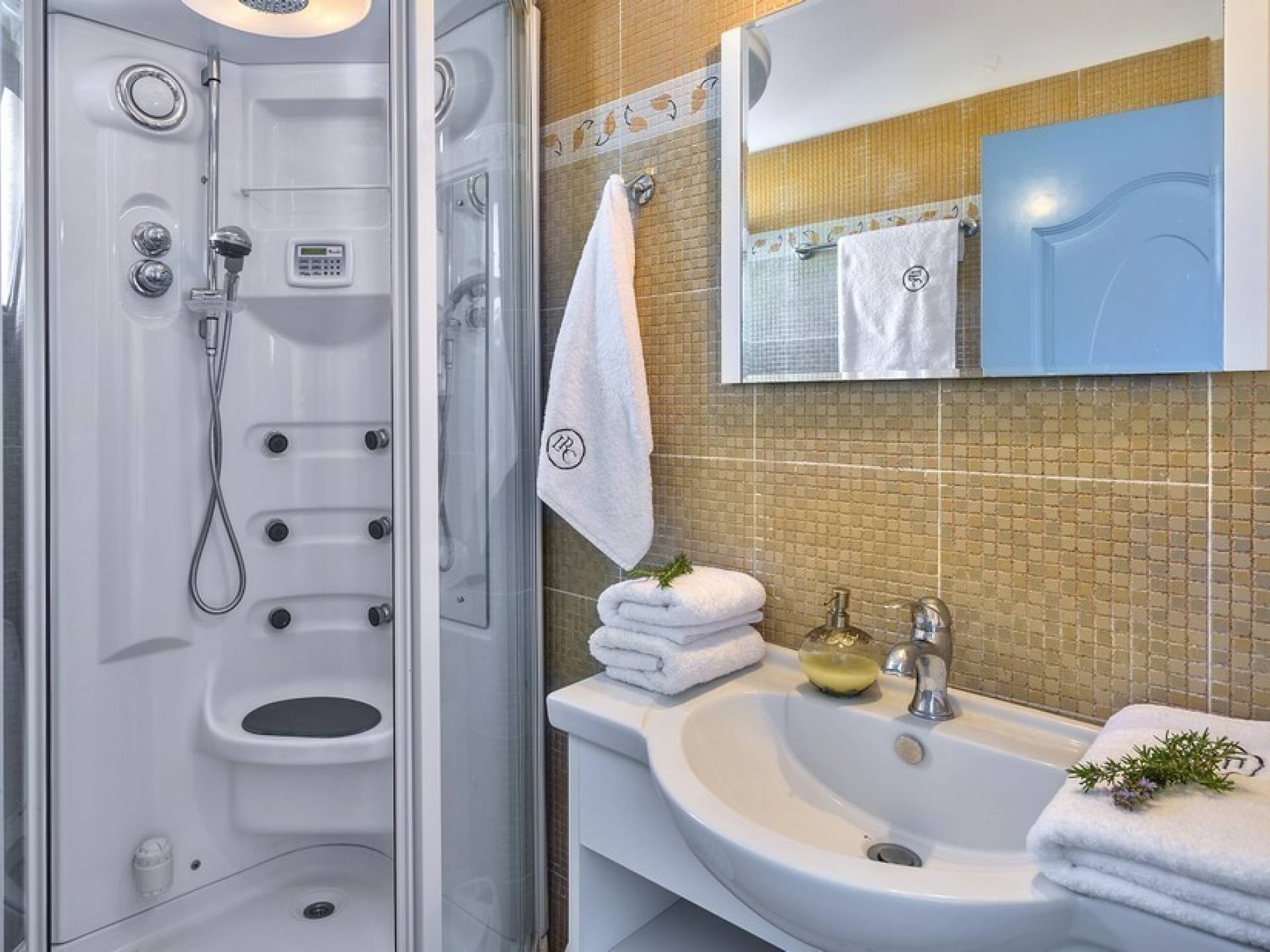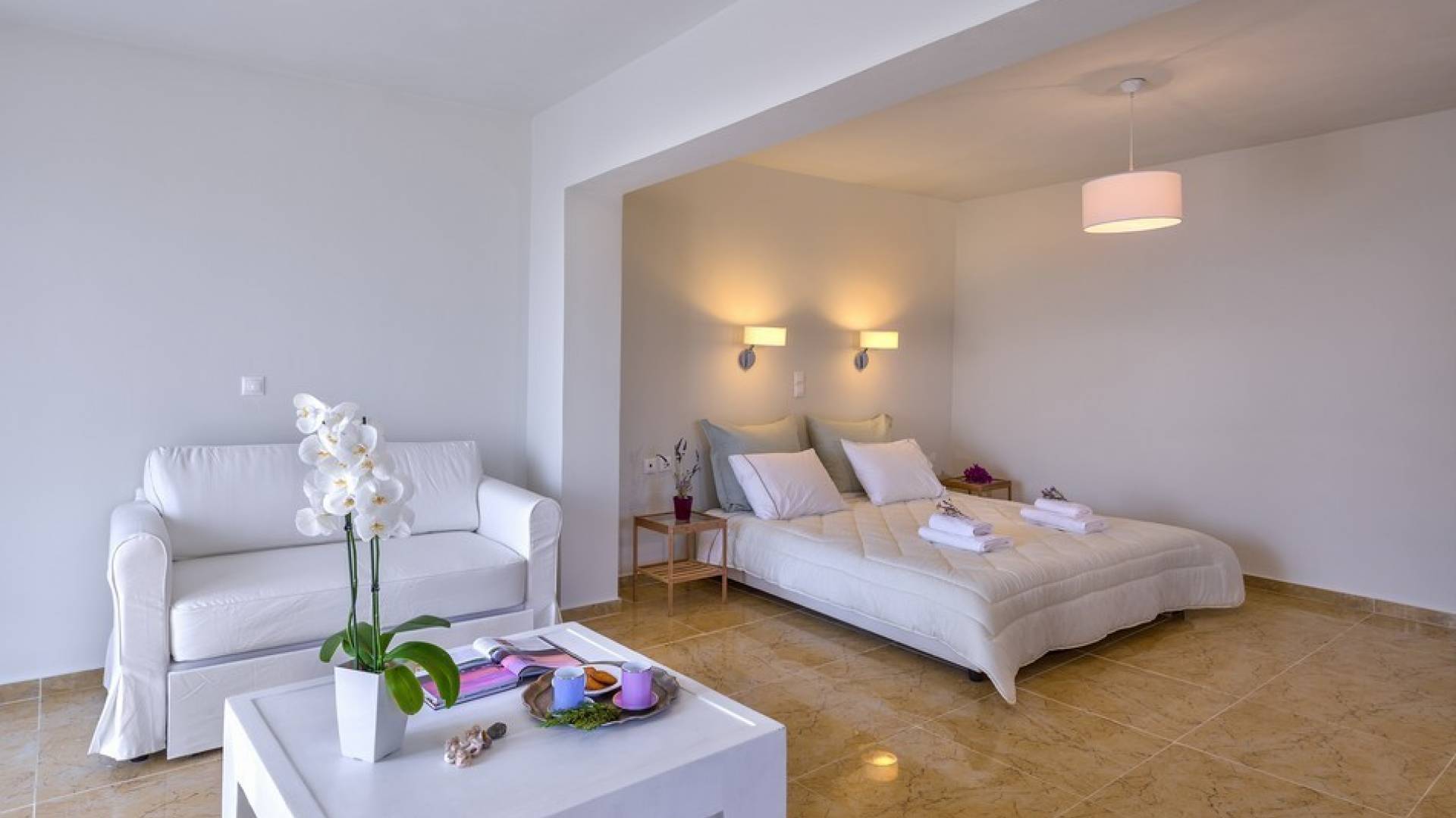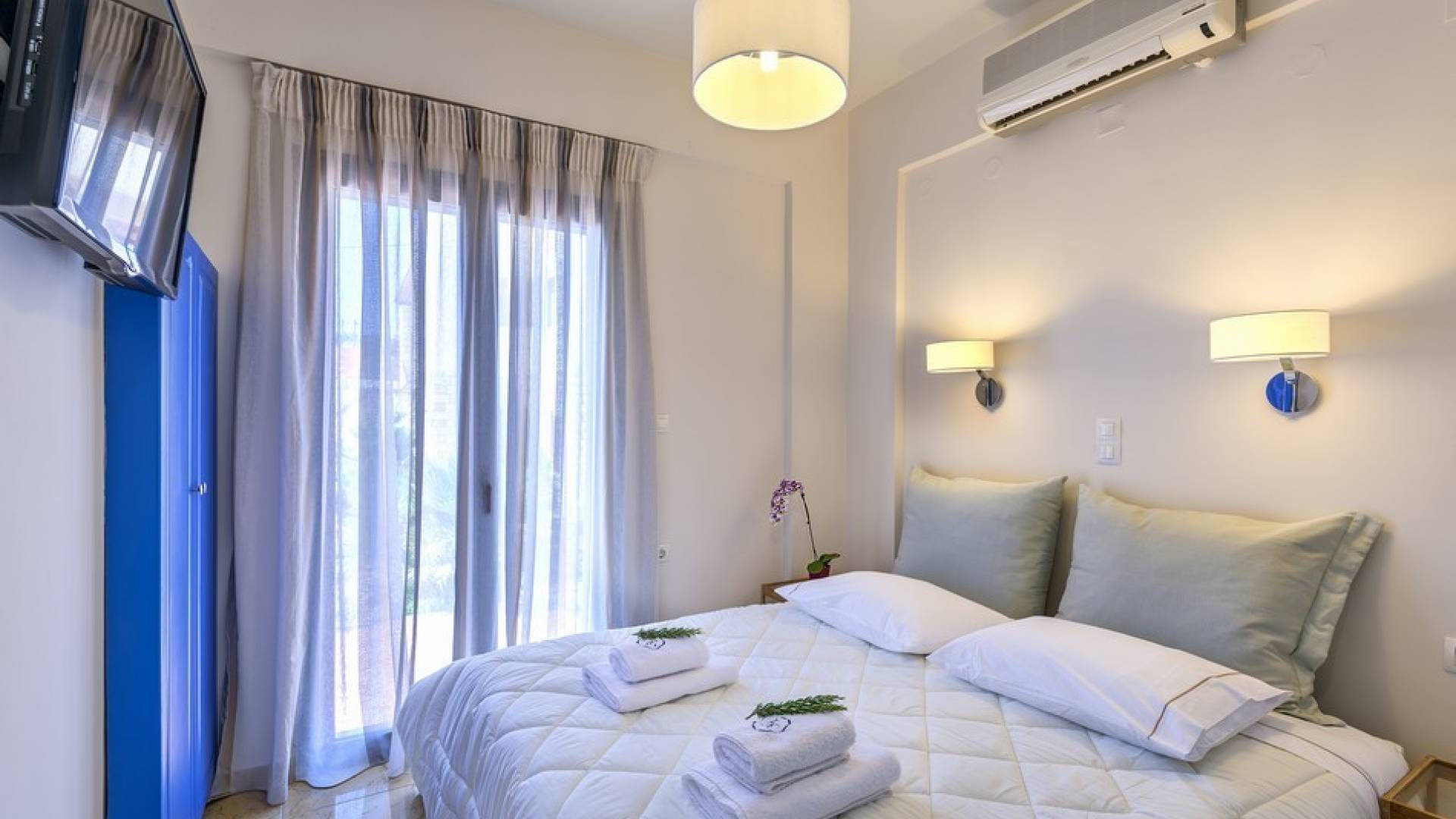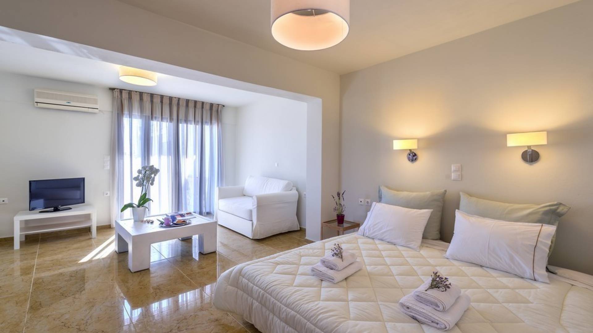 Die hellen und entspannenden Farben der Möbel und Textilien der Villa Irida in Kombination mit den Einrichtungen, die alle Besucher suchen, wie dem Sat-TV in jedem Zimmer und dem kostenlosen Highspeed-WLAN, sind die Schlüsselelemente für einen erholsamen und angenehmen Aufenthalt Urlaub in einer der schönsten Gegenden Kretas. Schlafzimmer: 1 Hauptschlafzimmer (50qm) mit Kingsize-Bett, privates Badezimmer mit Jacuzzi-Wanne, Kochnische, Sofa und Couchtisch und Kleiderschrank. 2 Schlafzimmer mit Doppelbetten (die in Zwillinge umgewandelt werden können) mit eigenem Bad mit Dusche.