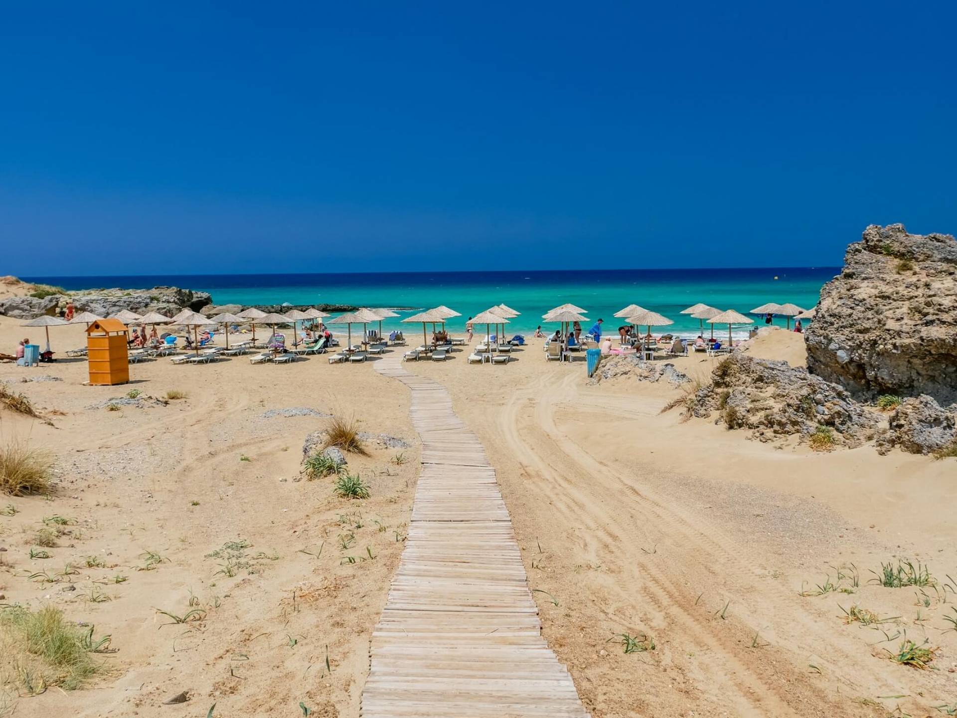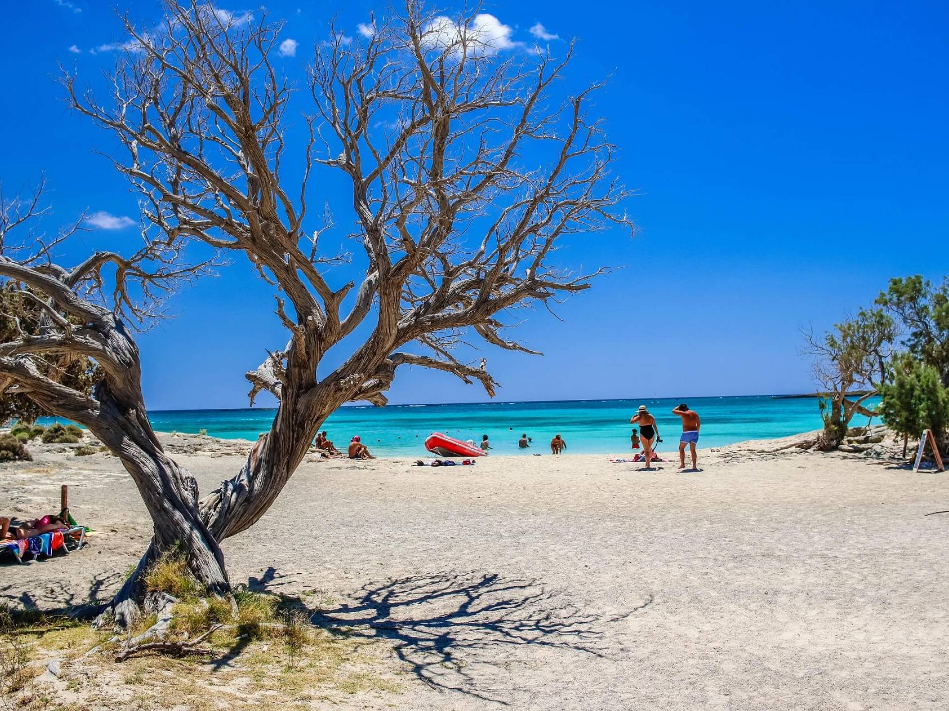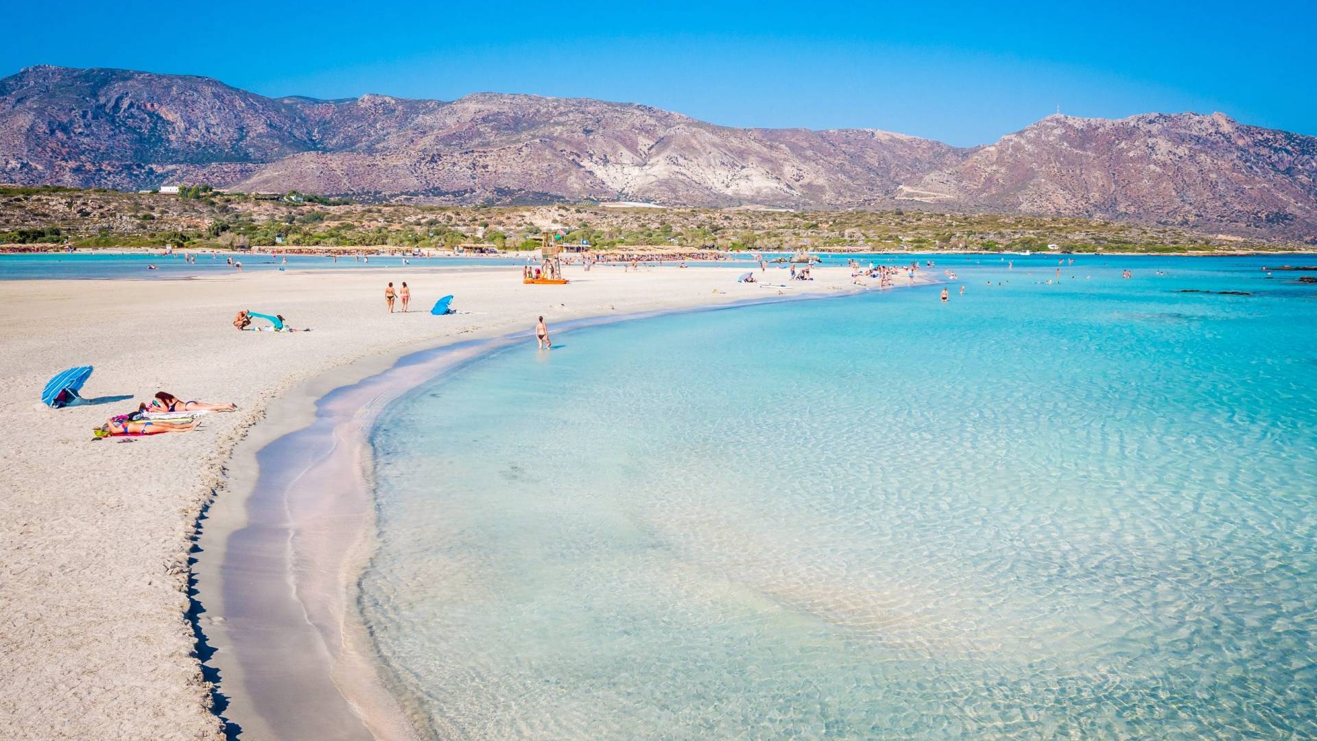 Elafonissi-Strand: Berühmt für seine flachen, klaren Gewässer und zartrosa Sandstreifen.