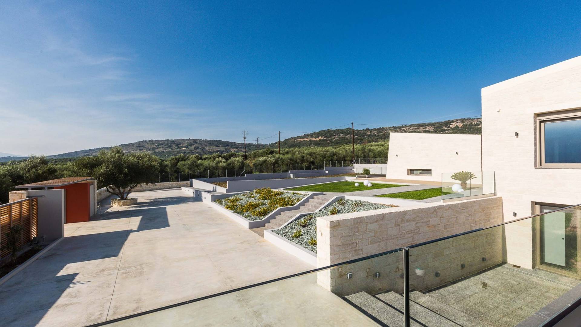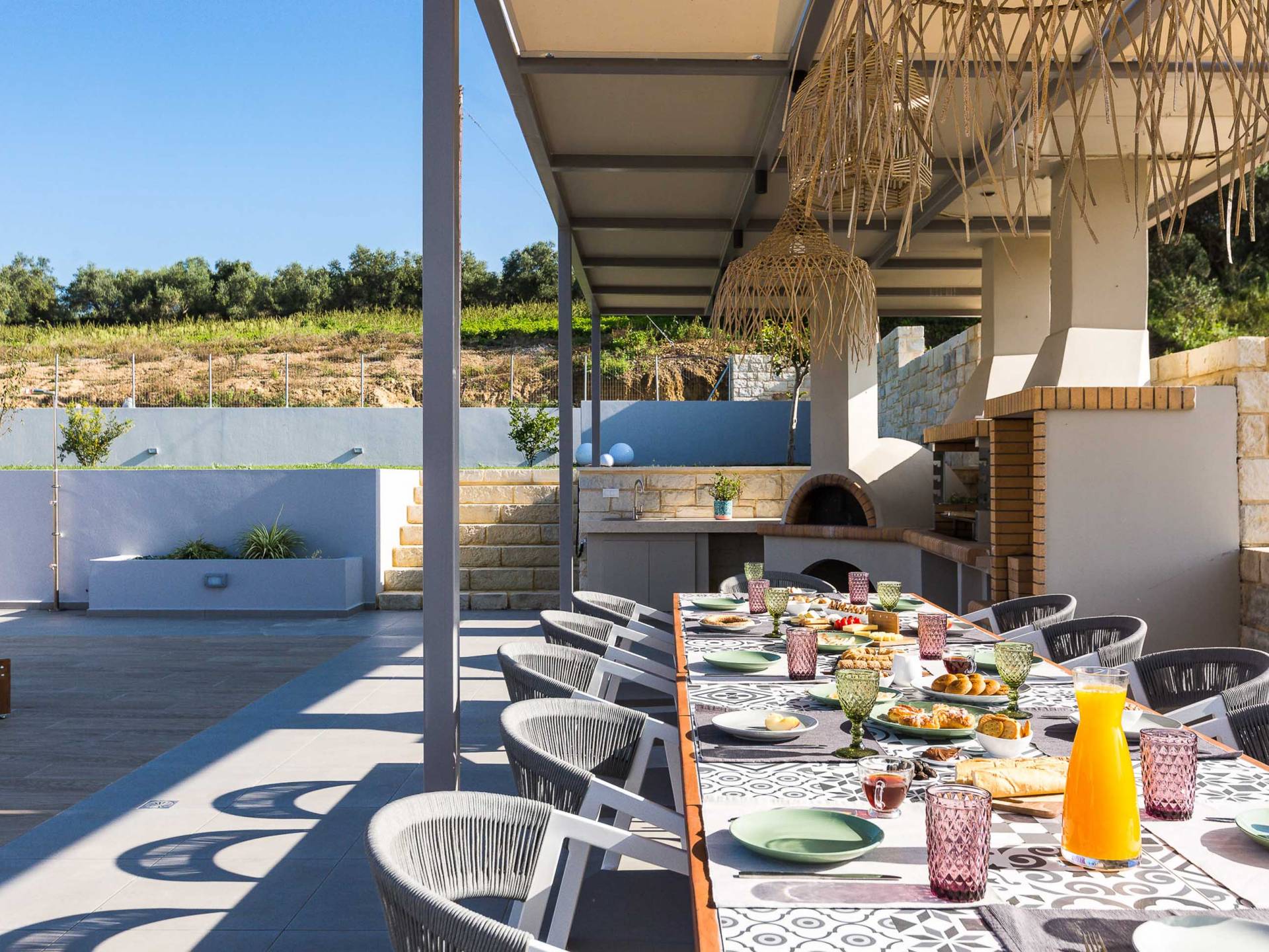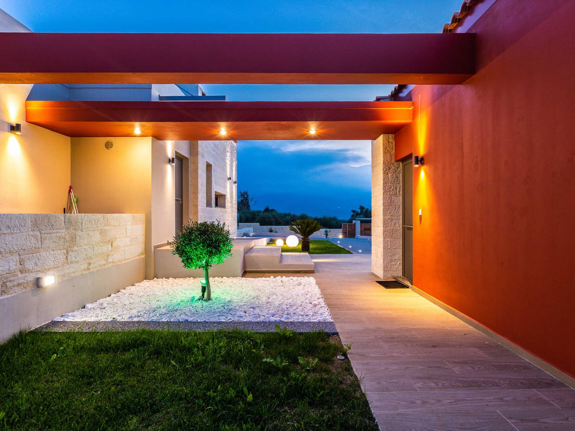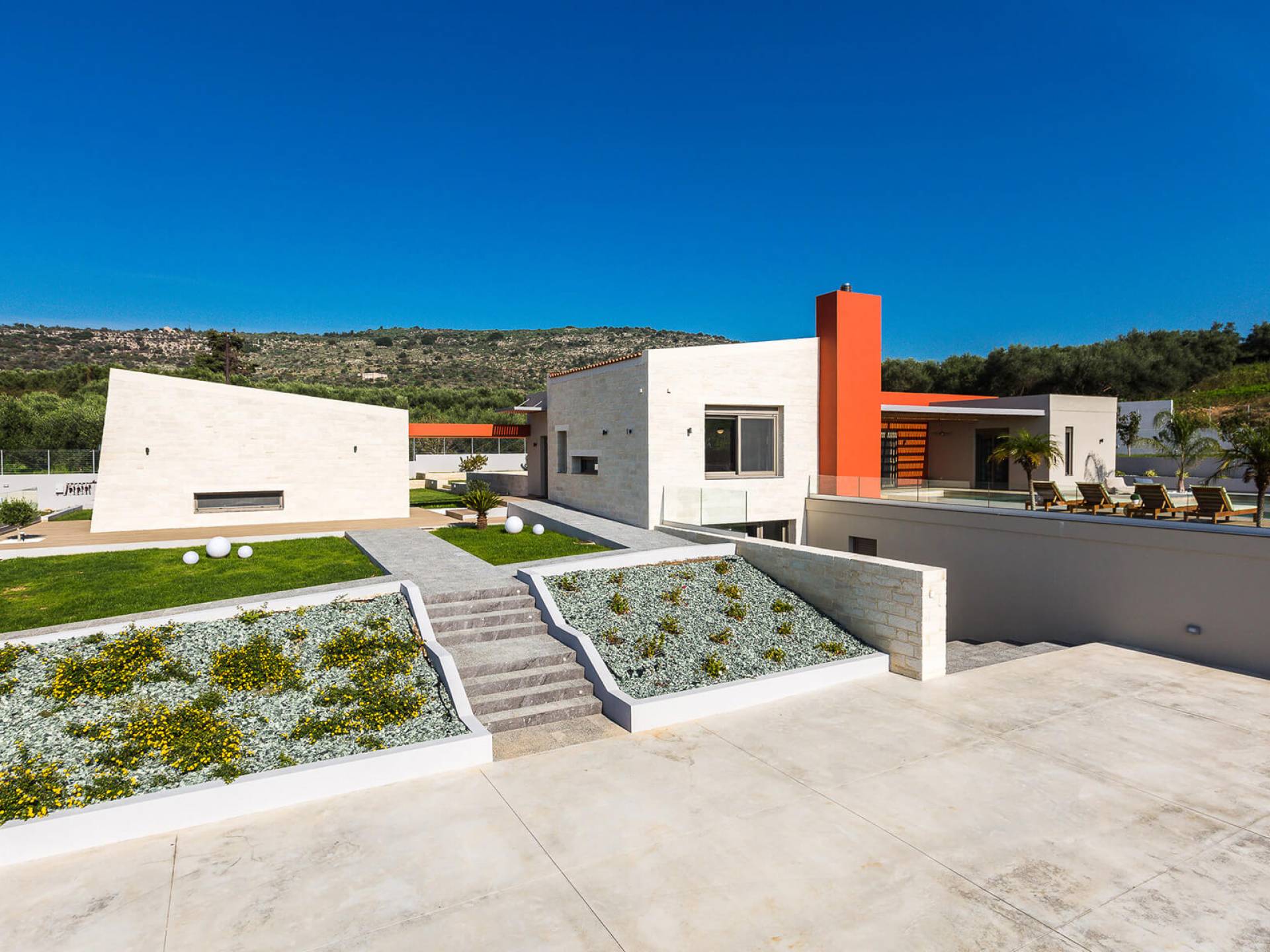Outdoors, Oros Luxe Villa Chania will take your breath away. Olive trees, grapes, and orange trees give you a sense of relaxation near nature. Relax in the infinity swimming pool of 80m2 while your children play safely in the children pool which is 37sq.m. Cook your meal preparing it with organic products that you collected from the garden enjoying it in the dining table. The outdoor living areas offer you romantic moments day and night. The villa has secure parking suitable for two vehicles. Relax and enjoy the legacy of nature, near the beach and all amenities.