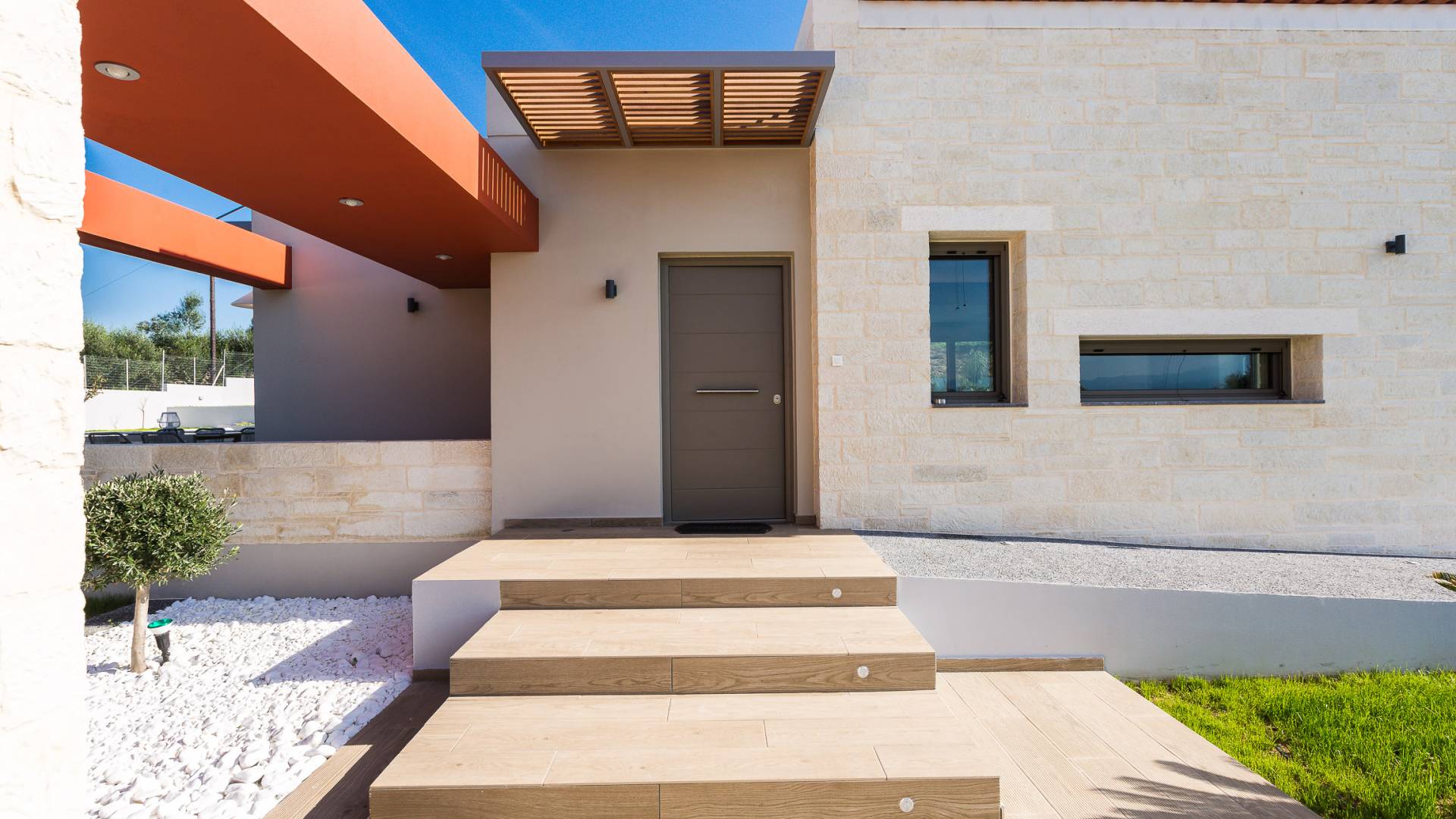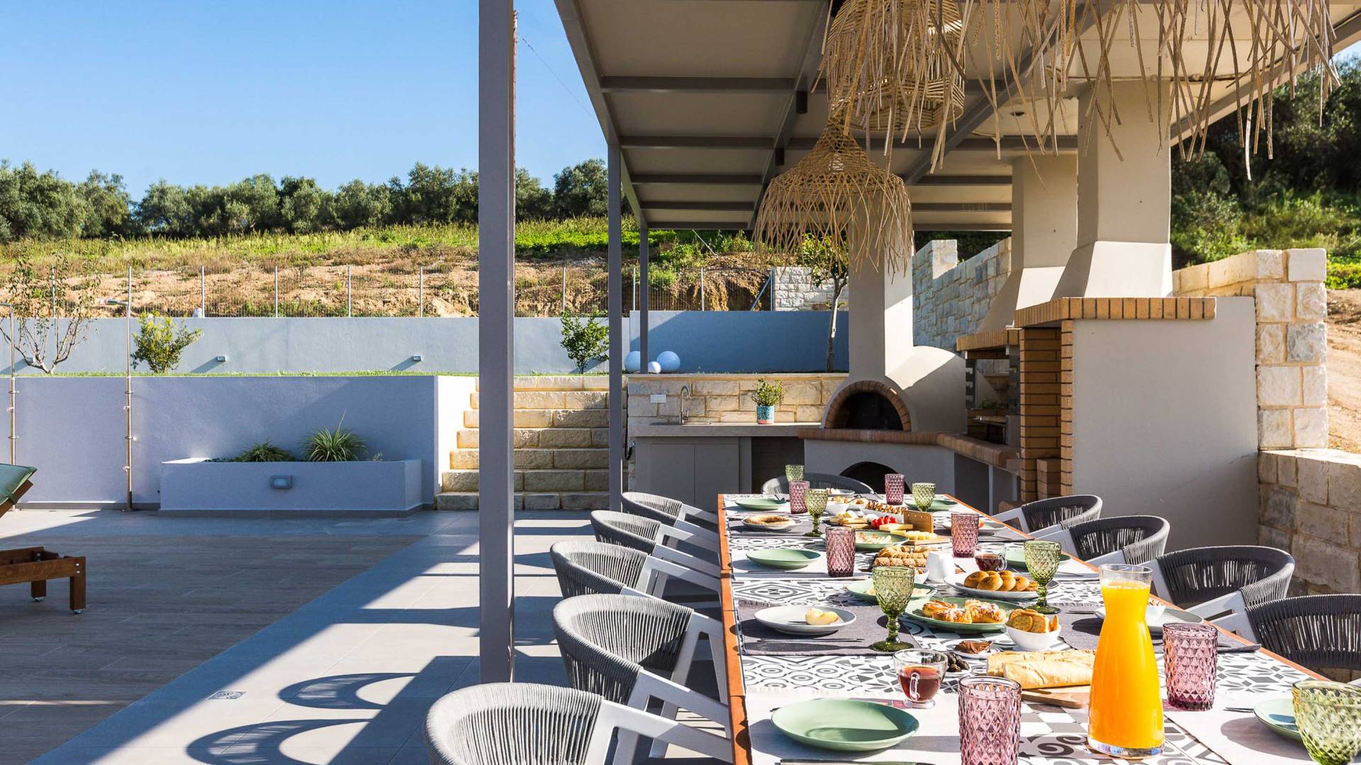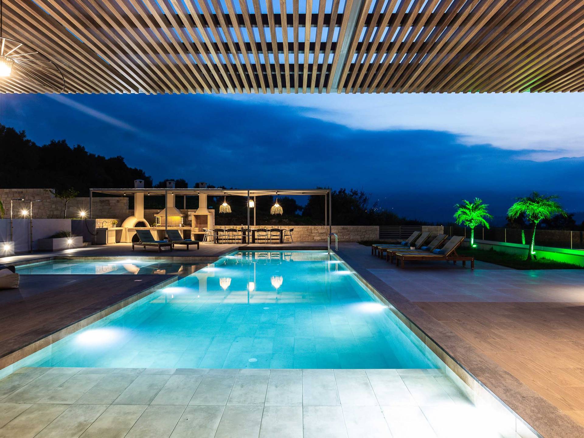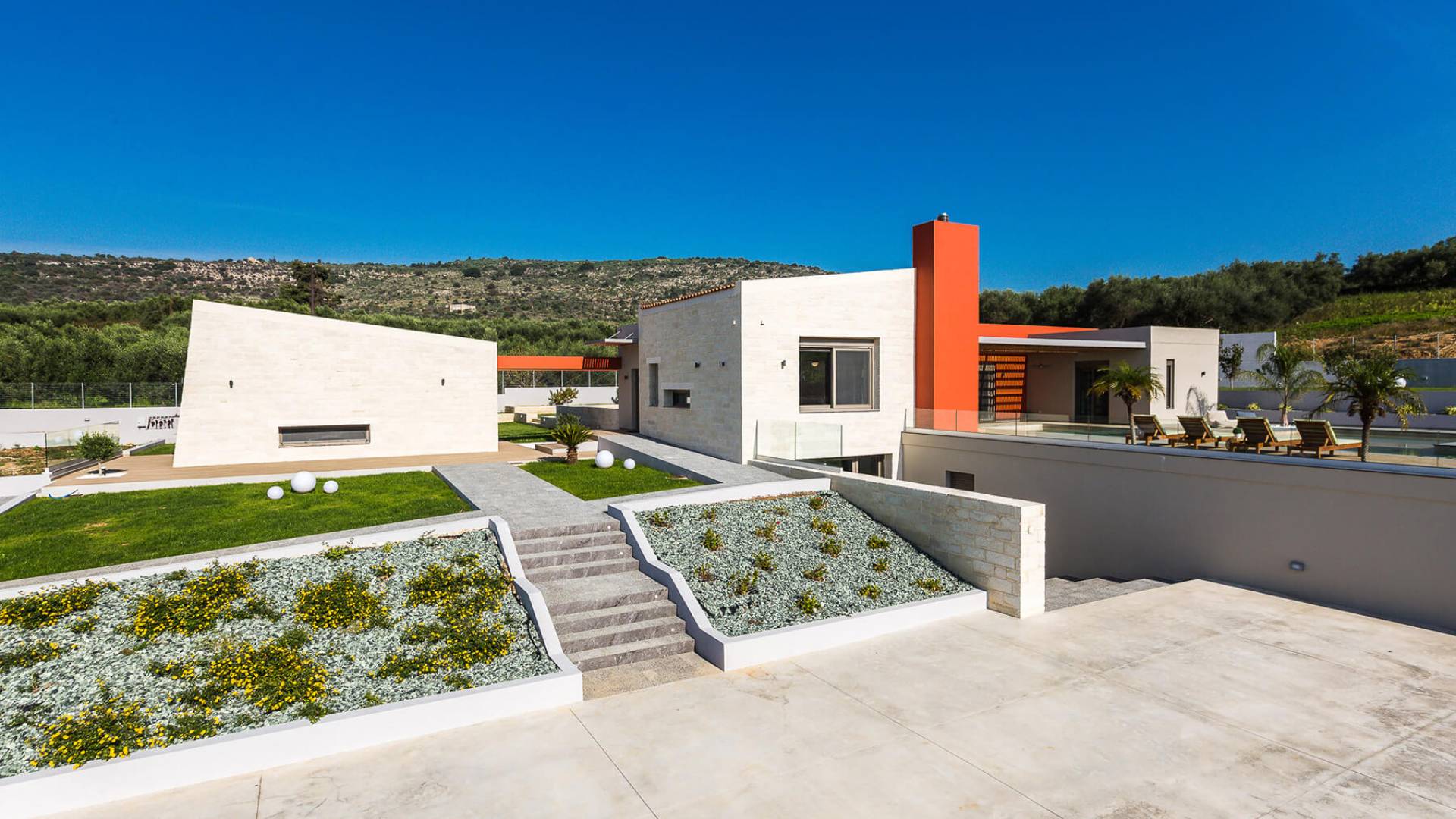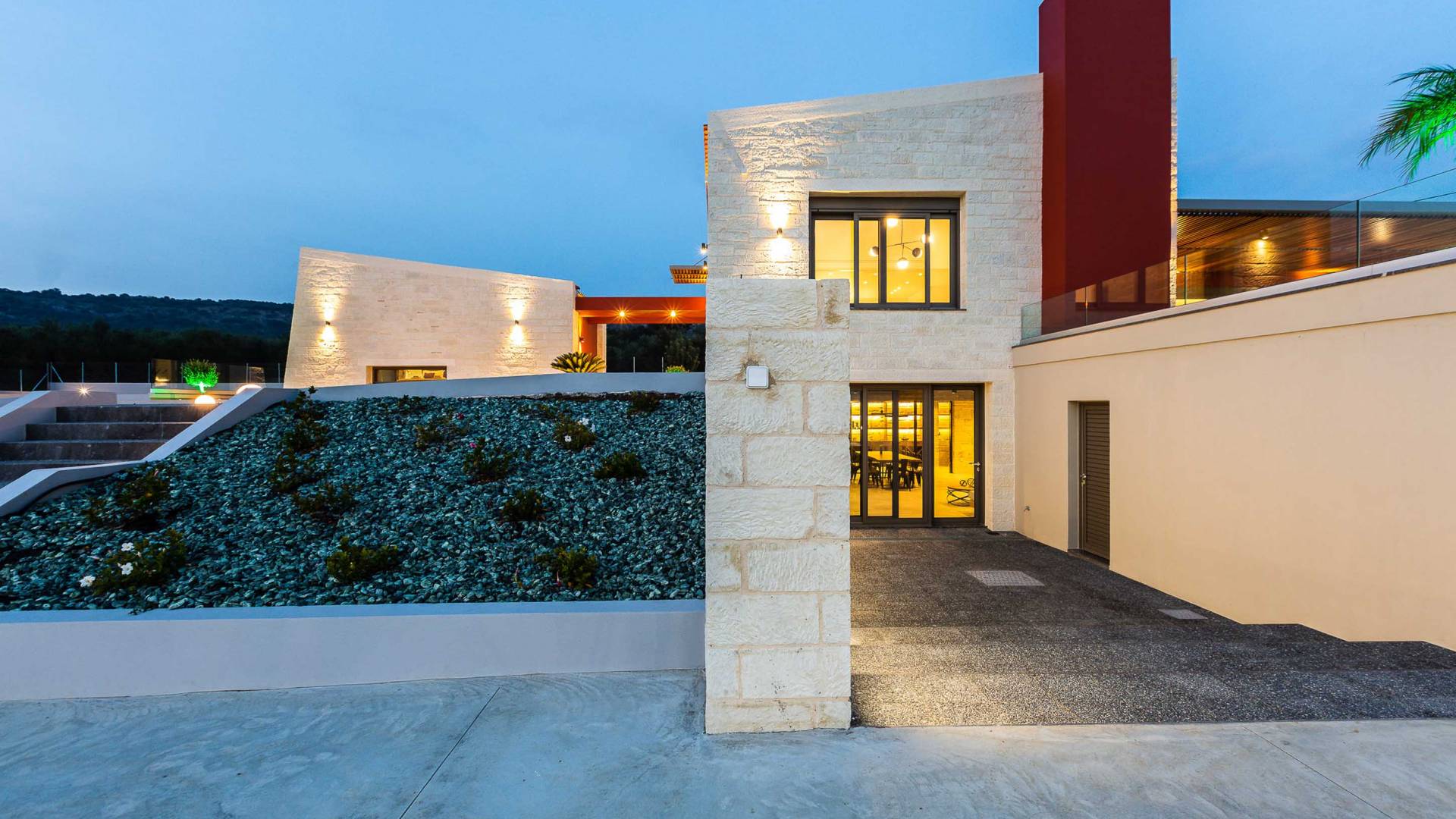 Outdoors, Oros Luxe Villa Chania will take your breath away. Olive trees, grapes, and orange trees give you a sense of relaxation near nature. Relax in the infinity swimming pool of 80m2 while your children play safely in the children pool which is 37sq.m. Cook your meal preparing it with organic products that you collected from the garden enjoying it in the dining table. The outdoor living areas offer you romantic moments day and night. The villa has secure parking suitable for two vehicles. Relax and enjoy the legacy of nature, near the beach and all amenities.