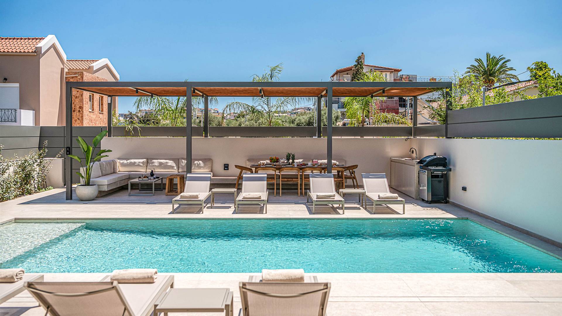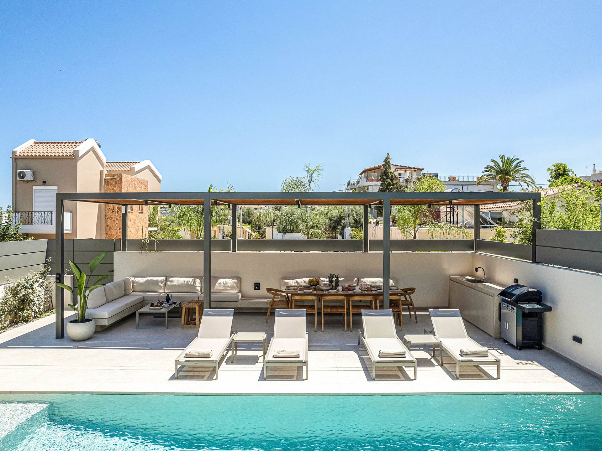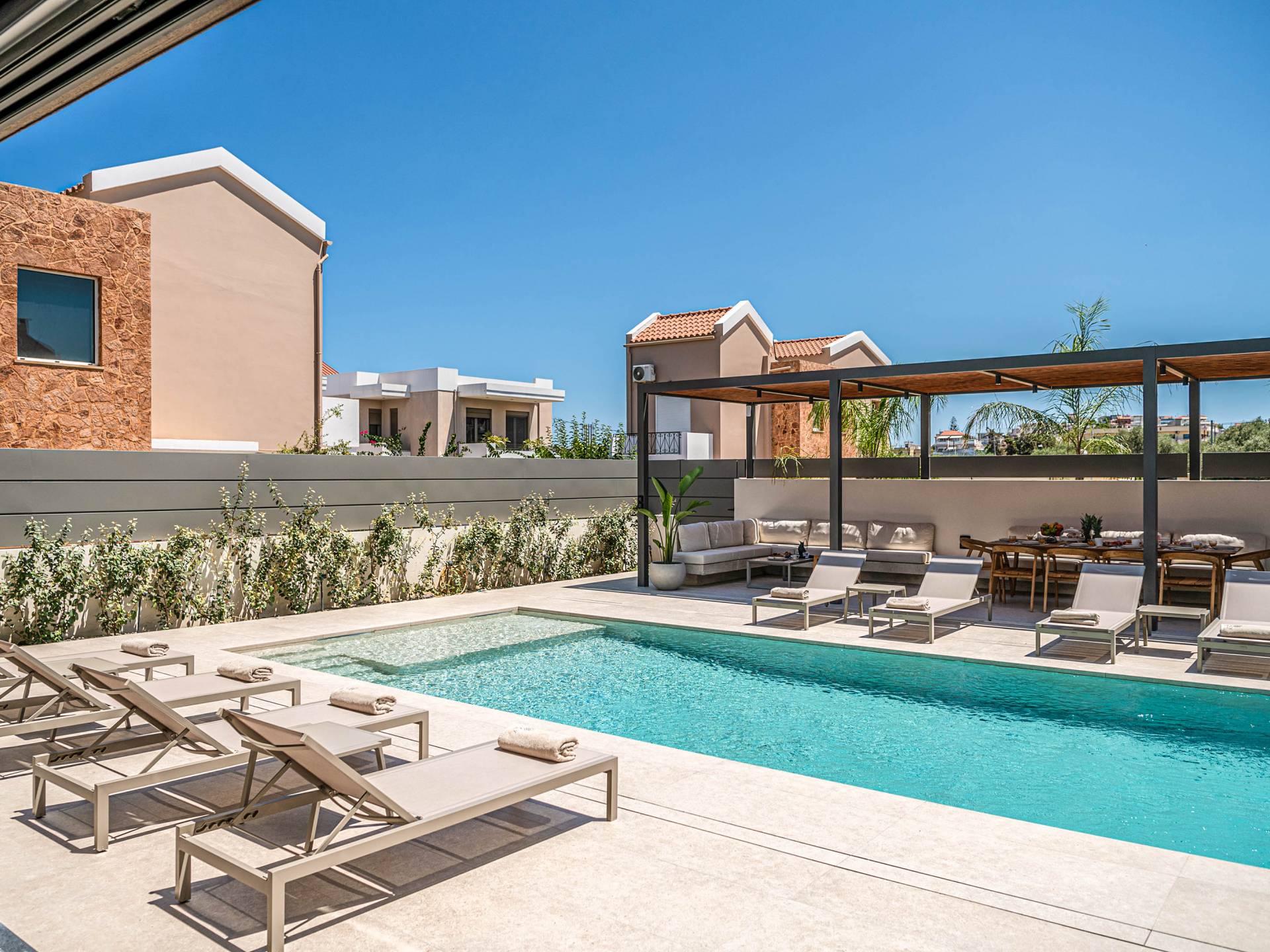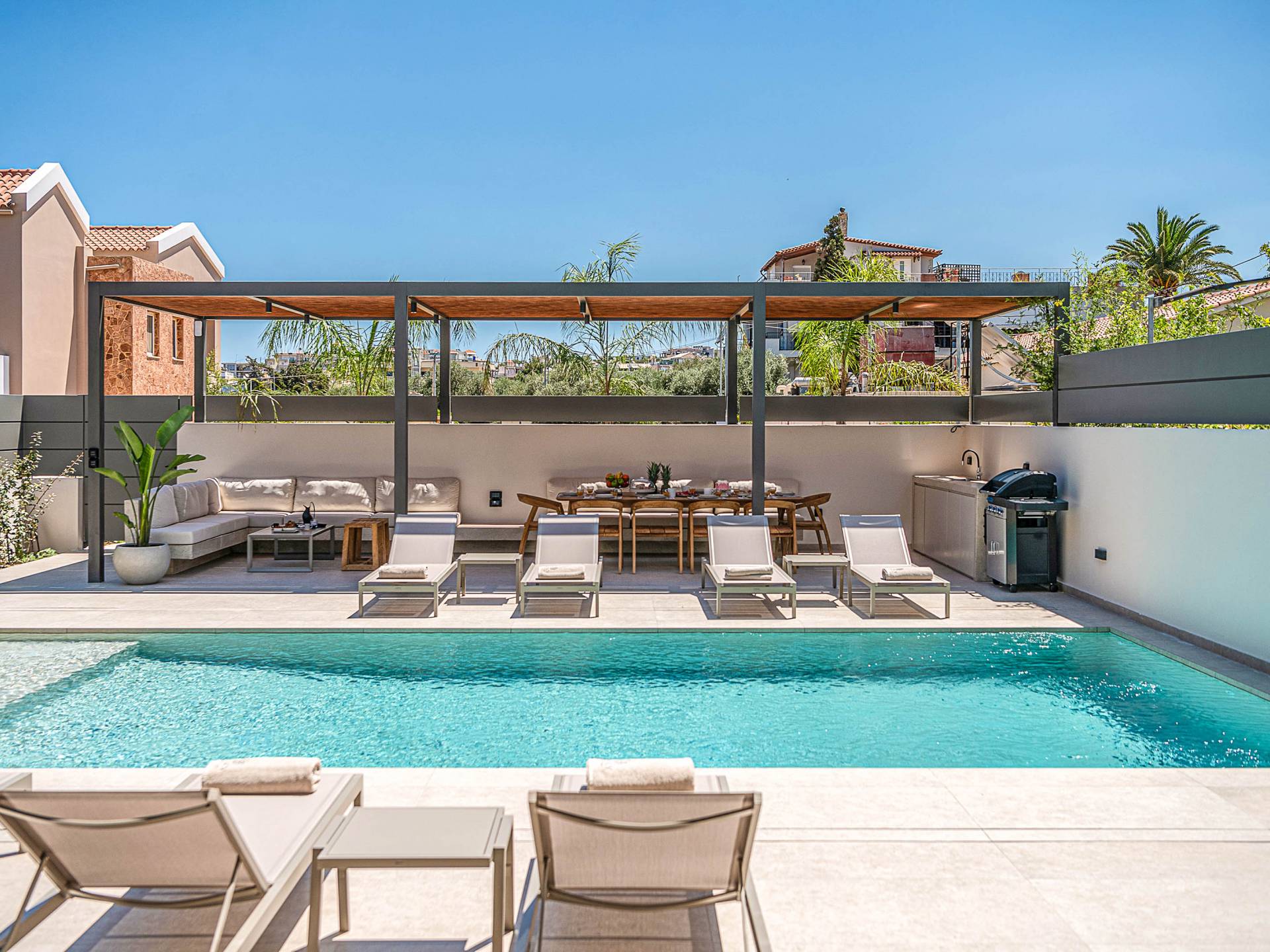 Gibt es für Sie im Sommerurlaub einen besseren Ort, als am Pool zu liegen und sich zu bräunen? Der beheizte Außenpool und der Loungebereich sind die Orte, an denen Sie einen Cocktail genießen oder entspannen können, während Sie auf den Sonnenliegen den wunderschönen Sonnenuntergang betrachten. Ein Esstisch mit 12 Stühlen unter einer Pergola und eine gemütliche Lounge auf der Terrasse, wo Sie grillen können, und die Sonnenliegen schaffen die perfekte Kulisse, um die kretische Sonne zu genießen. Ihre Kinder können den Tag draußen verbringen und im Kinderbecken spielen, während Sie eine schöne Zeit mit Ihren Lieben verbringen können. Vergessen Sie nicht, dass außerhalb der Villa ein sicherer Parkplatz vorhanden ist.