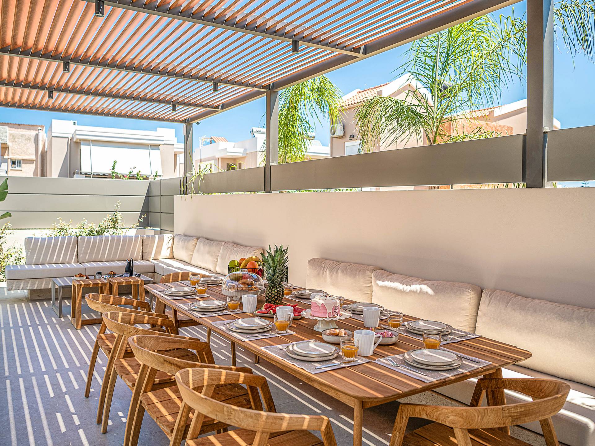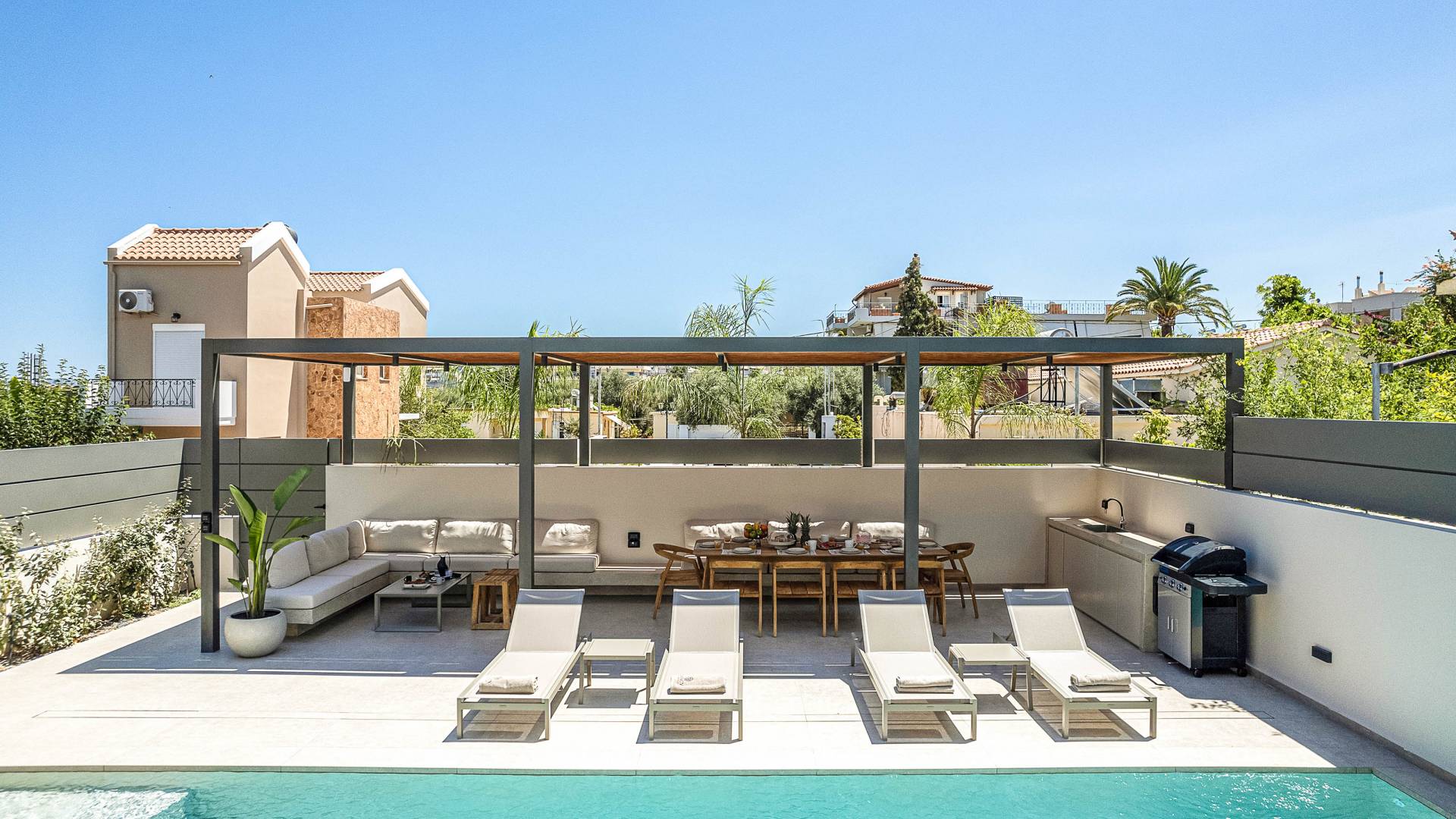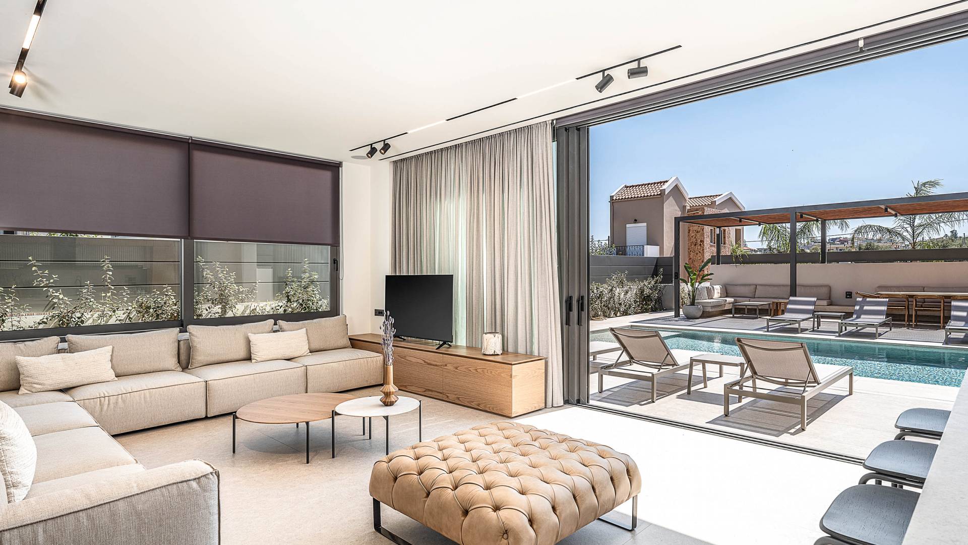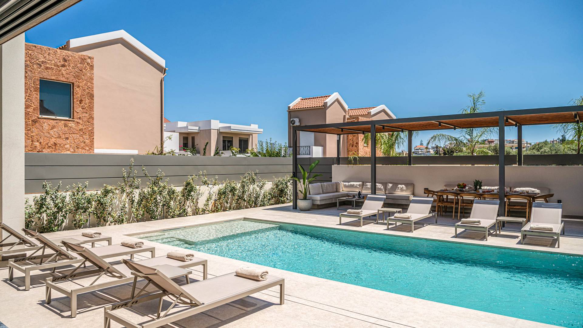 Gibt es für Sie im Sommerurlaub einen besseren Ort, als am Pool zu liegen und sich zu bräunen? Der beheizte Außenpool und der Loungebereich sind die Orte, an denen Sie einen Cocktail genießen oder entspannen können, während Sie auf den Sonnenliegen den wunderschönen Sonnenuntergang betrachten. Ein Esstisch mit 12 Stühlen unter einer Pergola und eine gemütliche Lounge auf der Terrasse, wo Sie grillen können, und die Sonnenliegen schaffen die perfekte Kulisse, um die kretische Sonne zu genießen. Ihre Kinder können den Tag draußen verbringen und im Kinderbecken spielen, während Sie eine schöne Zeit mit Ihren Lieben verbringen können. Vergessen Sie nicht, dass außerhalb der Villa ein sicherer Parkplatz vorhanden ist.