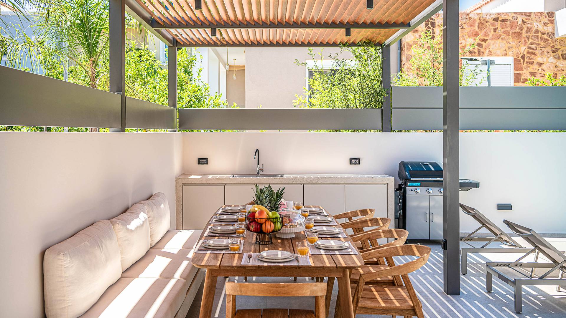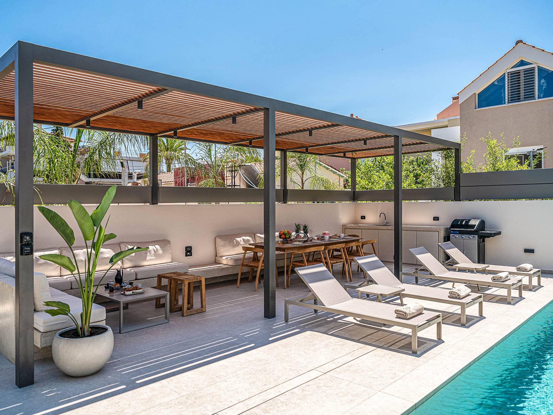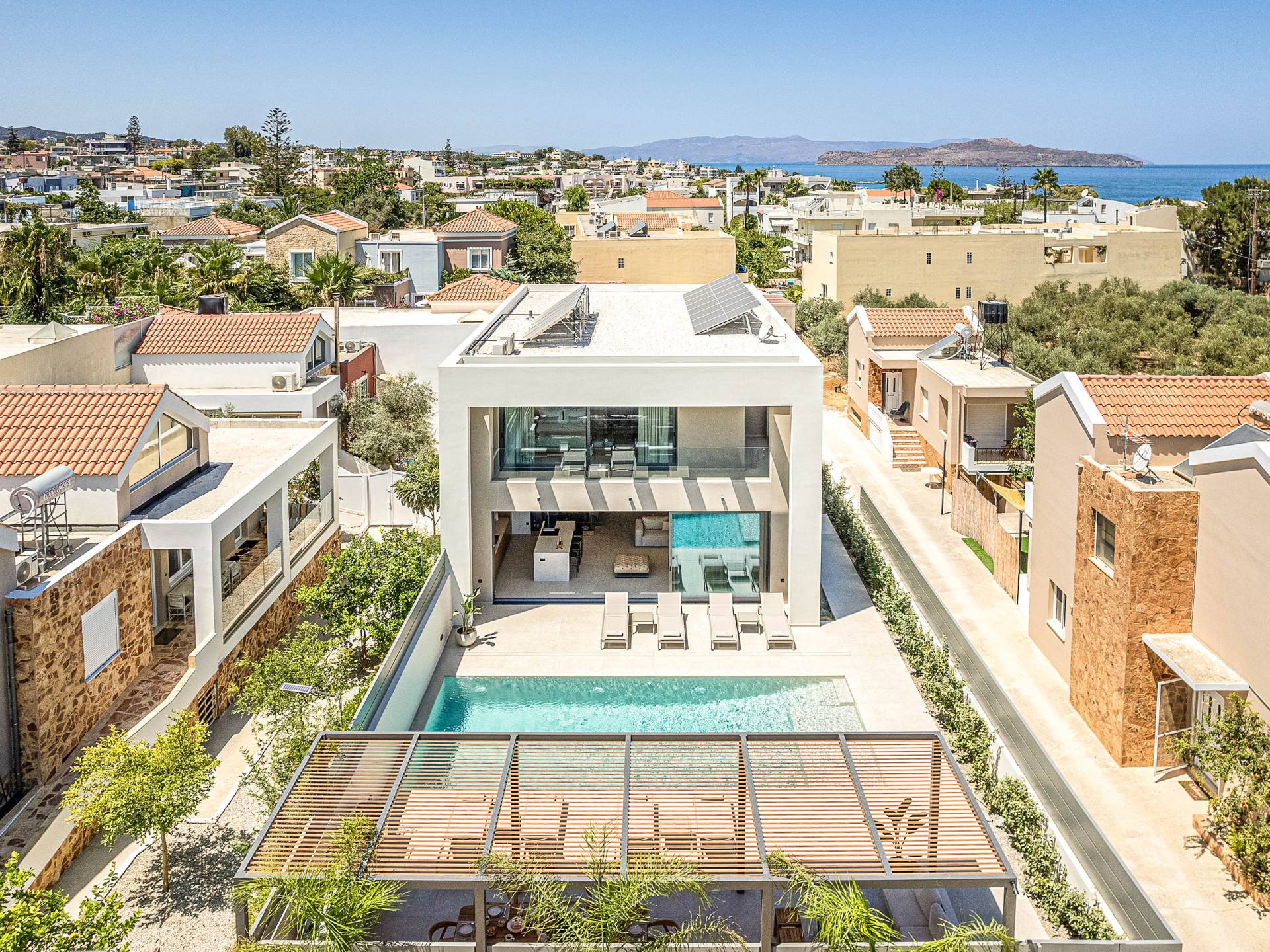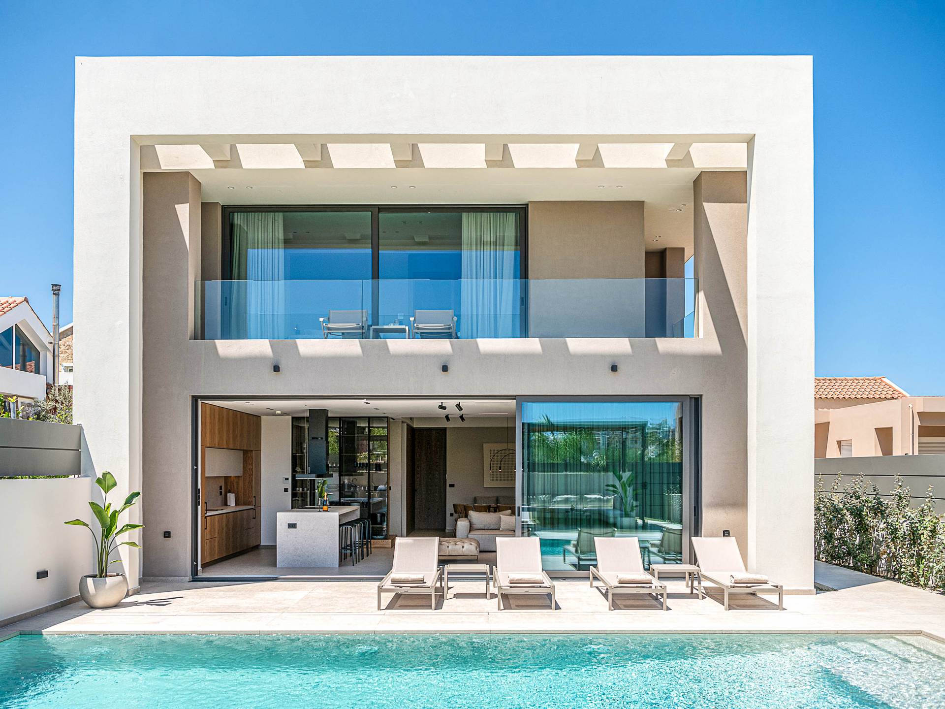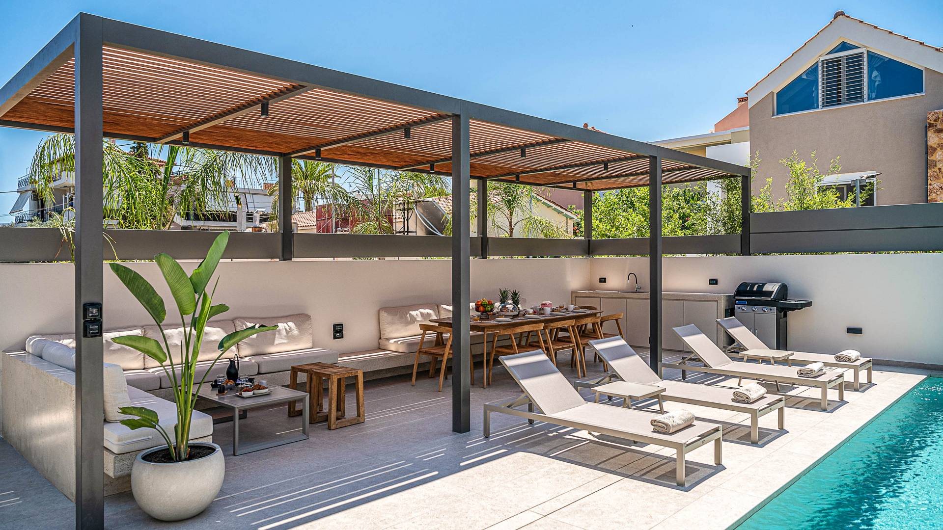 Gibt es für Sie im Sommerurlaub einen besseren Ort, als am Pool zu liegen und sich zu bräunen? Der beheizte Außenpool und der Loungebereich sind die Orte, an denen Sie einen Cocktail genießen oder entspannen können, während Sie auf den Sonnenliegen den wunderschönen Sonnenuntergang betrachten. Ein Esstisch mit 12 Stühlen unter einer Pergola und eine gemütliche Lounge auf der Terrasse, wo Sie grillen können, und die Sonnenliegen schaffen die perfekte Kulisse, um die kretische Sonne zu genießen. Ihre Kinder können den Tag draußen verbringen und im Kinderbecken spielen, während Sie eine schöne Zeit mit Ihren Lieben verbringen können. Vergessen Sie nicht, dass außerhalb der Villa ein sicherer Parkplatz vorhanden ist.
