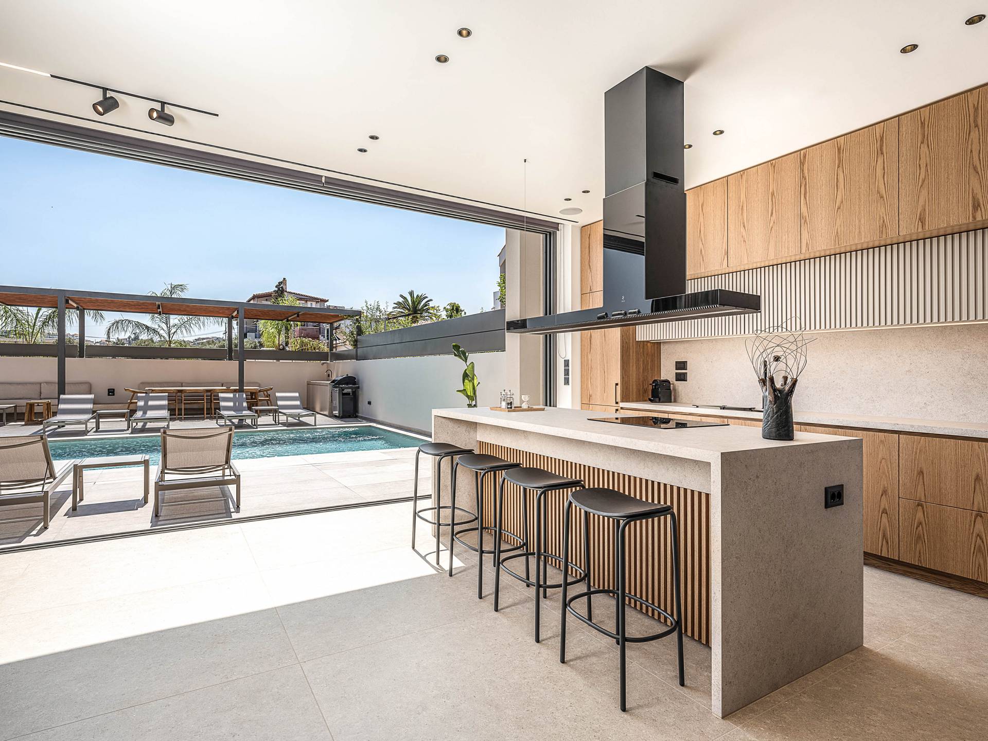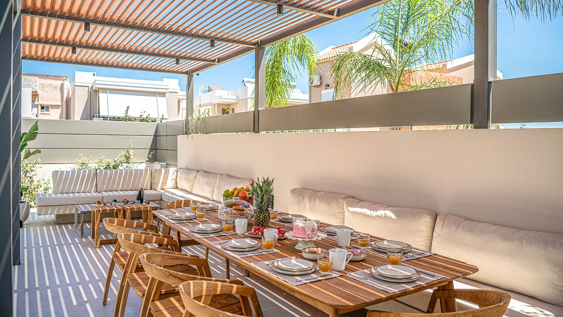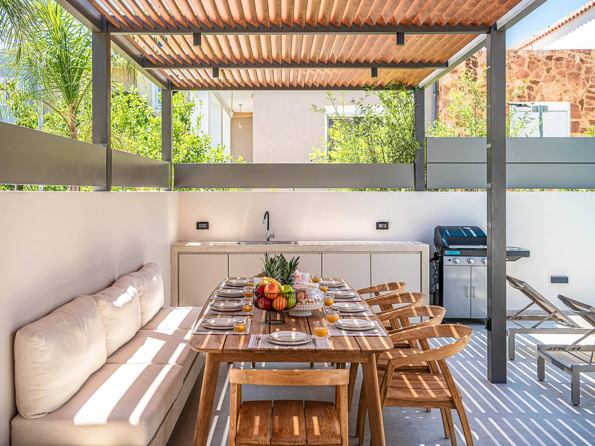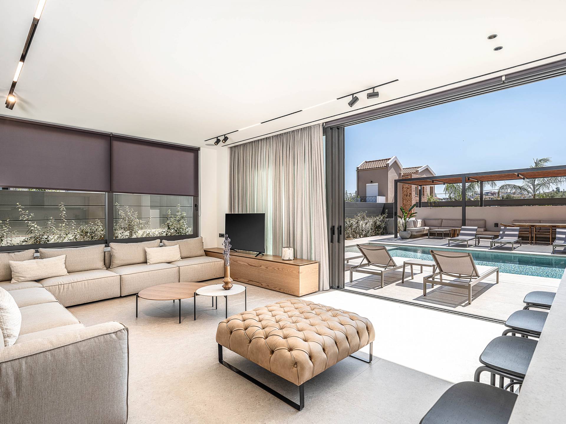 Gibt es für Sie im Sommerurlaub einen besseren Ort, als am Pool zu liegen und sich zu bräunen? Der beheizte Außenpool und der Loungebereich sind die Orte, an denen Sie einen Cocktail genießen oder entspannen können, während Sie auf den Sonnenliegen den wunderschönen Sonnenuntergang betrachten. Ein Esstisch mit 12 Stühlen unter einer Pergola und eine gemütliche Lounge auf der Terrasse, wo Sie grillen können, und die Sonnenliegen schaffen die perfekte Kulisse, um die kretische Sonne zu genießen. Ihre Kinder können den Tag draußen verbringen und im Kinderbecken spielen, während Sie eine schöne Zeit mit Ihren Lieben verbringen können. Vergessen Sie nicht, dass außerhalb der Villa ein sicherer Parkplatz vorhanden ist.