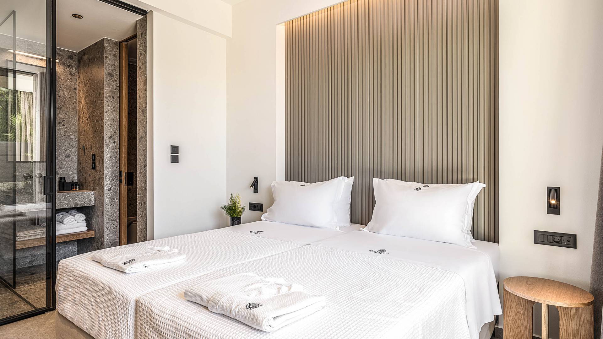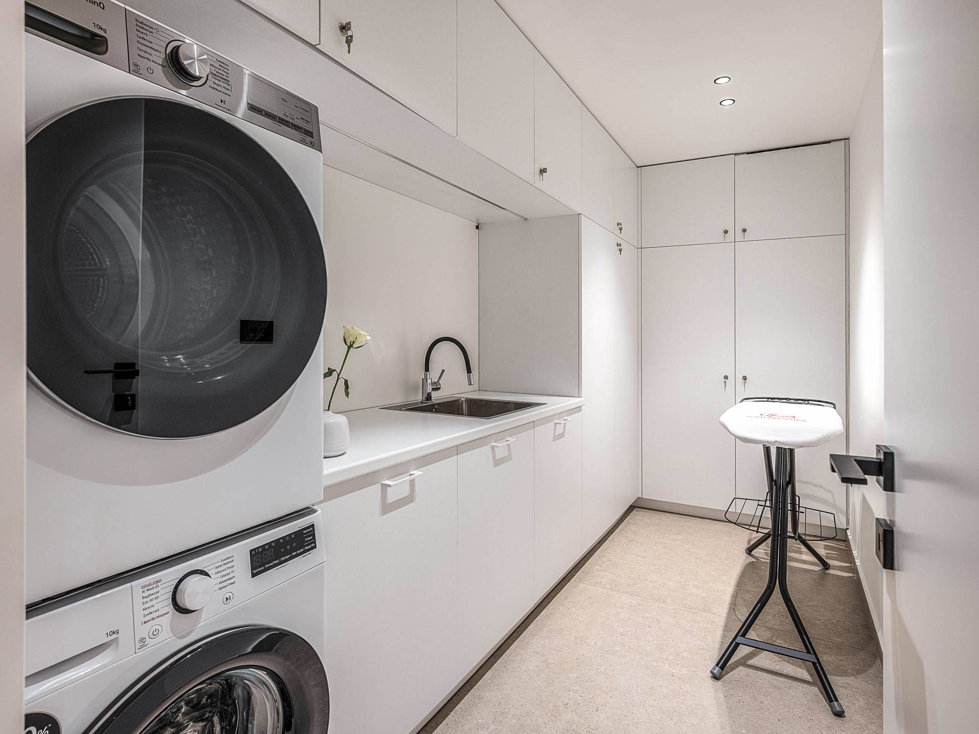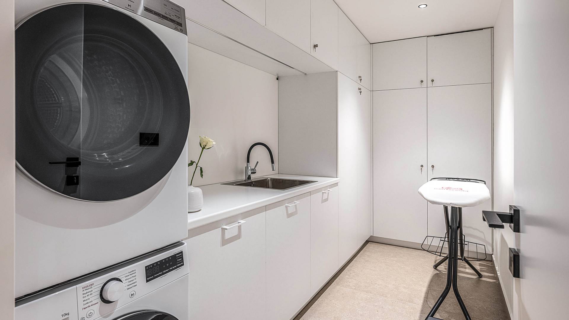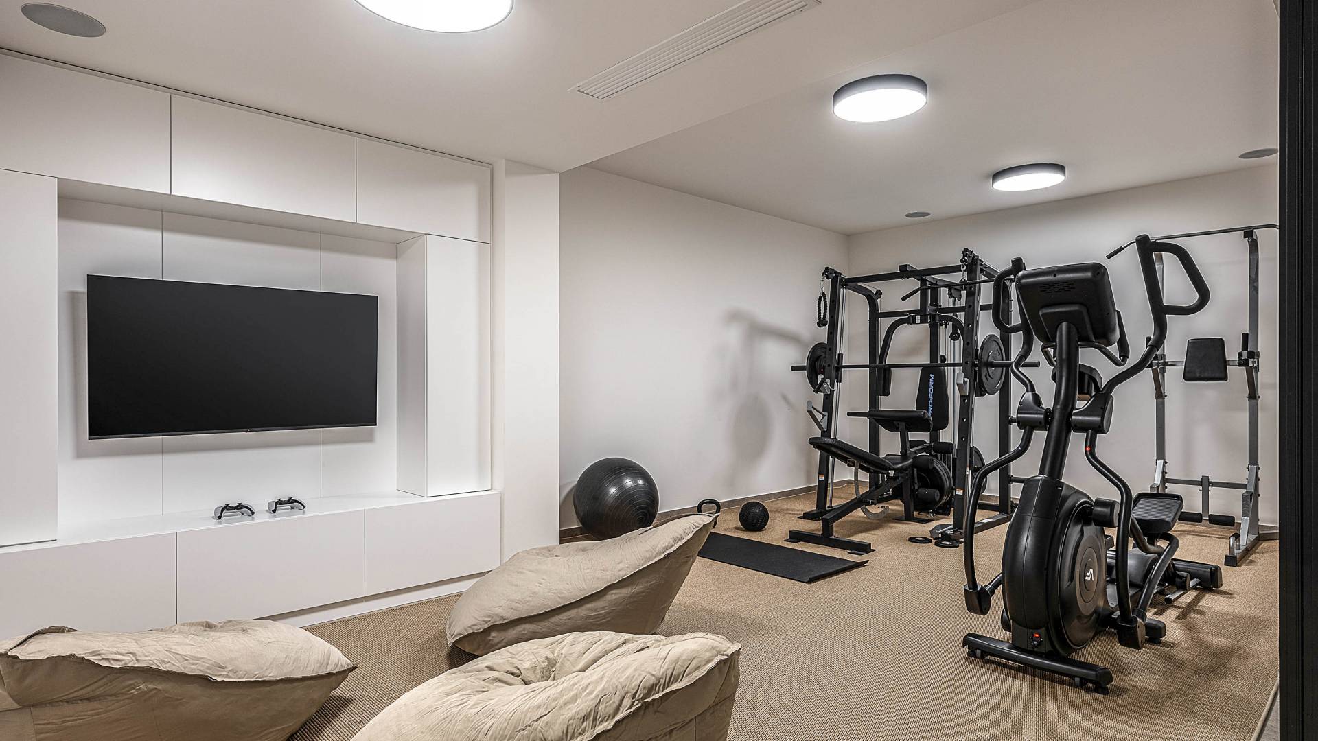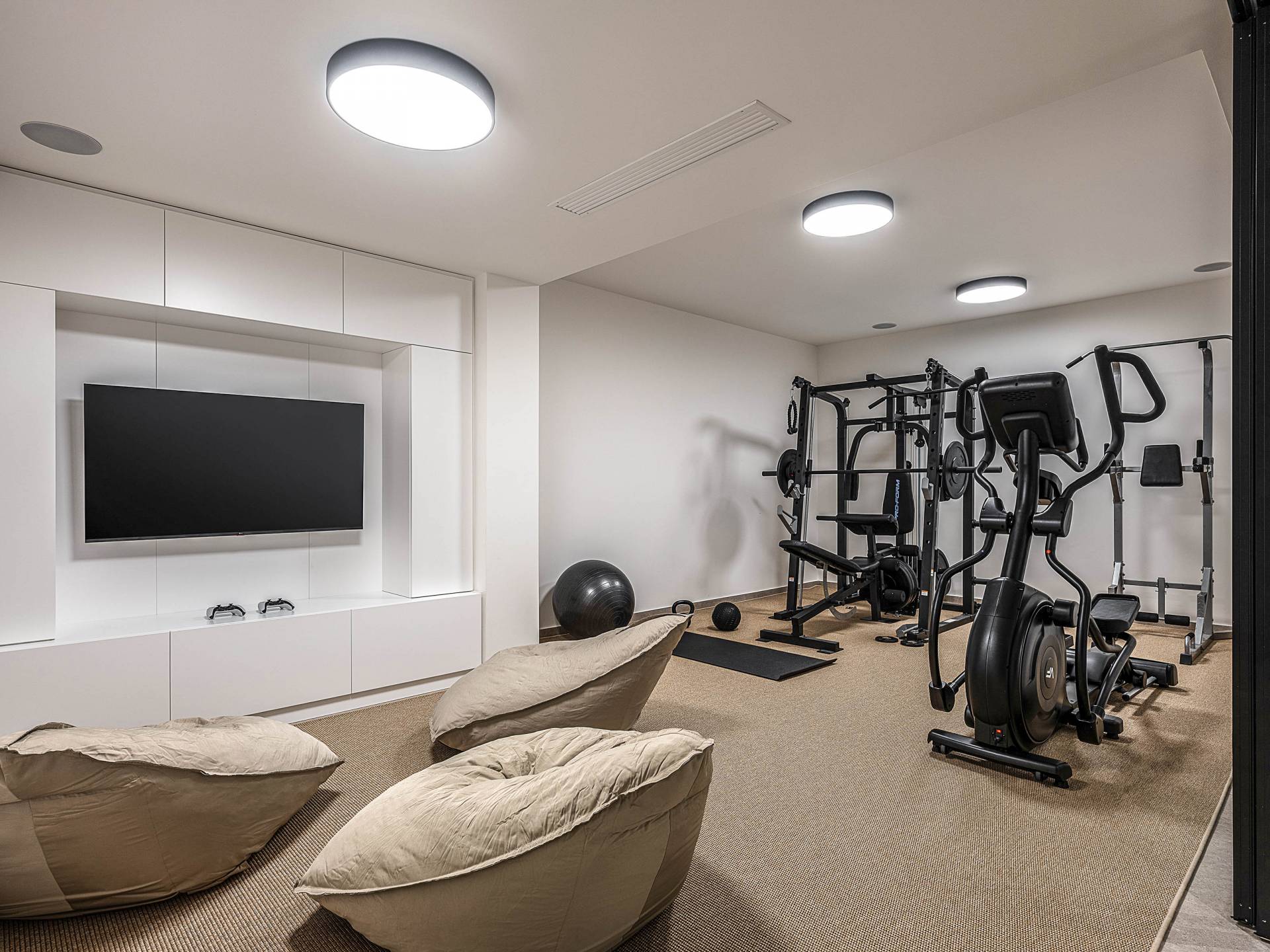 Auf der unteren Ebene gibt es ein weiteres Schlafzimmer mit Dusche und Doppelbett. Auf derselben Etage befindet sich ein Fitnessstudio mit allen notwendigen Geräten, um Sie im Urlaub fit zu halten. Darüber hinaus gibt es ein Spielzimmer mit einer PlayStation 5-Konsole, in dem Ihre Kinder die Spiele genießen können, während Sie den Creta-Himmel voller Sterne genießen. Die minimalistische Einrichtung des Hauses, die neutrale Farbpalette und die Verwendung von Holz schaffen den perfekten Rückzugsort für Sie, um sich vom hektischen Alltag zu erholen und zu entspannen. Jedes kleine Detail in dieser Residenz wurde speziell ausgewählt und gestaltet, um unseren Gästen eine sehr freundliche, aber gleichzeitig komfortable und luxuriöse Umgebung zu bieten.