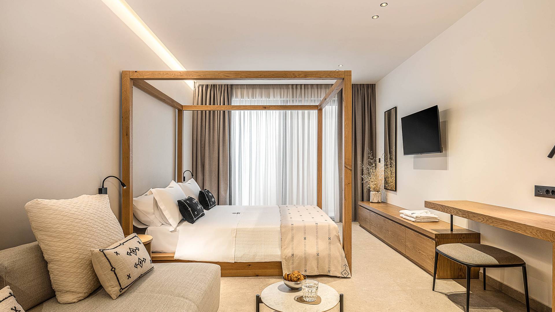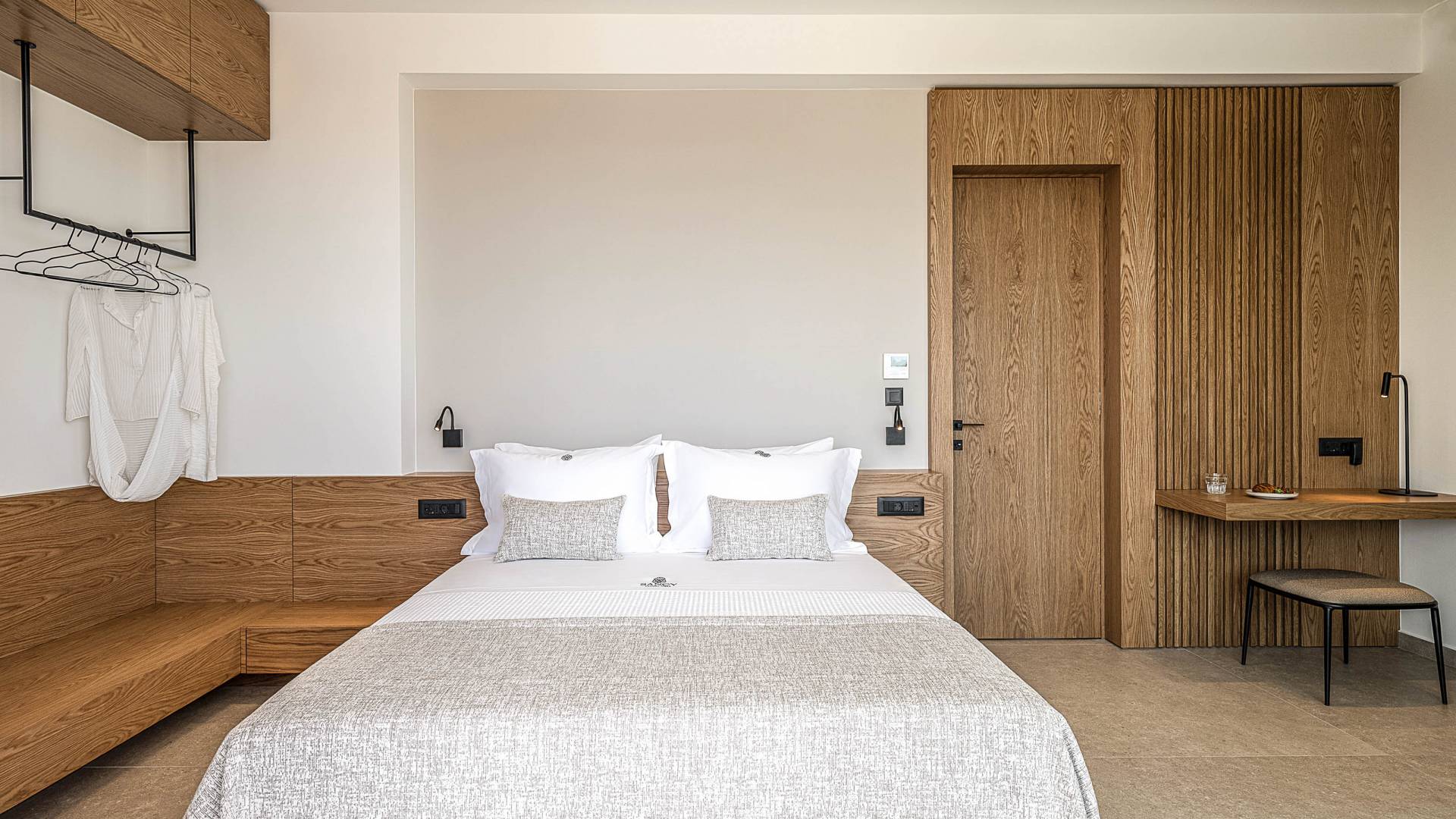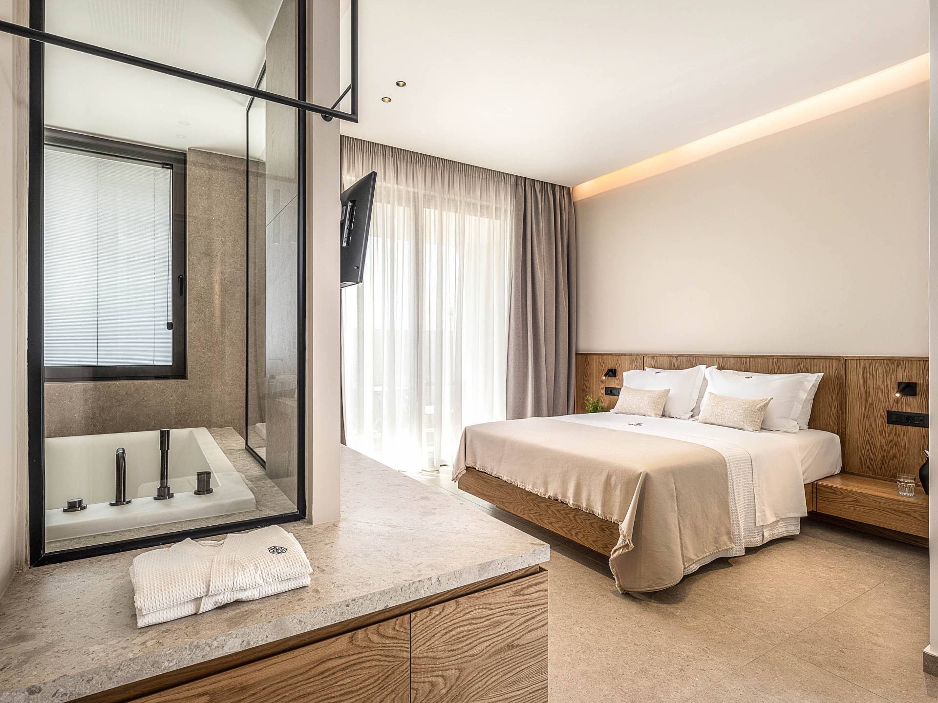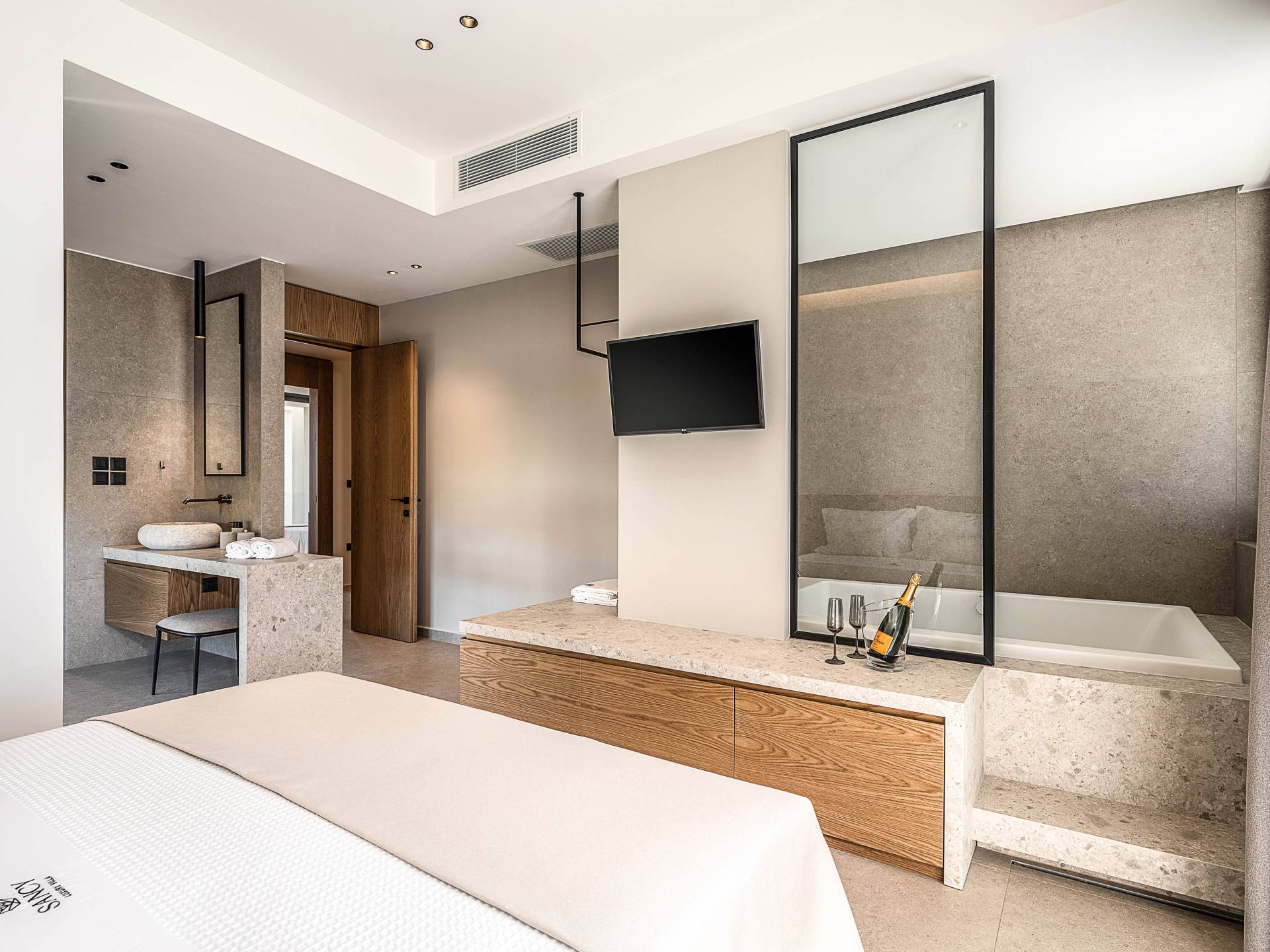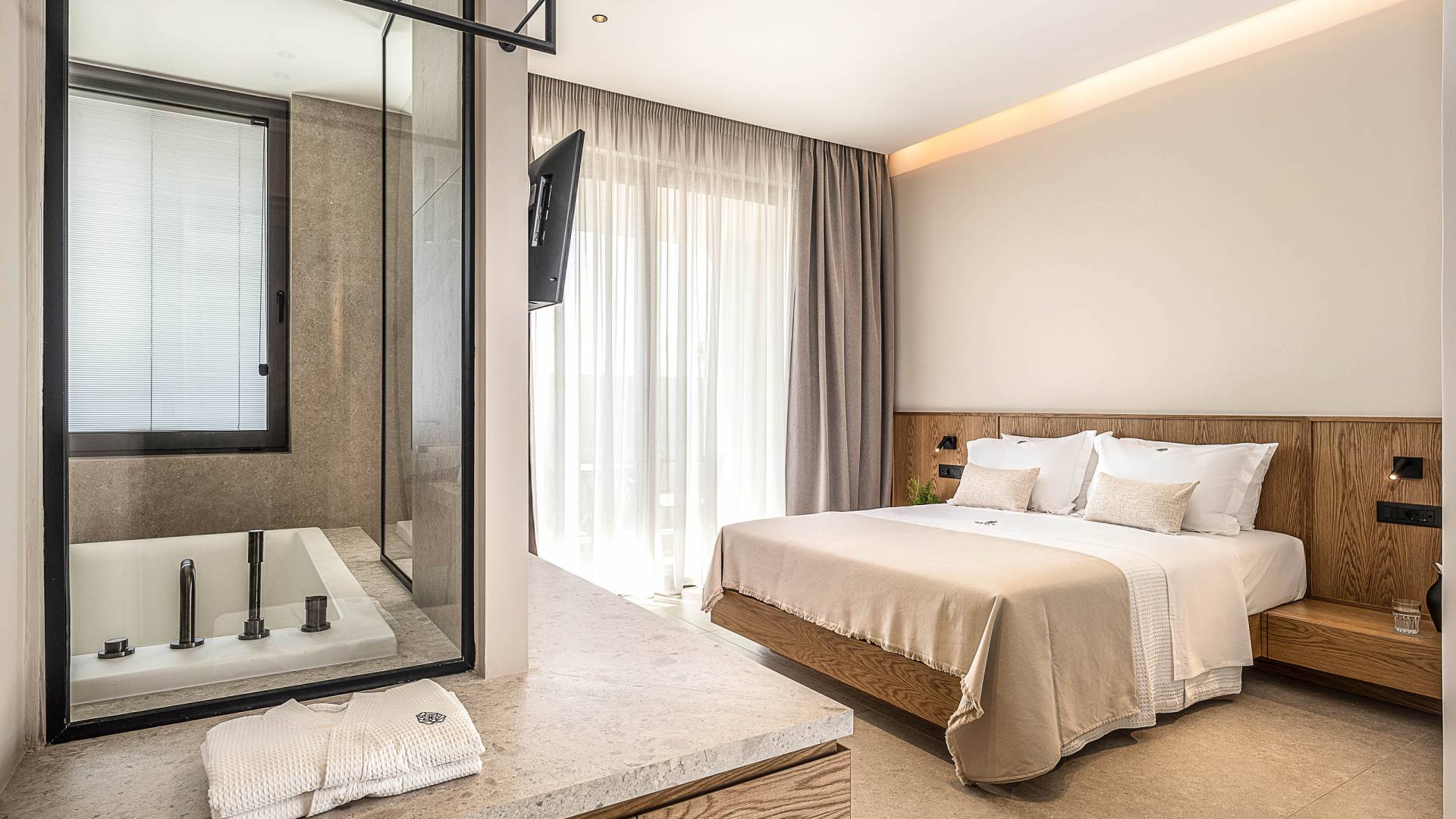 Auf der unteren Ebene gibt es ein weiteres Schlafzimmer mit Dusche und Doppelbett. Auf derselben Etage befindet sich ein Fitnessstudio mit allen notwendigen Geräten, um Sie im Urlaub fit zu halten. Darüber hinaus gibt es ein Spielzimmer mit einer PlayStation 5-Konsole, in dem Ihre Kinder die Spiele genießen können, während Sie den Creta-Himmel voller Sterne genießen. Die minimalistische Einrichtung des Hauses, die neutrale Farbpalette und die Verwendung von Holz schaffen den perfekten Rückzugsort für Sie, um sich vom hektischen Alltag zu erholen und zu entspannen. Jedes kleine Detail in dieser Residenz wurde speziell ausgewählt und gestaltet, um unseren Gästen eine sehr freundliche, aber gleichzeitig komfortable und luxuriöse Umgebung zu bieten.