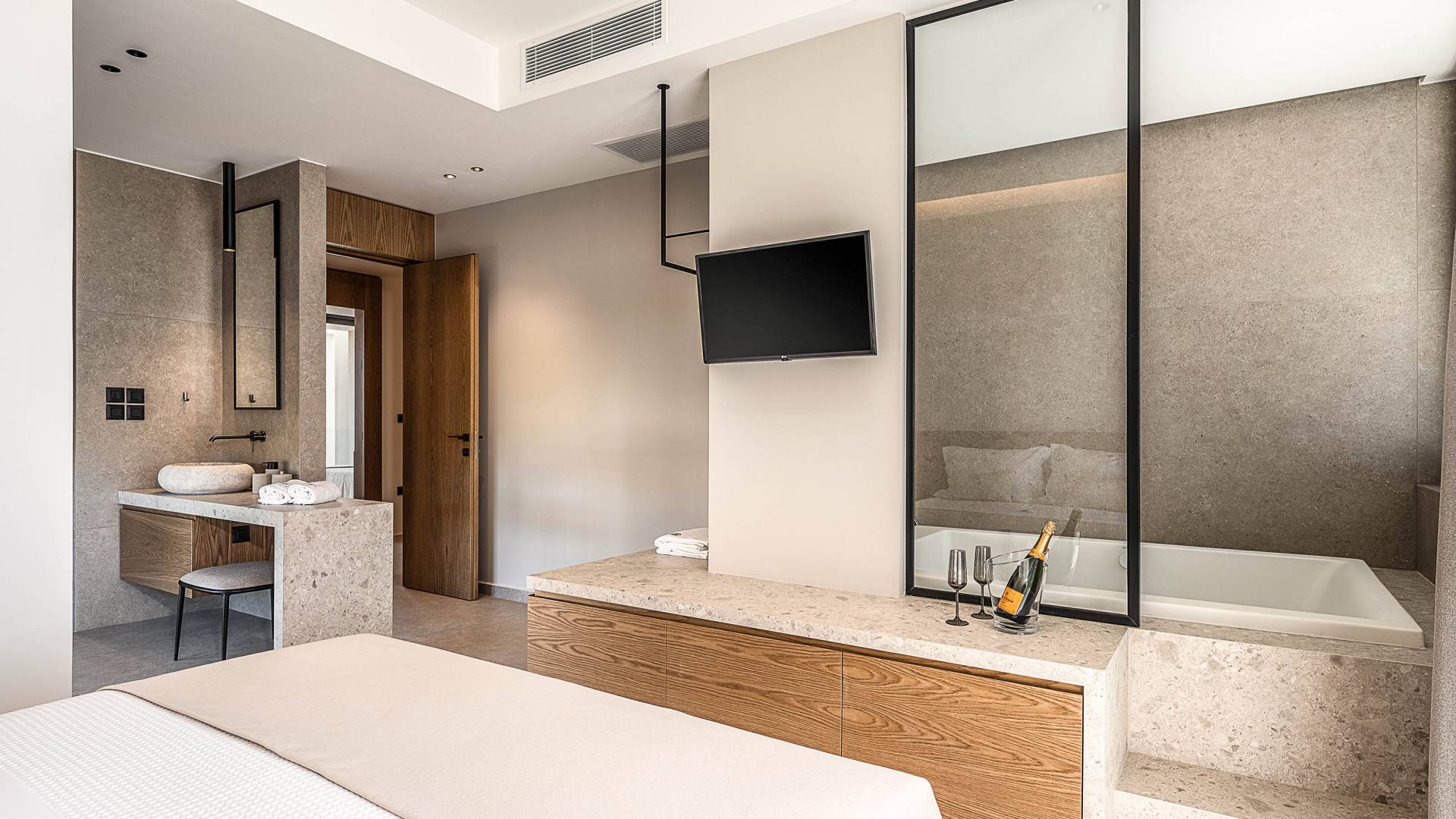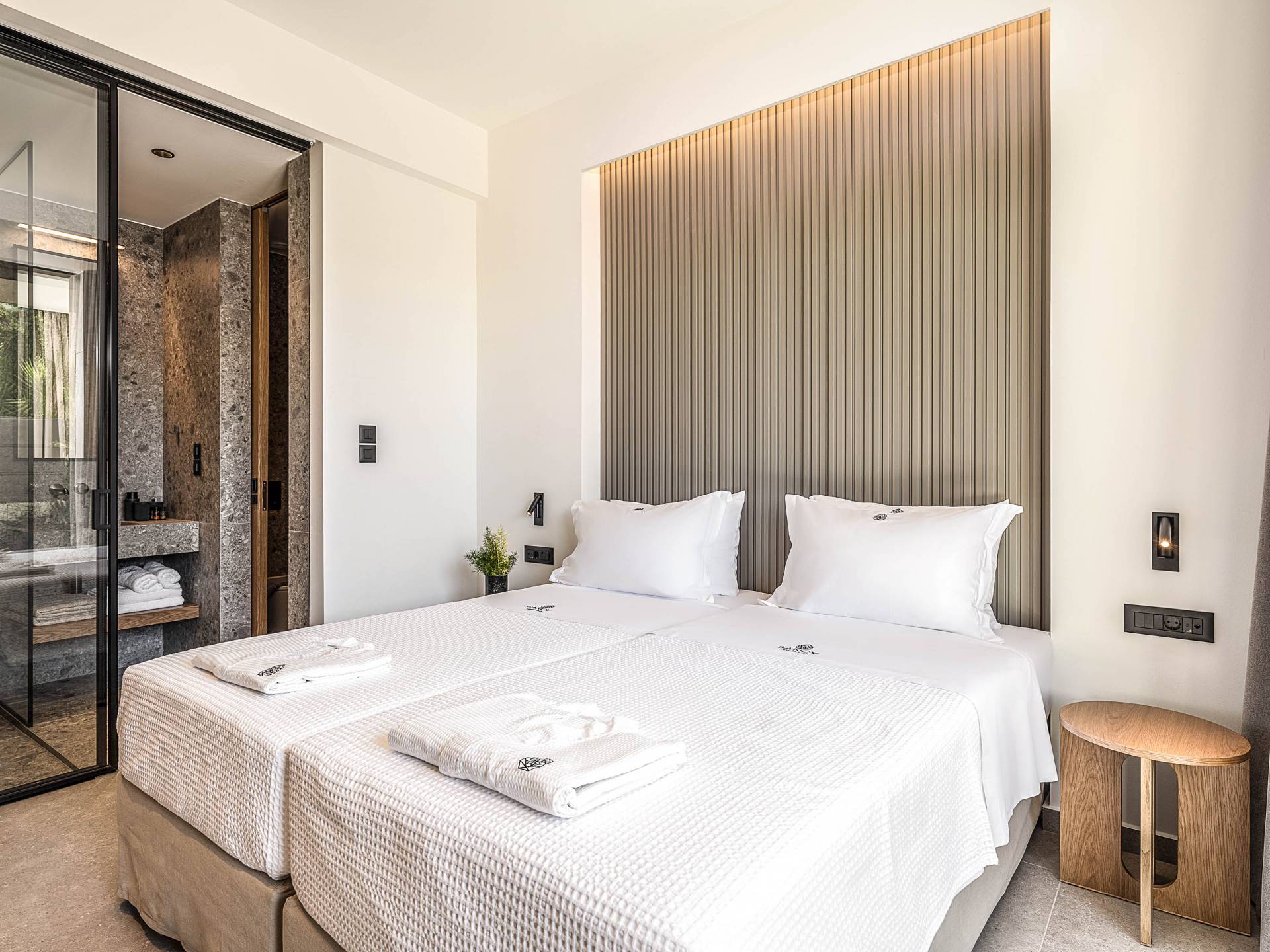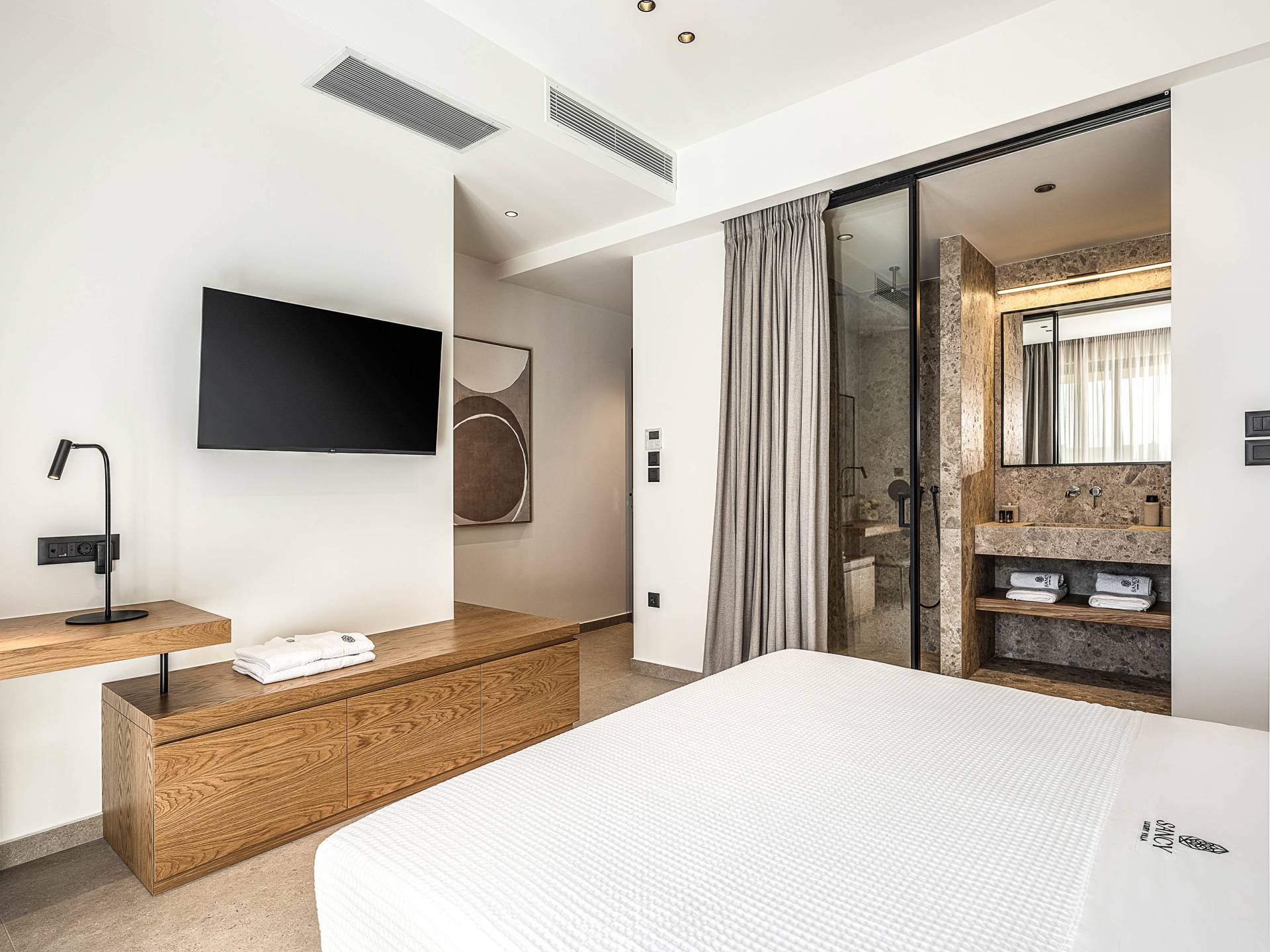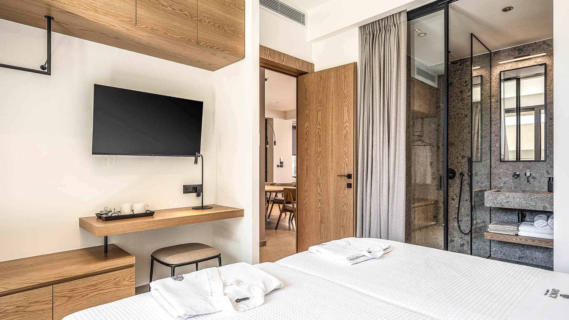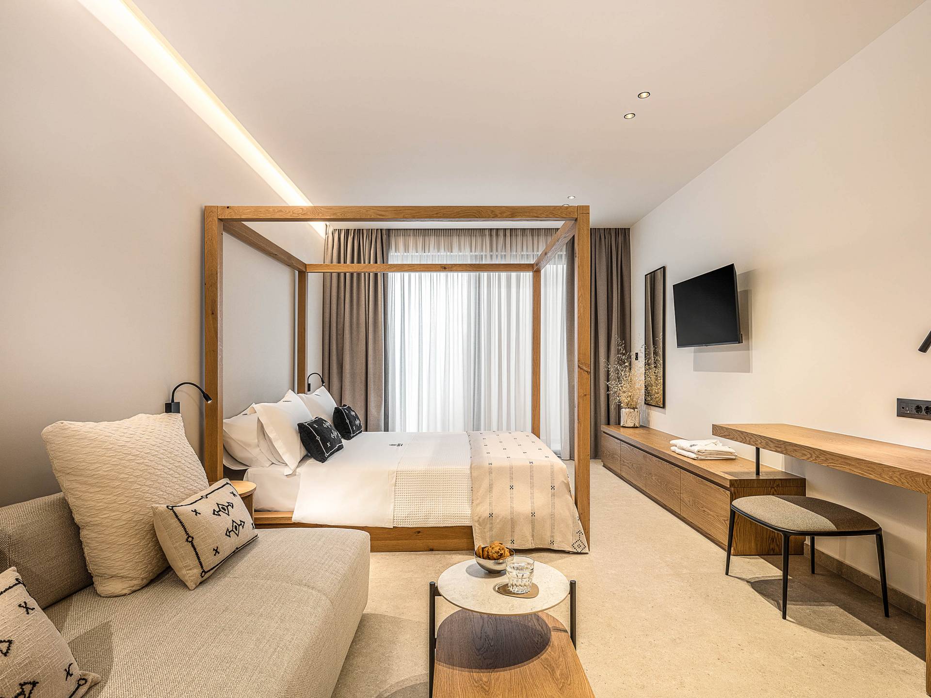Auf der unteren Ebene gibt es ein weiteres Schlafzimmer mit Dusche und Doppelbett. Auf derselben Etage befindet sich ein Fitnessstudio mit allen notwendigen Geräten, um Sie im Urlaub fit zu halten. Darüber hinaus gibt es ein Spielzimmer mit einer PlayStation 5-Konsole, in dem Ihre Kinder die Spiele genießen können, während Sie den Creta-Himmel voller Sterne genießen. Die minimalistische Einrichtung des Hauses, die neutrale Farbpalette und die Verwendung von Holz schaffen den perfekten Rückzugsort für Sie, um sich vom hektischen Alltag zu erholen und zu entspannen. Jedes kleine Detail in dieser Residenz wurde speziell ausgewählt und gestaltet, um unseren Gästen eine sehr freundliche, aber gleichzeitig komfortable und luxuriöse Umgebung zu bieten.