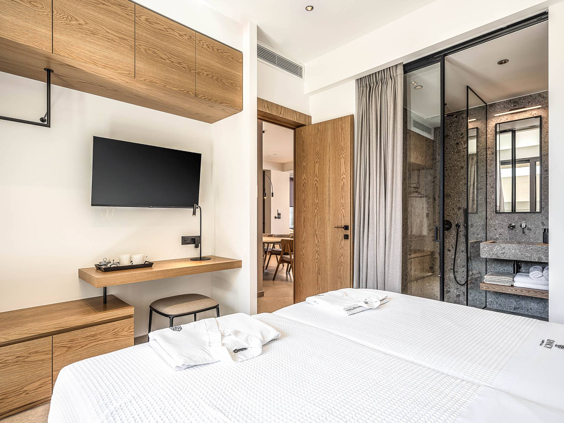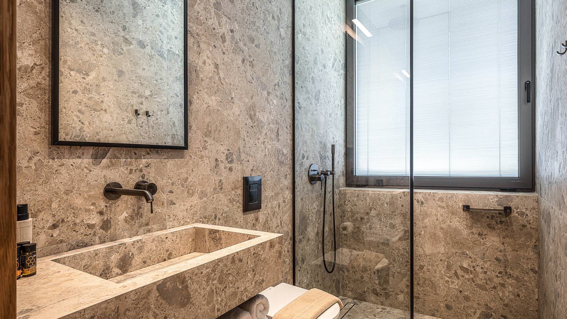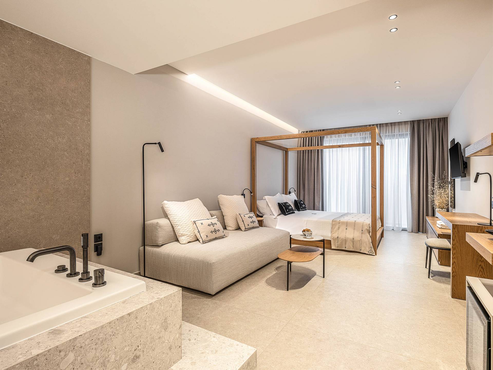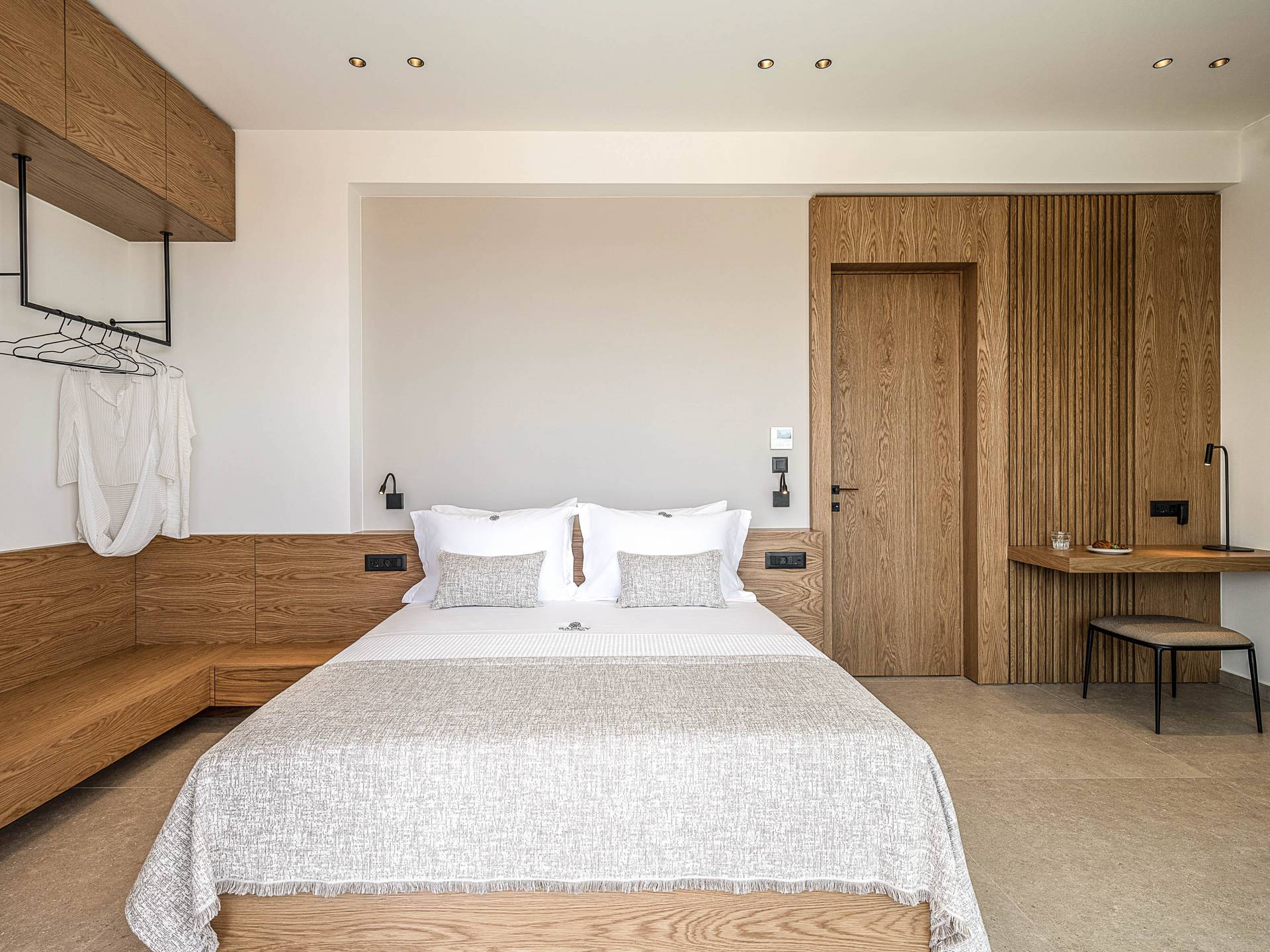 Auf der unteren Ebene gibt es ein weiteres Schlafzimmer mit Dusche und Doppelbett. Auf derselben Etage befindet sich ein Fitnessstudio mit allen notwendigen Geräten, um Sie im Urlaub fit zu halten. Darüber hinaus gibt es ein Spielzimmer mit einer PlayStation 5-Konsole, in dem Ihre Kinder die Spiele genießen können, während Sie den Creta-Himmel voller Sterne genießen. Die minimalistische Einrichtung des Hauses, die neutrale Farbpalette und die Verwendung von Holz schaffen den perfekten Rückzugsort für Sie, um sich vom hektischen Alltag zu erholen und zu entspannen. Jedes kleine Detail in dieser Residenz wurde speziell ausgewählt und gestaltet, um unseren Gästen eine sehr freundliche, aber gleichzeitig komfortable und luxuriöse Umgebung zu bieten.