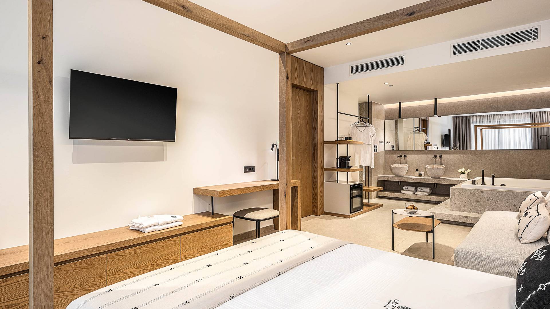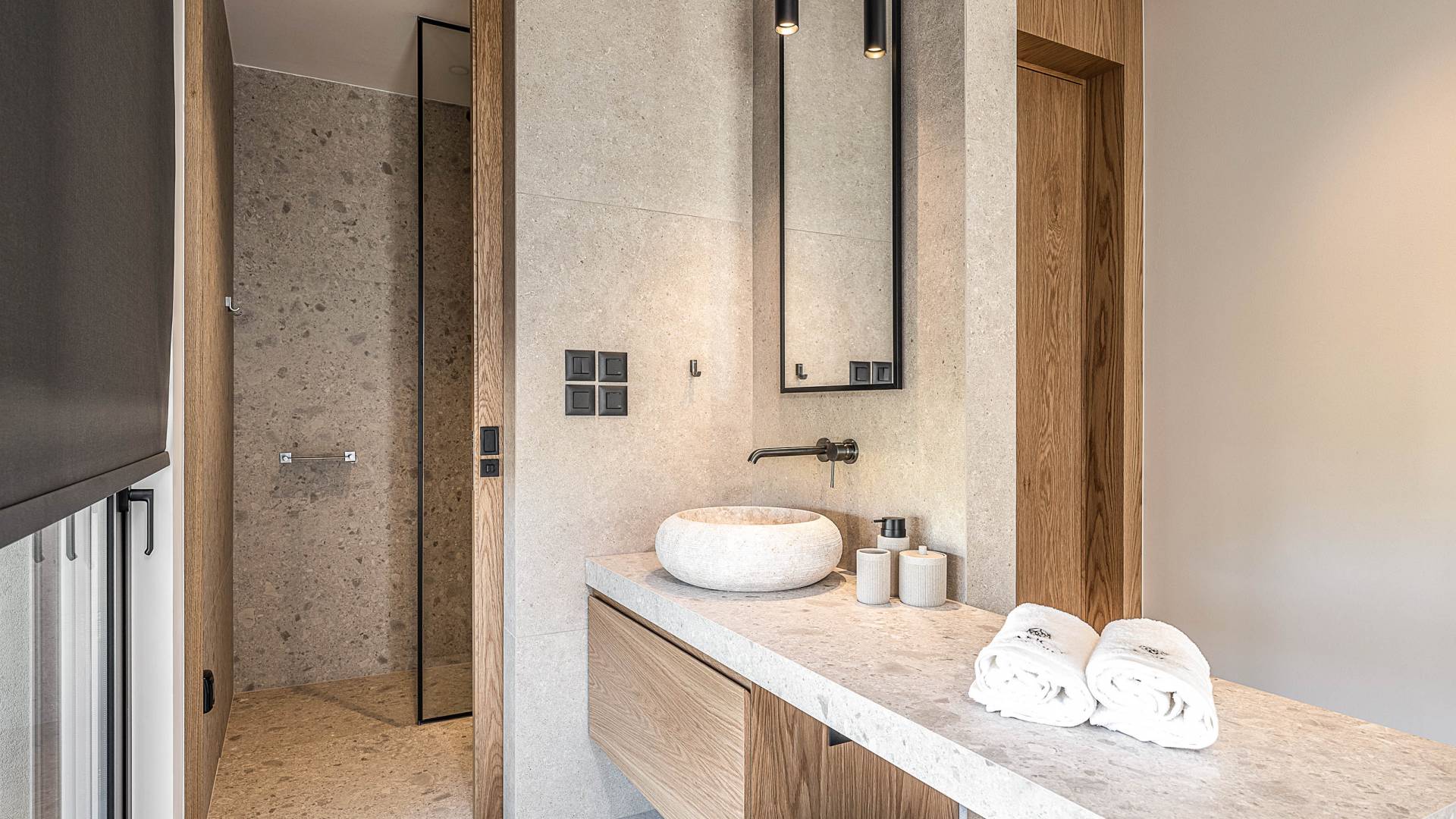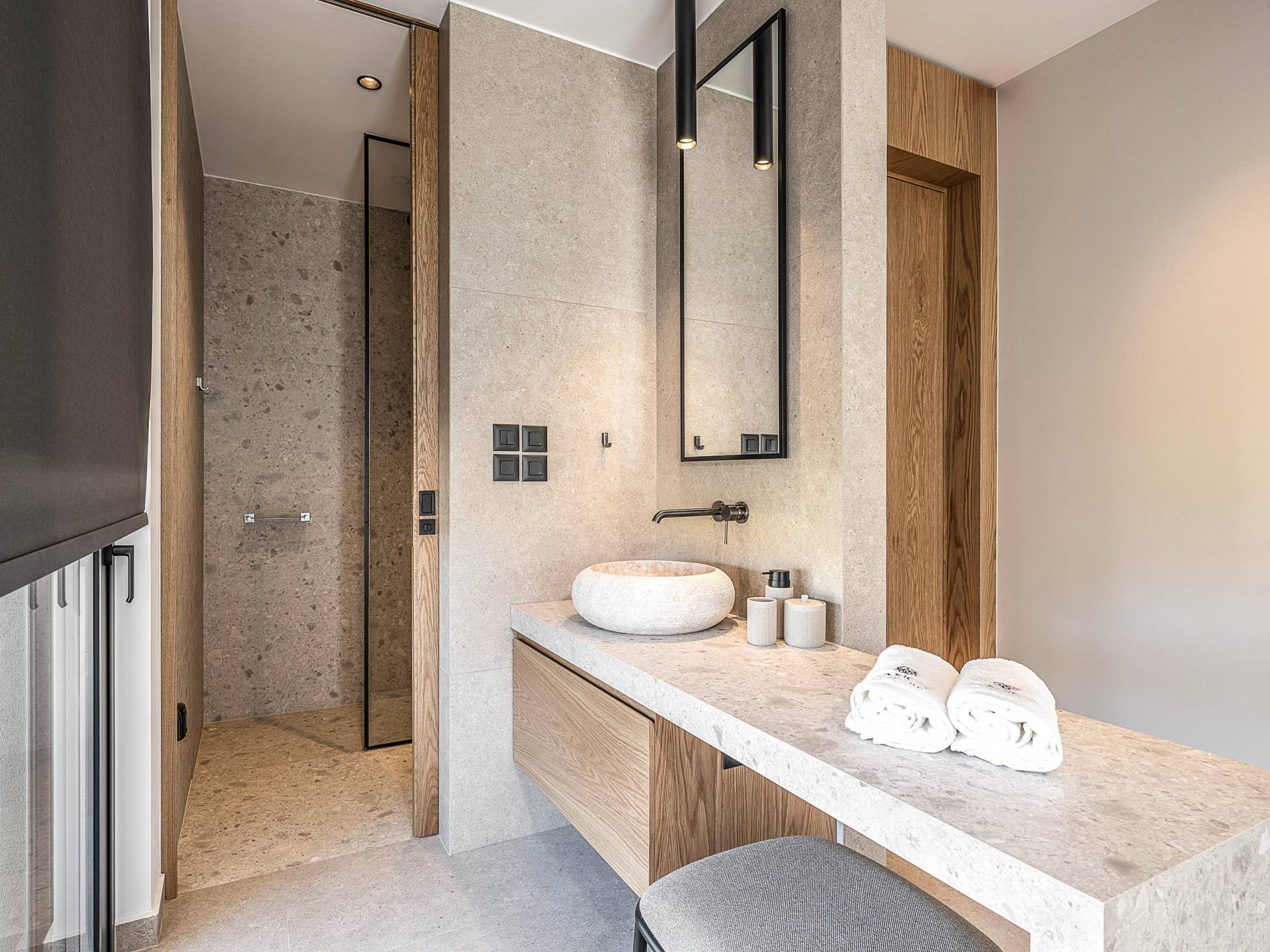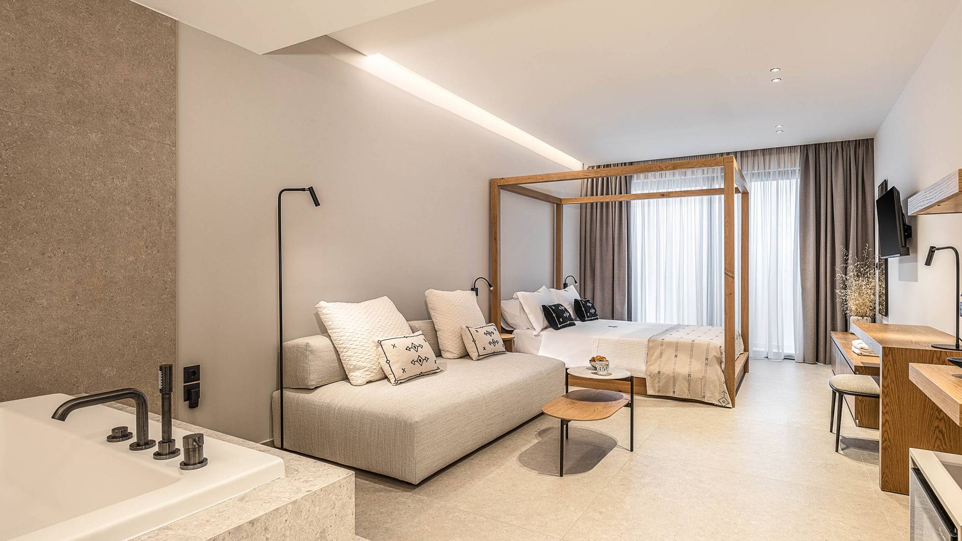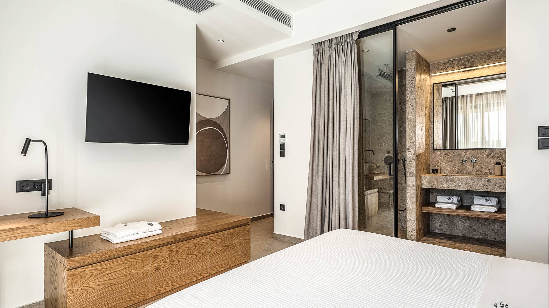 Auf der unteren Ebene gibt es ein weiteres Schlafzimmer mit Dusche und Doppelbett. Auf derselben Etage befindet sich ein Fitnessstudio mit allen notwendigen Geräten, um Sie im Urlaub fit zu halten. Darüber hinaus gibt es ein Spielzimmer mit einer PlayStation 5-Konsole, in dem Ihre Kinder die Spiele genießen können, während Sie den Creta-Himmel voller Sterne genießen. Die minimalistische Einrichtung des Hauses, die neutrale Farbpalette und die Verwendung von Holz schaffen den perfekten Rückzugsort für Sie, um sich vom hektischen Alltag zu erholen und zu entspannen. Jedes kleine Detail in dieser Residenz wurde speziell ausgewählt und gestaltet, um unseren Gästen eine sehr freundliche, aber gleichzeitig komfortable und luxuriöse Umgebung zu bieten.