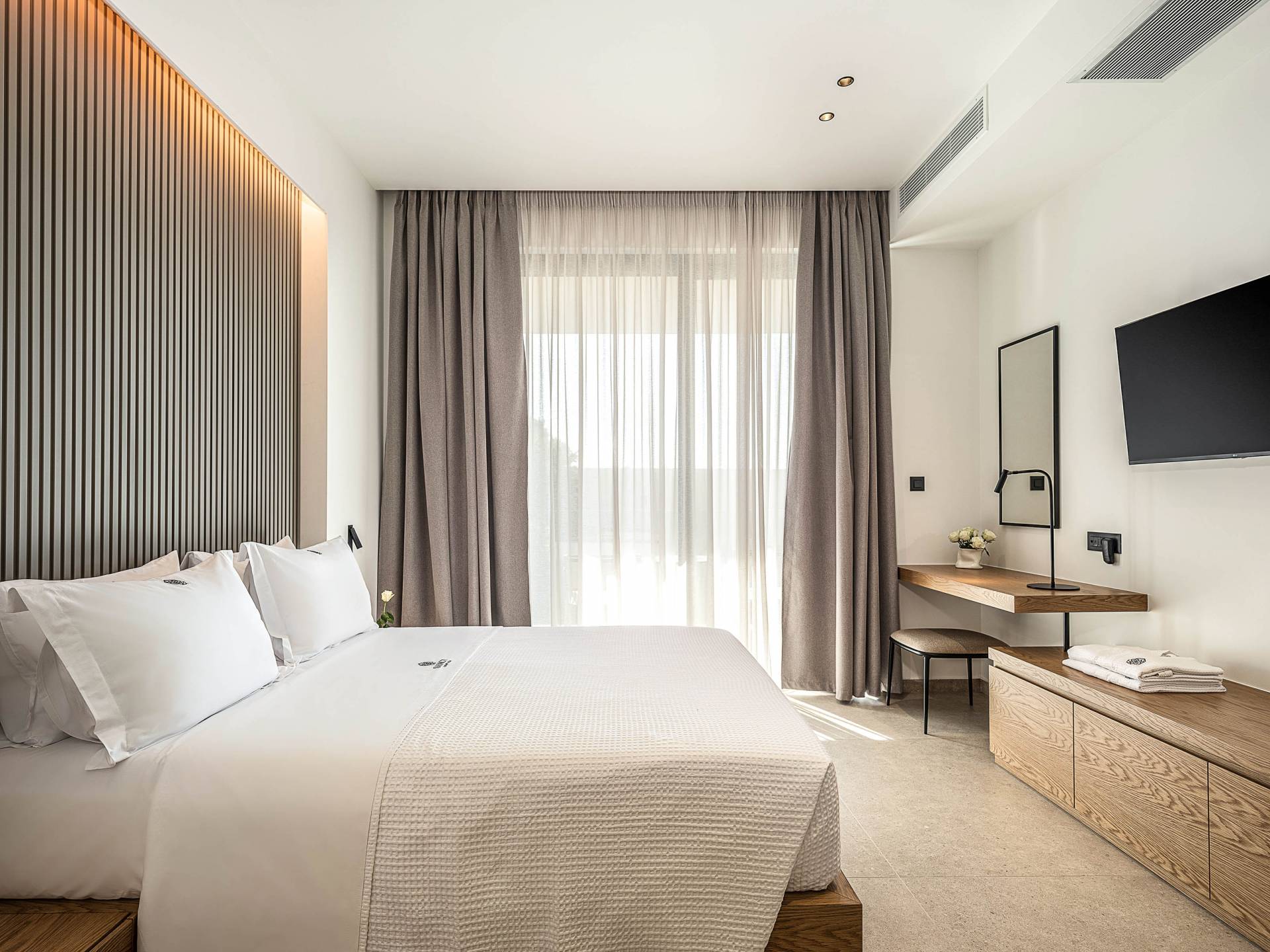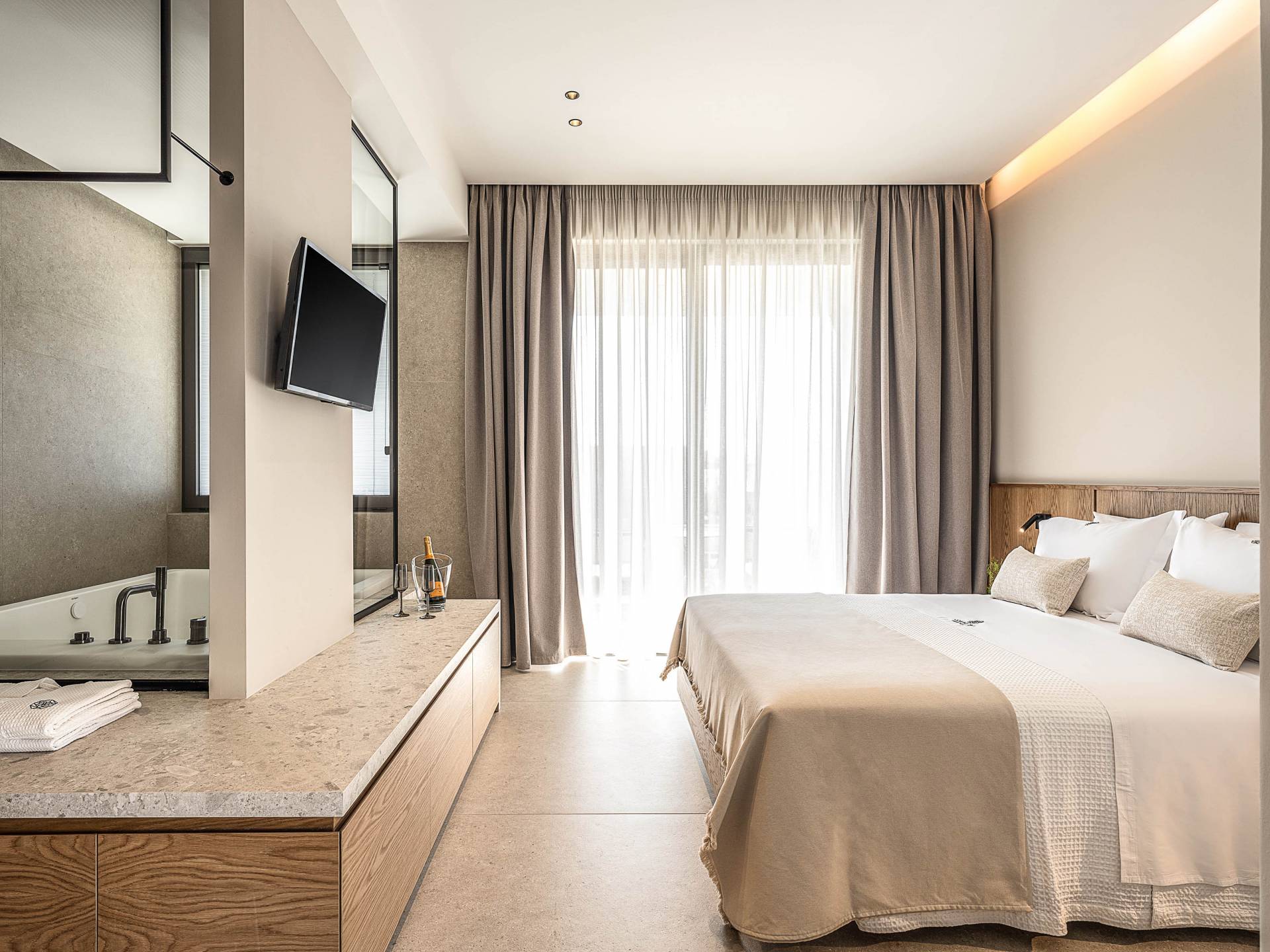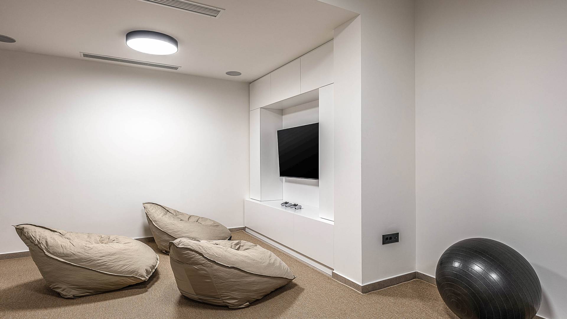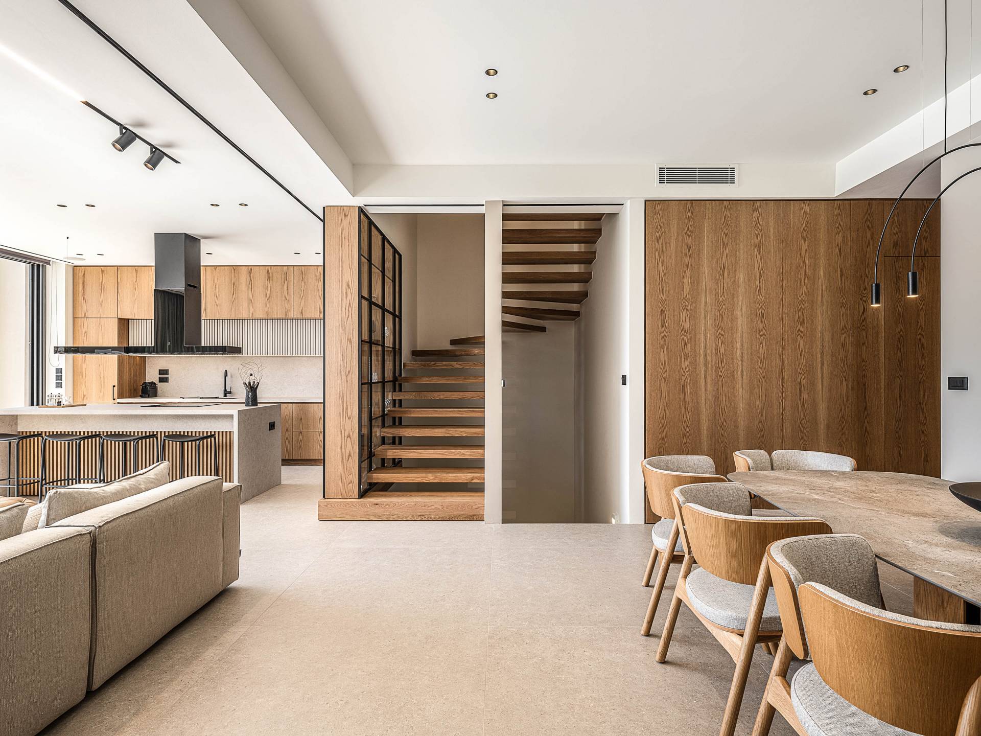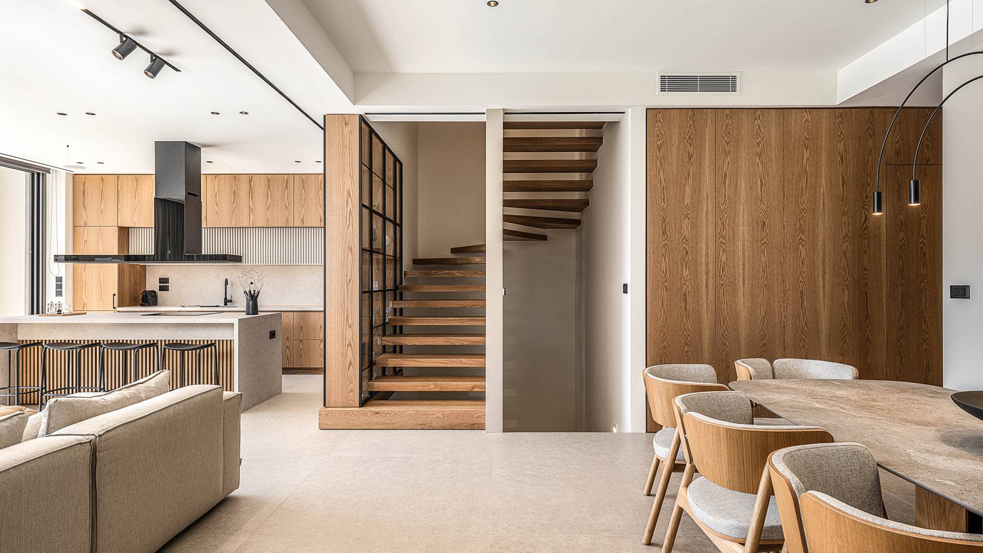 Auf der unteren Ebene gibt es ein weiteres Schlafzimmer mit Dusche und Doppelbett. Auf derselben Etage befindet sich ein Fitnessstudio mit allen notwendigen Geräten, um Sie im Urlaub fit zu halten. Darüber hinaus gibt es ein Spielzimmer mit einer PlayStation 5-Konsole, in dem Ihre Kinder die Spiele genießen können, während Sie den Creta-Himmel voller Sterne genießen. Die minimalistische Einrichtung des Hauses, die neutrale Farbpalette und die Verwendung von Holz schaffen den perfekten Rückzugsort für Sie, um sich vom hektischen Alltag zu erholen und zu entspannen. Jedes kleine Detail in dieser Residenz wurde speziell ausgewählt und gestaltet, um unseren Gästen eine sehr freundliche, aber gleichzeitig komfortable und luxuriöse Umgebung zu bieten.
