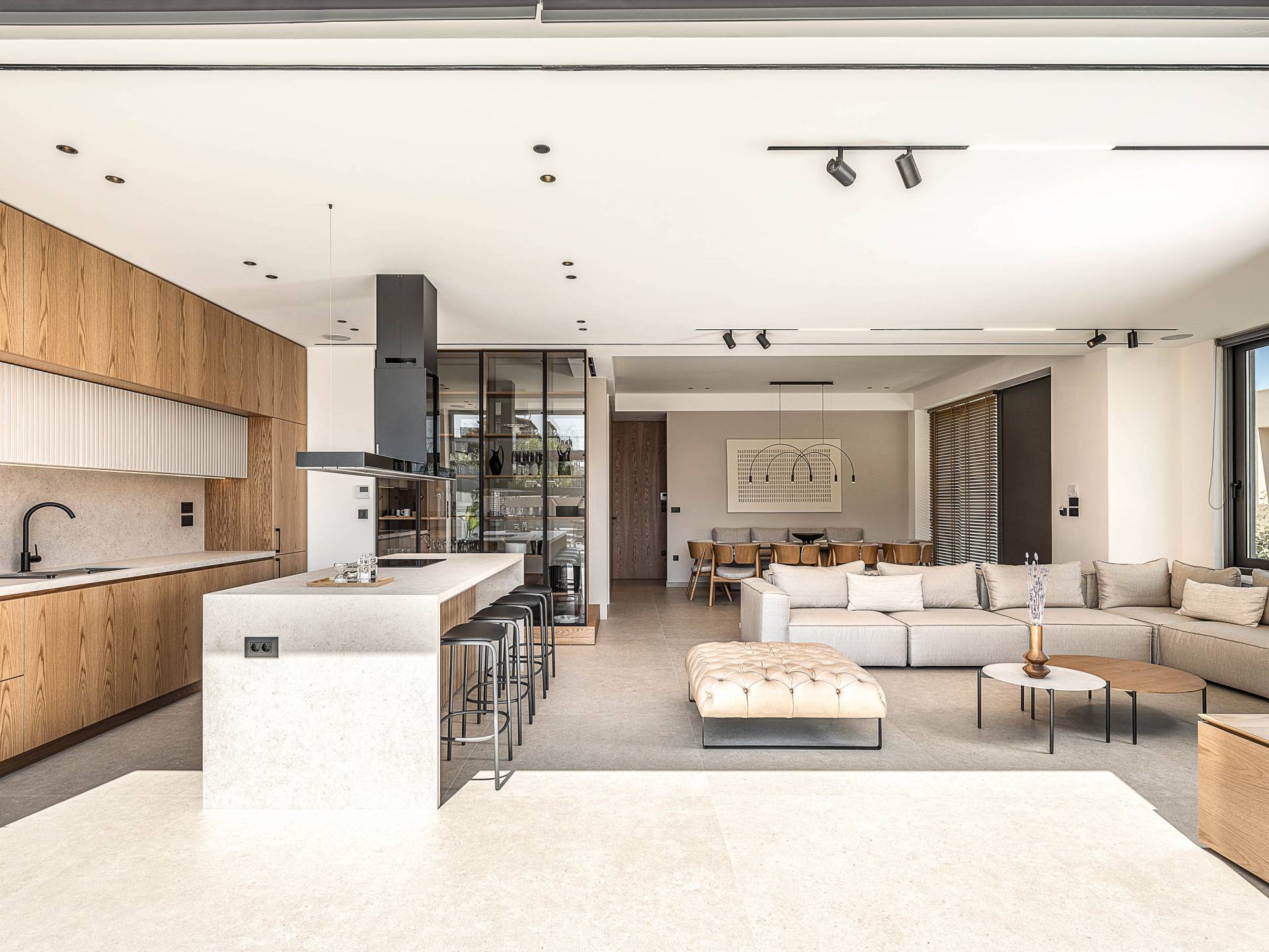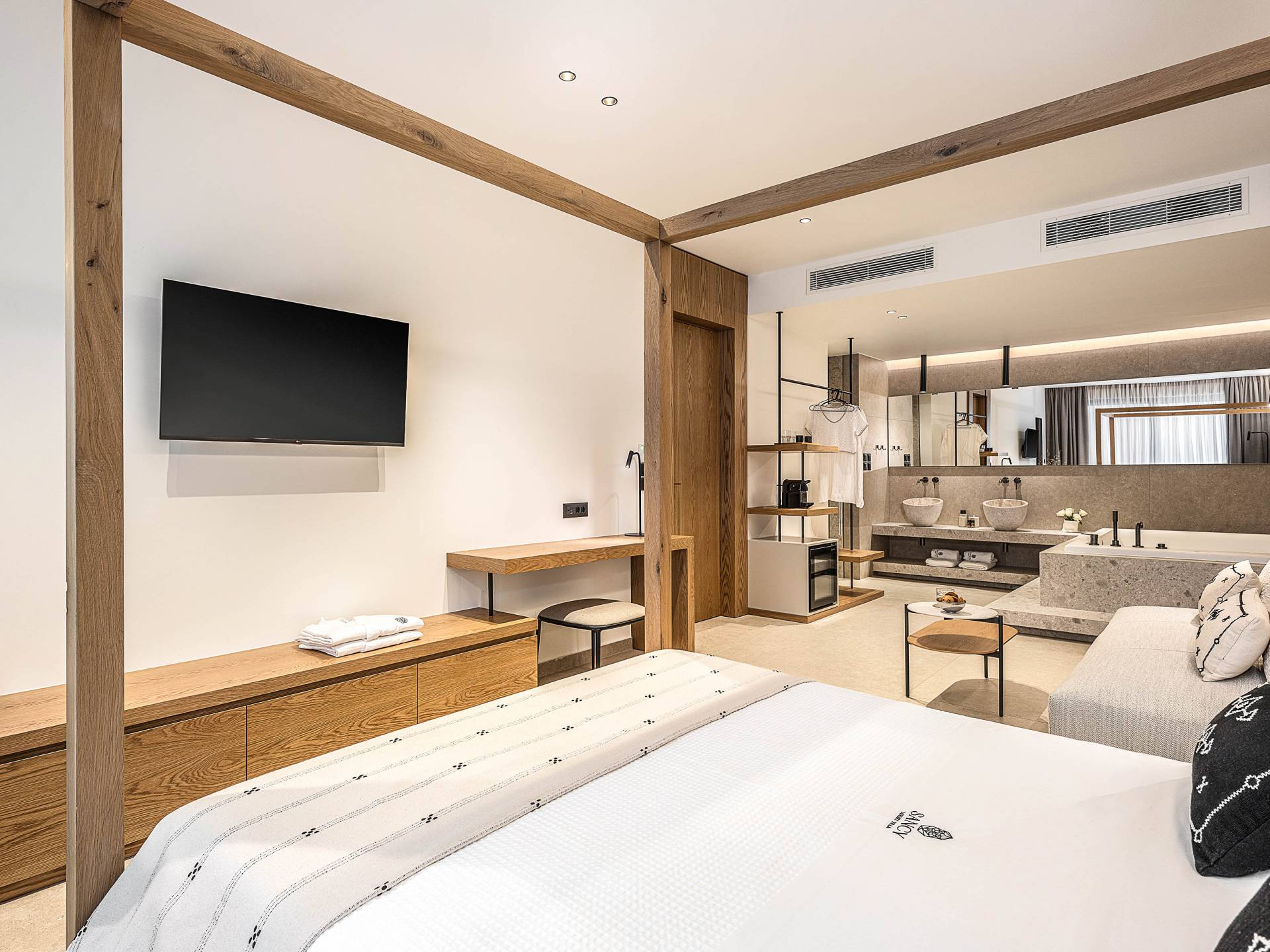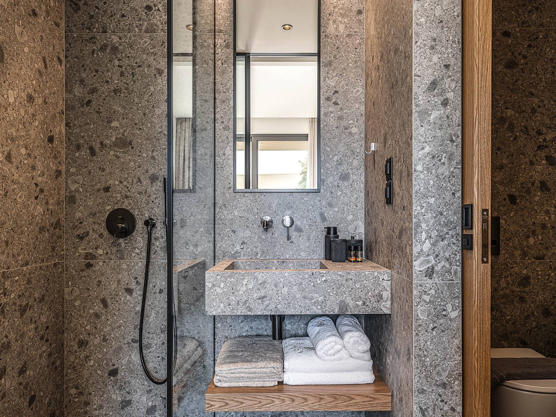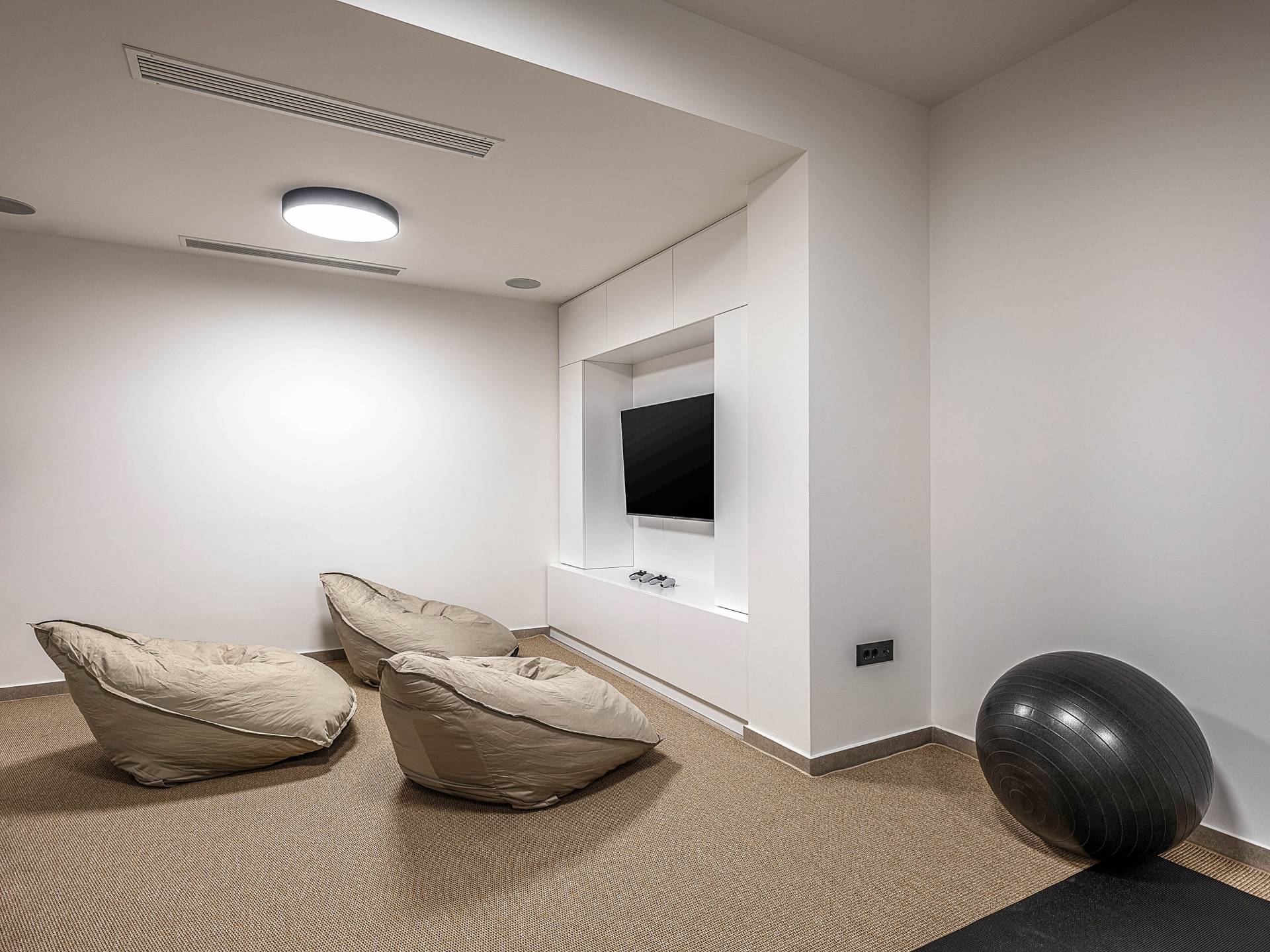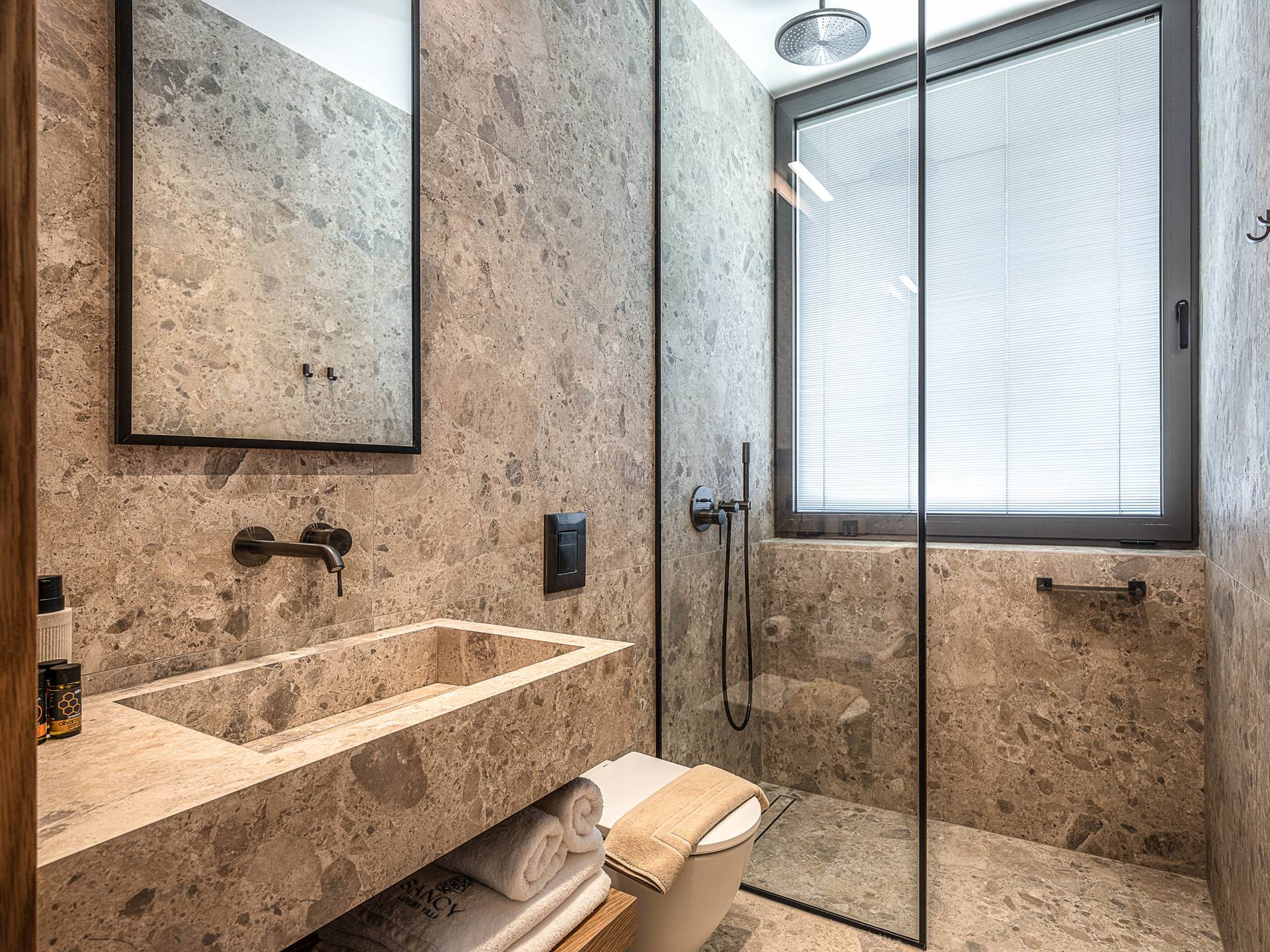 Auf der unteren Ebene gibt es ein weiteres Schlafzimmer mit Dusche und Doppelbett. Auf derselben Etage befindet sich ein Fitnessstudio mit allen notwendigen Geräten, um Sie im Urlaub fit zu halten. Darüber hinaus gibt es ein Spielzimmer mit einer PlayStation 5-Konsole, in dem Ihre Kinder die Spiele genießen können, während Sie den Creta-Himmel voller Sterne genießen. Die minimalistische Einrichtung des Hauses, die neutrale Farbpalette und die Verwendung von Holz schaffen den perfekten Rückzugsort für Sie, um sich vom hektischen Alltag zu erholen und zu entspannen. Jedes kleine Detail in dieser Residenz wurde speziell ausgewählt und gestaltet, um unseren Gästen eine sehr freundliche, aber gleichzeitig komfortable und luxuriöse Umgebung zu bieten.