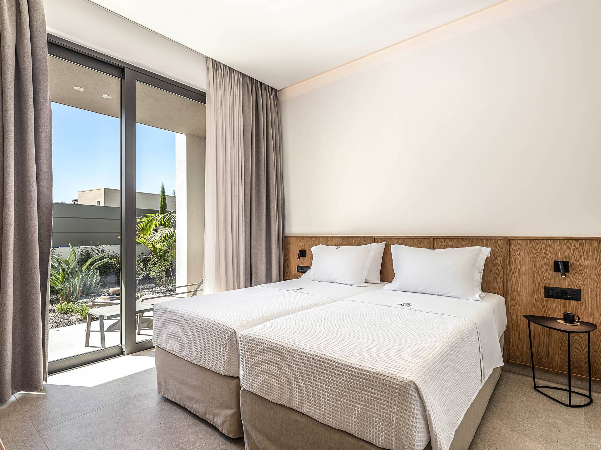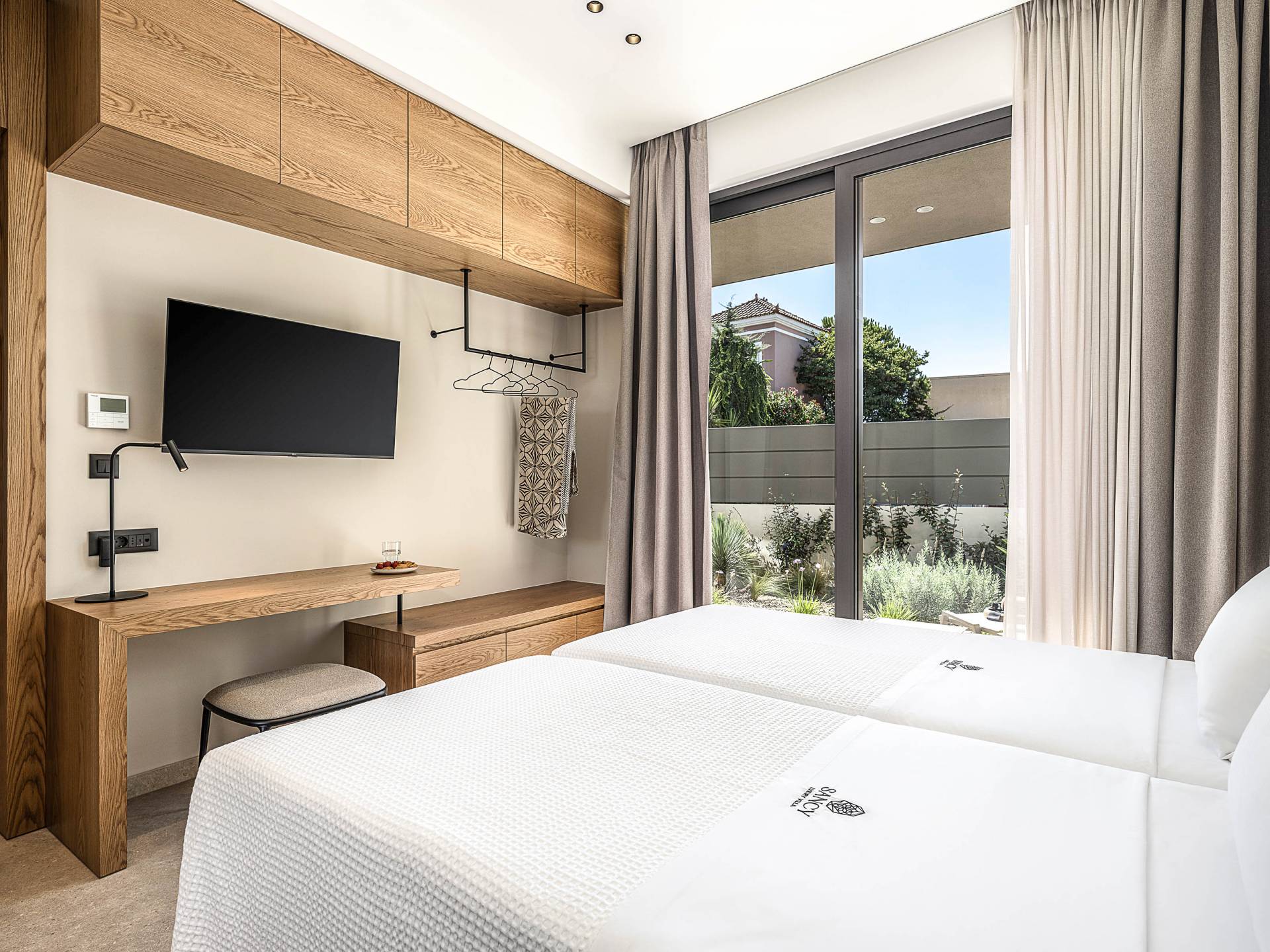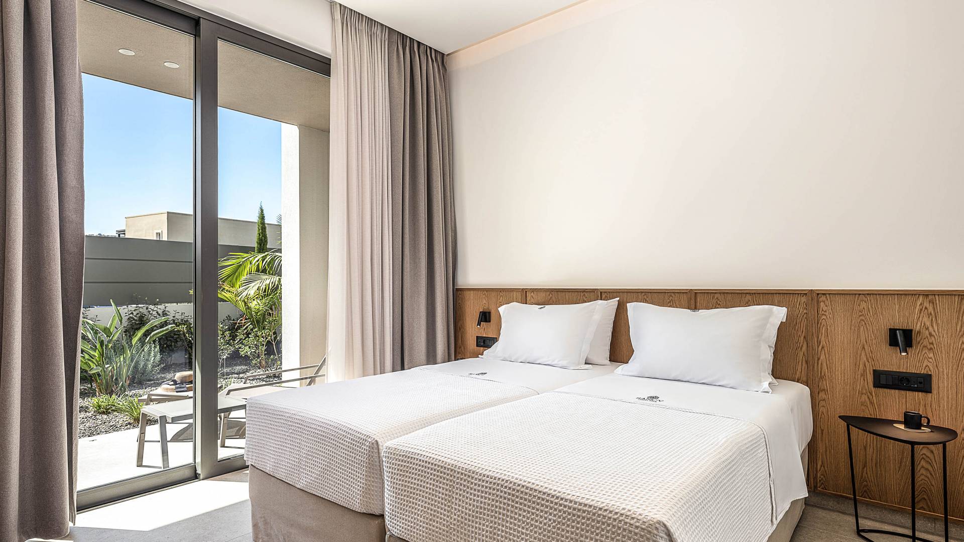 Direkt neben der Küche befindet sich ein luftiges Wohnzimmer mit einem Flachbildfernseher und einem atemberaubenden Blick auf den Außenbereich der Villa. Die großen Fenster erzeugen die Illusion von Transparenz und sorgen für einen nahtlosen Übergang zwischen Innen- und Außenbereich. Die Villa hat vom Wohnzimmer aus direkten Zugang zum Pool. Auf derselben Etage befinden sich zwei geräumige Schlafzimmer mit Twin-Size-Betten, die in ein Doppelbett umgewandelt werden können. Diese beiden Schlafzimmer bieten unseren Gästen Ruhe. Eines der Schlafzimmer verfügt über ein eigenes Badezimmer mit Dusche. Auf der gleichen Etage gibt es ein Gemeinschaftsbad für alle Gäste mit Dusche.