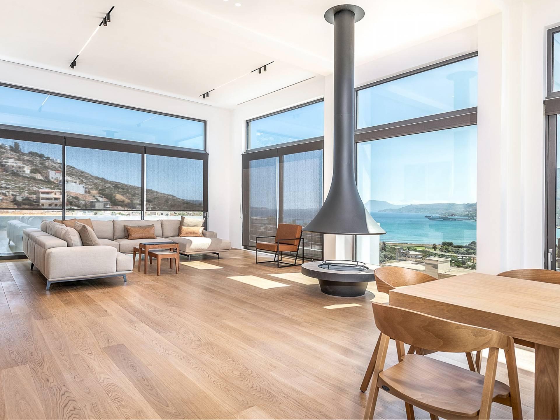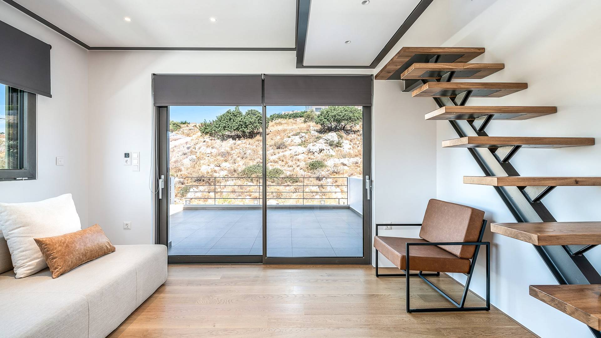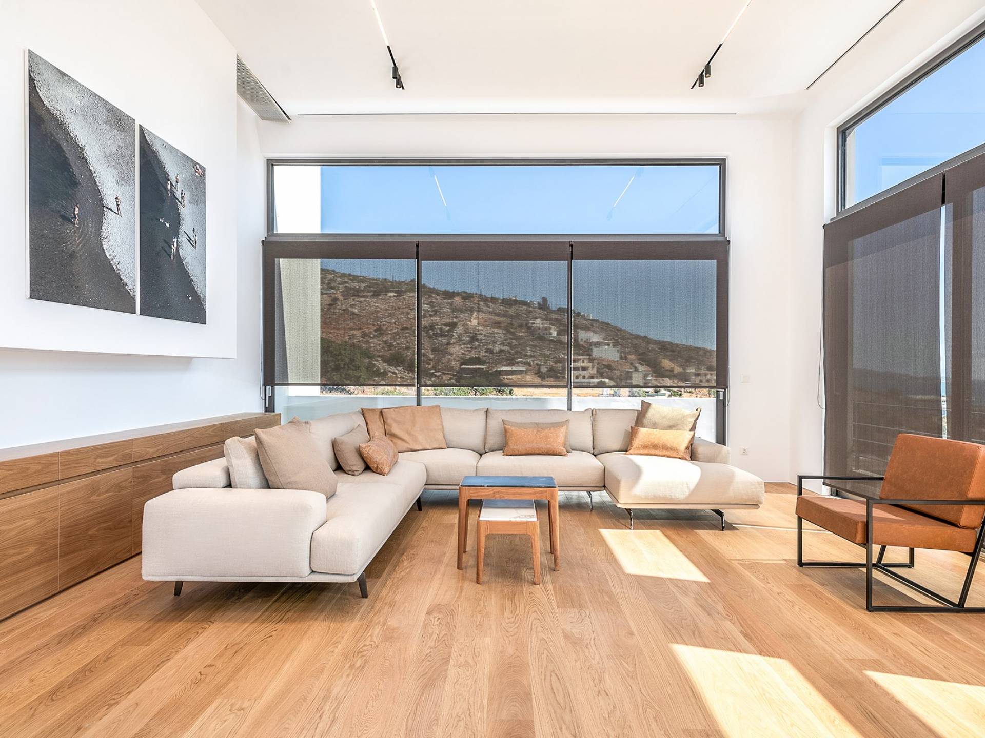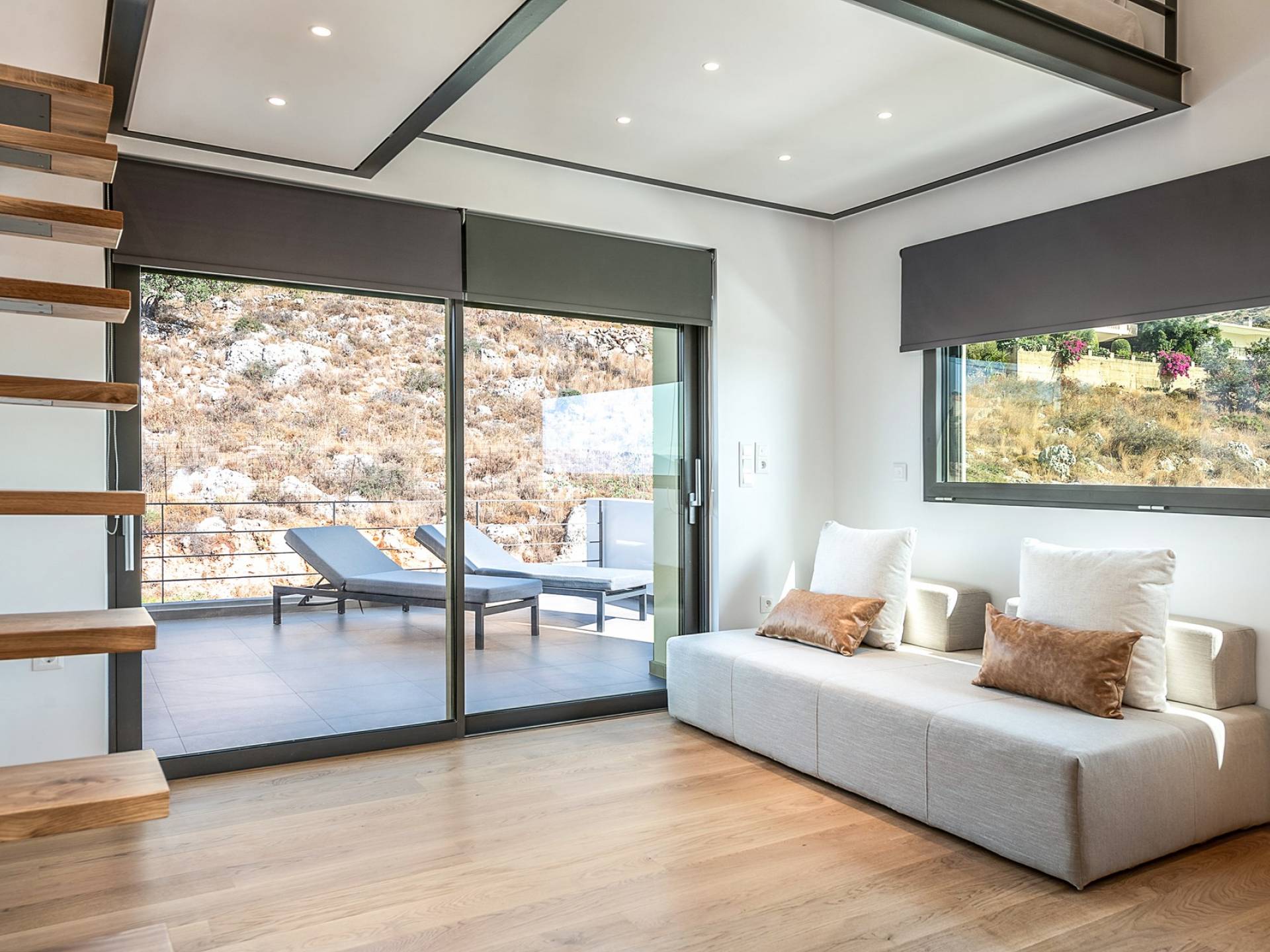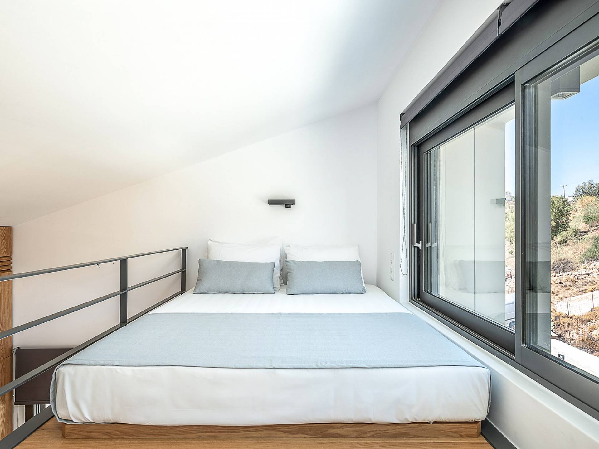 Seametry Loft ist hell und geräumig, was seine entspannende, minimalistische Dekoration betont. Das Seametry Loft bietet dank seiner majestätischen hohen Glaswände im Wohnzimmer einen hervorragenden Panoramablick auf die Berge und das Meer und vermittelt ein Gefühl von Luxus und Überlegenheit.