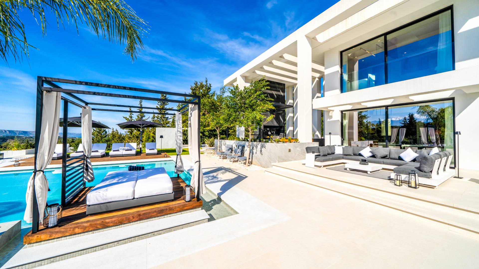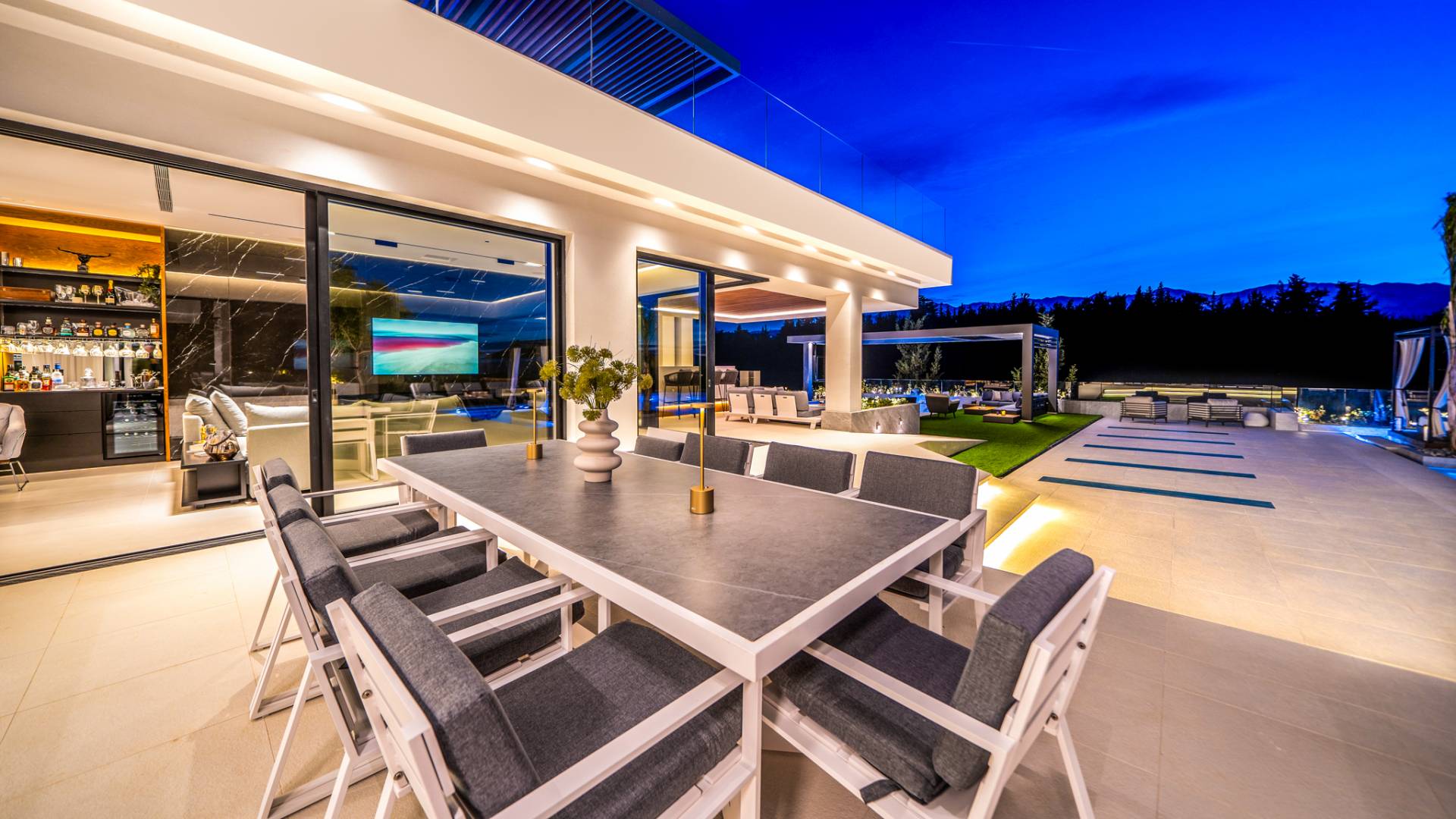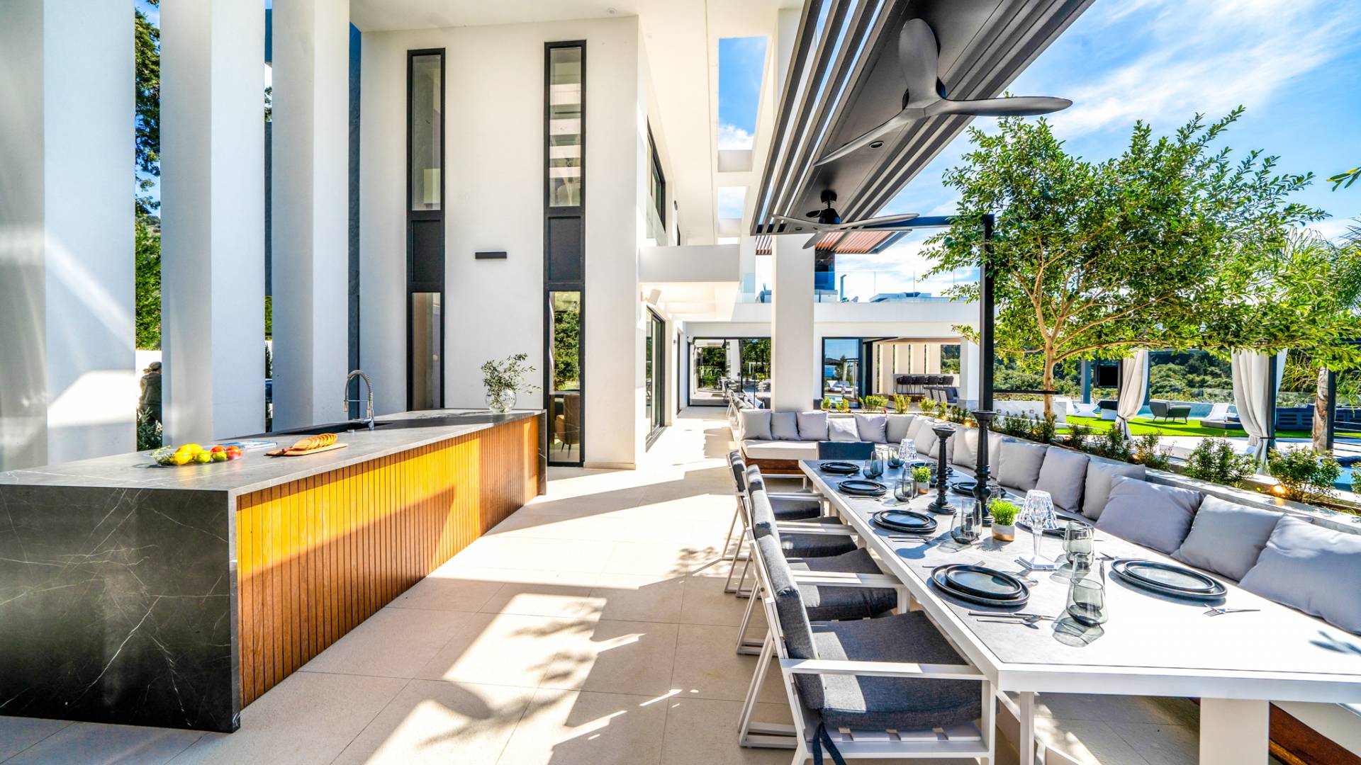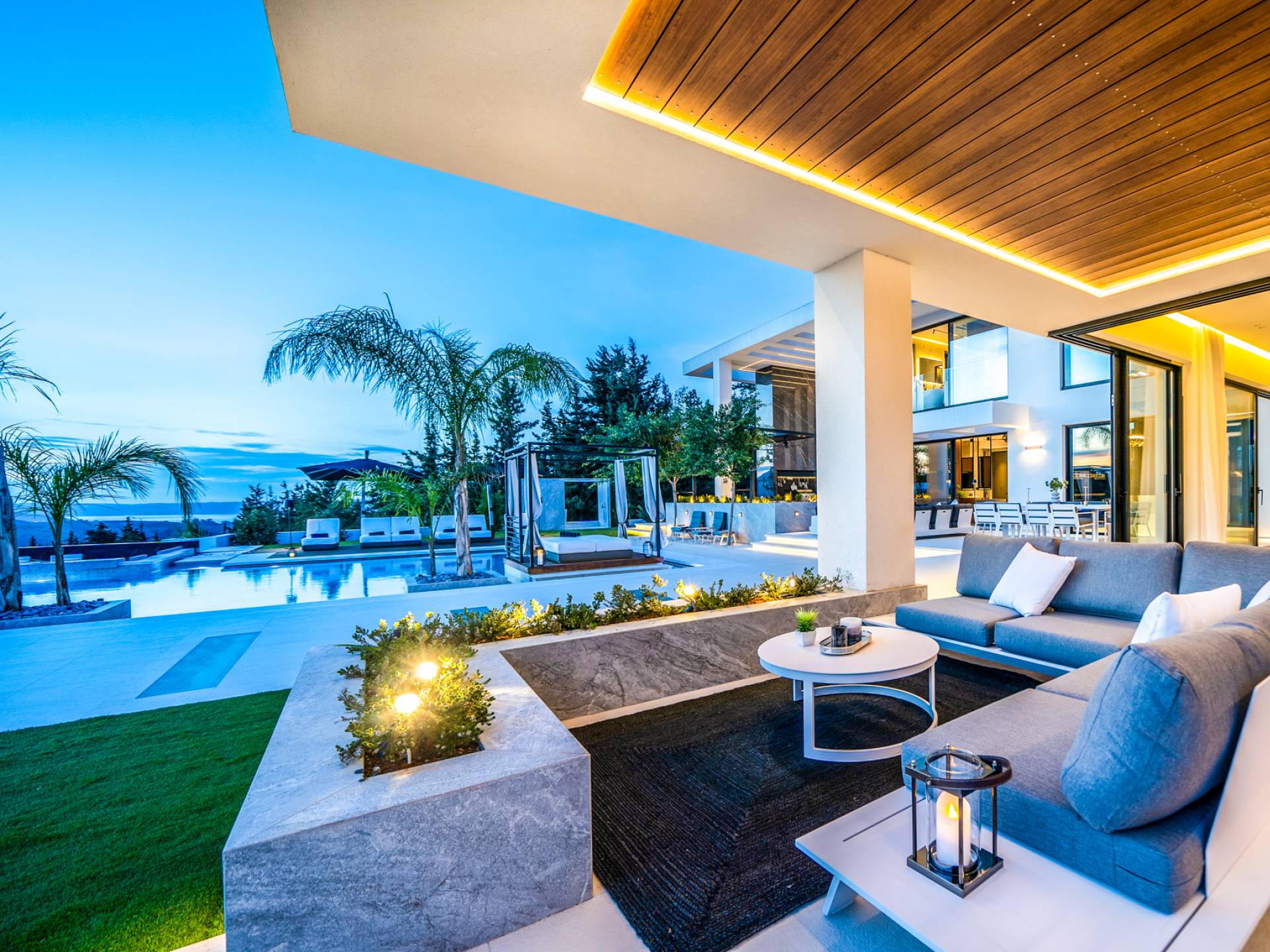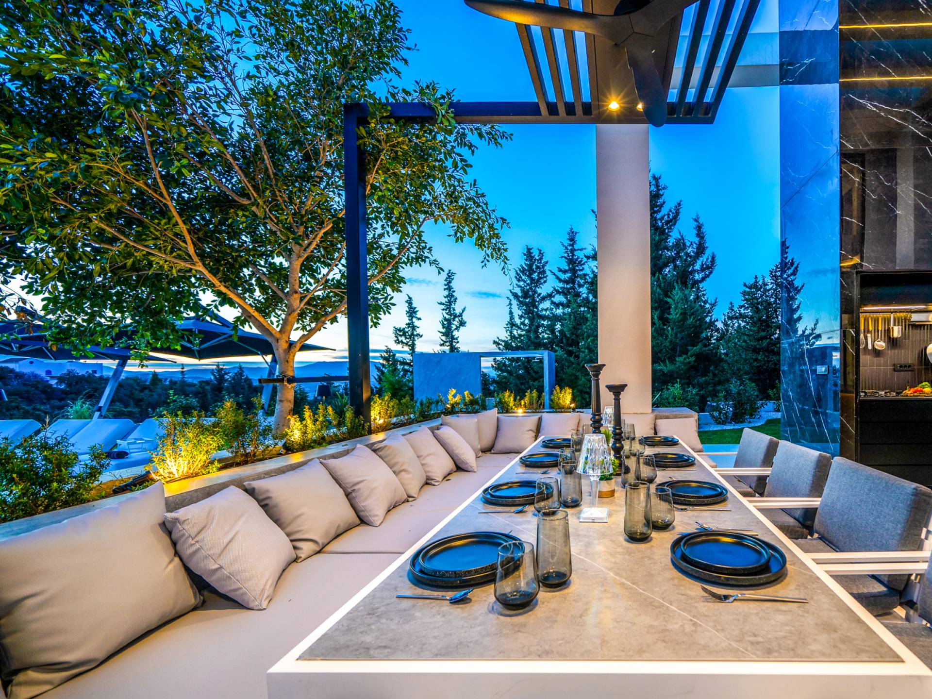 Außen: Die One Villa verfügt über eine Vielzahl großzügiger Terrassen, auf denen die Gäste speisen, faulenzen, sich sonnen und den sensationellen Blick auf das Meer und die Landschaft genießen können.