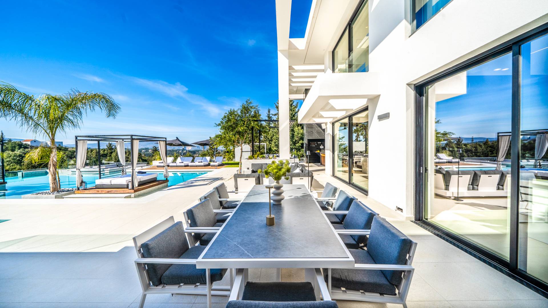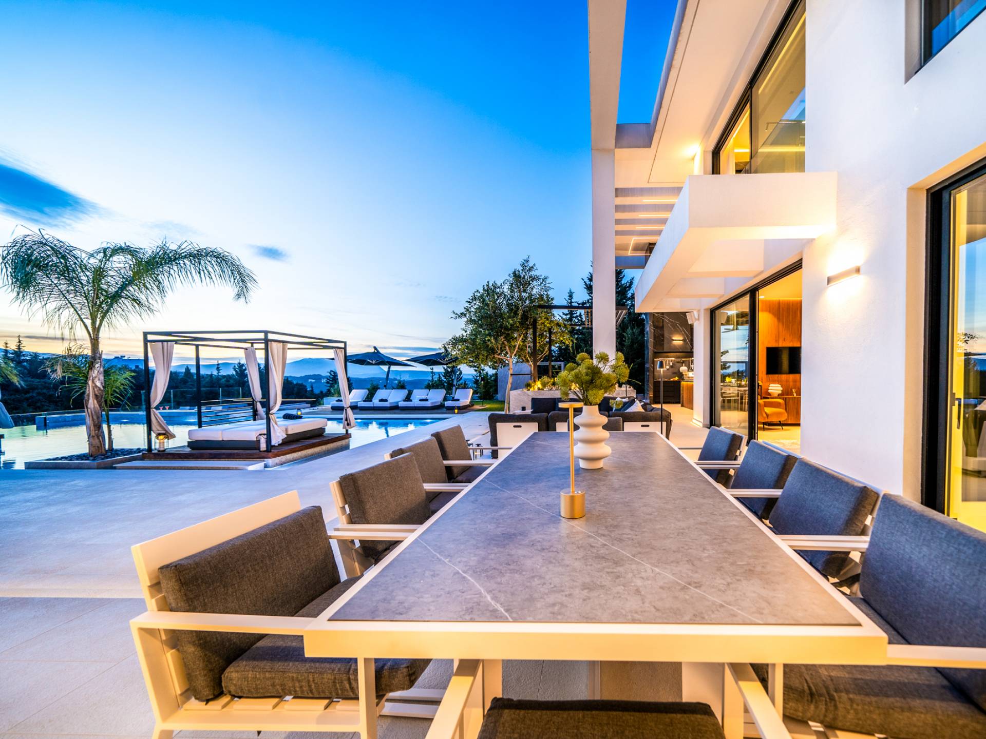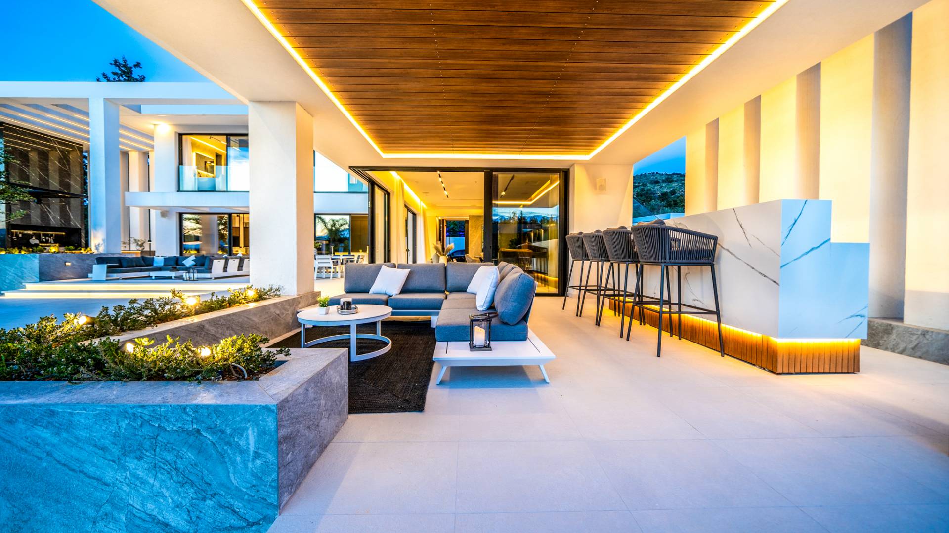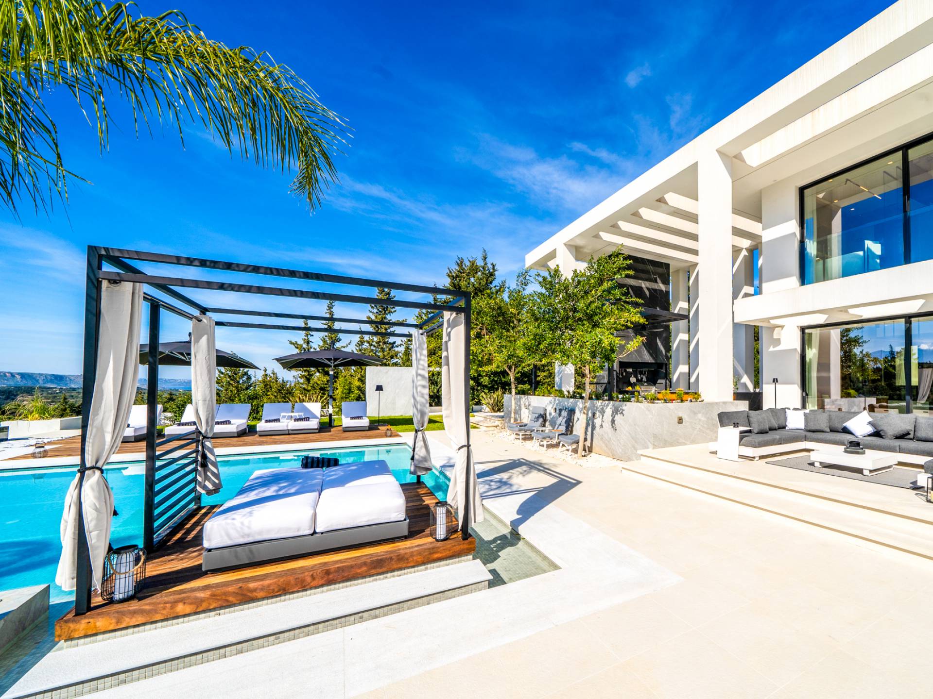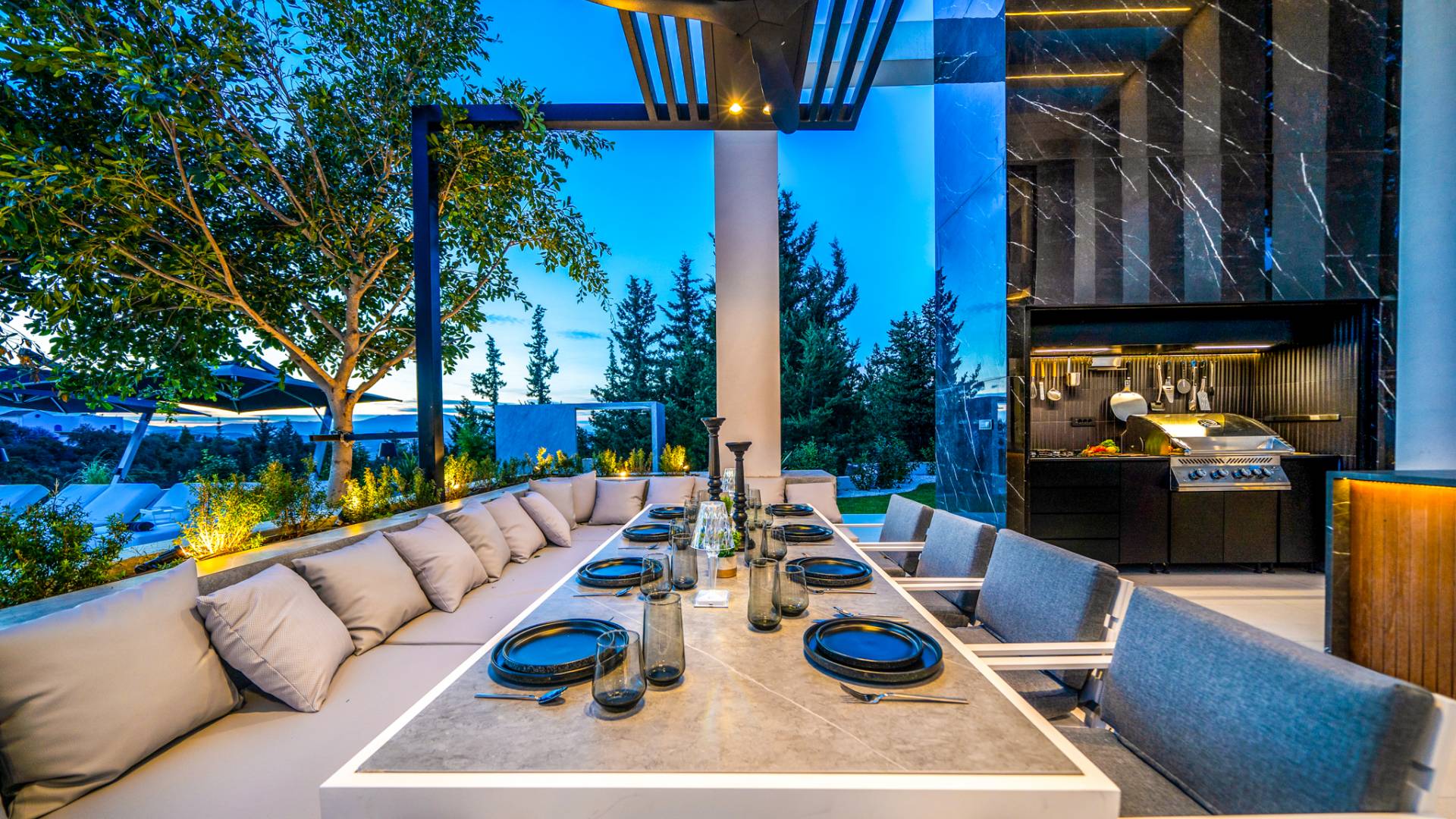 Außen: Die One Villa verfügt über eine Vielzahl großzügiger Terrassen, auf denen die Gäste speisen, faulenzen, sich sonnen und den sensationellen Blick auf das Meer und die Landschaft genießen können.