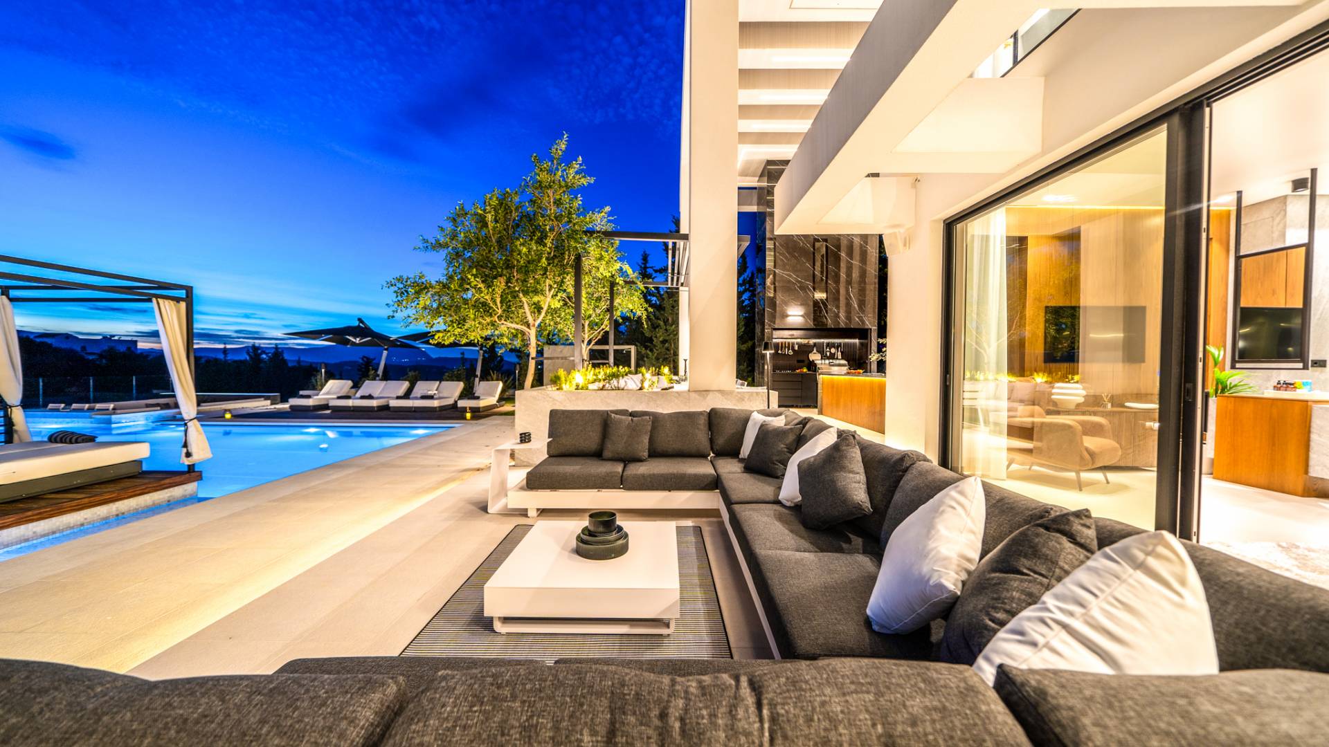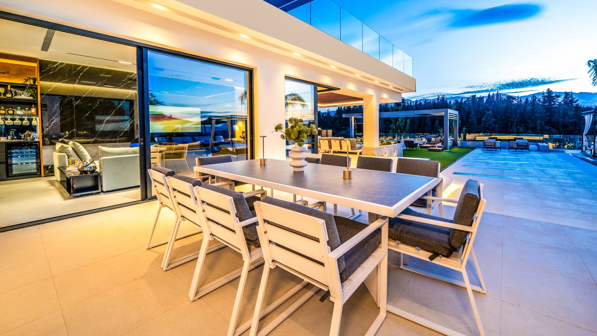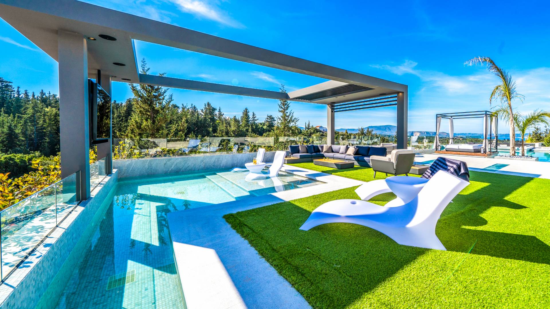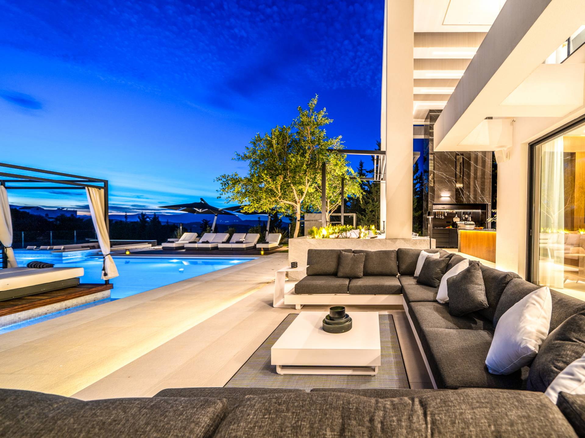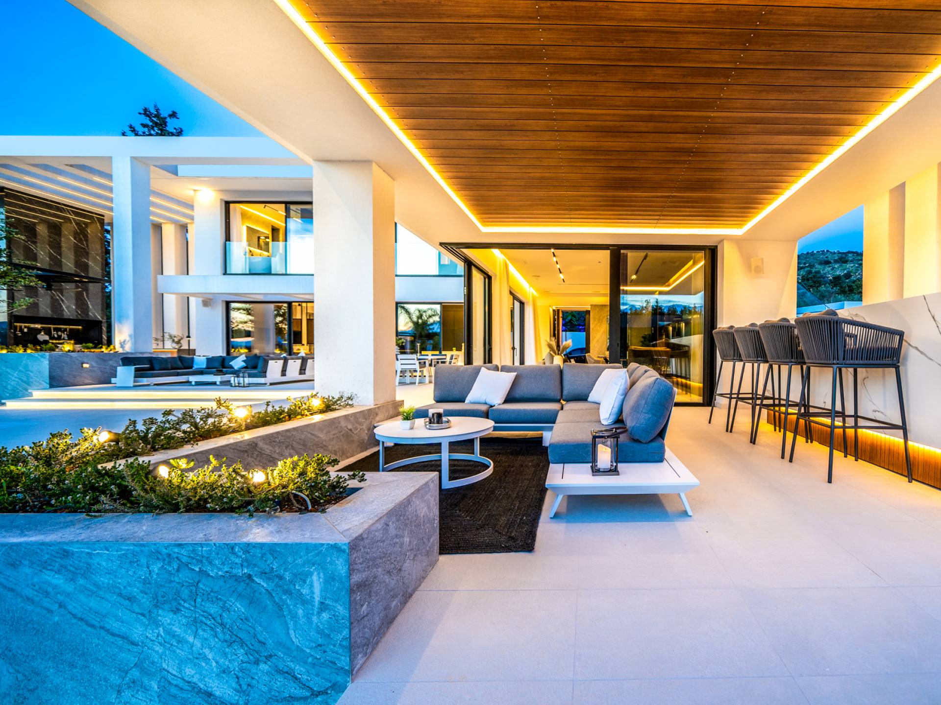Außen: Die One Villa verfügt über eine Vielzahl großzügiger Terrassen, auf denen die Gäste speisen, faulenzen, sich sonnen und den sensationellen Blick auf das Meer und die Landschaft genießen können.